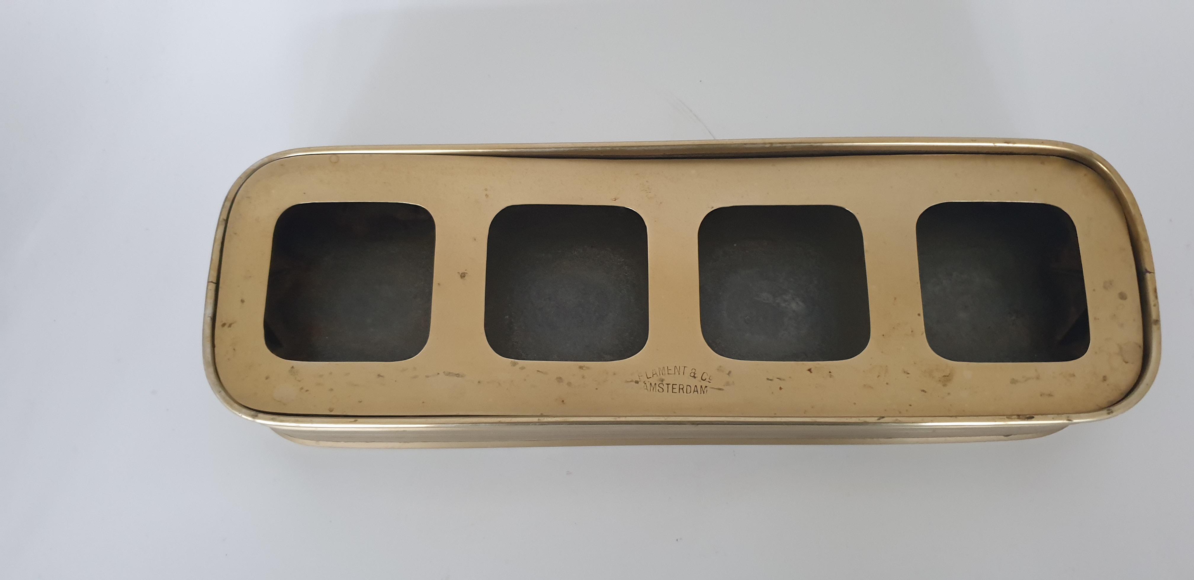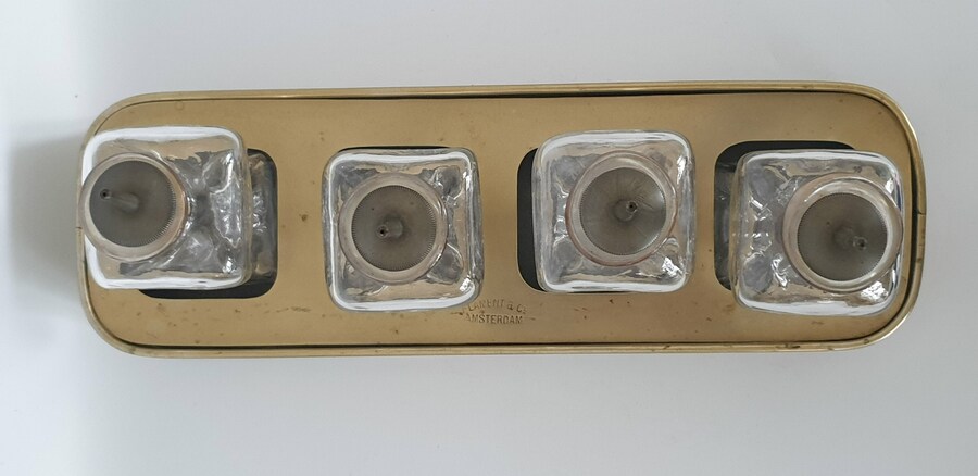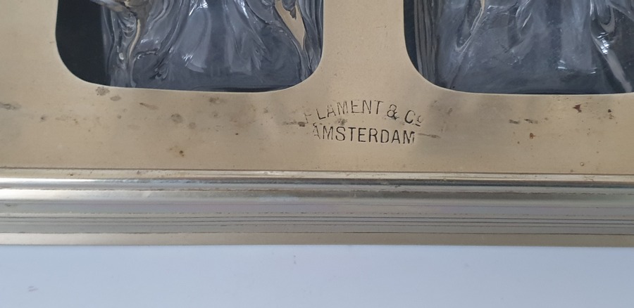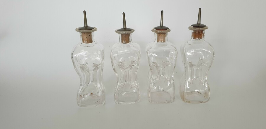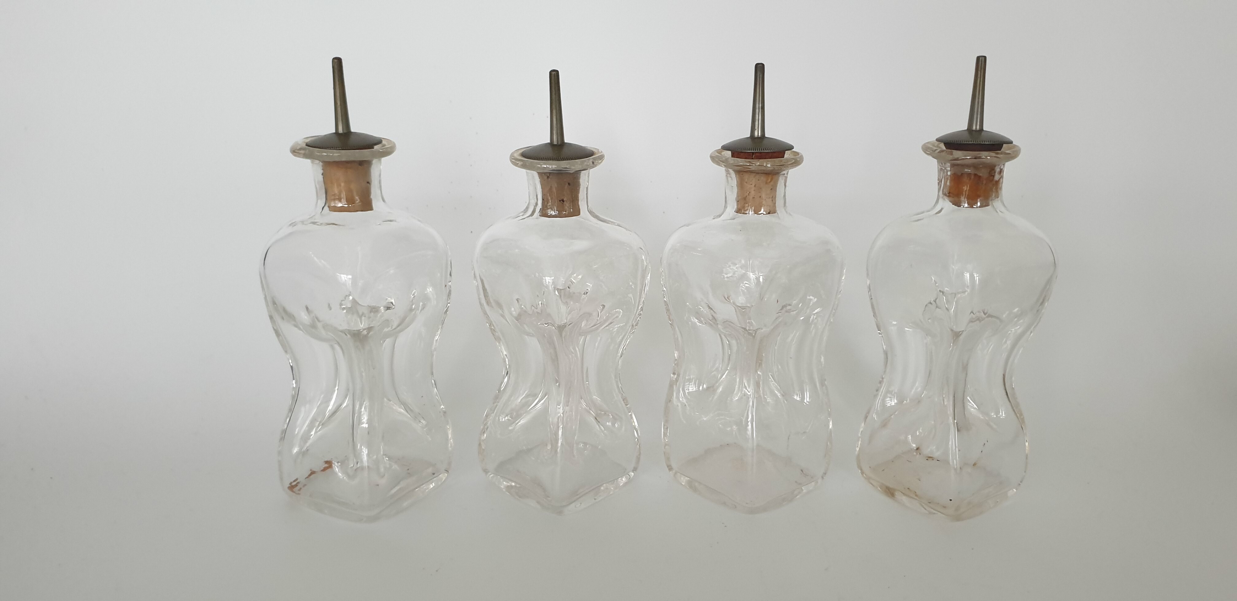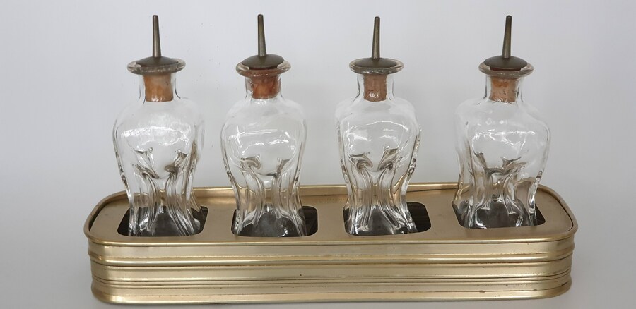 Knijpflesjes met schenktuiten, compleet in houder, Flament & co. Amsterdam, circa 1920 |