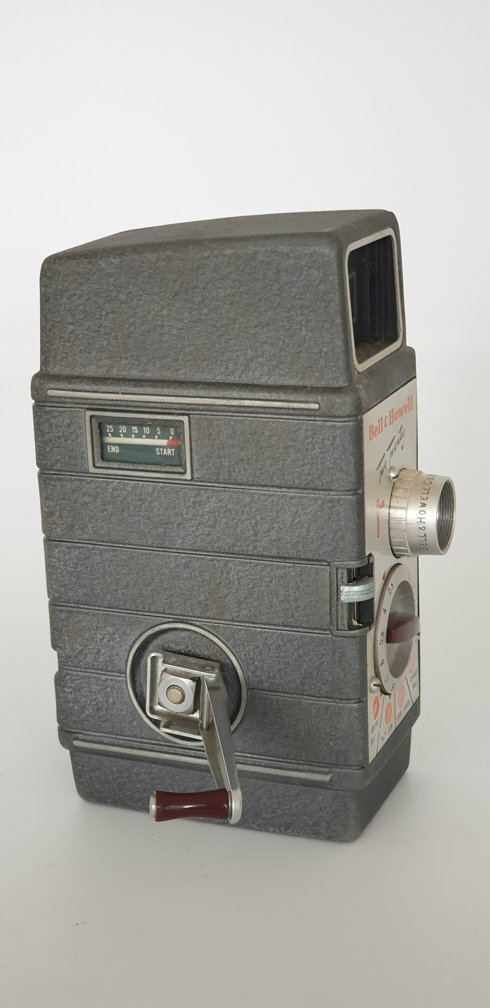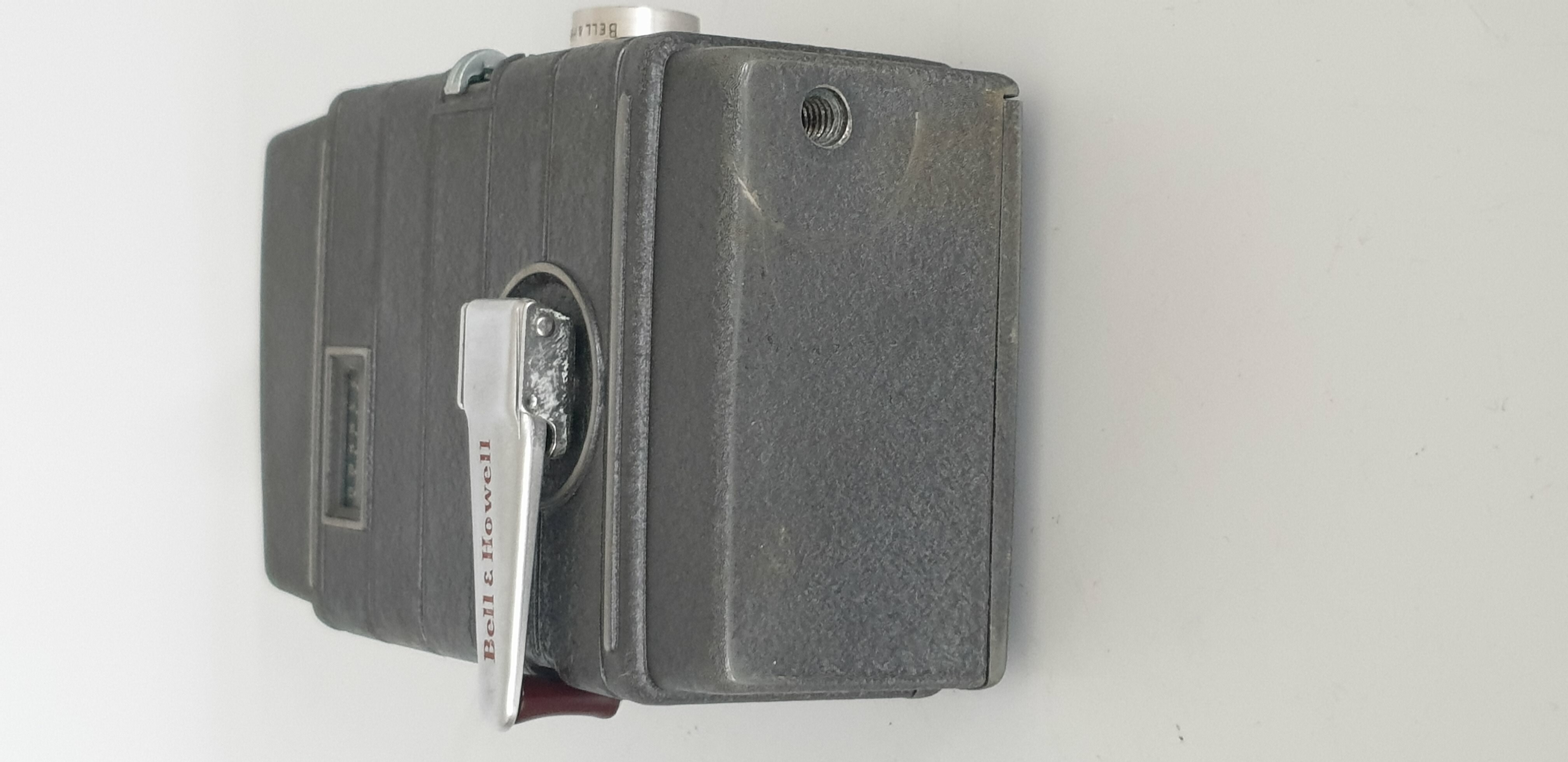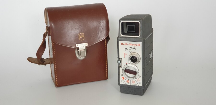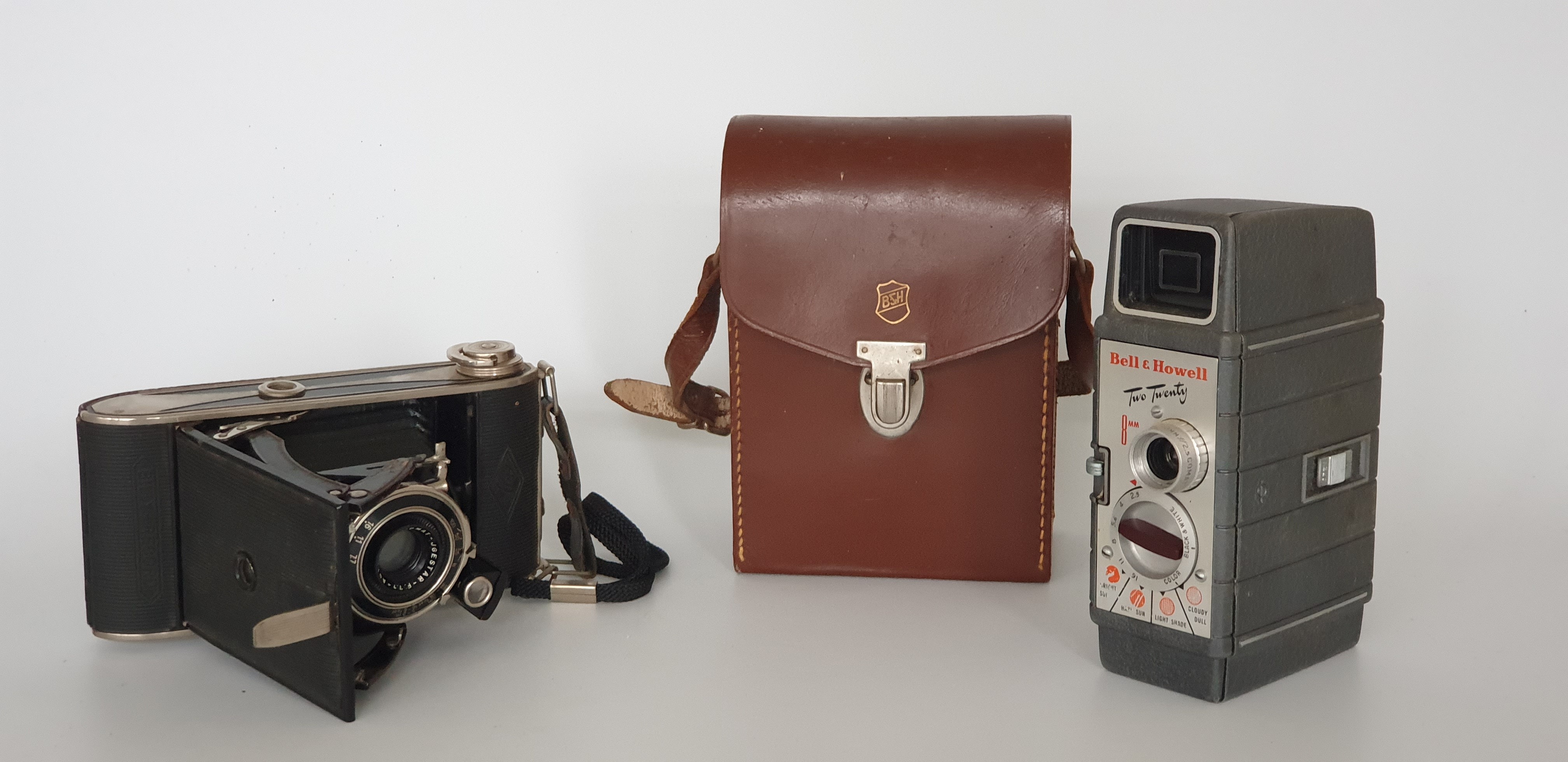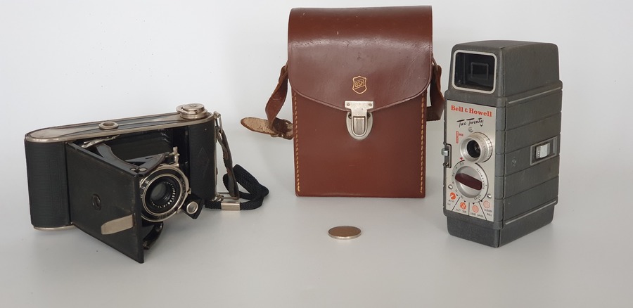 Een filmcamera en een fotocamera, Bell & Howell en Agfa. |