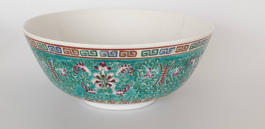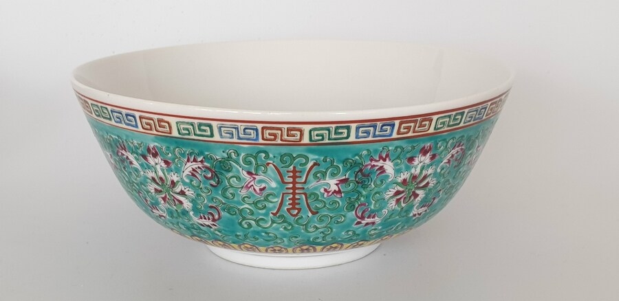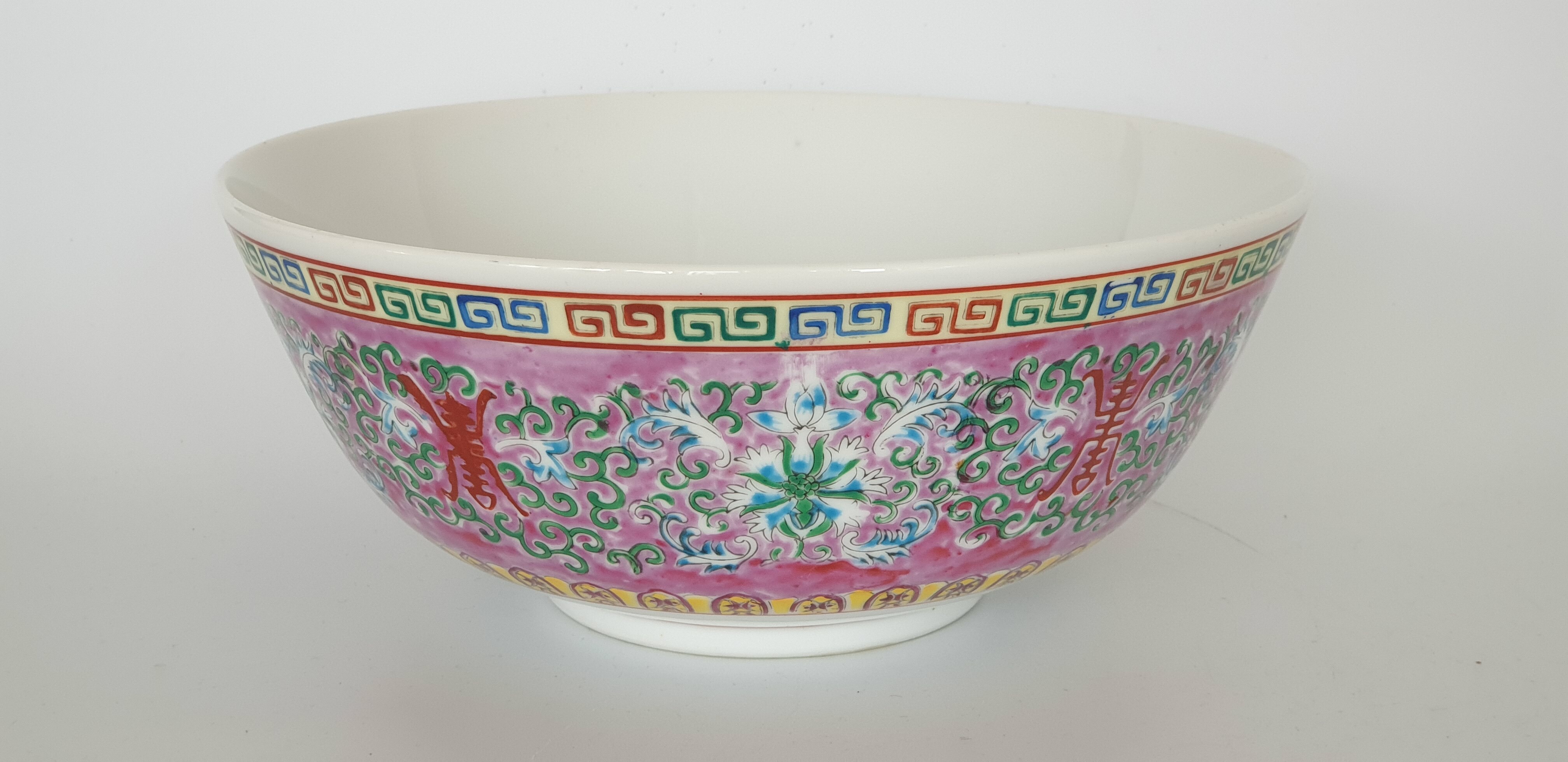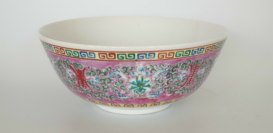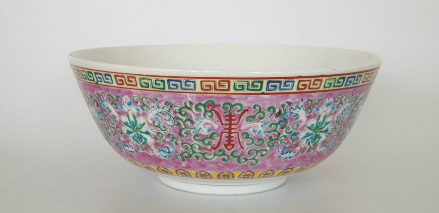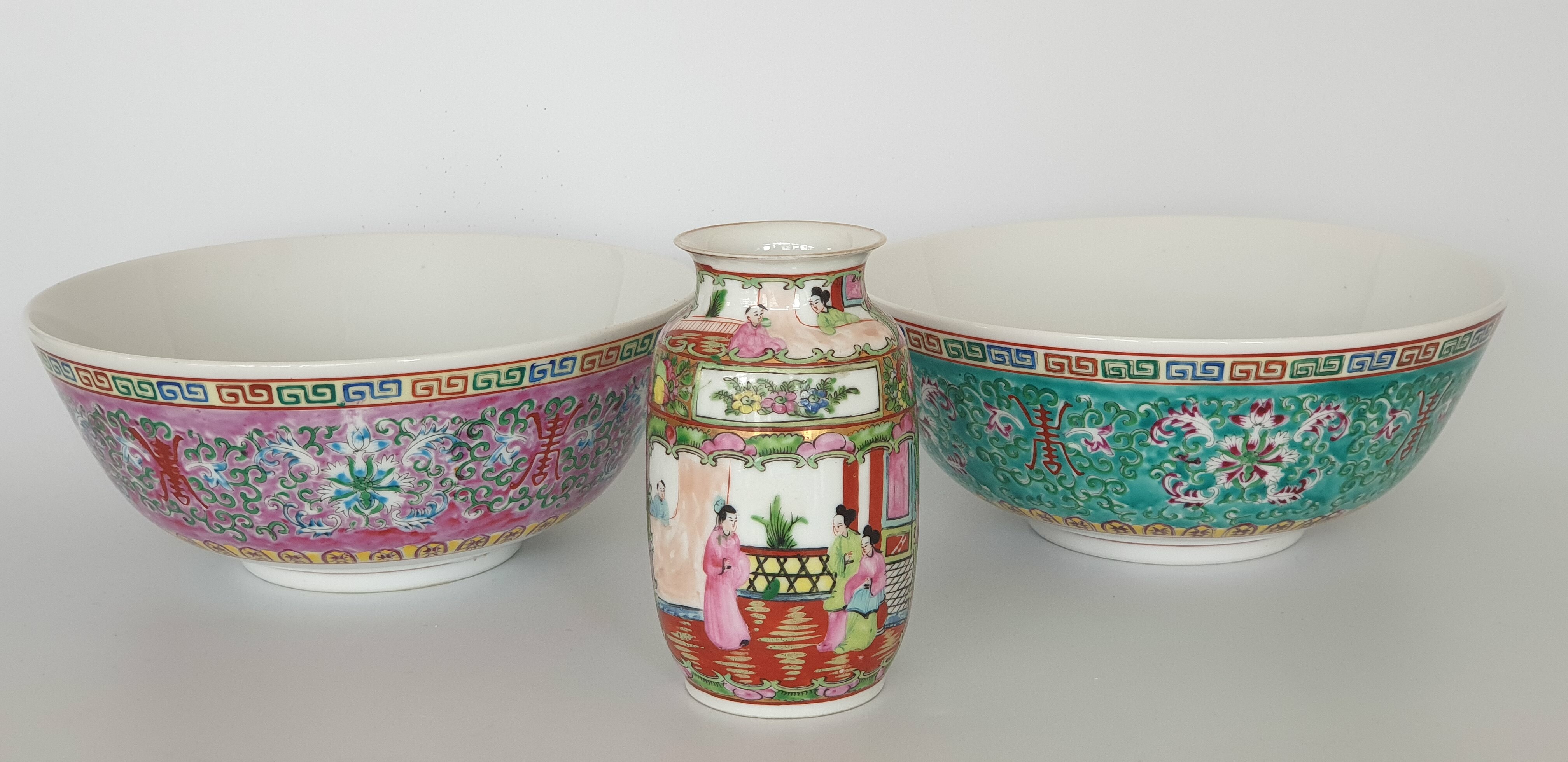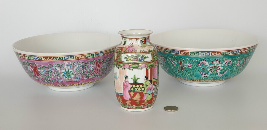 Twee grote porseleinen kommen en een eierschaal vaasje, famille rose. China, 20e eeuw. |