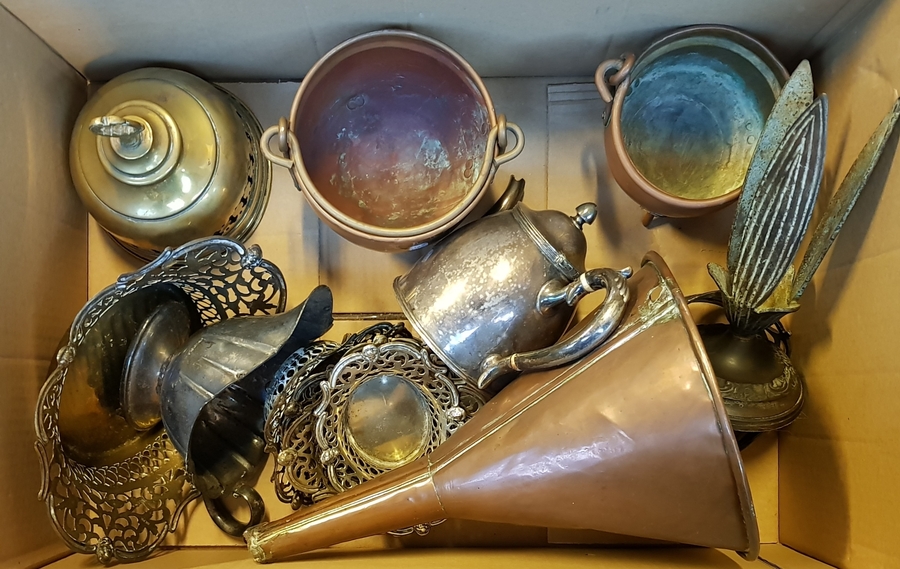Lot koper, messing en metaal. Waaronder een trechter, theepot en boterhouder, 20e eeuw. |
