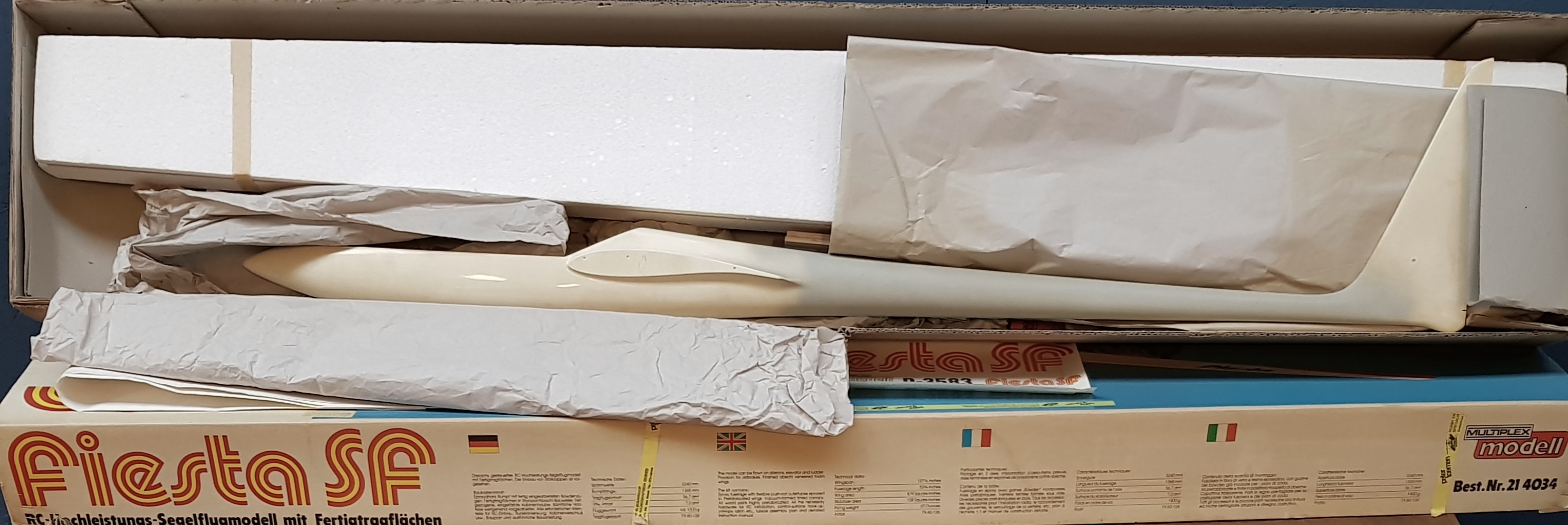 Bouwpakket SF Fiesta zweefvliegtuig , multiplex model Best.nr.214034, jaren 70/80. |