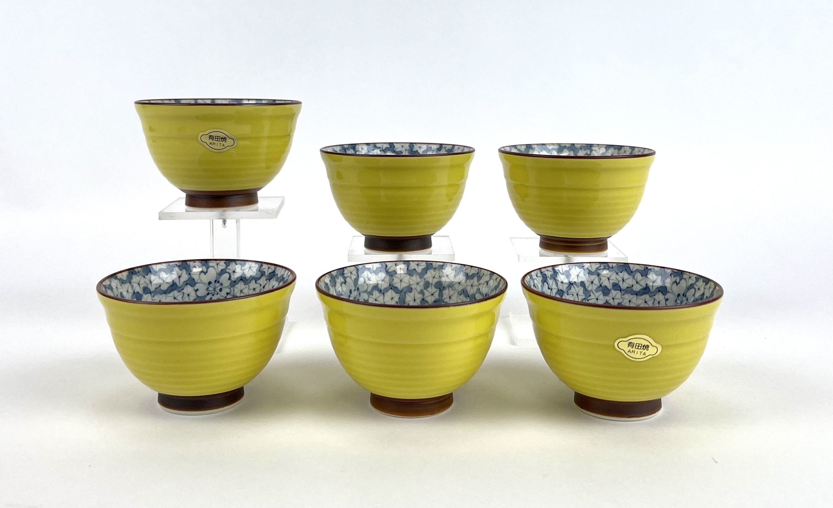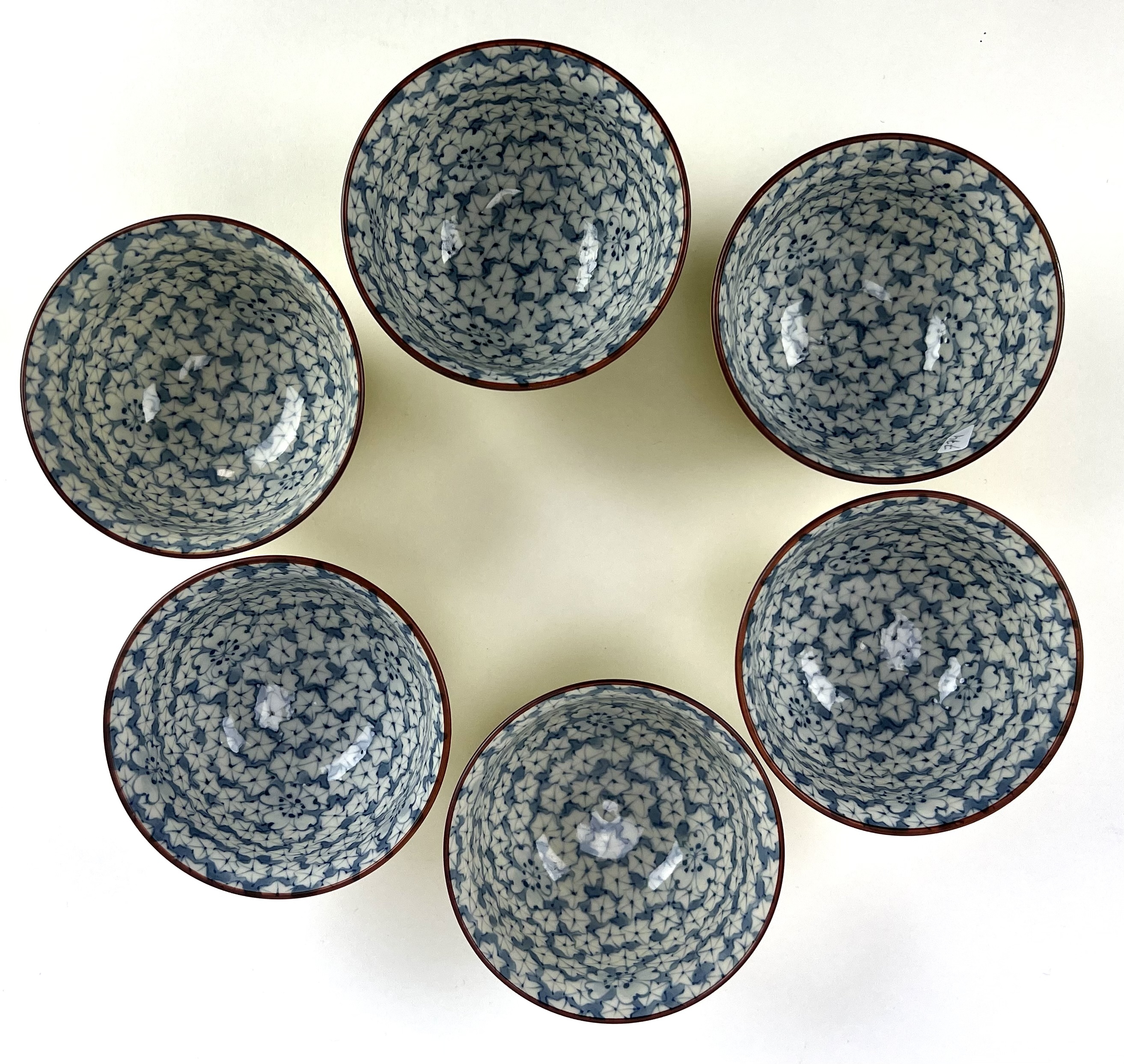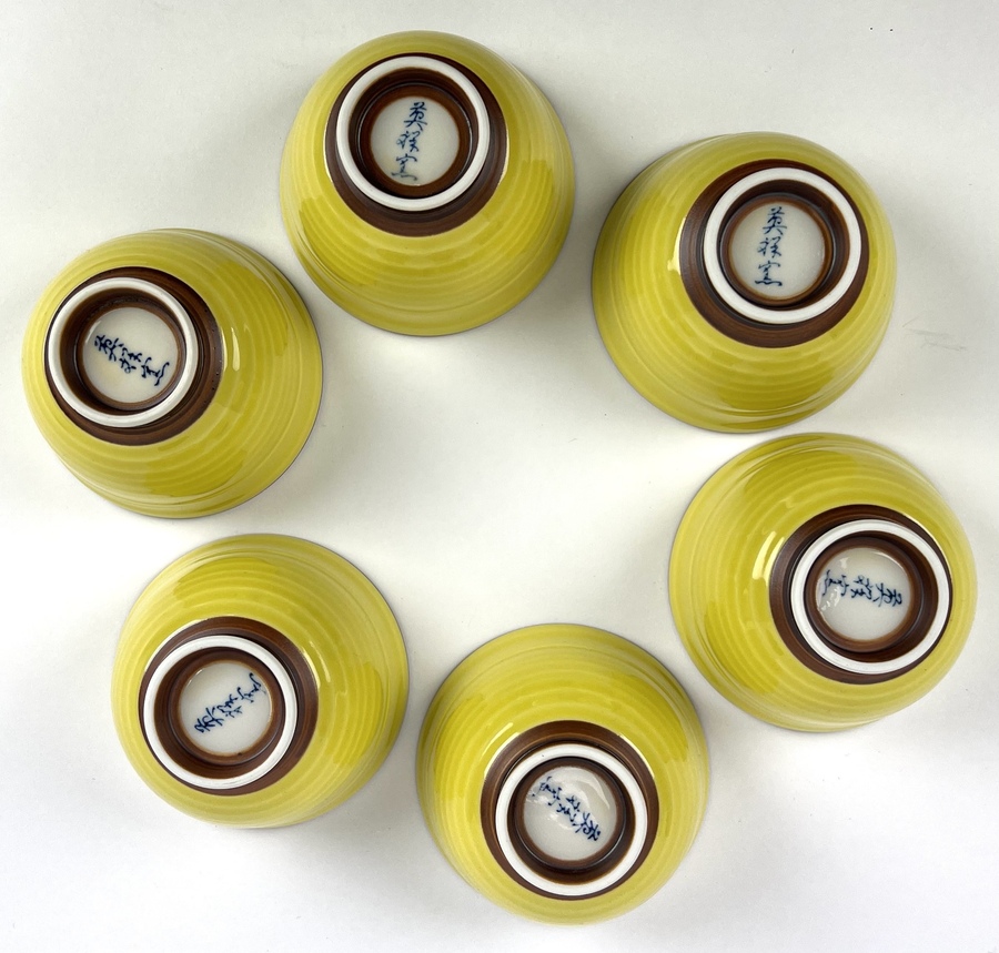 Zes Japanse Arita theekopjes, aan de onderzijde gesigneerd, tweede helft 20e eeuw. |