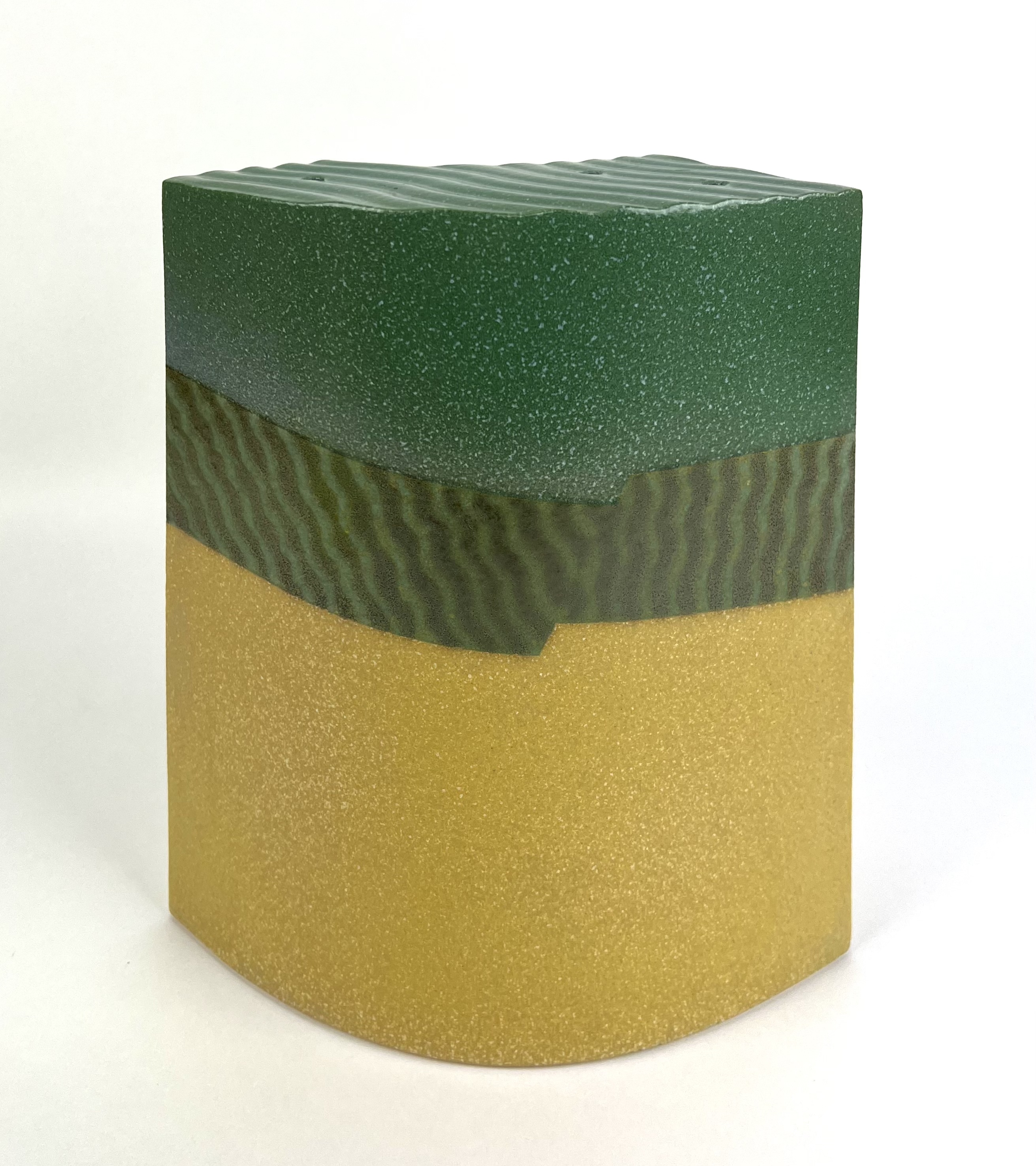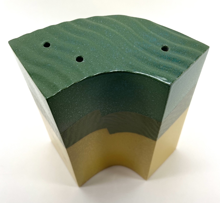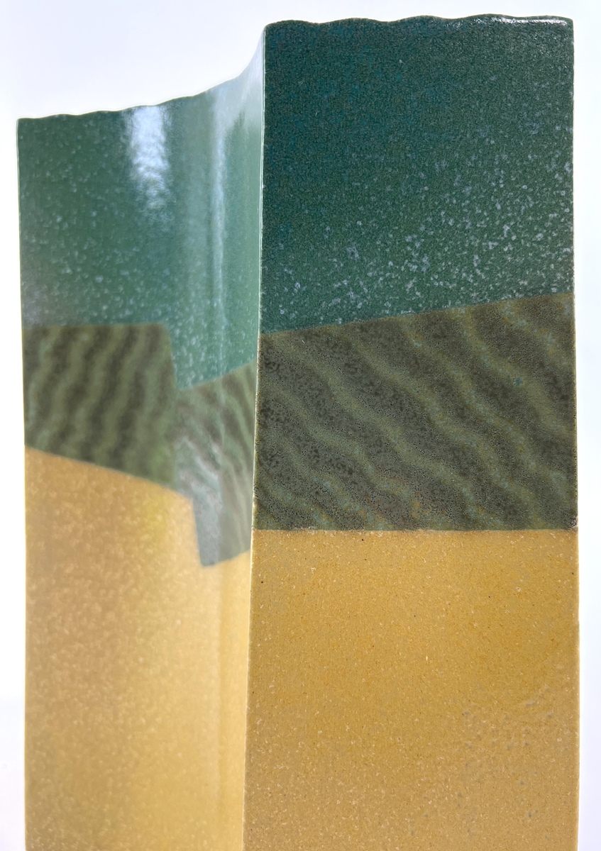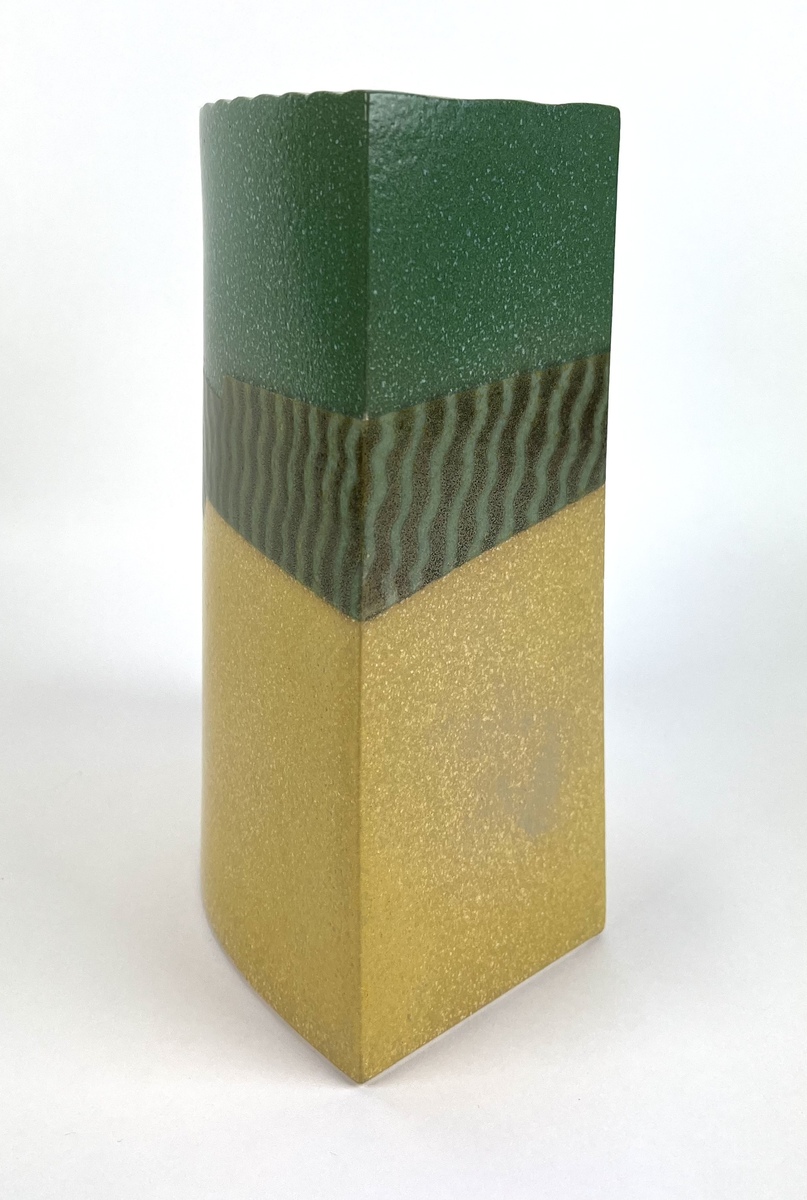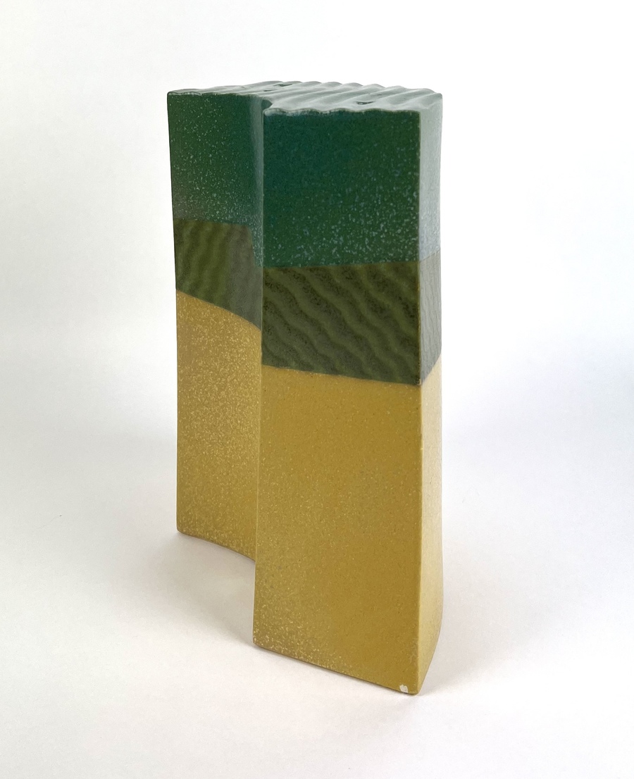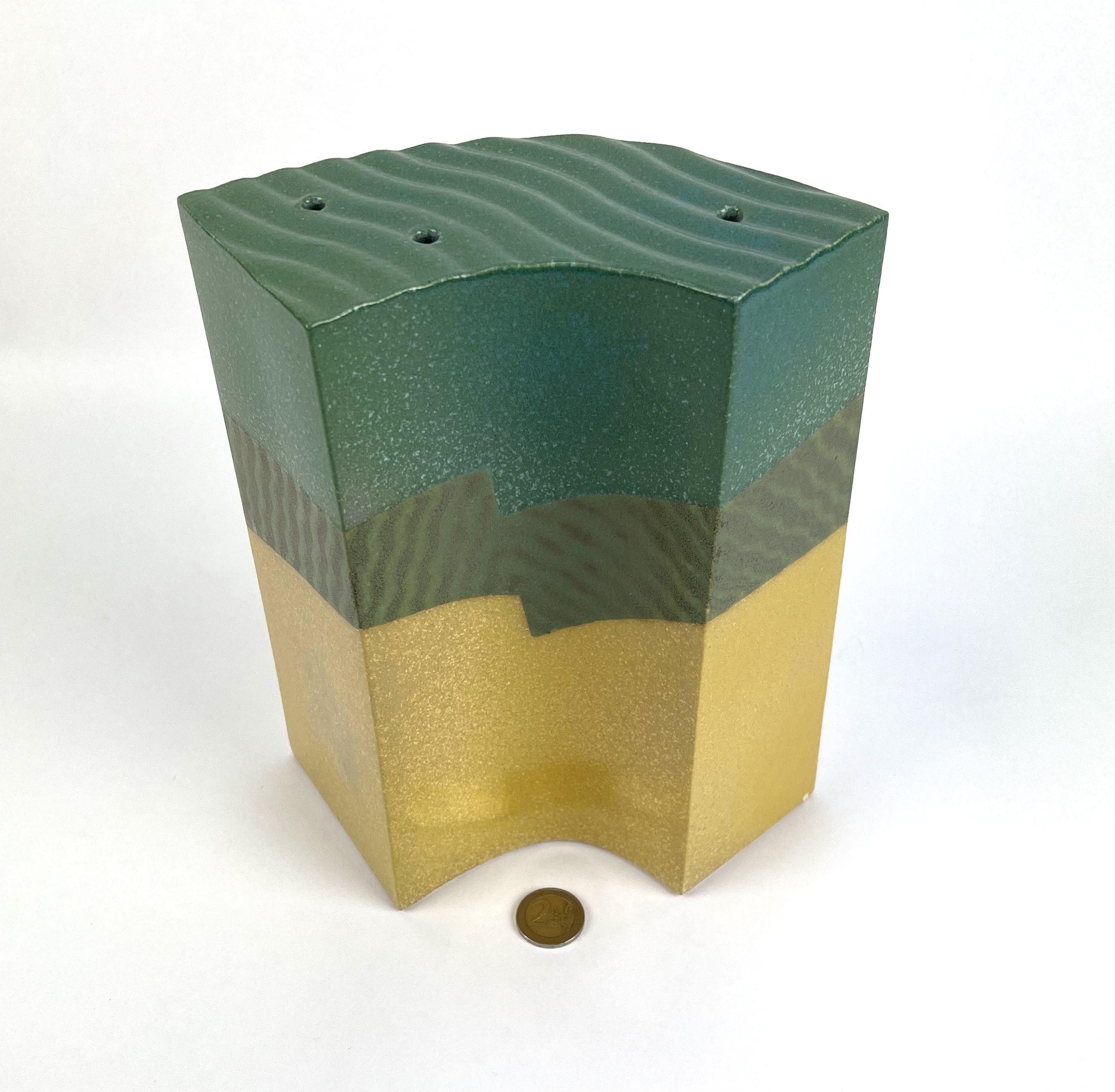 Modern keramieken groen/geel plastiek door Henneke Chevalier. Aan de onderzijde gemerkt met monogram. |