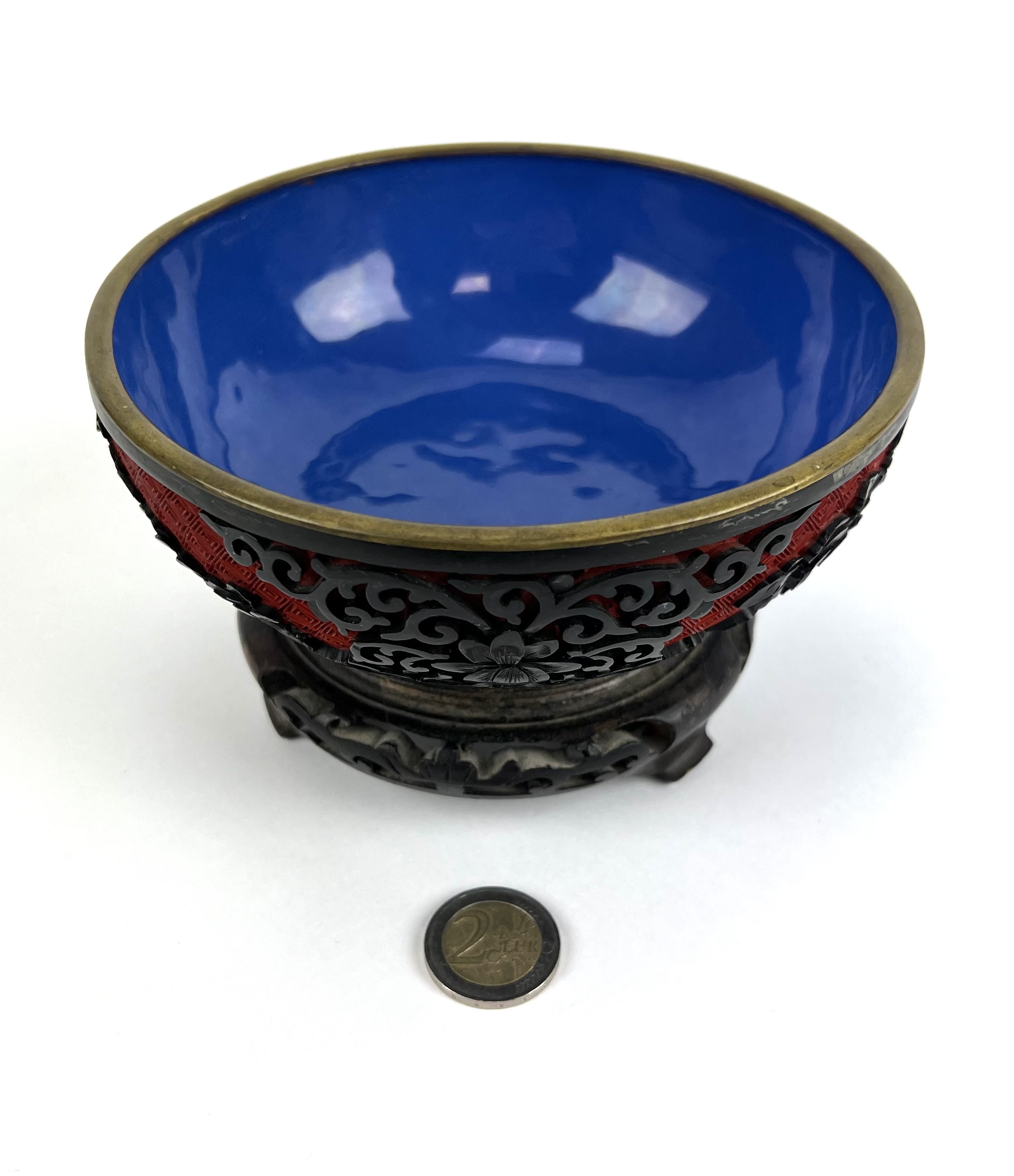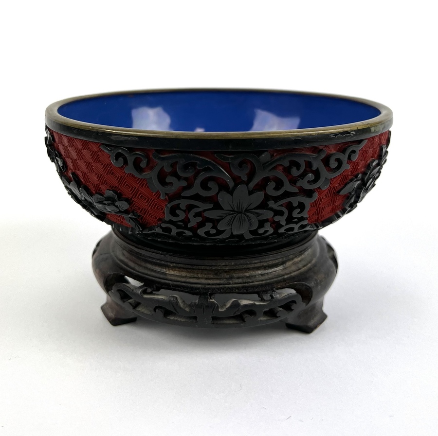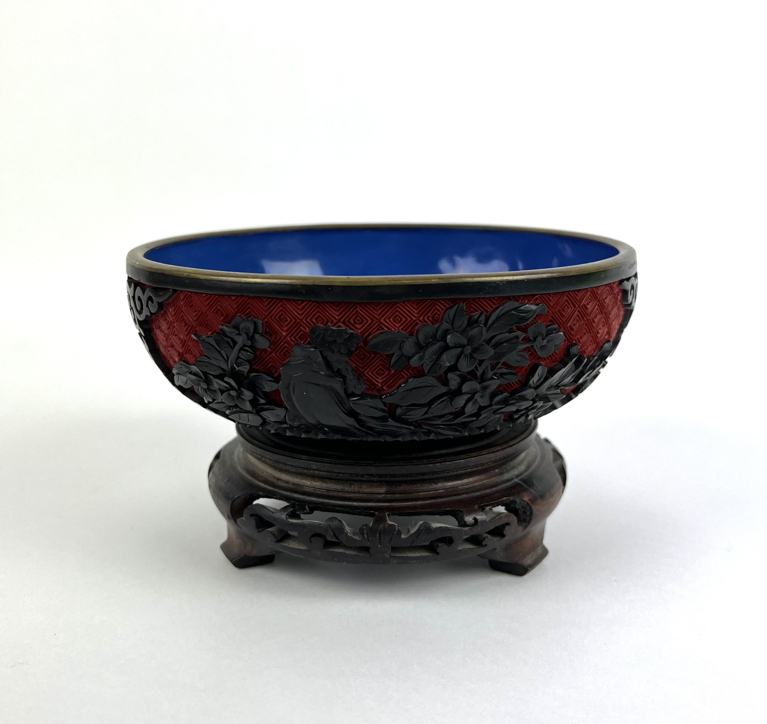 Chinese cloisonné cinnabar schaal met florale decoratie op houten voetstuk. Midden 20e eeuw. |