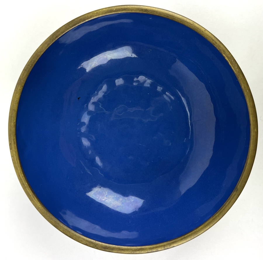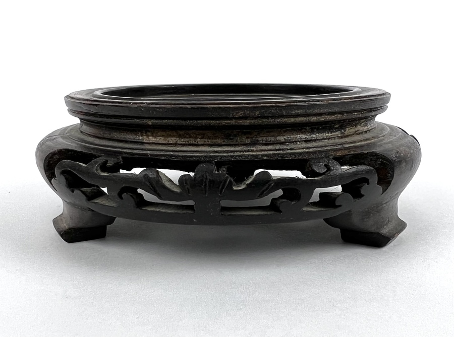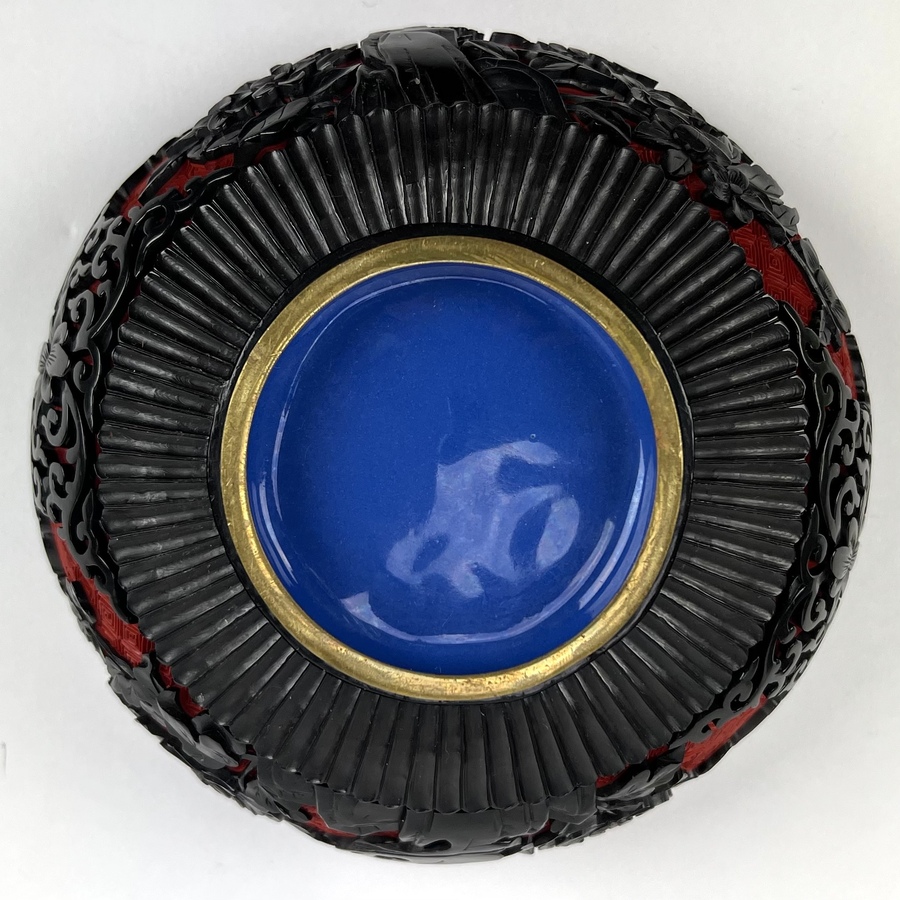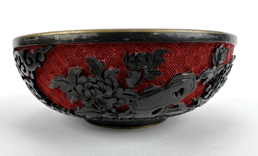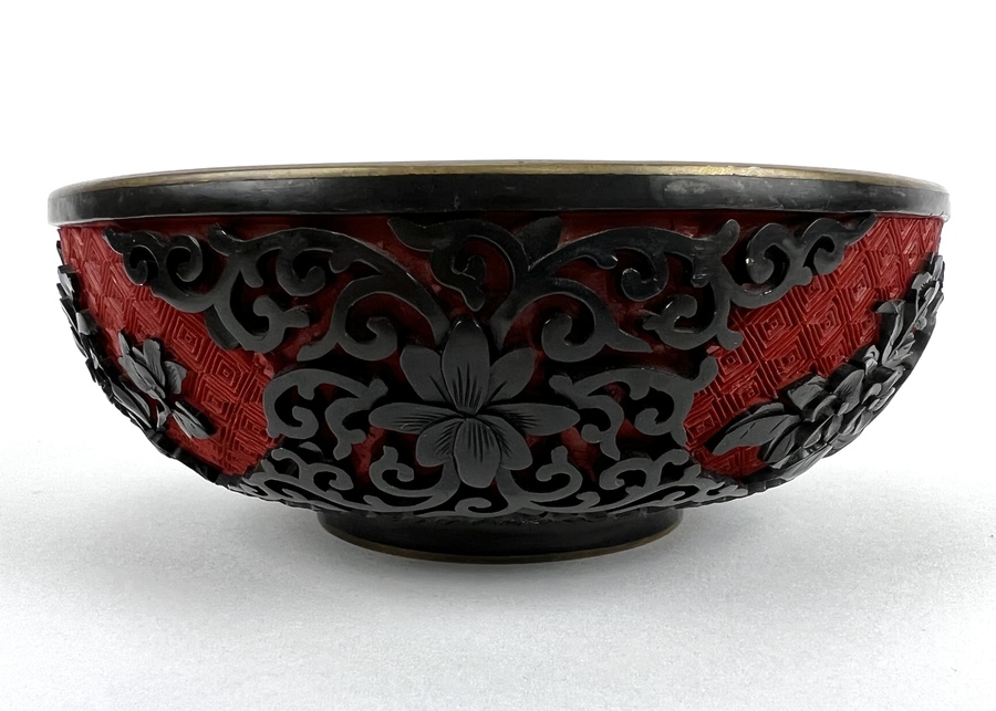 Chinese cloisonné cinnabar schaal met florale decoratie op houten voetstuk. Midden 20e eeuw. |