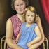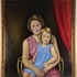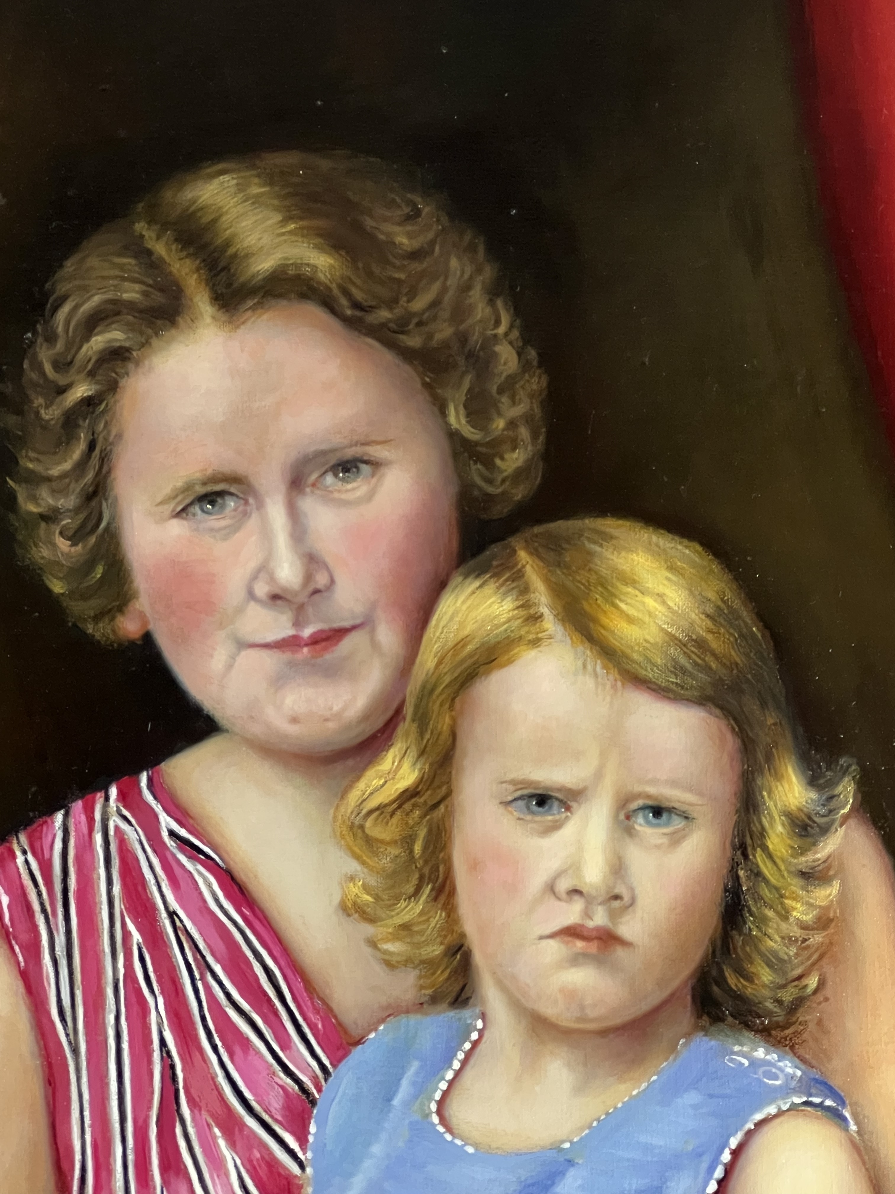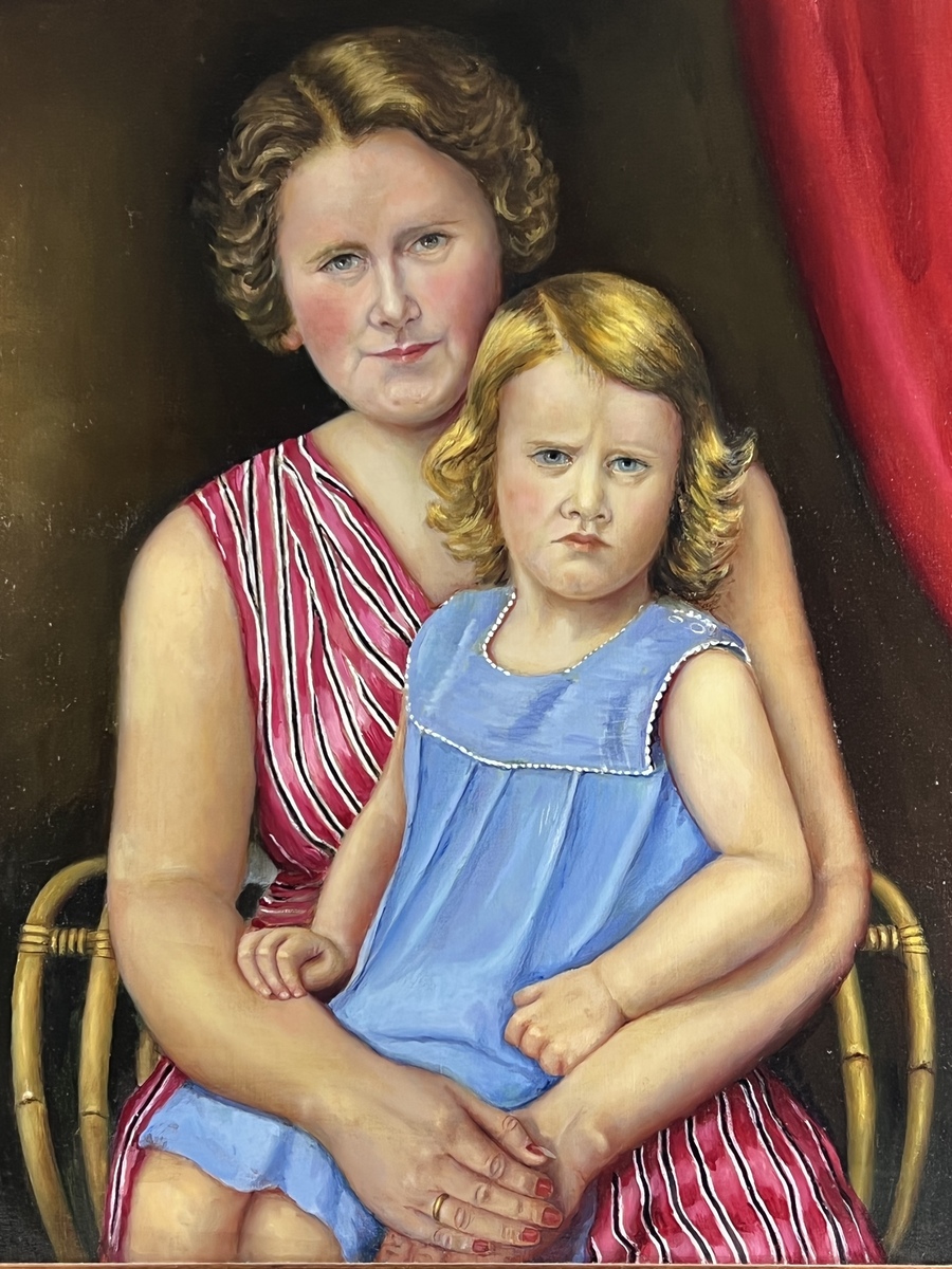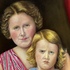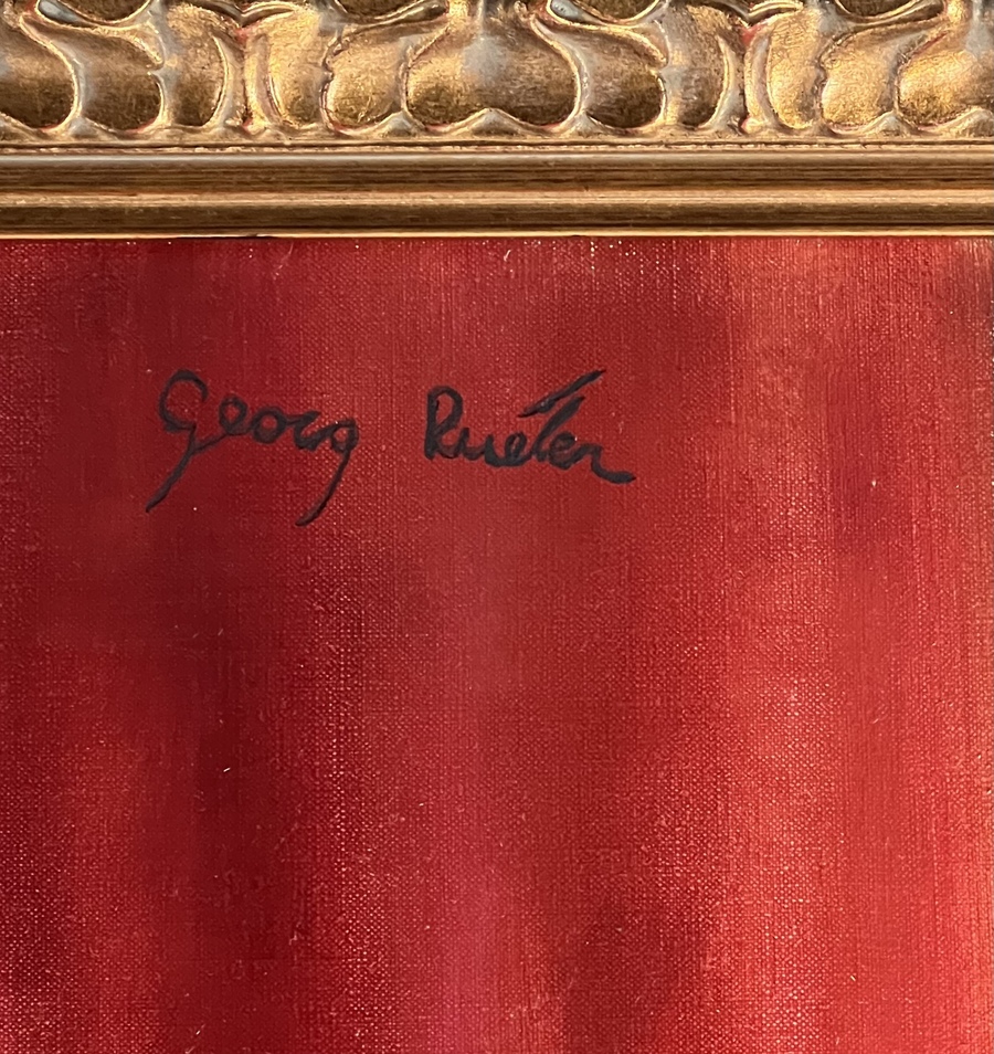 Schilderij, olieverf op doek, moeder met kind gezeten op rotanstoel. Rechtsboven gesigneerd Georg Rueter. |