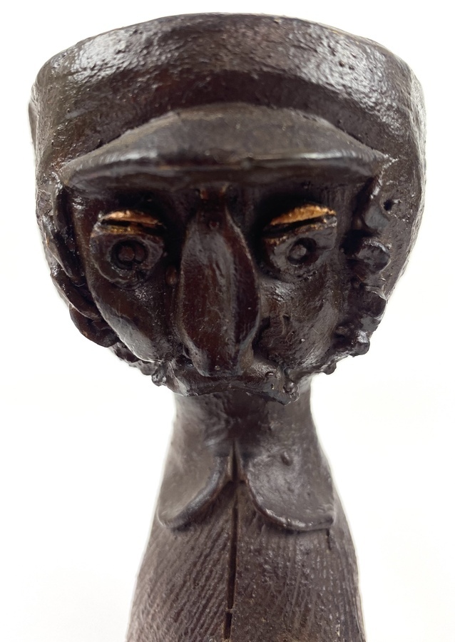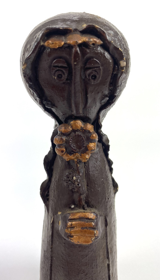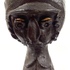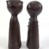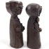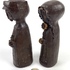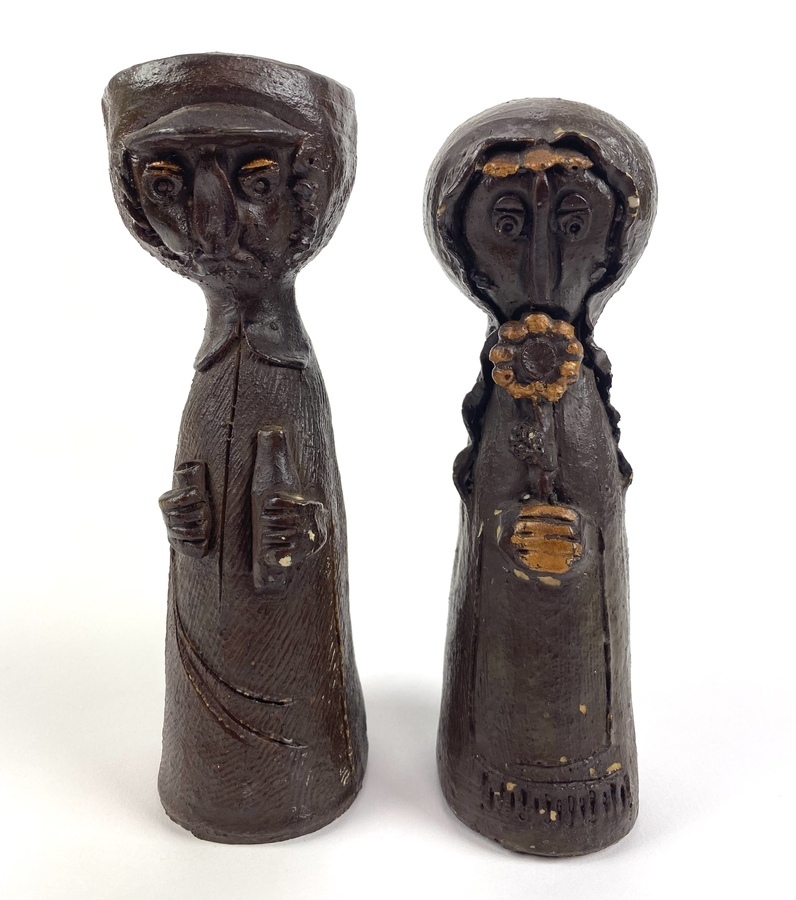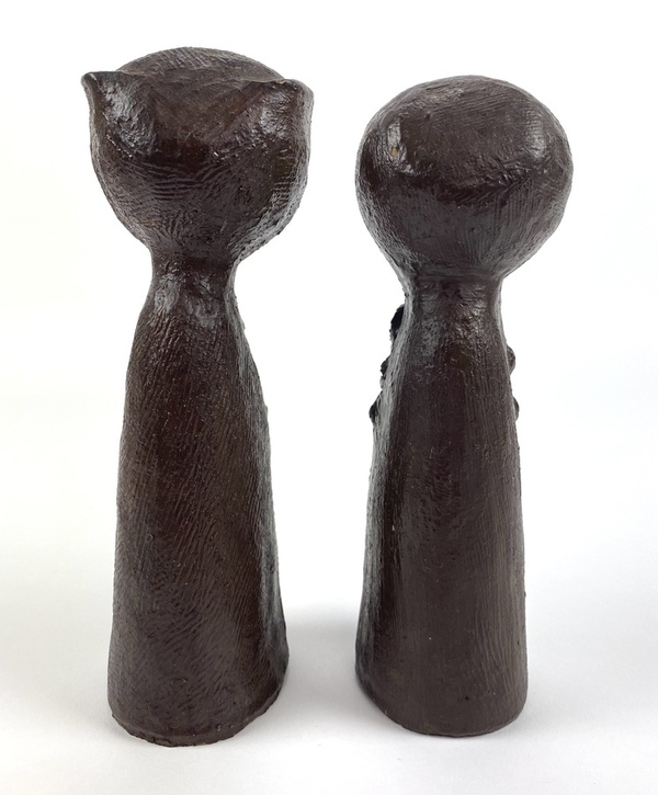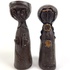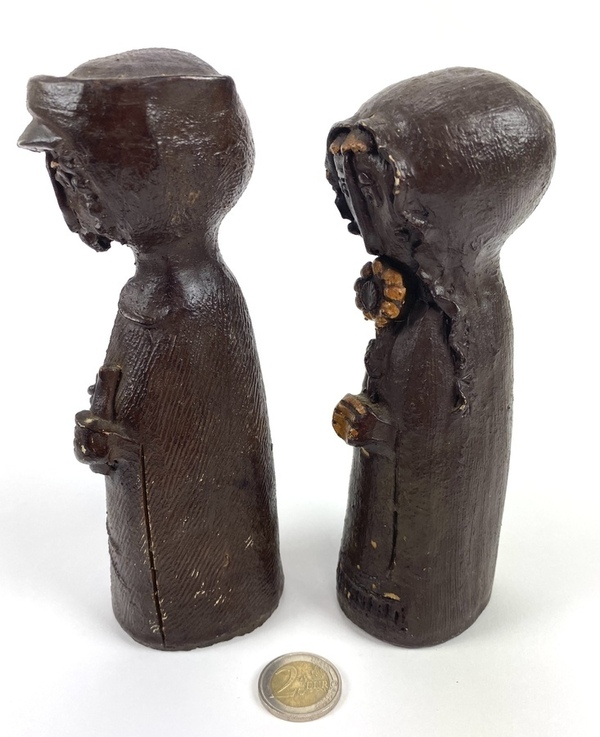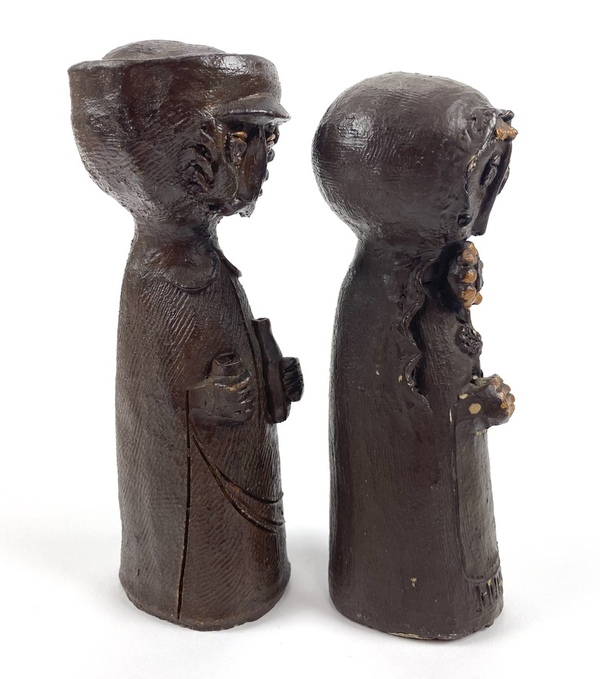 Twee polystone beelden van een man en een vrouw, afgewerkt met een dun laagje brons. |