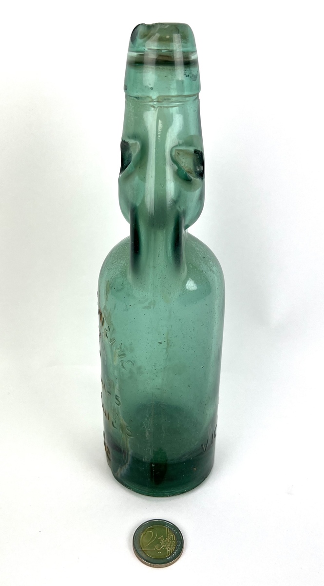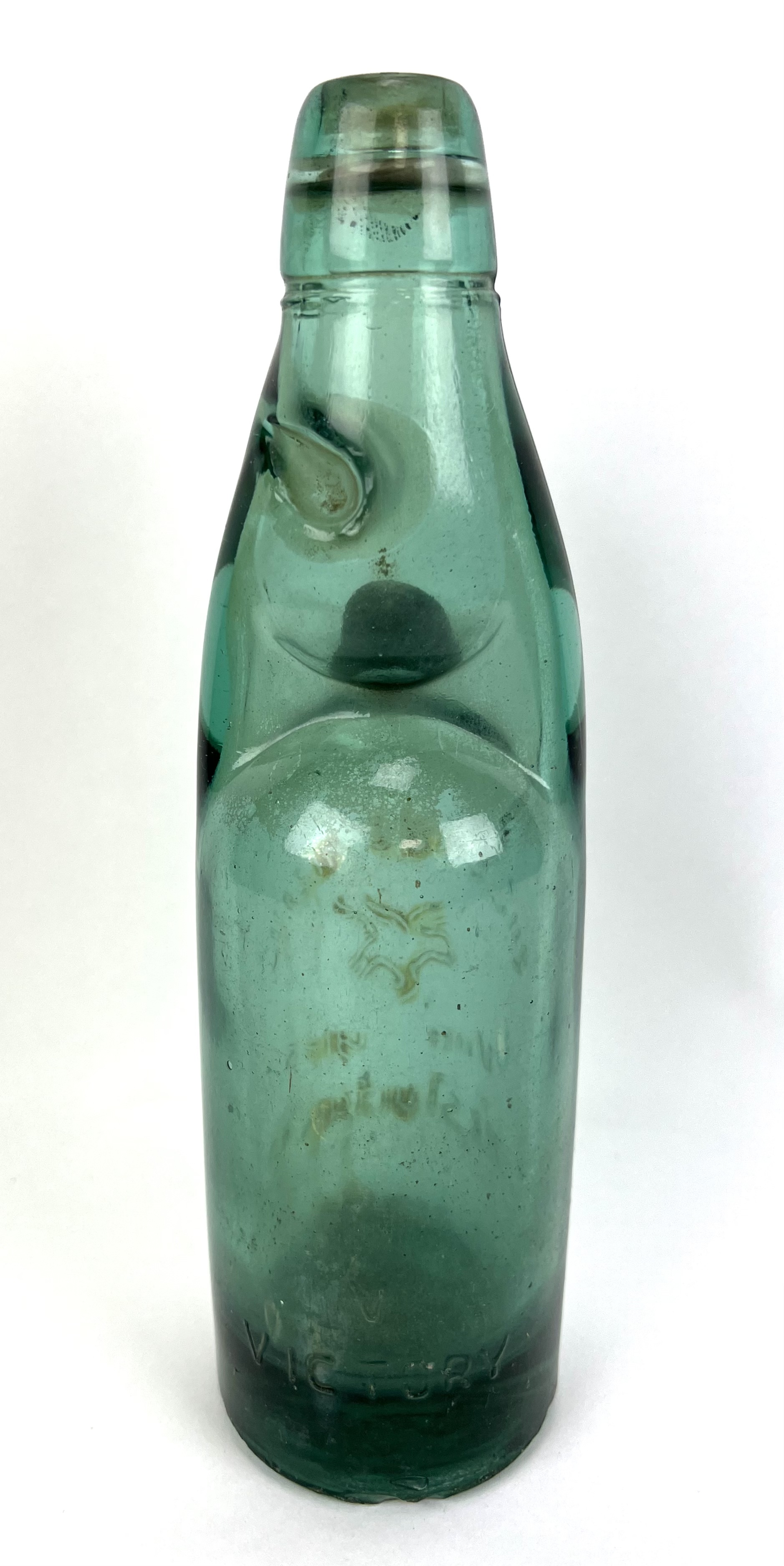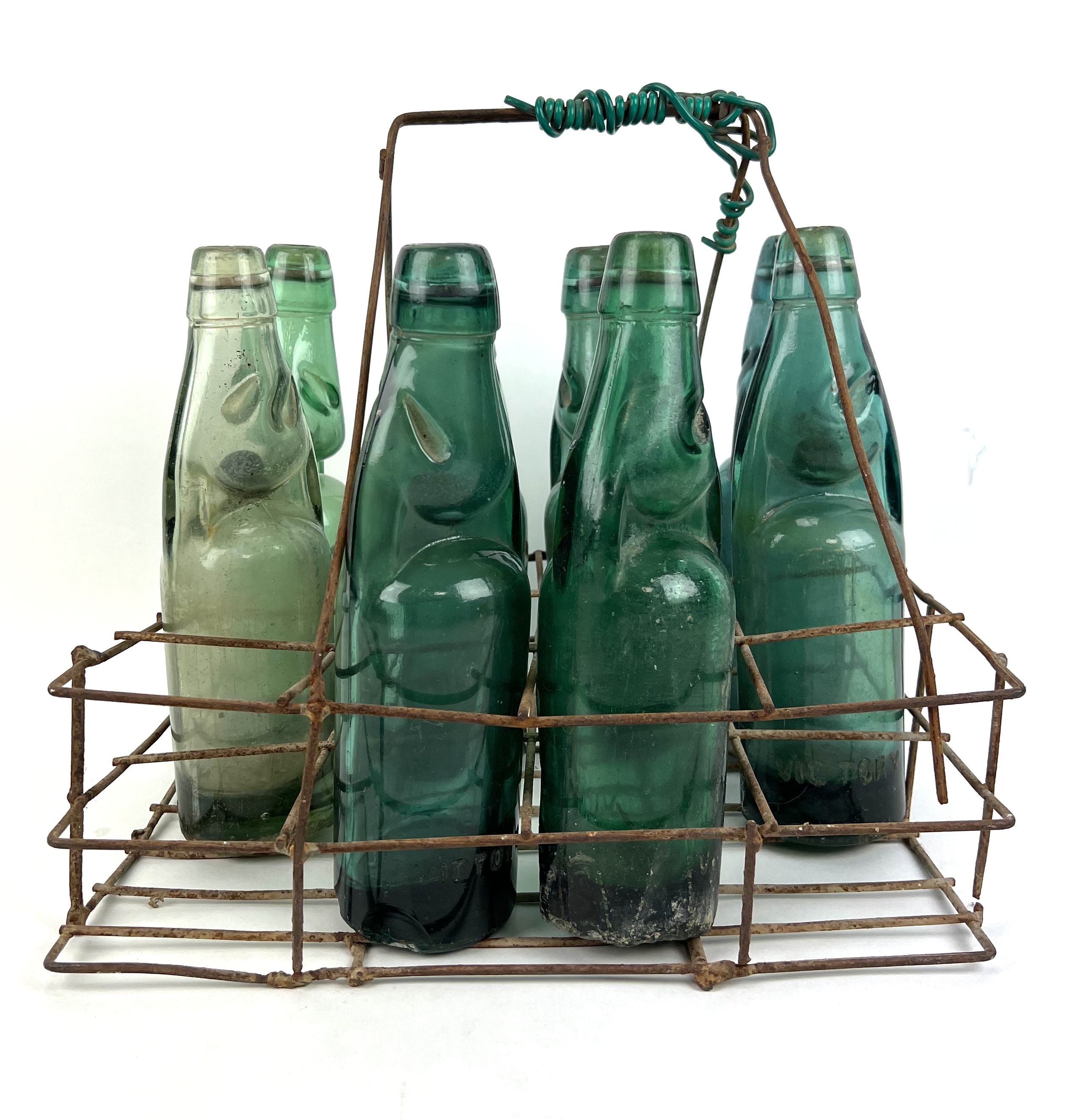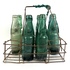Acht groene knikkerflessen voor frisdrank van het merk Victory met metalen flessenrek. Eerste helft 20e eeuw. |