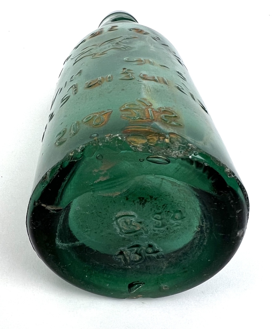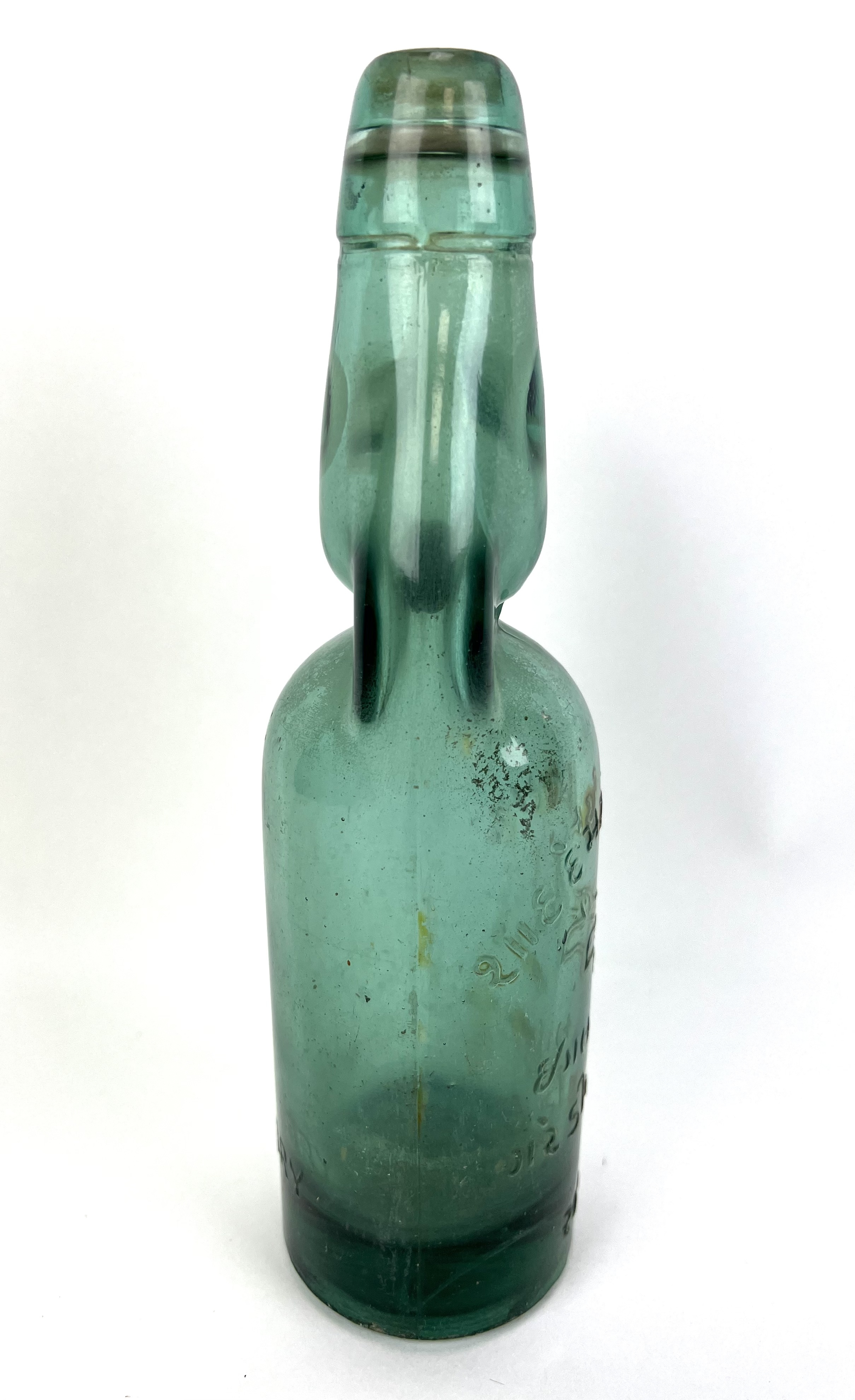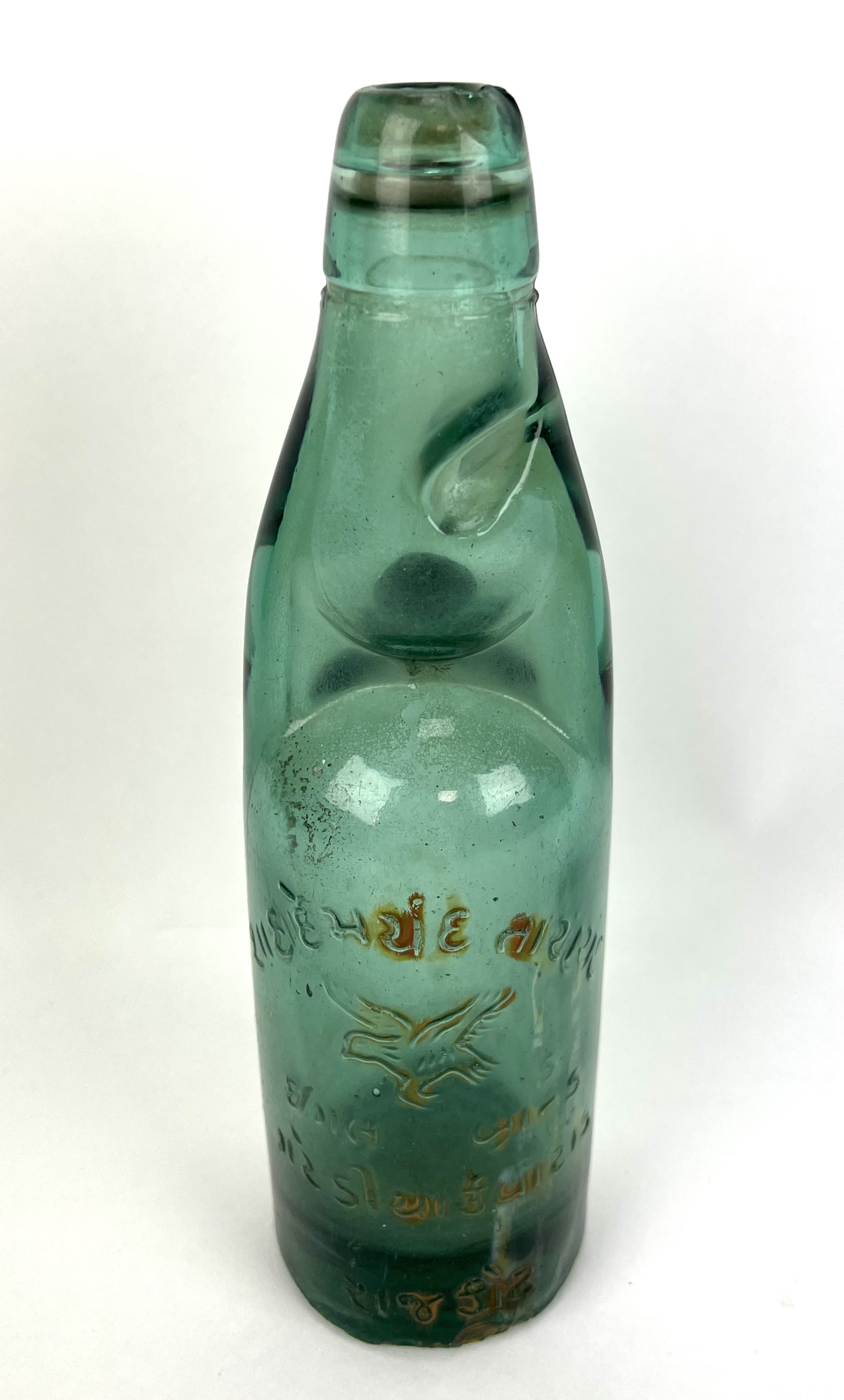 Acht groene knikkerflessen voor frisdrank van het merk Victory met metalen flessenrek. Eerste helft 20e eeuw. |