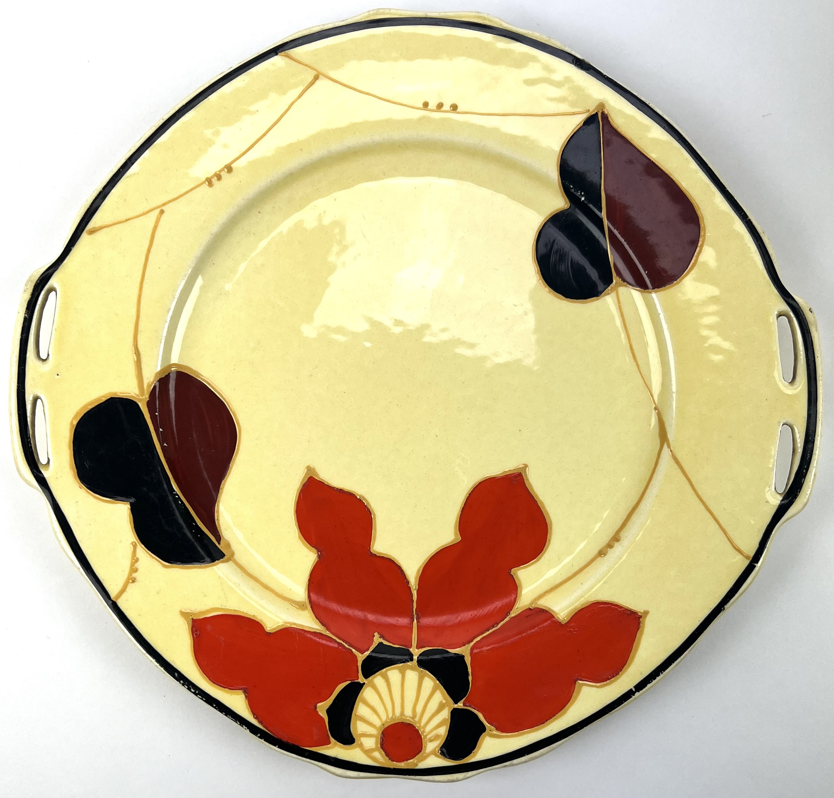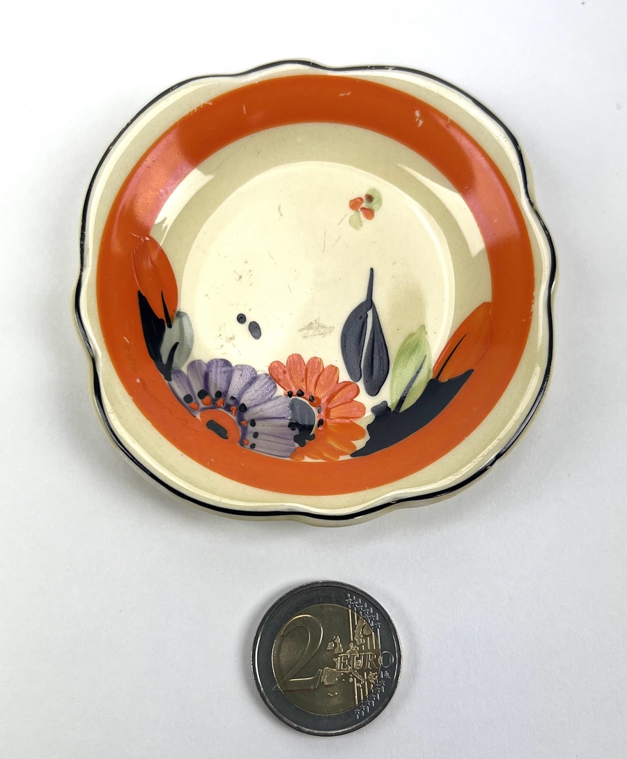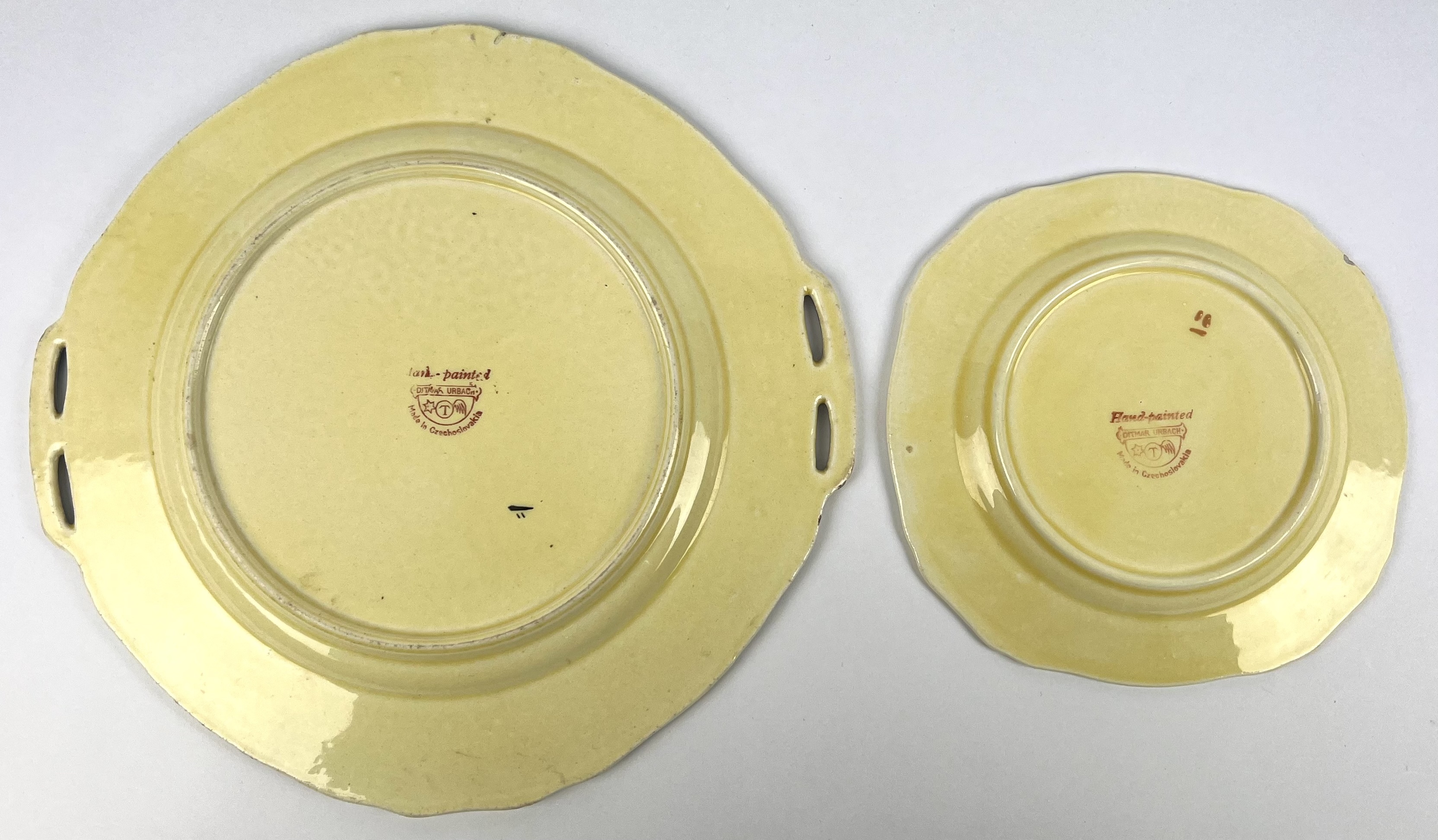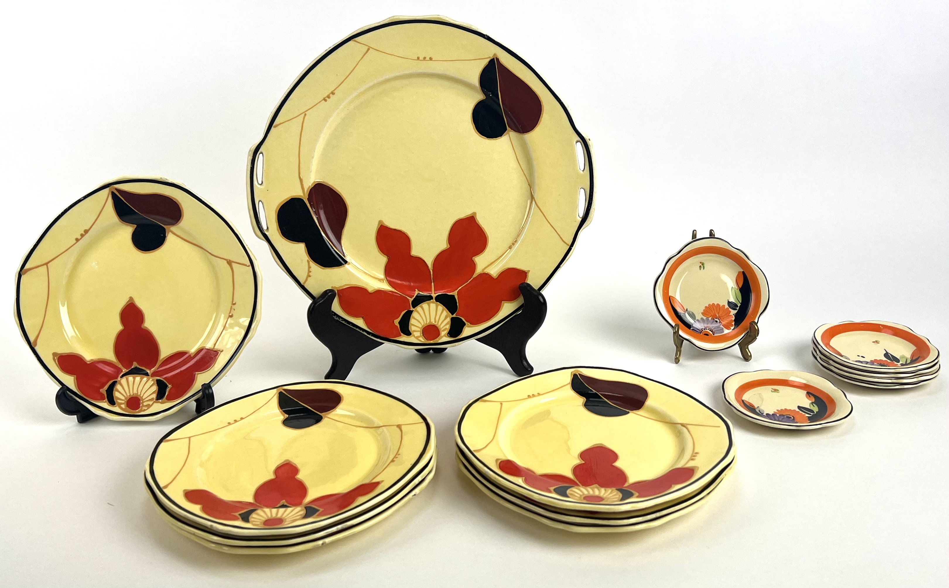 Art Deco gebakstel, grote taartschaal en zeven gebaksbordje door Ditmar Urbach, made in Czechoslovakia. Hierbij zes Art Deco bordjes met oranje band door Myott Son & Co, England. Jaren 20/30. |