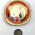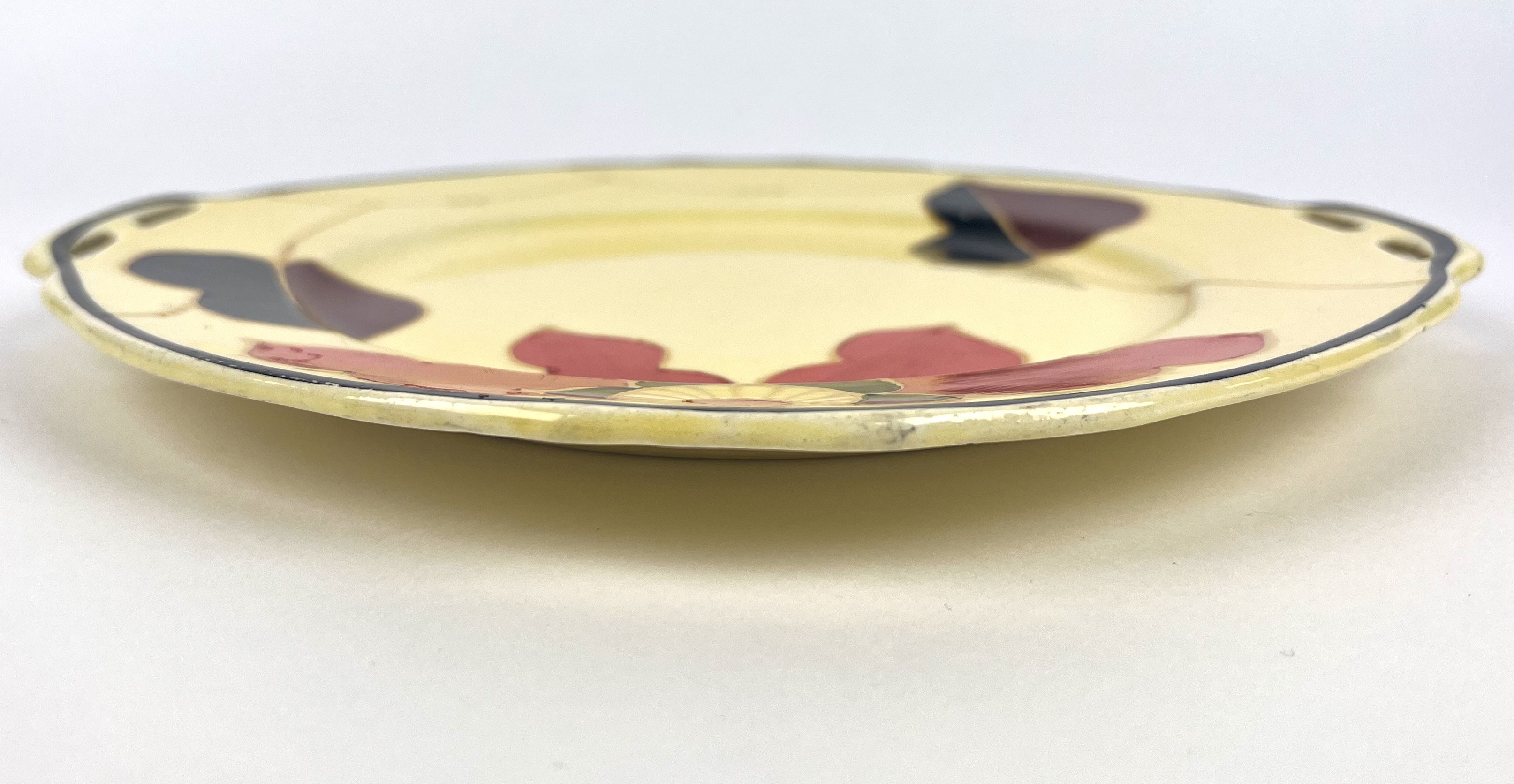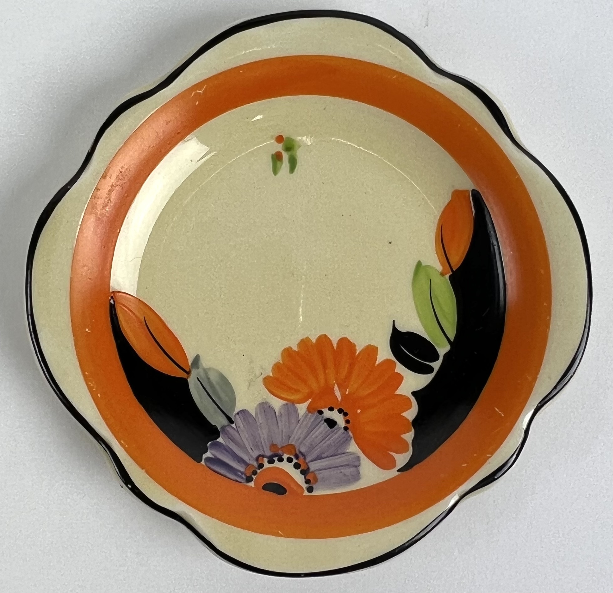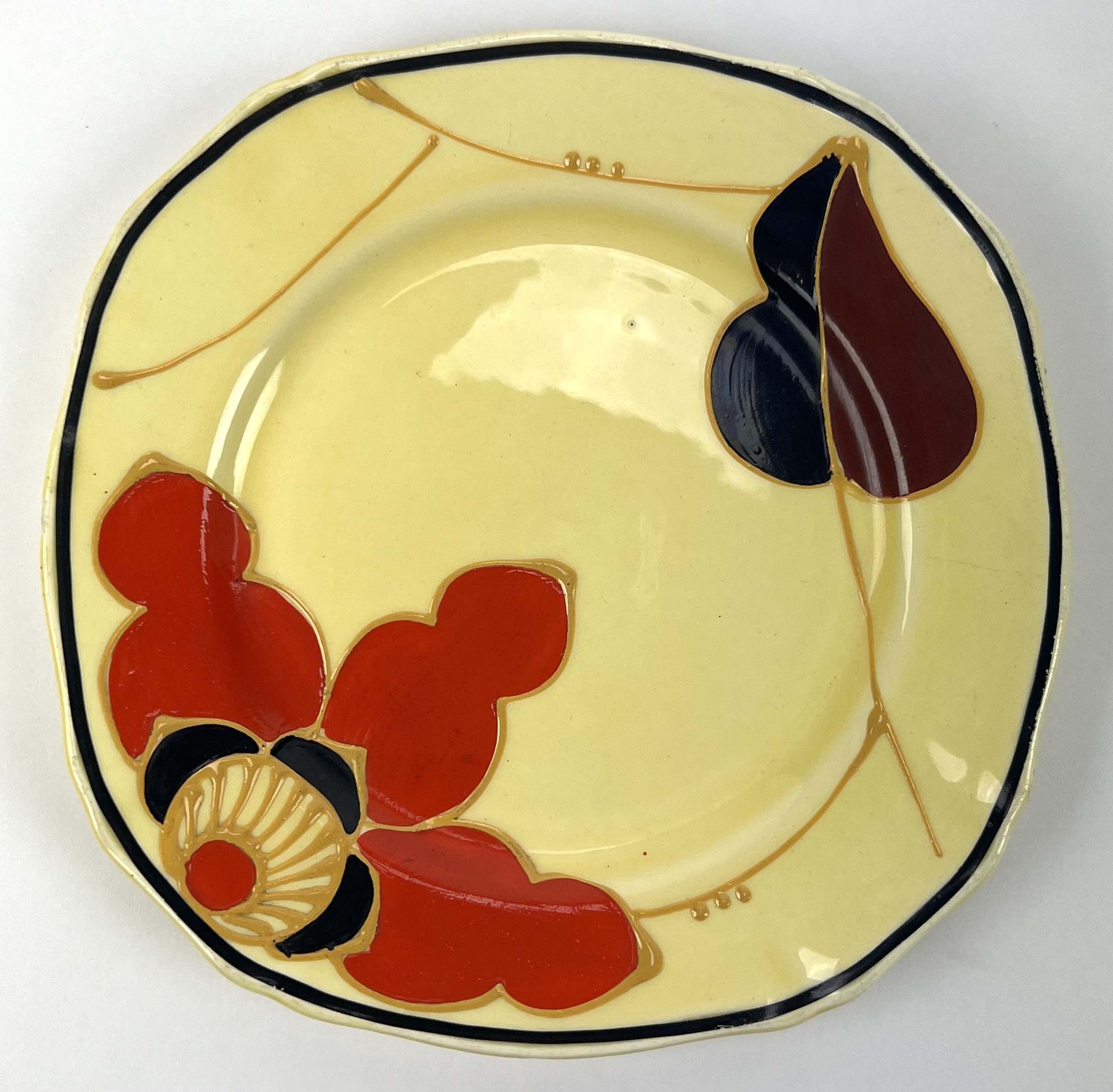 Art Deco gebakstel, grote taartschaal en zeven gebaksbordje door Ditmar Urbach, made in Czechoslovakia. Hierbij zes Art Deco bordjes met oranje band door Myott Son & Co, England. Jaren 20/30. |