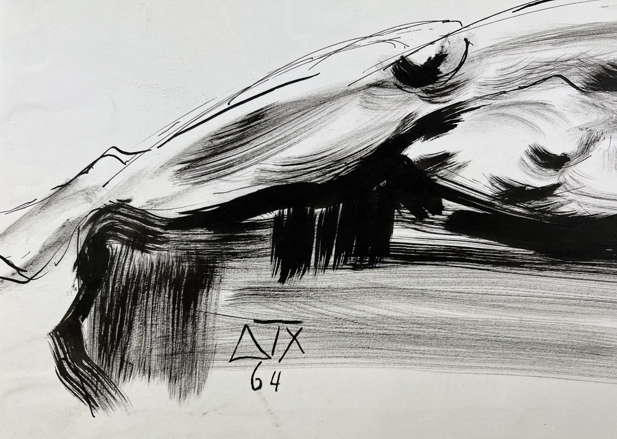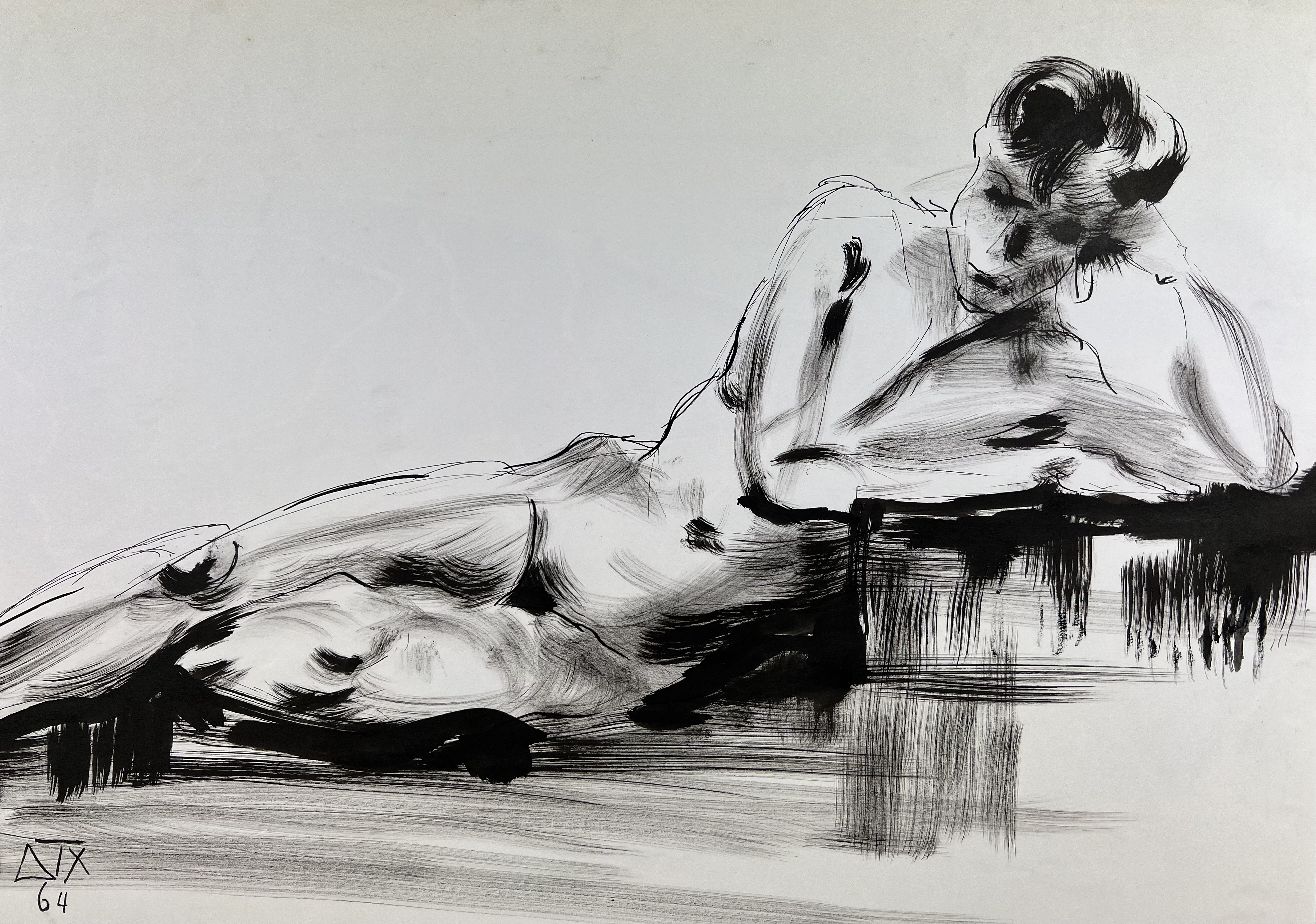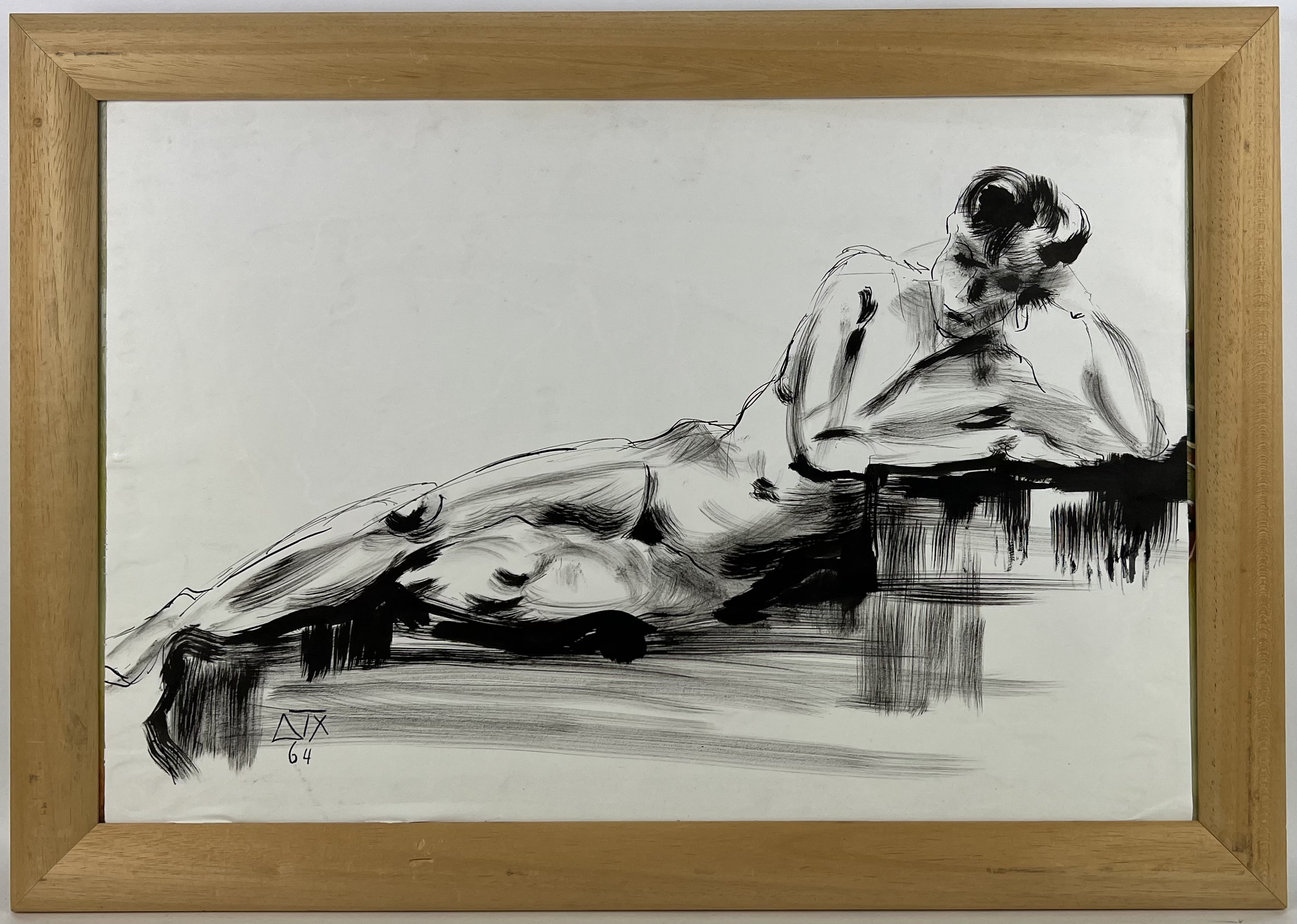Inkttekening van liggend manlijk naakt op papier. Linksonder gesigneerd met monogram en ‘64. |