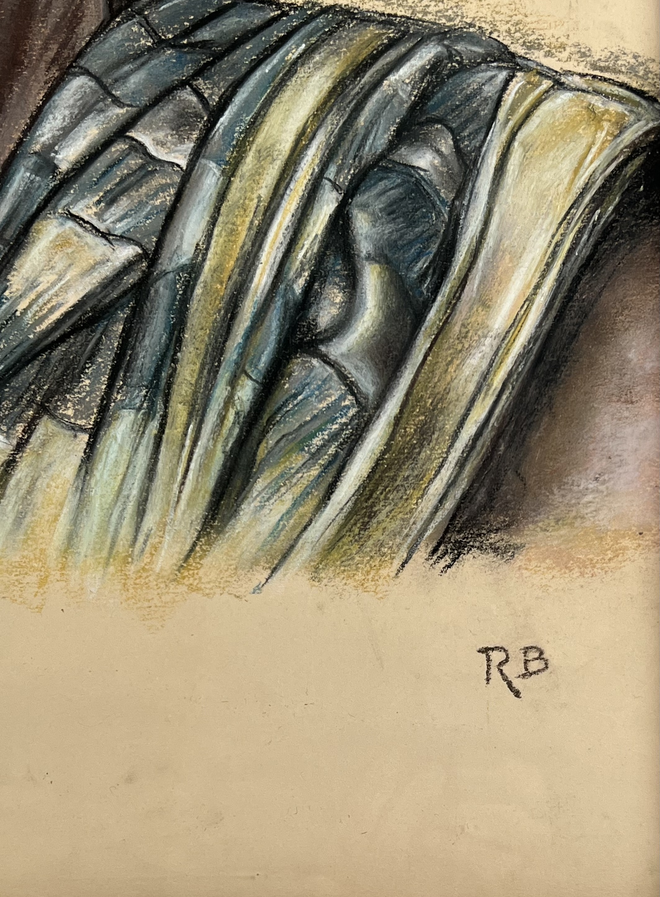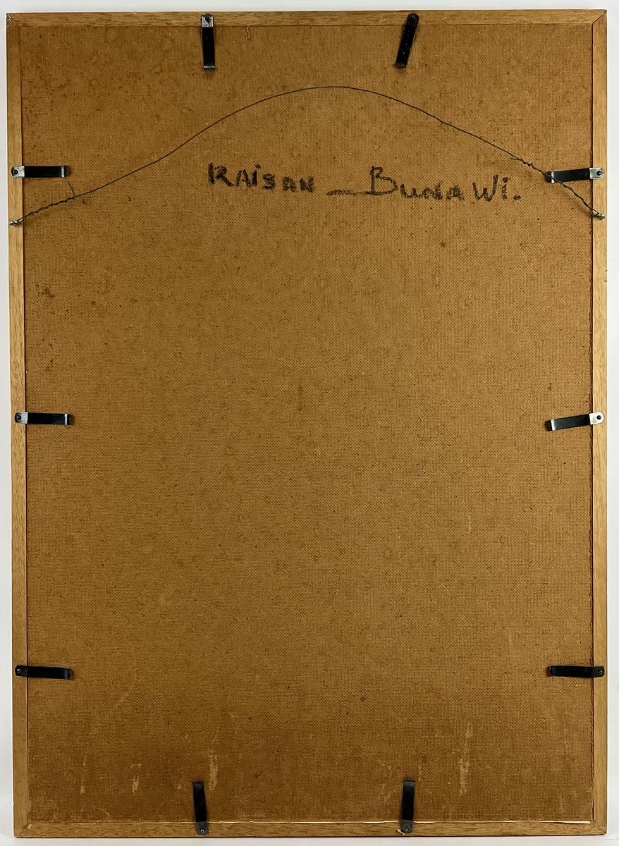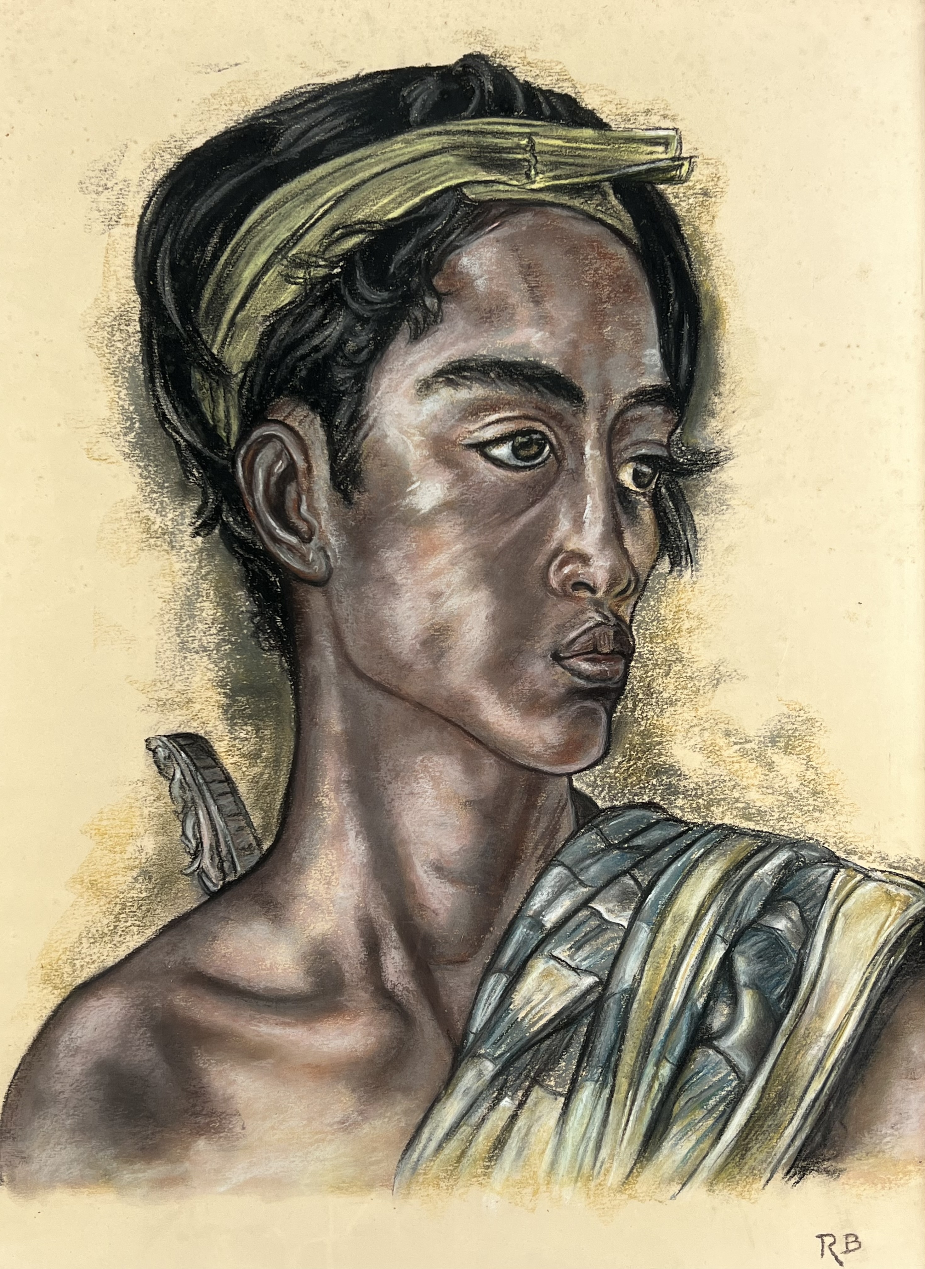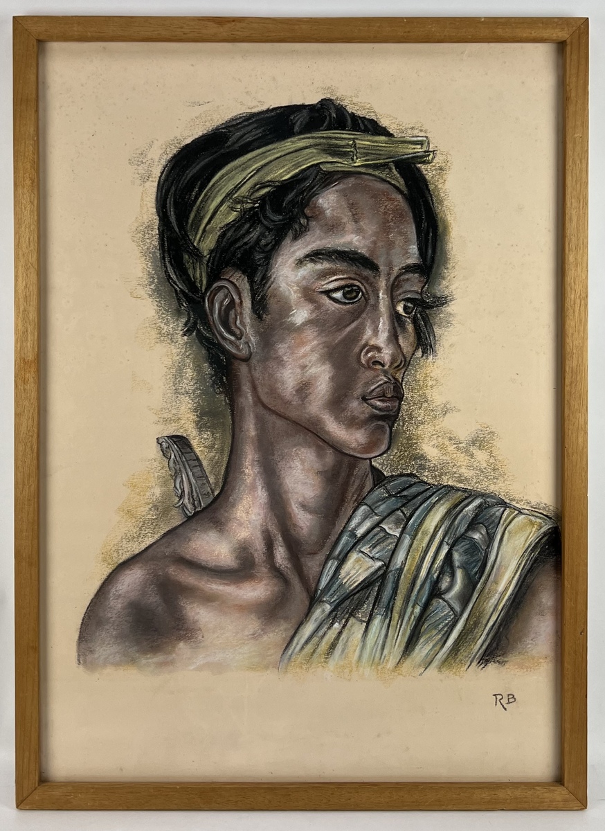 Pastelkrijttekening op papier van Balinese man naar Rudolf Bonnet. Rechtsonder gesigneerd met monogram RB. Verso vermelding van de naam Raisan Bunawi, 20e eeuw. |