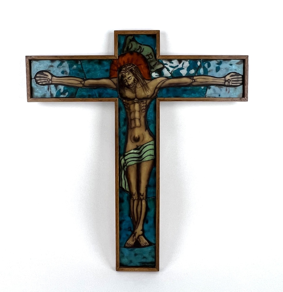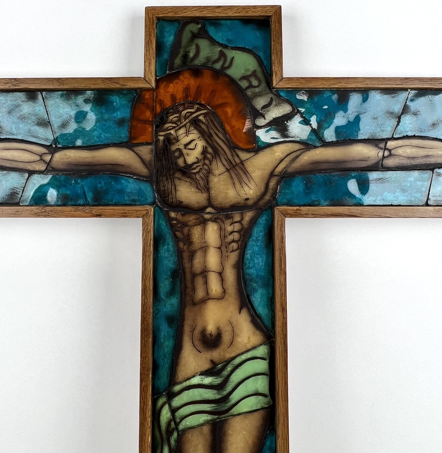 Glazen tegelfragmenten crucifix in houten raamwerk, Antonius Gerardus (Toon) Merkelbach (1916-2005). Gesigneerd onderaan het kruis. |