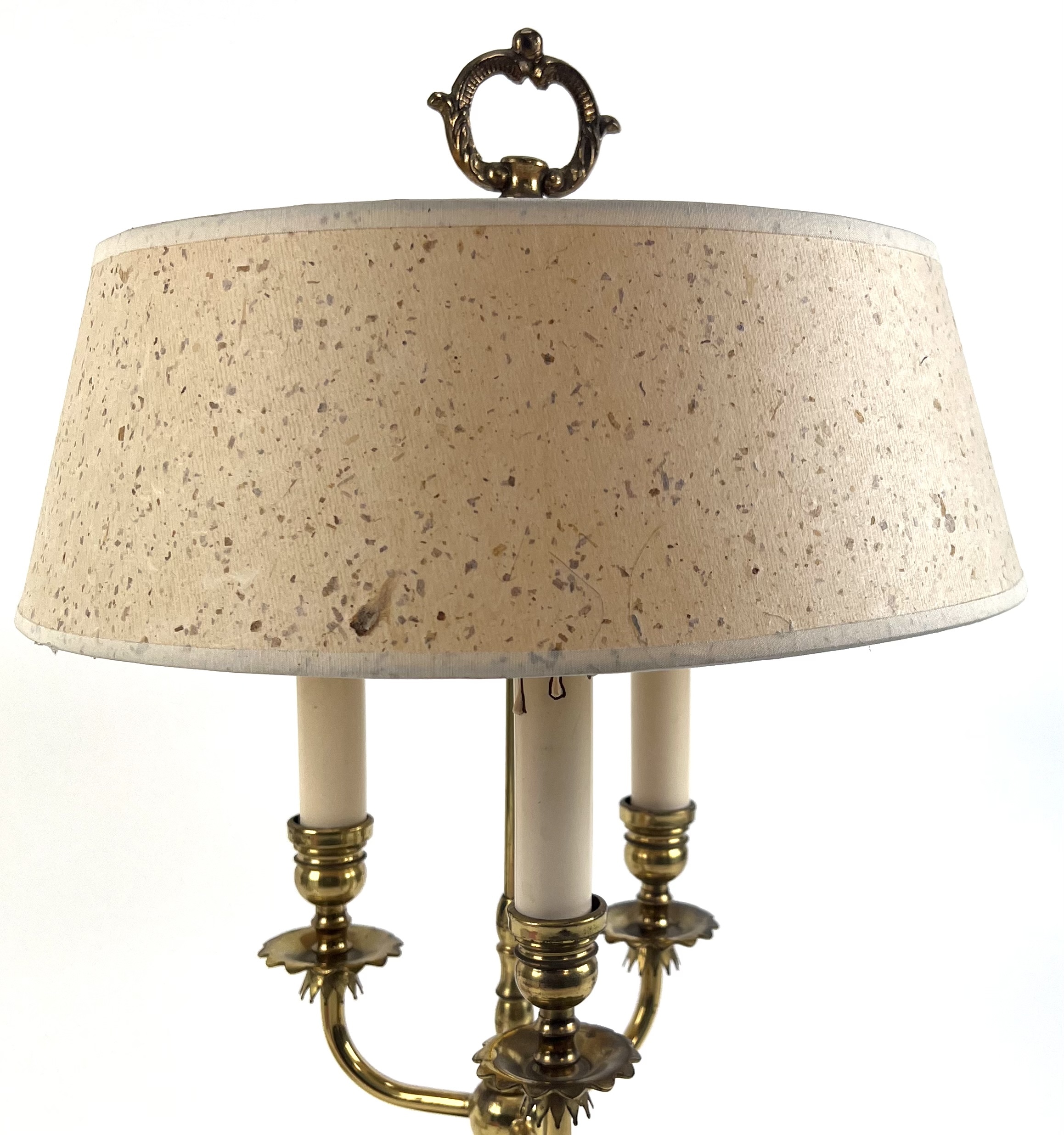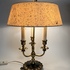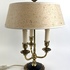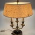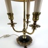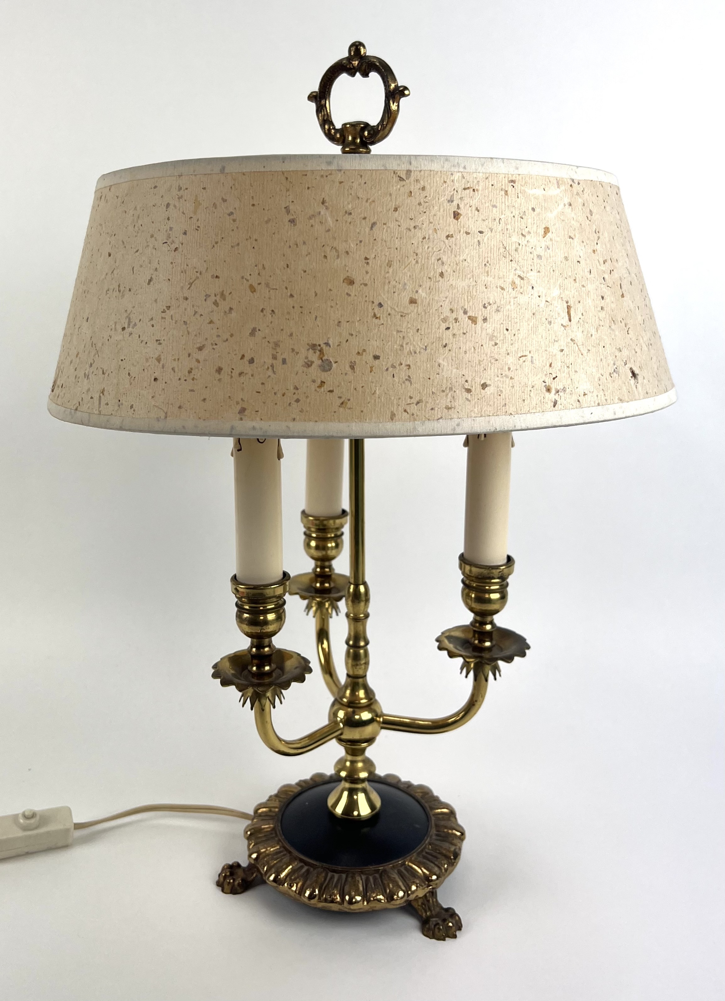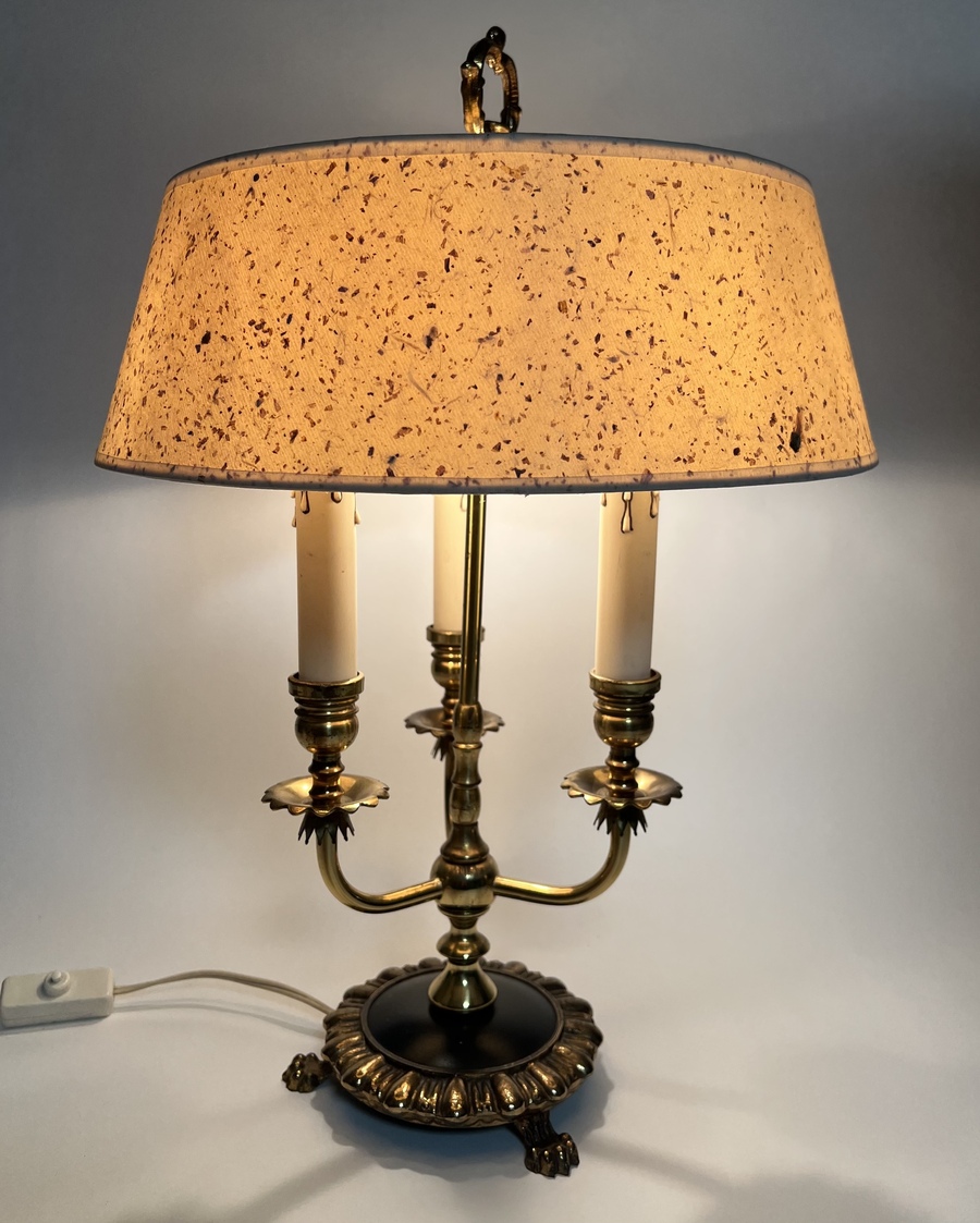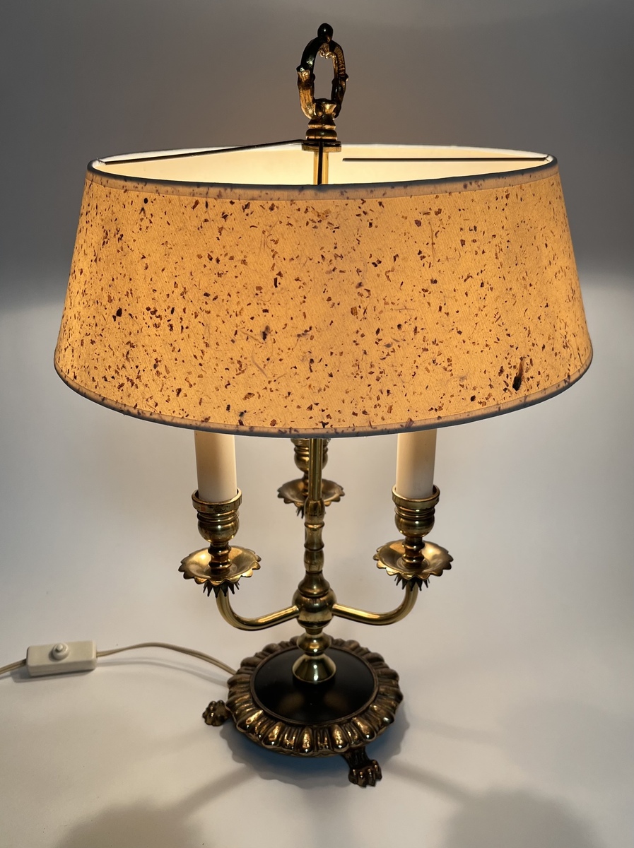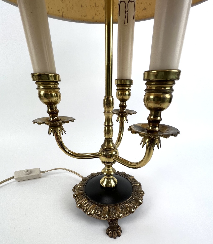 Franse bouillotte tafellamp op leeuwenpootjes, in messing uitgevoerd met drie lichtpunten. Jaren 50/60. |