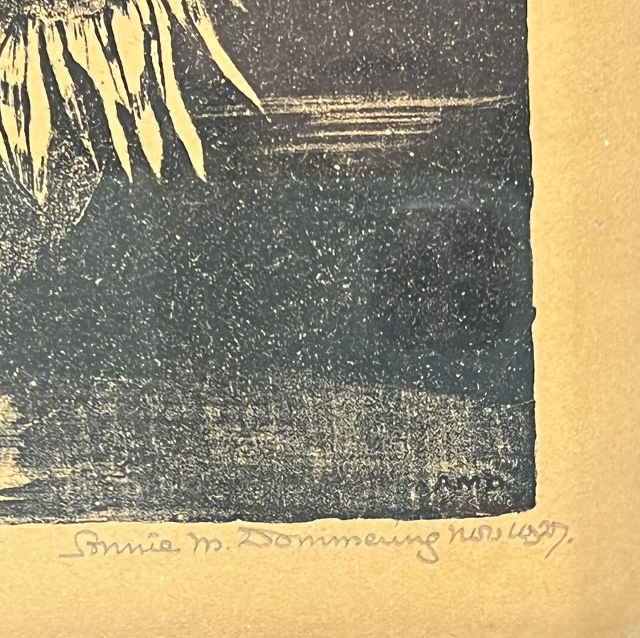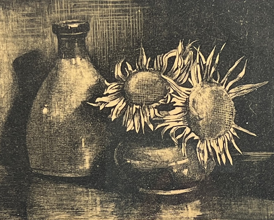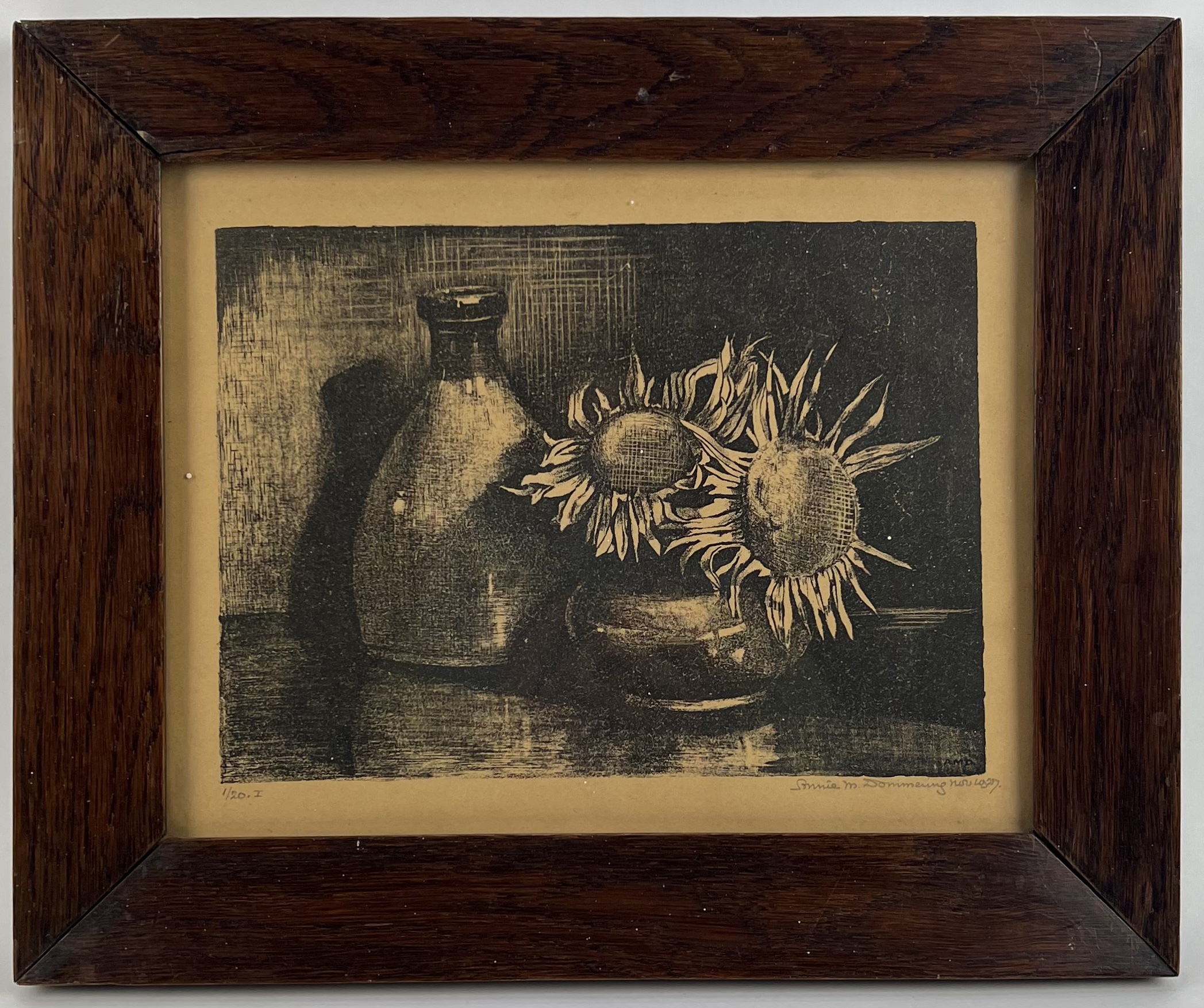 Gravure van een stilleven met zonnebloemen van Annie M. Dommering (1896-1949), oplage 1/20. Rechtsonder gesigneerd met potlood en gedateerd 1927. |