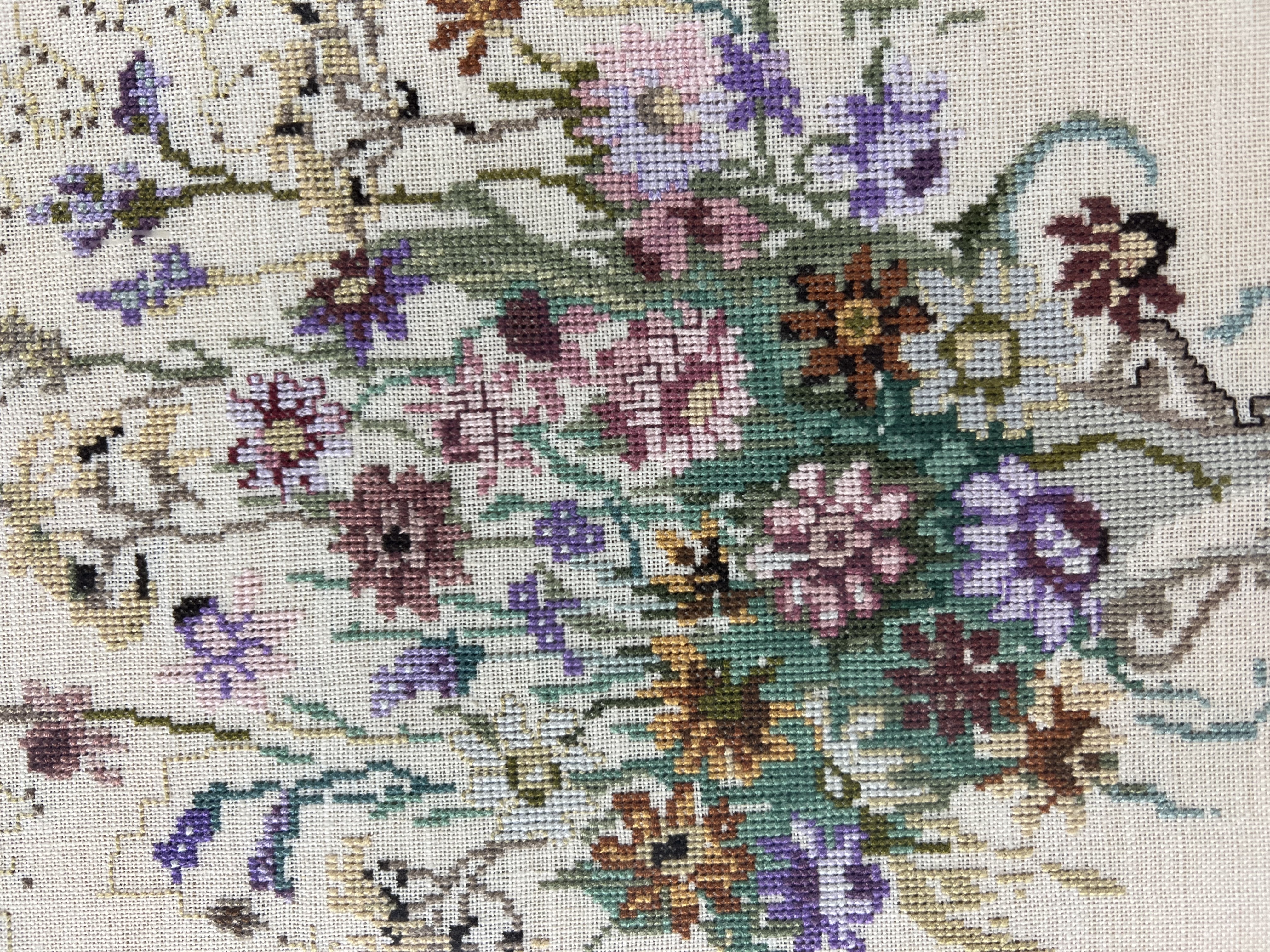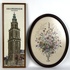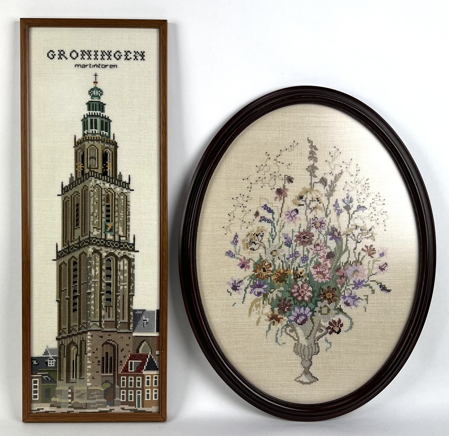 Twee ingelijste borduurwerken, de Groninger Martinitoren en een bloemboeket in vaas. Derde kwart 20e eeuw. |