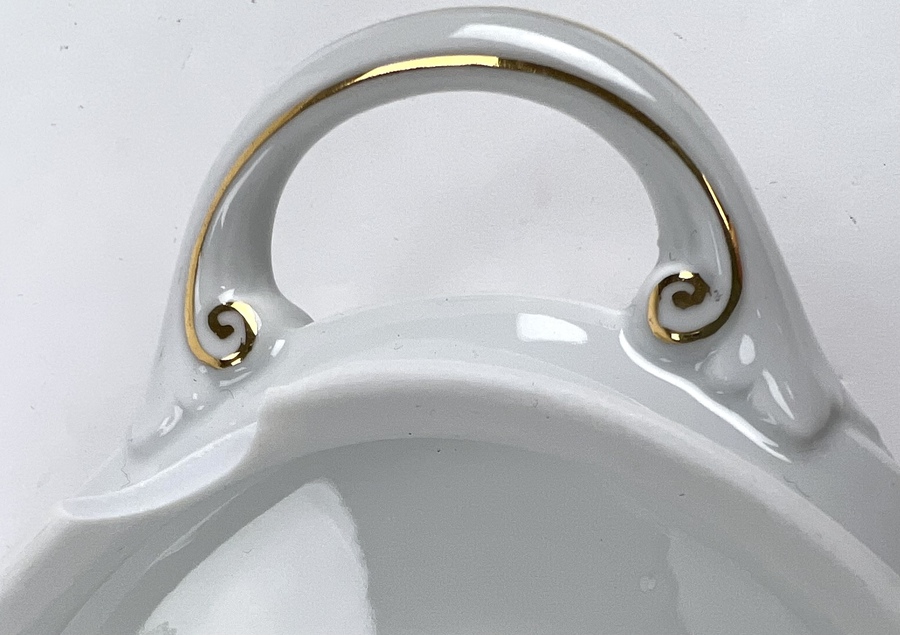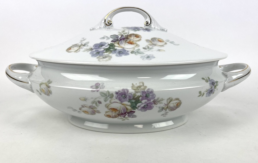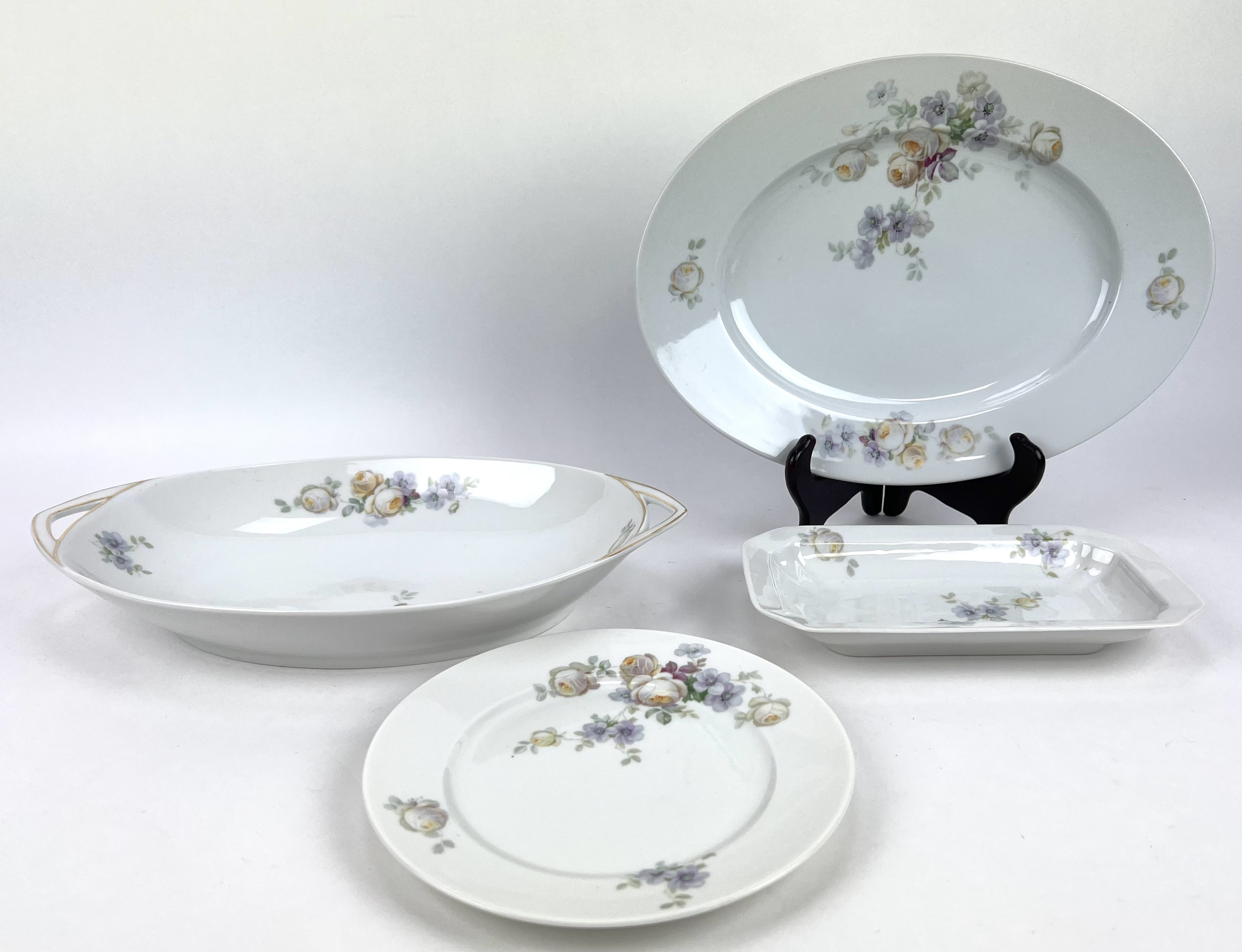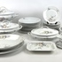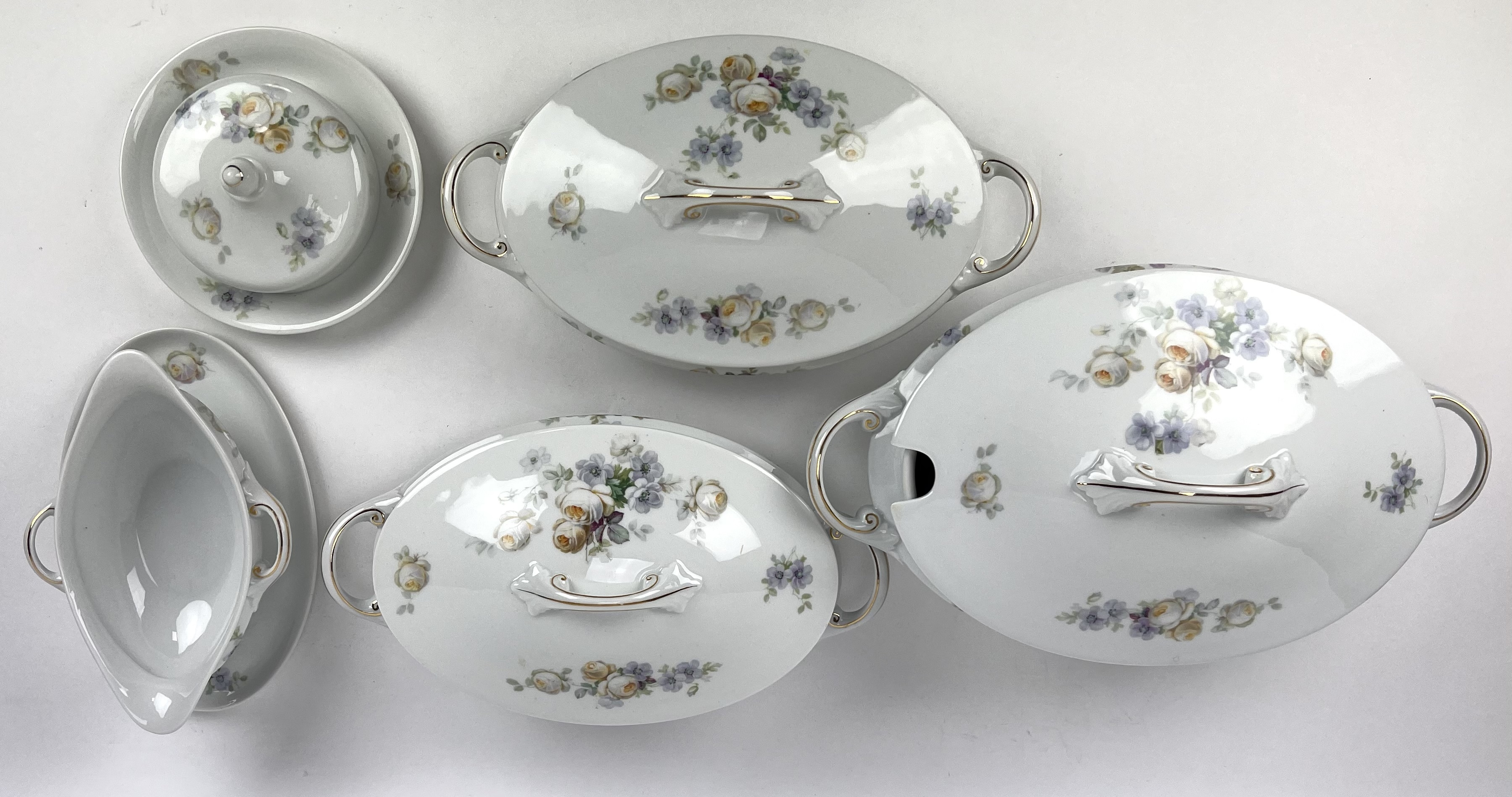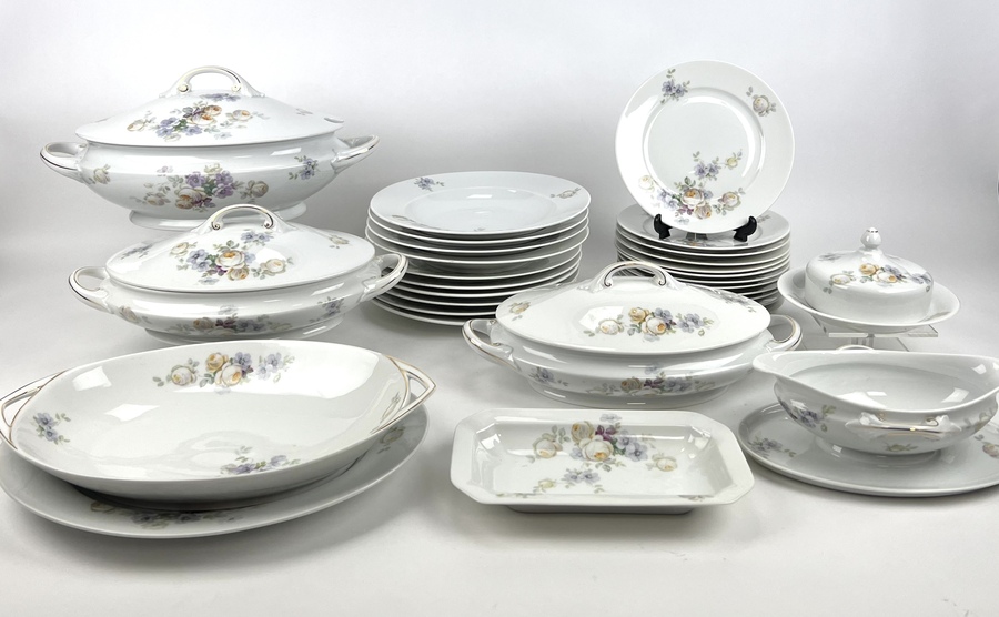 Compleet porseleinen servies van Rosenthal, Bavaria bestaande uit twaalf dinerborden, tien voorgerecht borden, drie dekselschalen, drie serveerschalen, saucière en botervloot. Modelnaam Sanssouci met roos decoratie en vergulde elementen. Tweede helft 20e eeuw. |