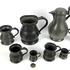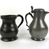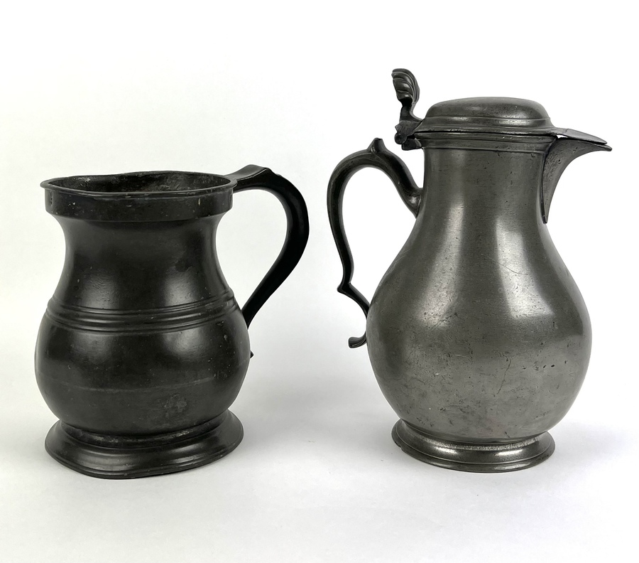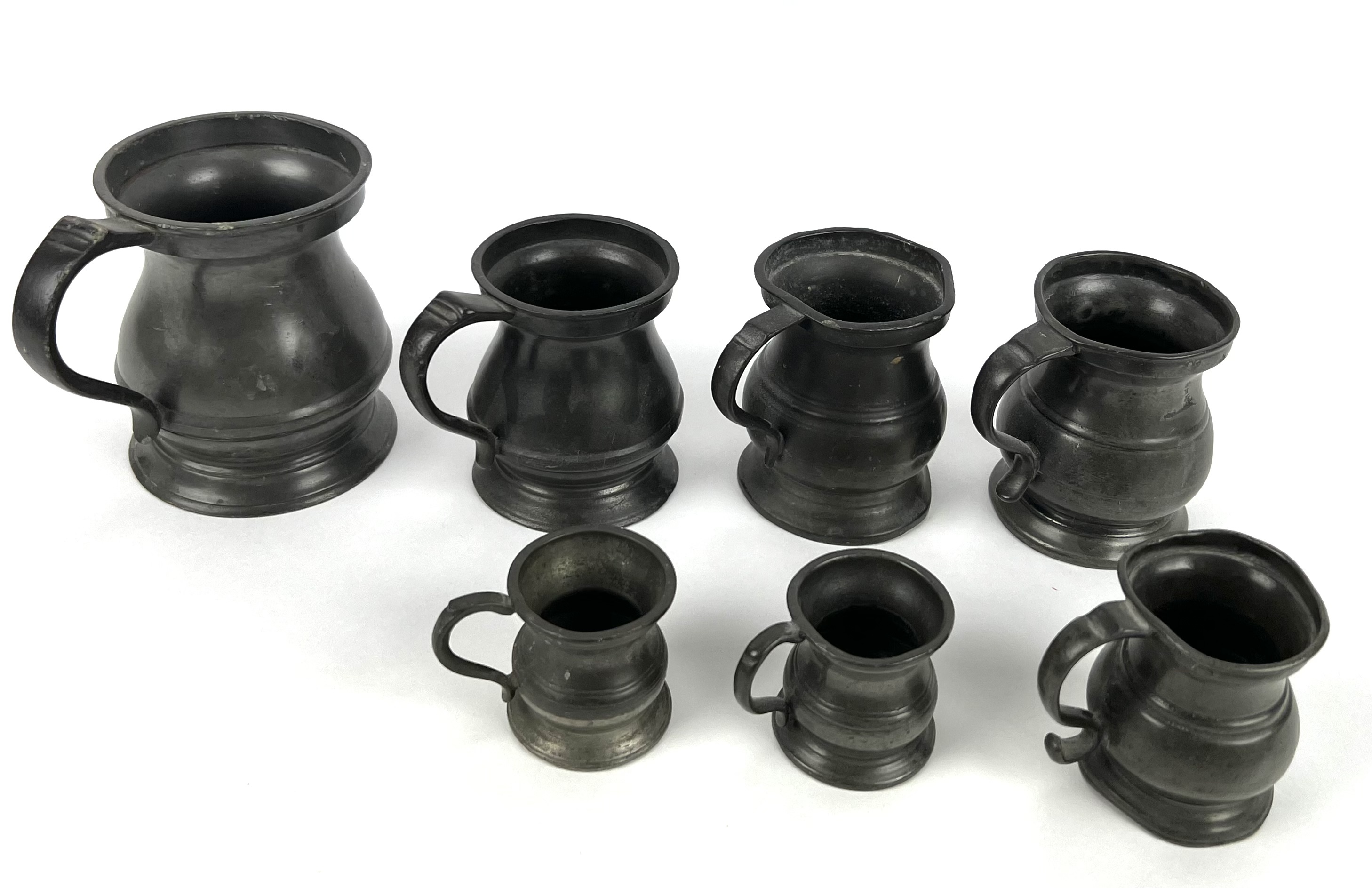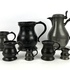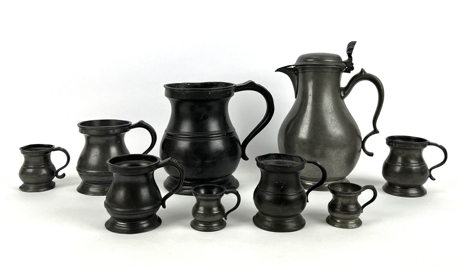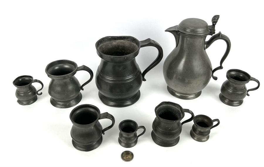Acht tinnen bekers in verschillende grootte en een schenkkan met deksel, aan de onderzijde gemerkt. Circa 1900. |