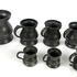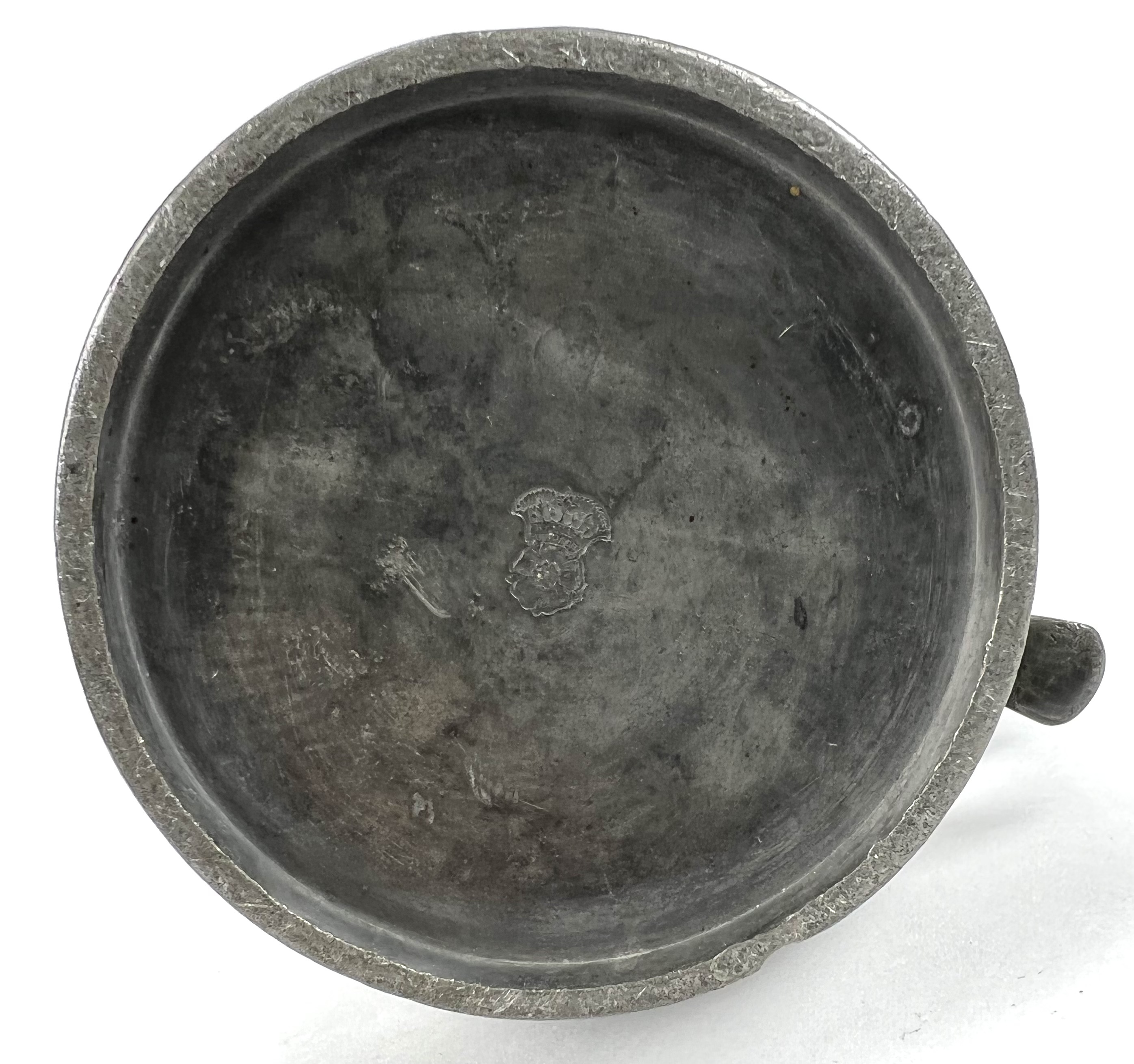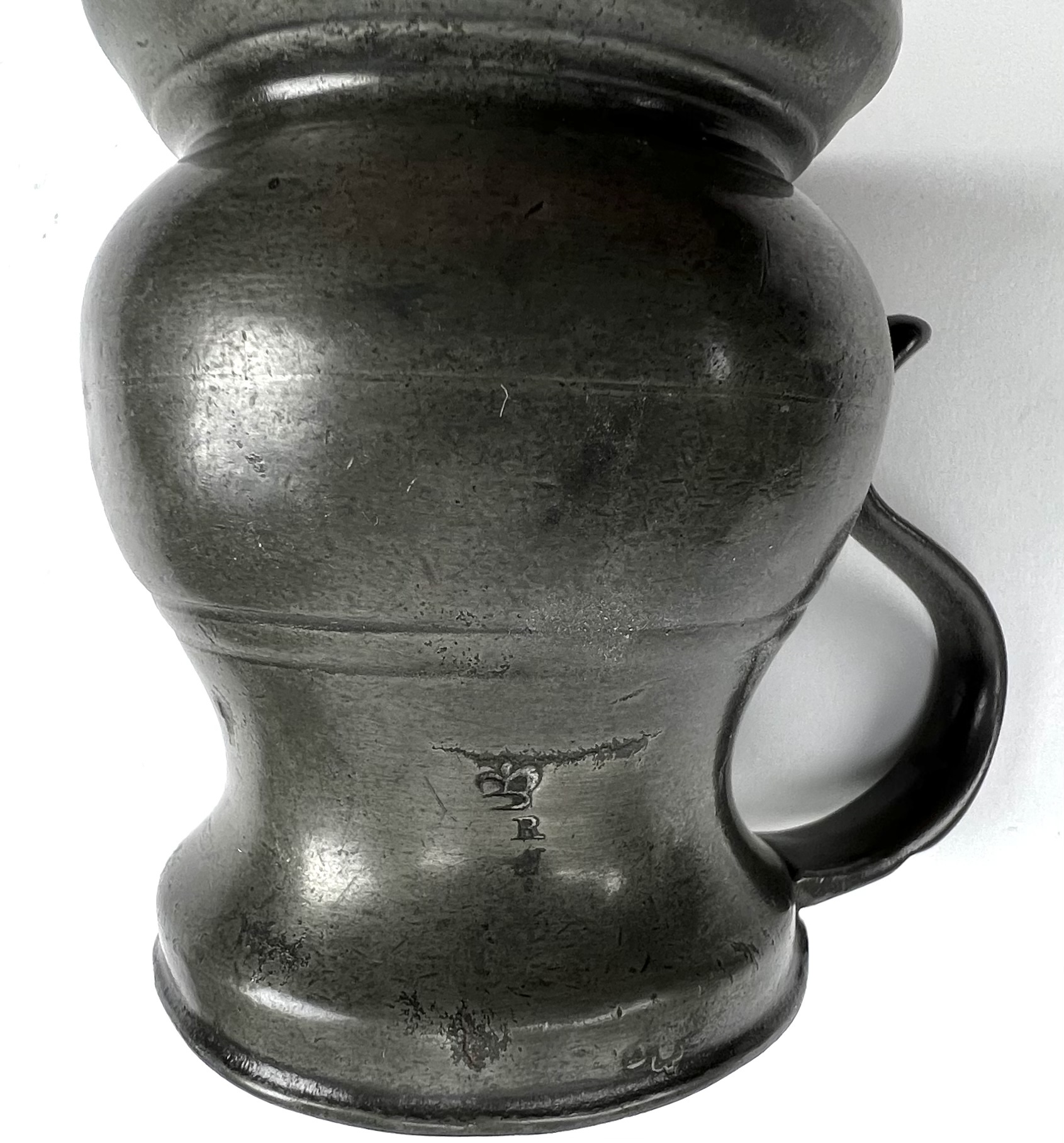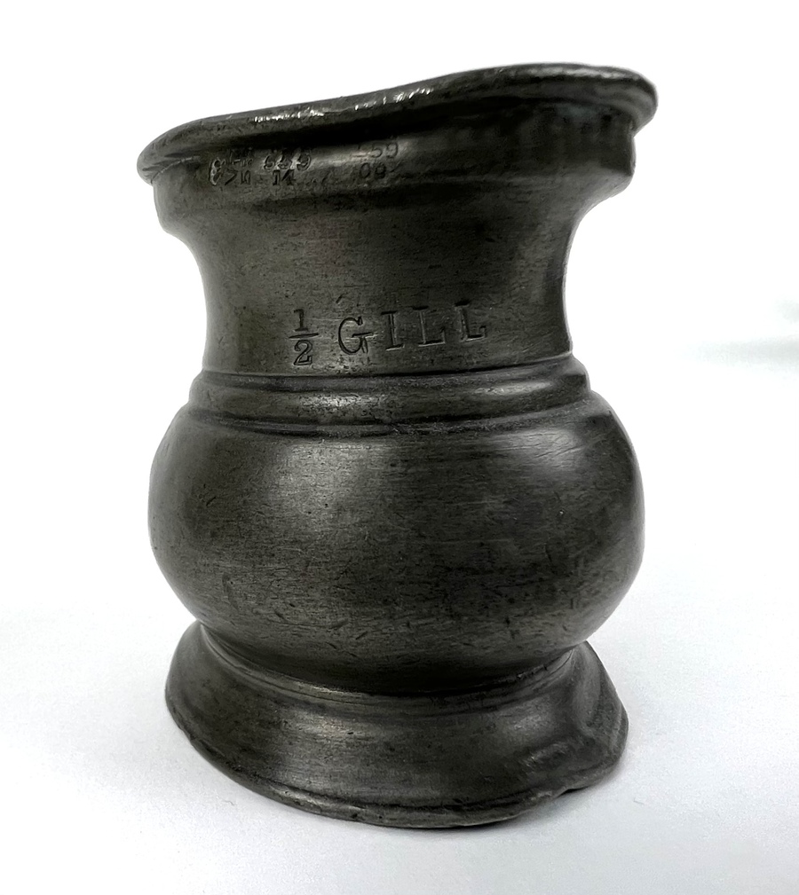Acht tinnen bekers in verschillende grootte en een schenkkan met deksel, aan de onderzijde gemerkt. Circa 1900. |