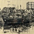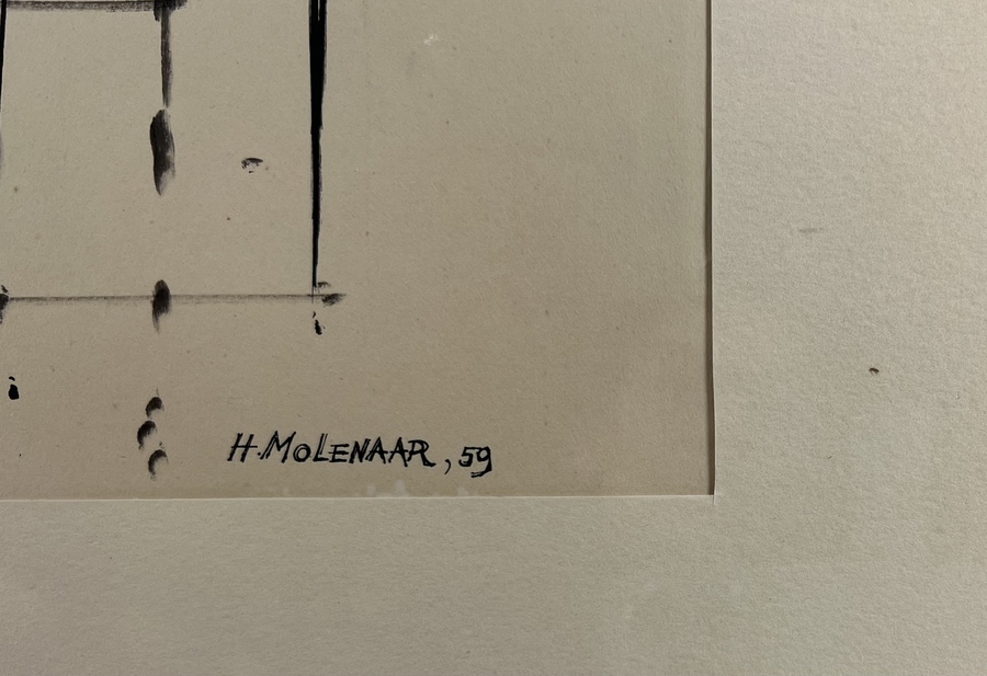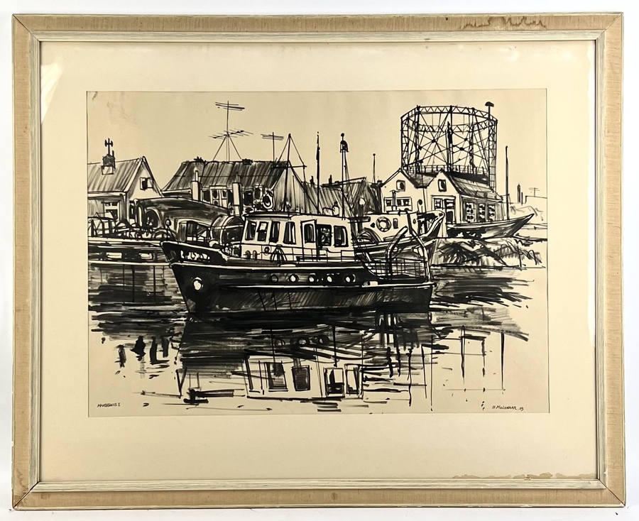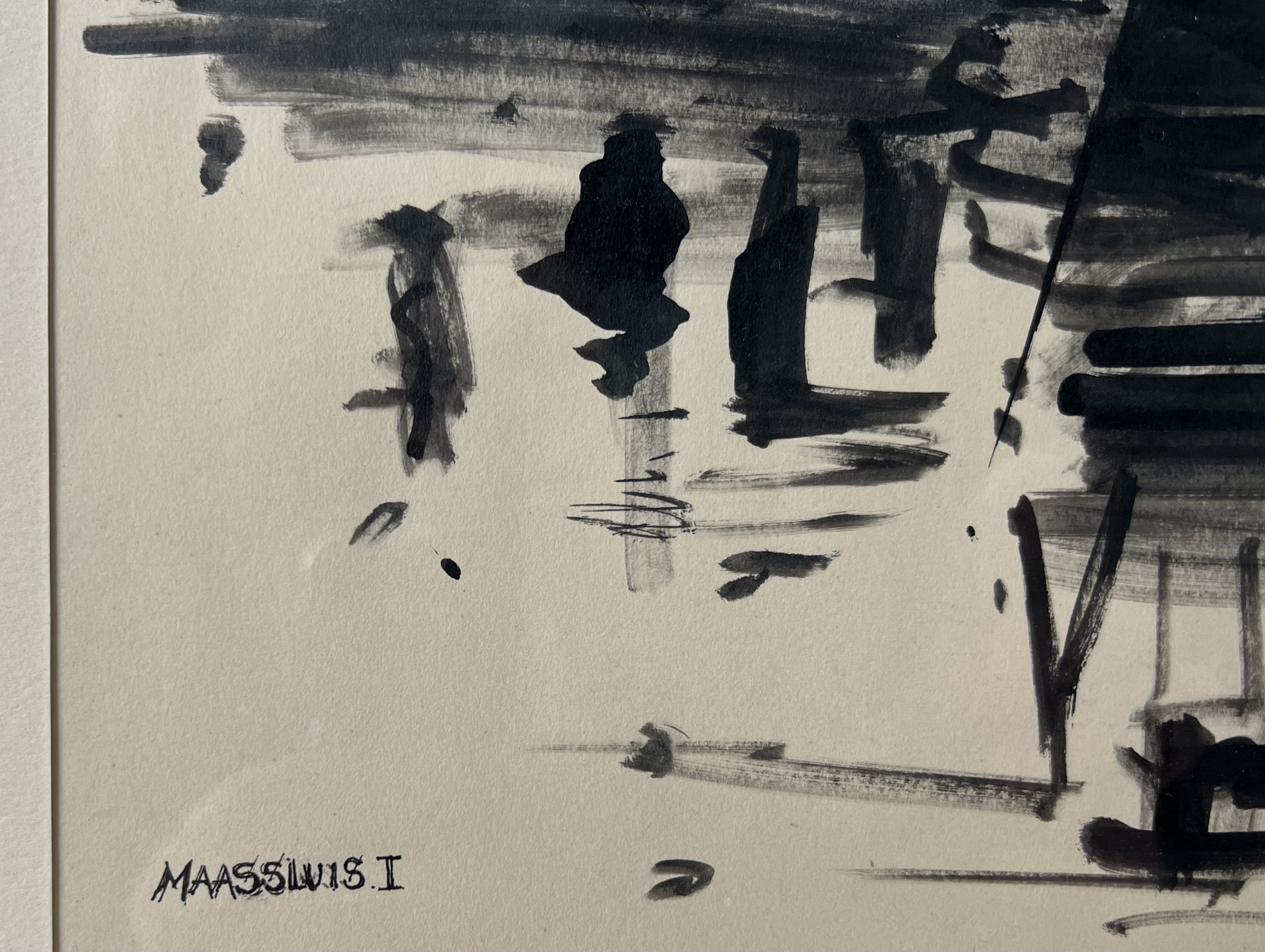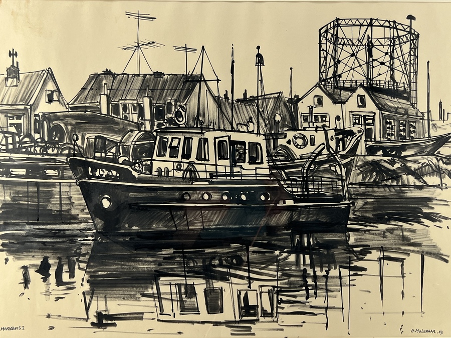 Oost-Indische inkttekening op papier van Maassluis, getiteld "Maassluis II". Rechtsonder gesigneerd H. Molenaar ‘59. |