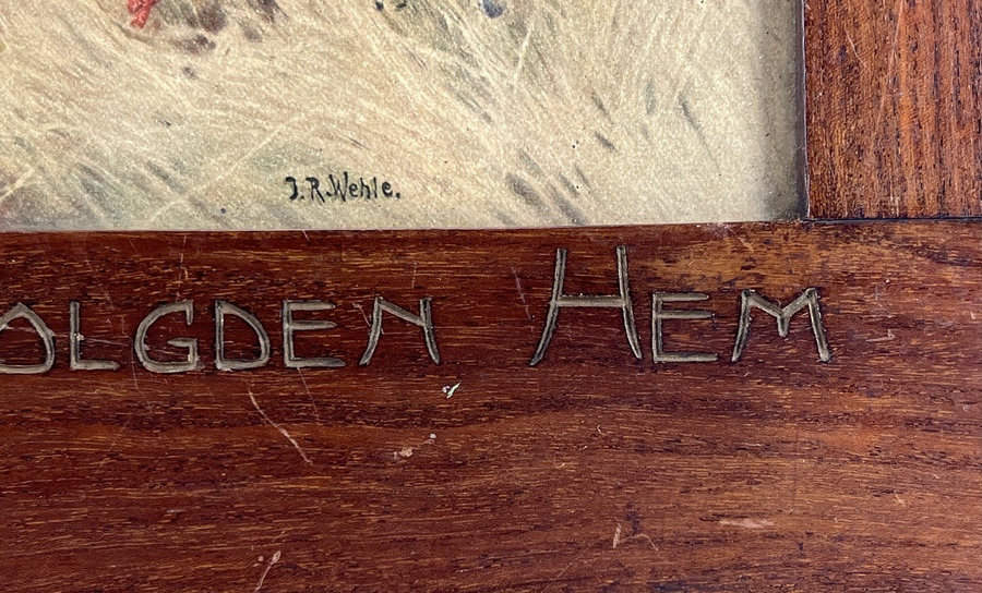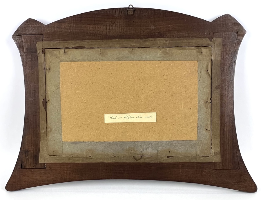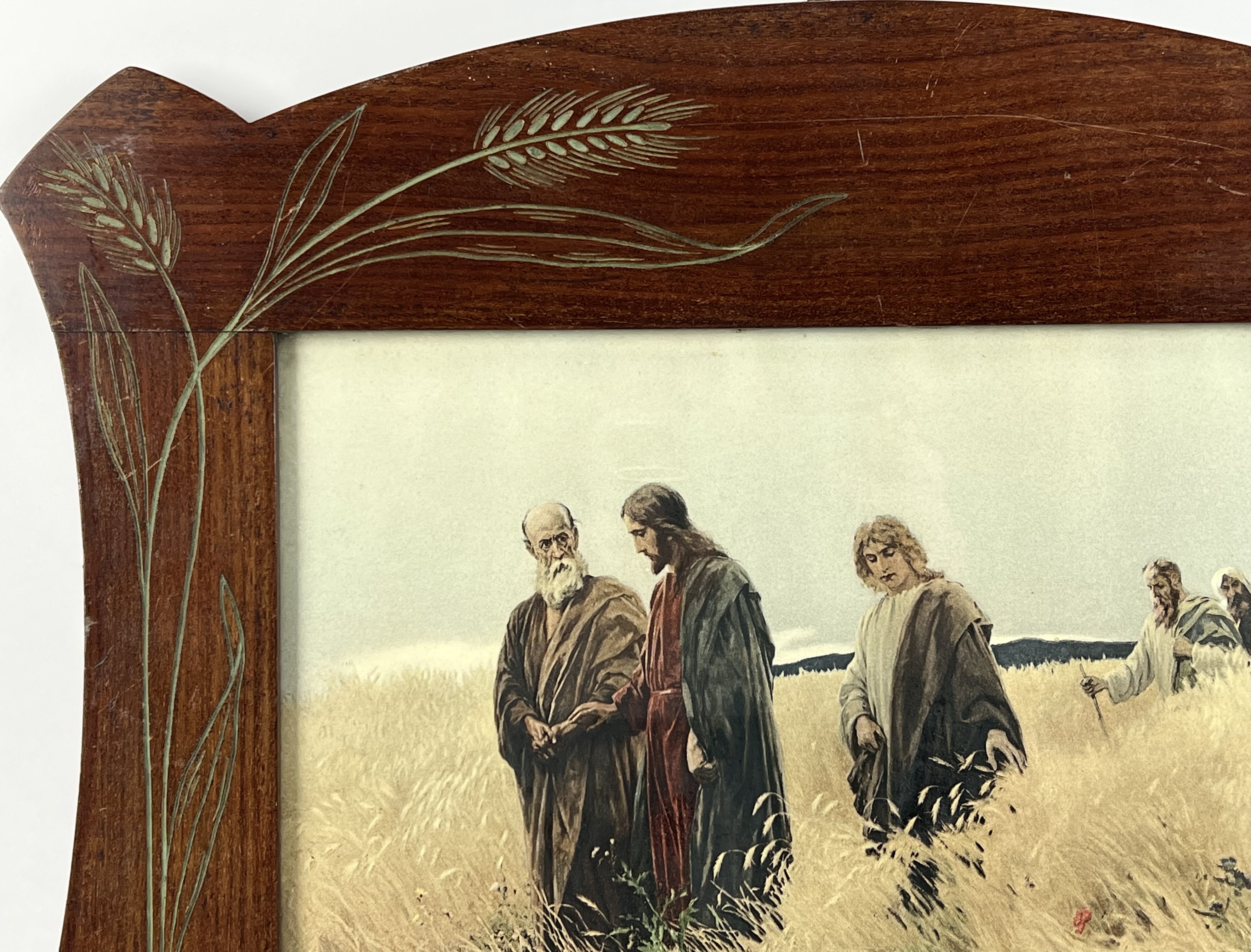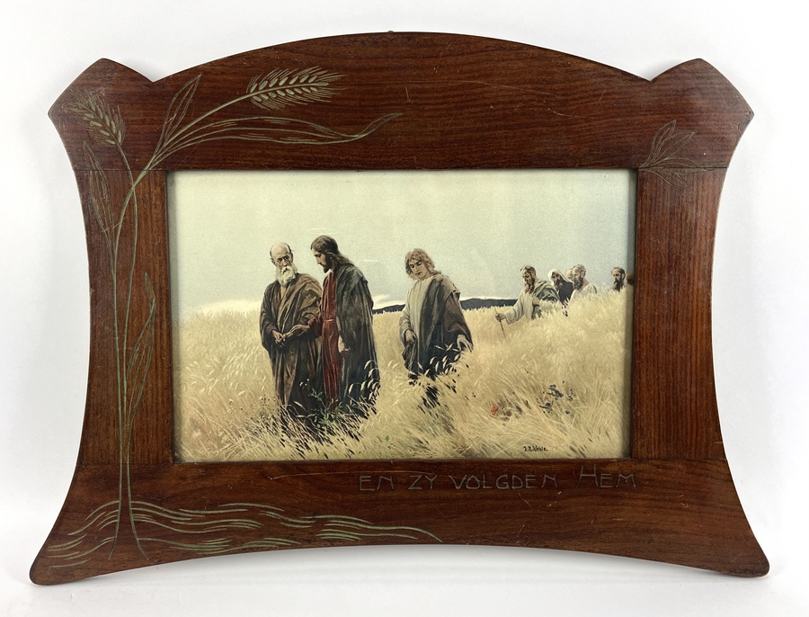 Kleurenlitho van Jezus en zijn discipelen van J.R. Wehle in houten Jugendstil lijst met korenaar motief en de spreuk “en zij volgden Hem”, jaren 20. |