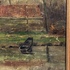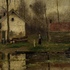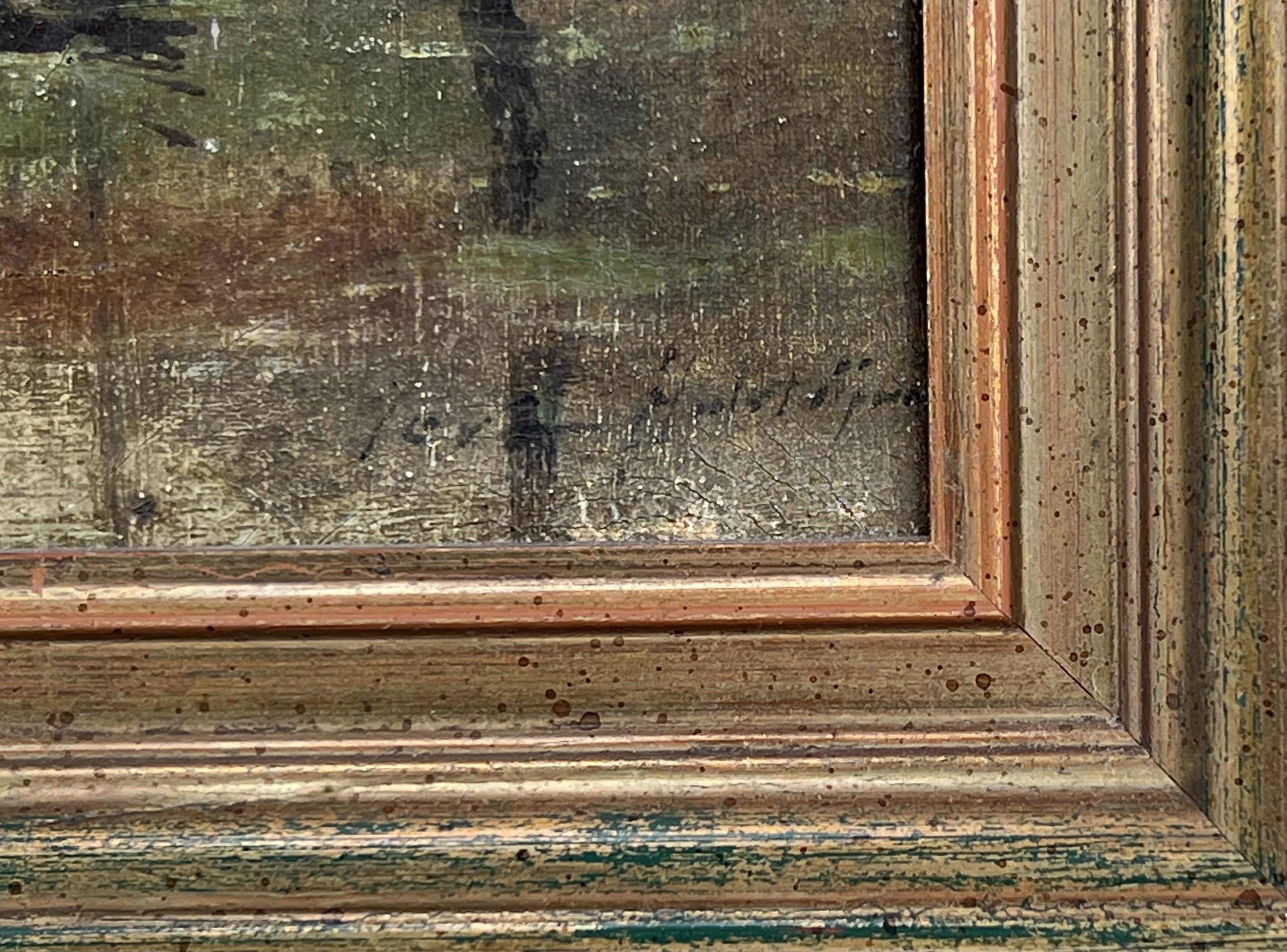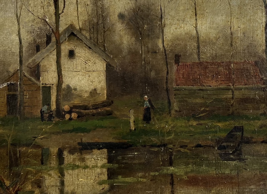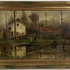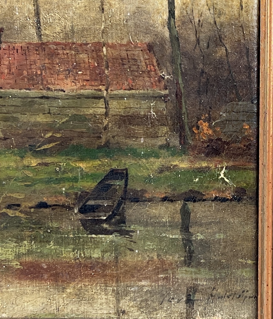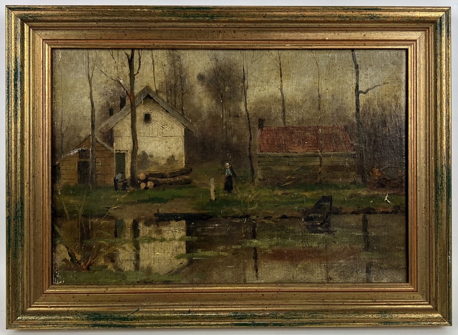 Schilderij met landschappelijke voorstelling van huis met schuur gelegen aan rivier. Olieverfschilderij op linnen. Eerste helft 20ste eeuw. |