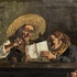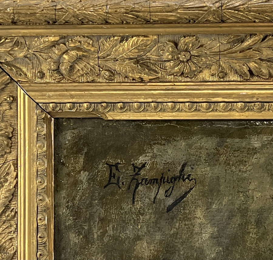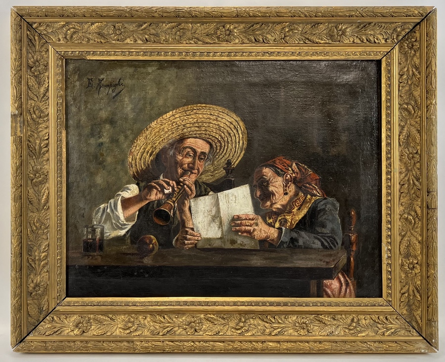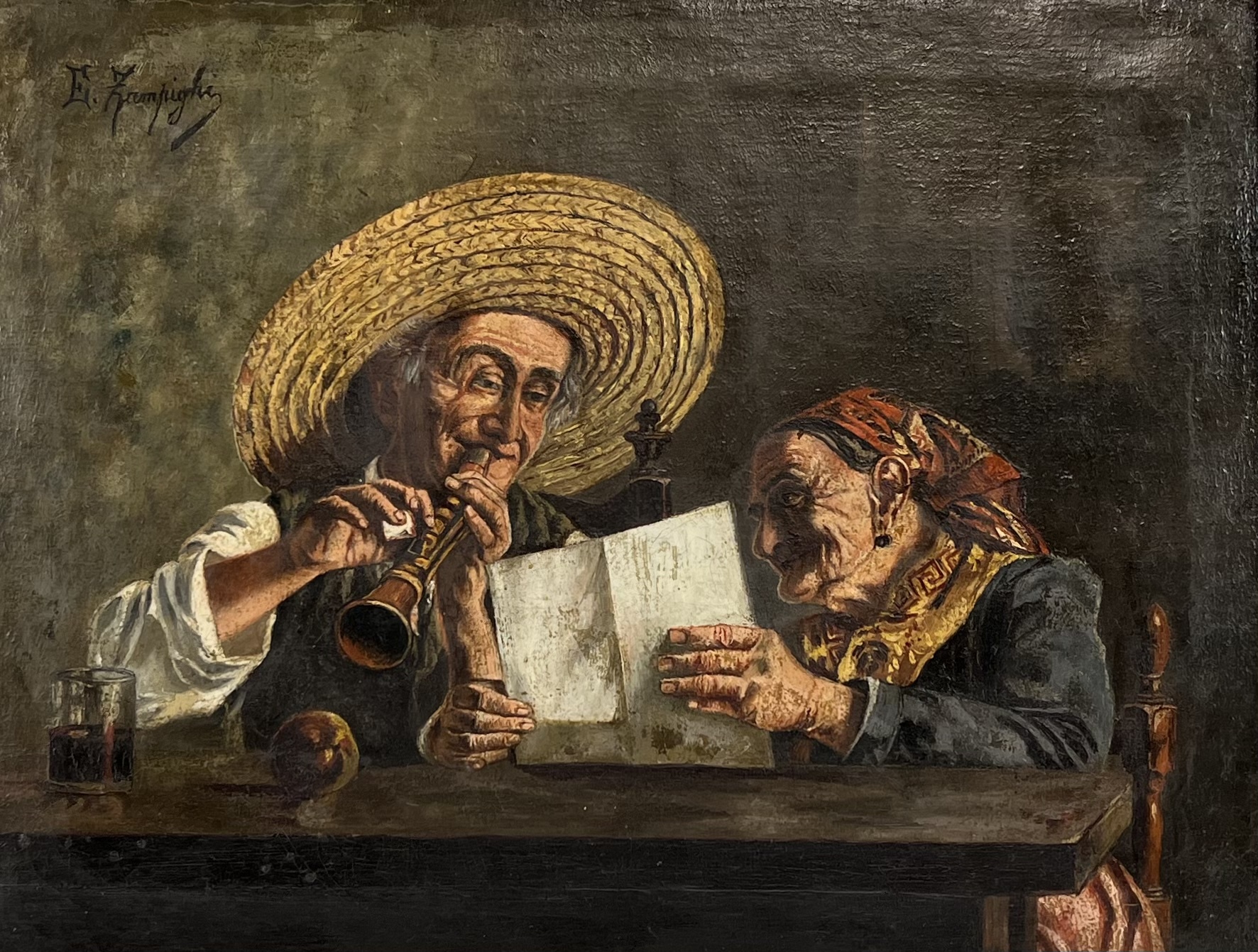 Olieverfschilderij met musicerende man met klarinet en vrouw. Rechtsboven gesigneerd E. Zampighi, verso vermelding: Der Neueste Walzer en vaag leesbaar 31 August 1907. |