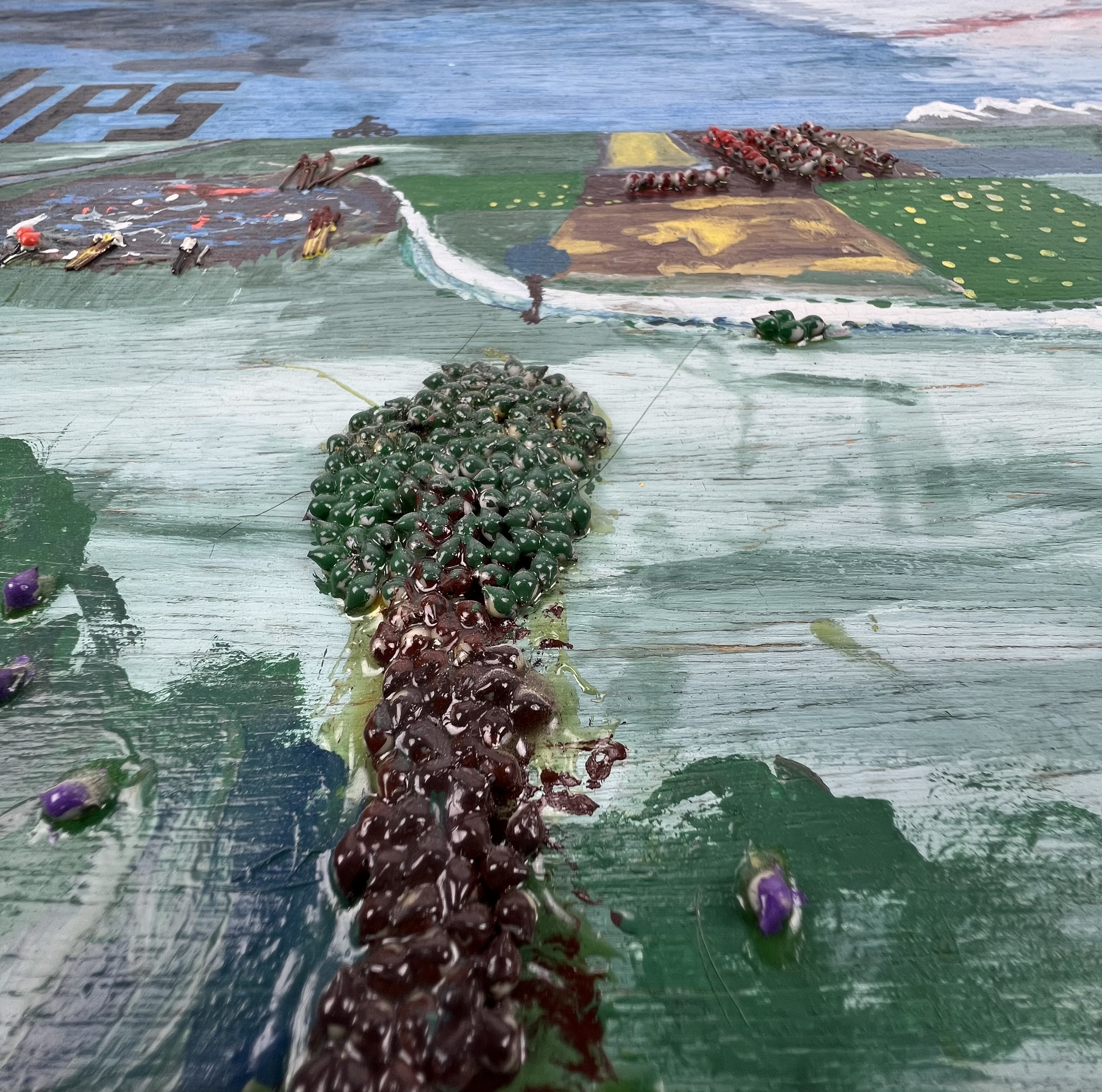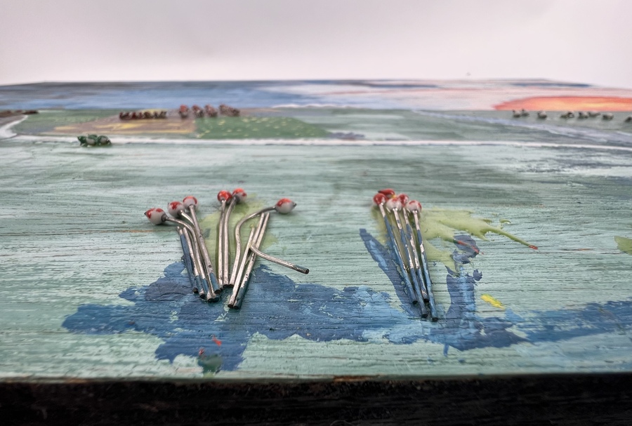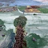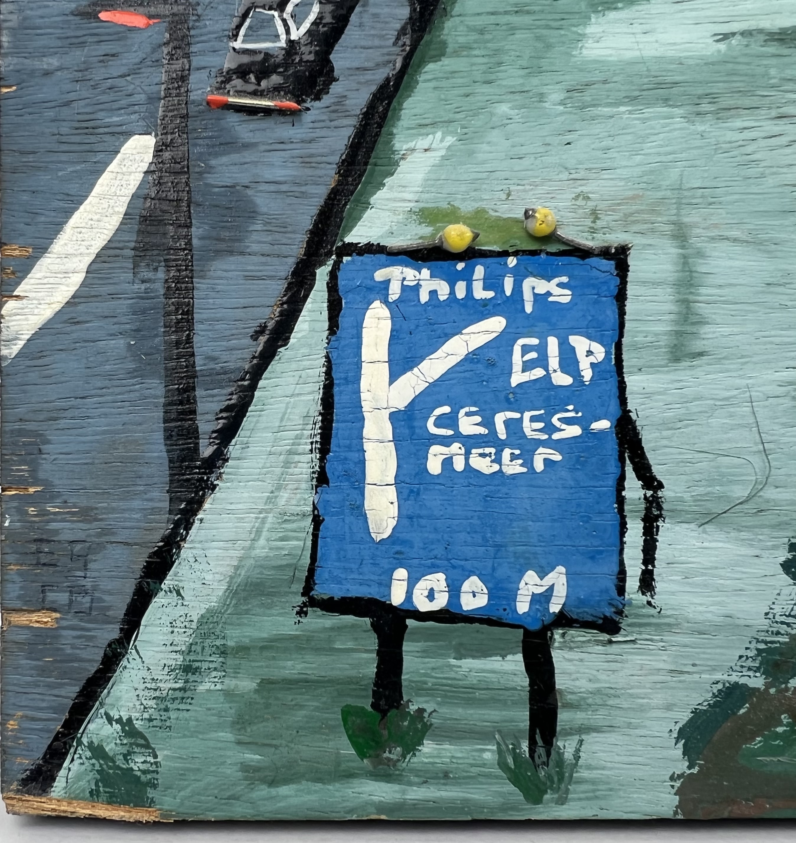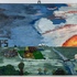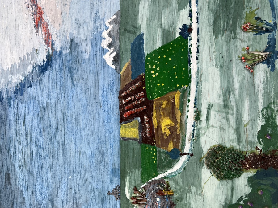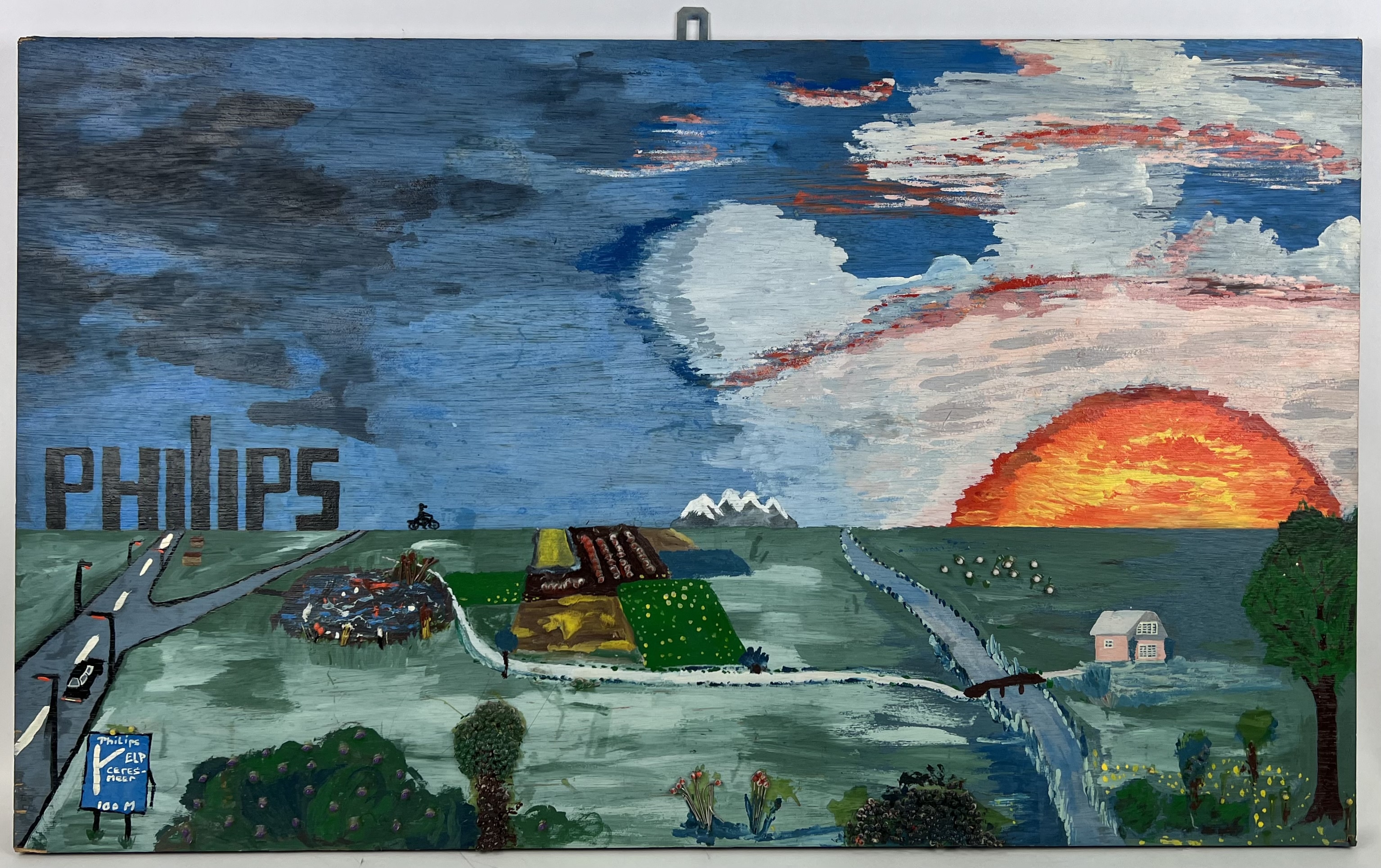 Schilderij in naïeve stijl van landschap in vogelvlucht. Acrylverf in gemengde techniek op paneel. Niet gesigneerd, laatste kwart 20e eeuw. |