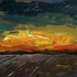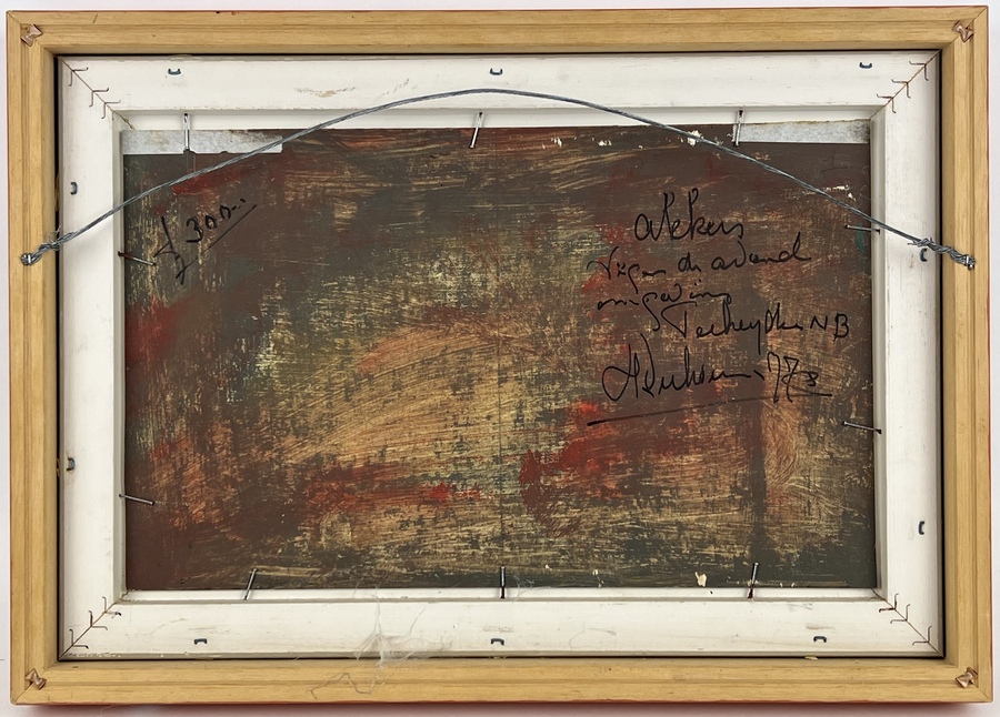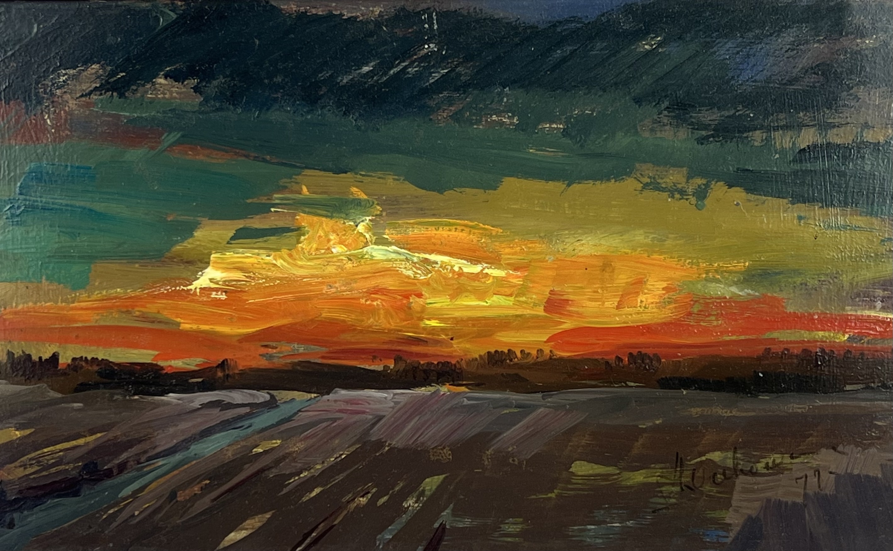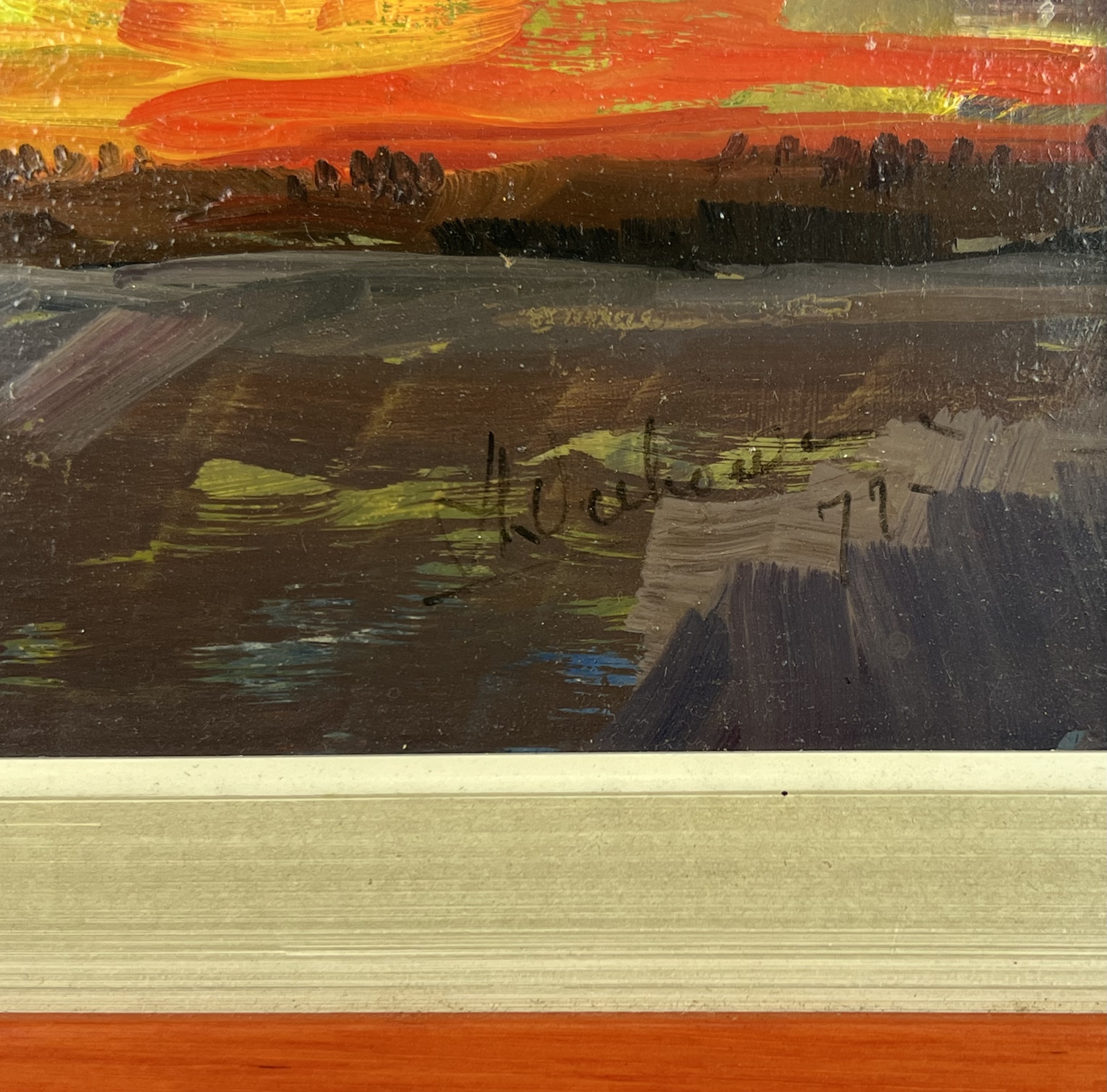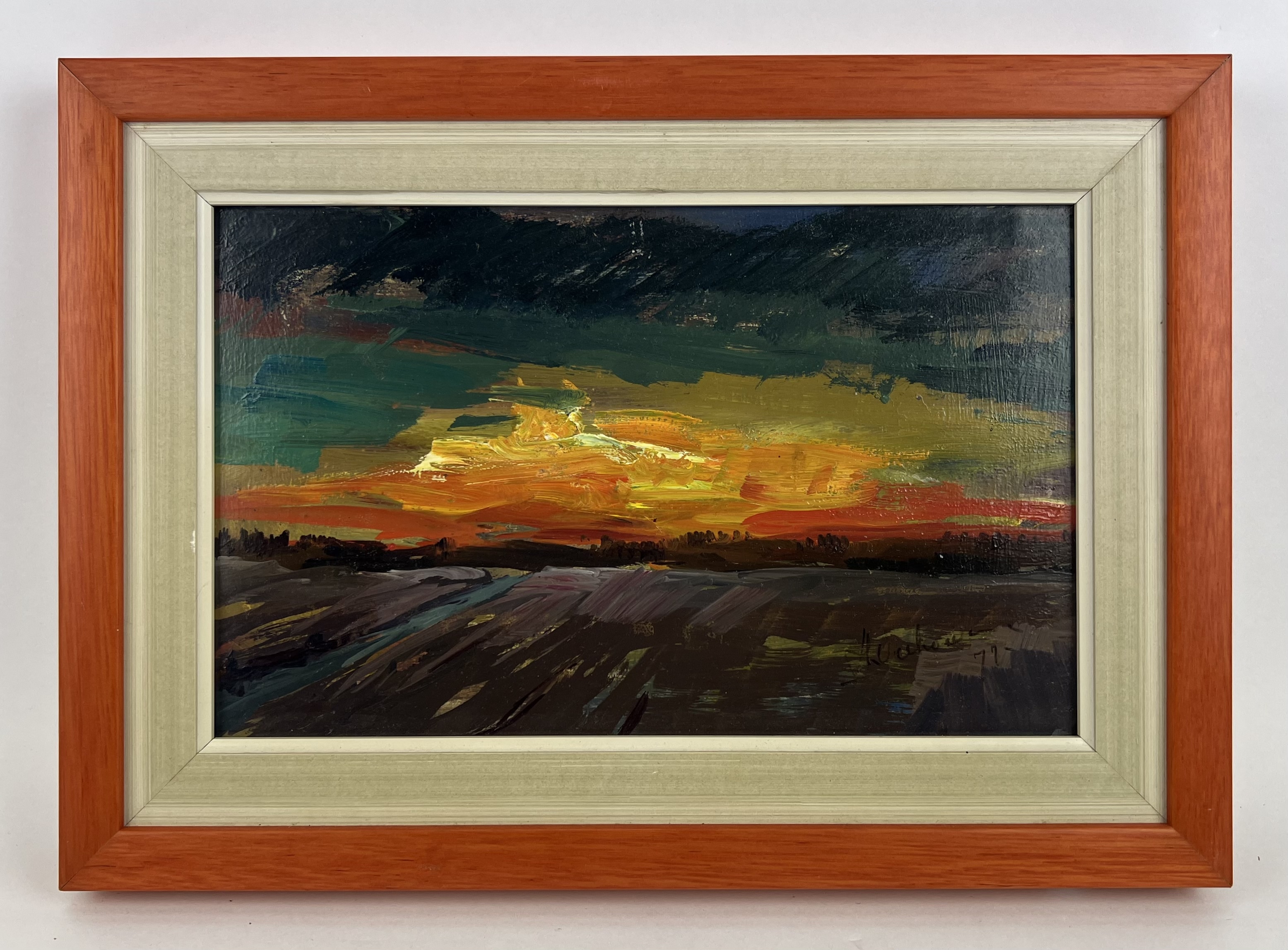 Schilderij, olieverf op paneel, van landschap met ondergaande zon. Verso vermelding titel “Akker tegen de avond omgeving Terheijden”. Rechtsonder gesigneerd en gedateerd ‘77. |