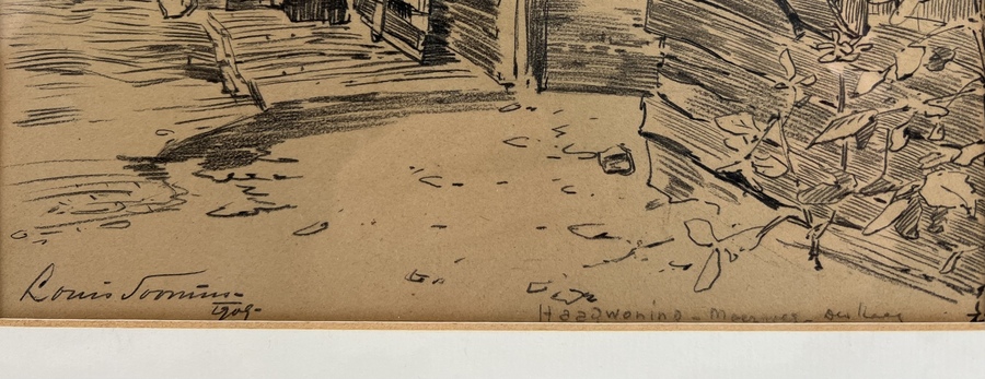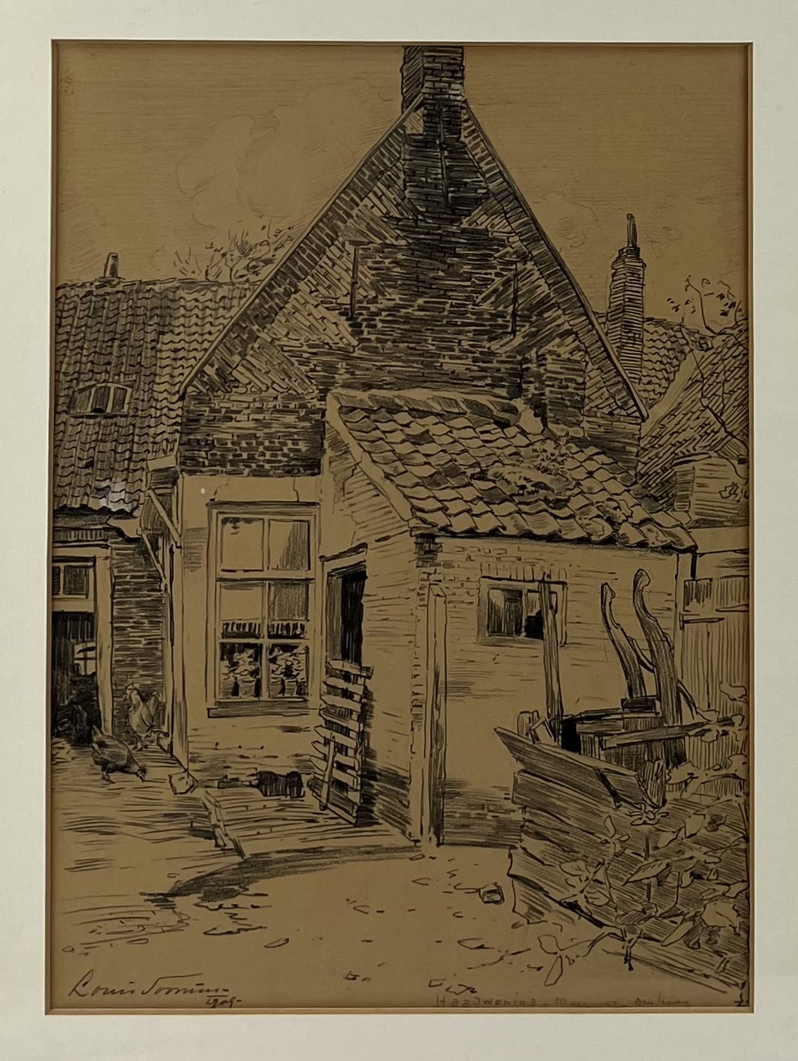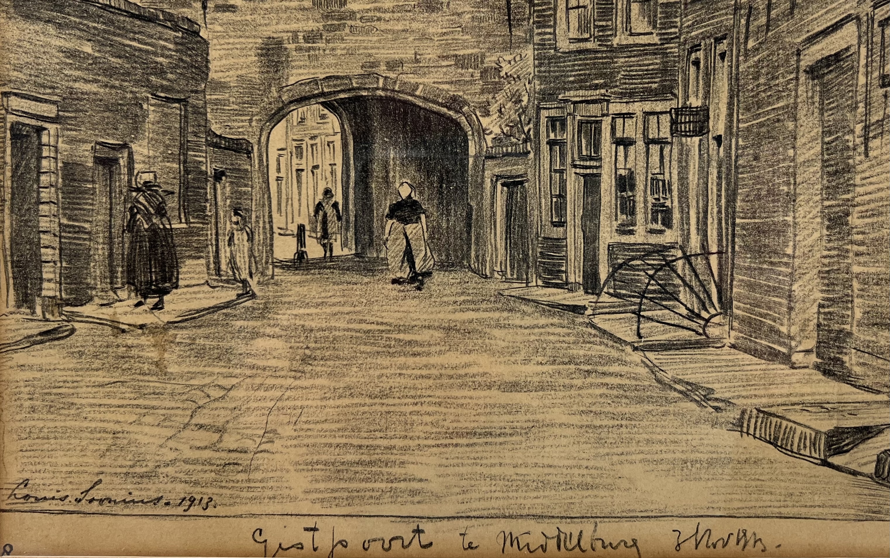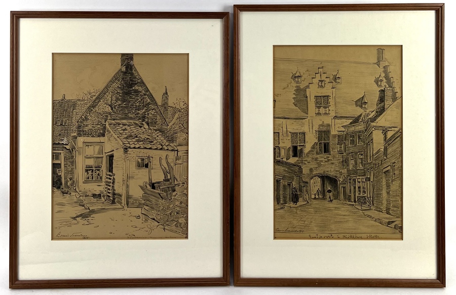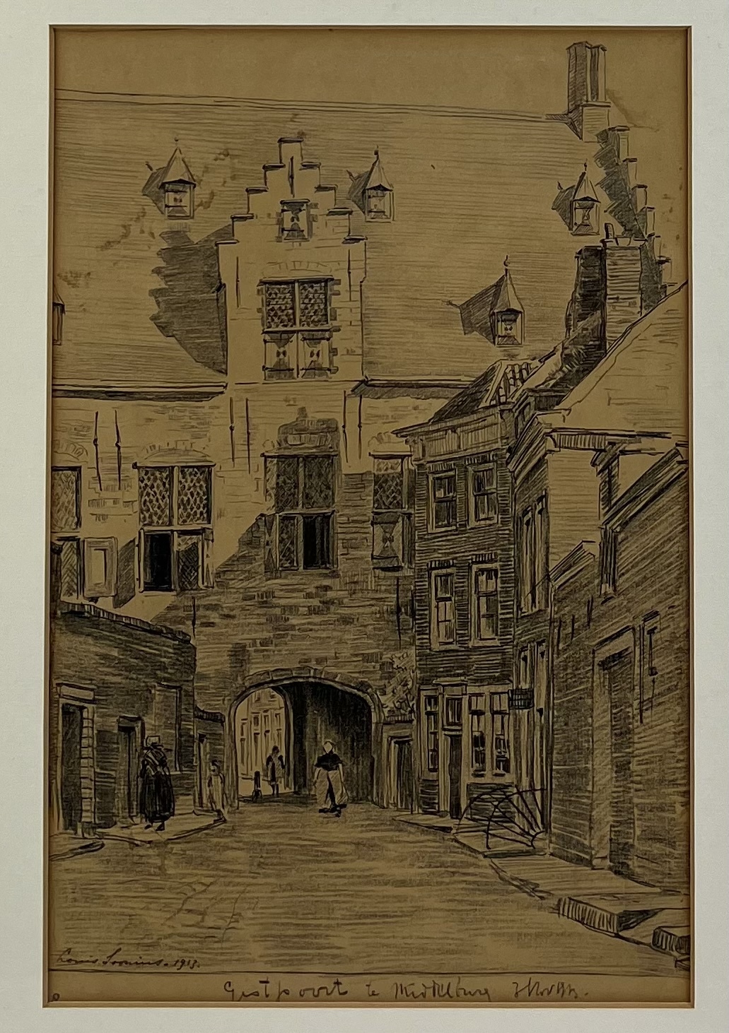 Twee tekeningen van Louis Soonius (Den Haag 1883-1956). Betreft de Gistpoort te Middelburg en Haagwoning, Moerweg te Den Haag. Beide tekeningen linksonder gesigneerd en gedateerd 1909 en 1915. |