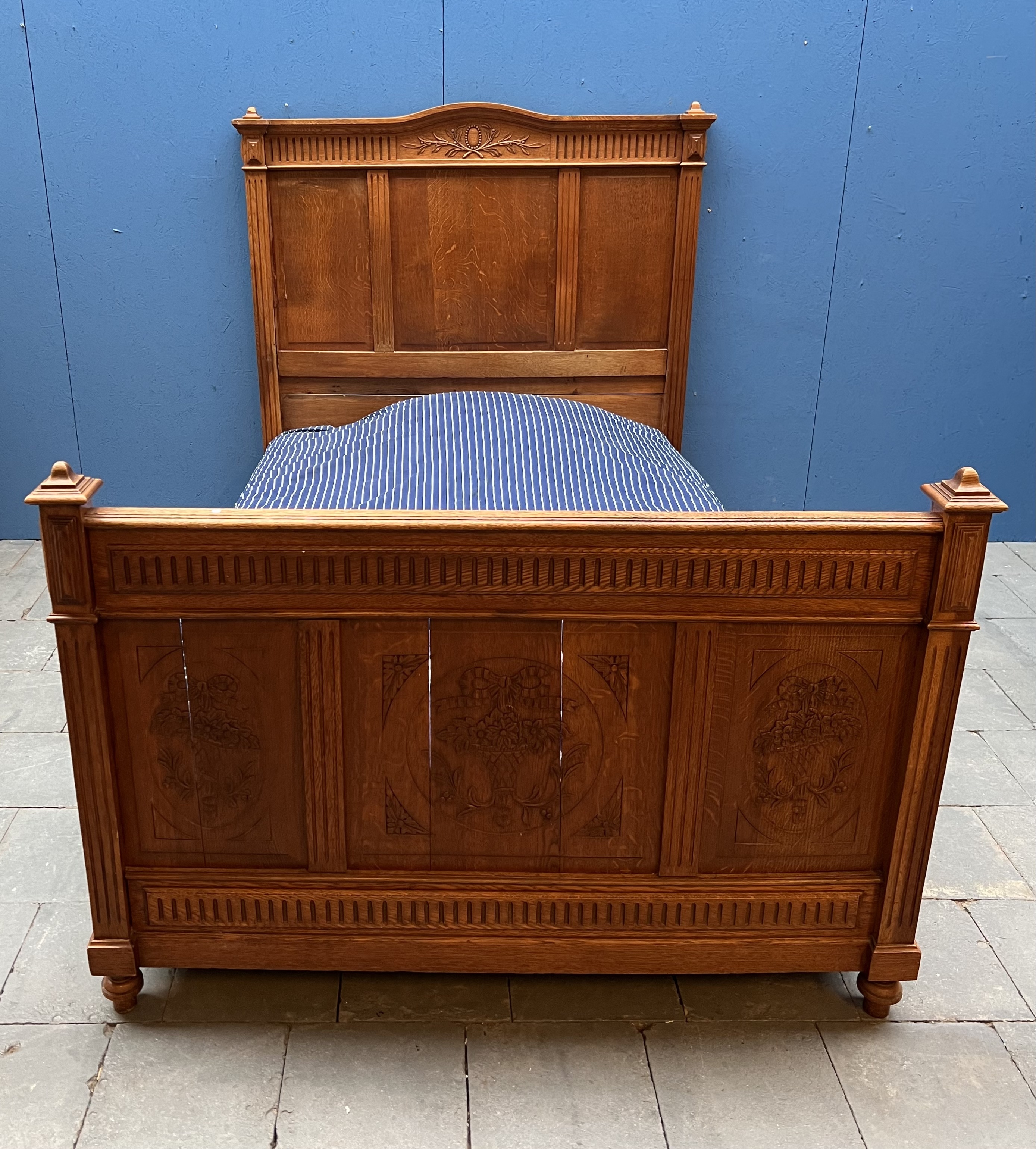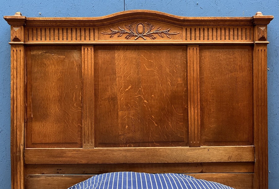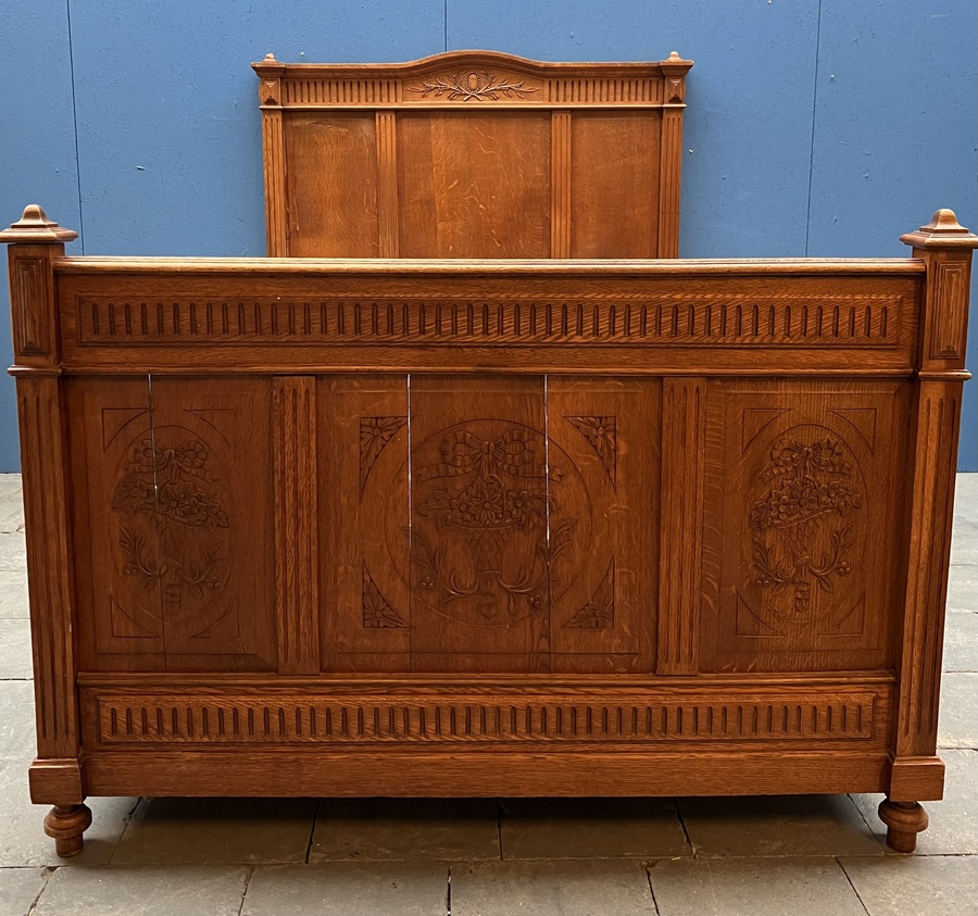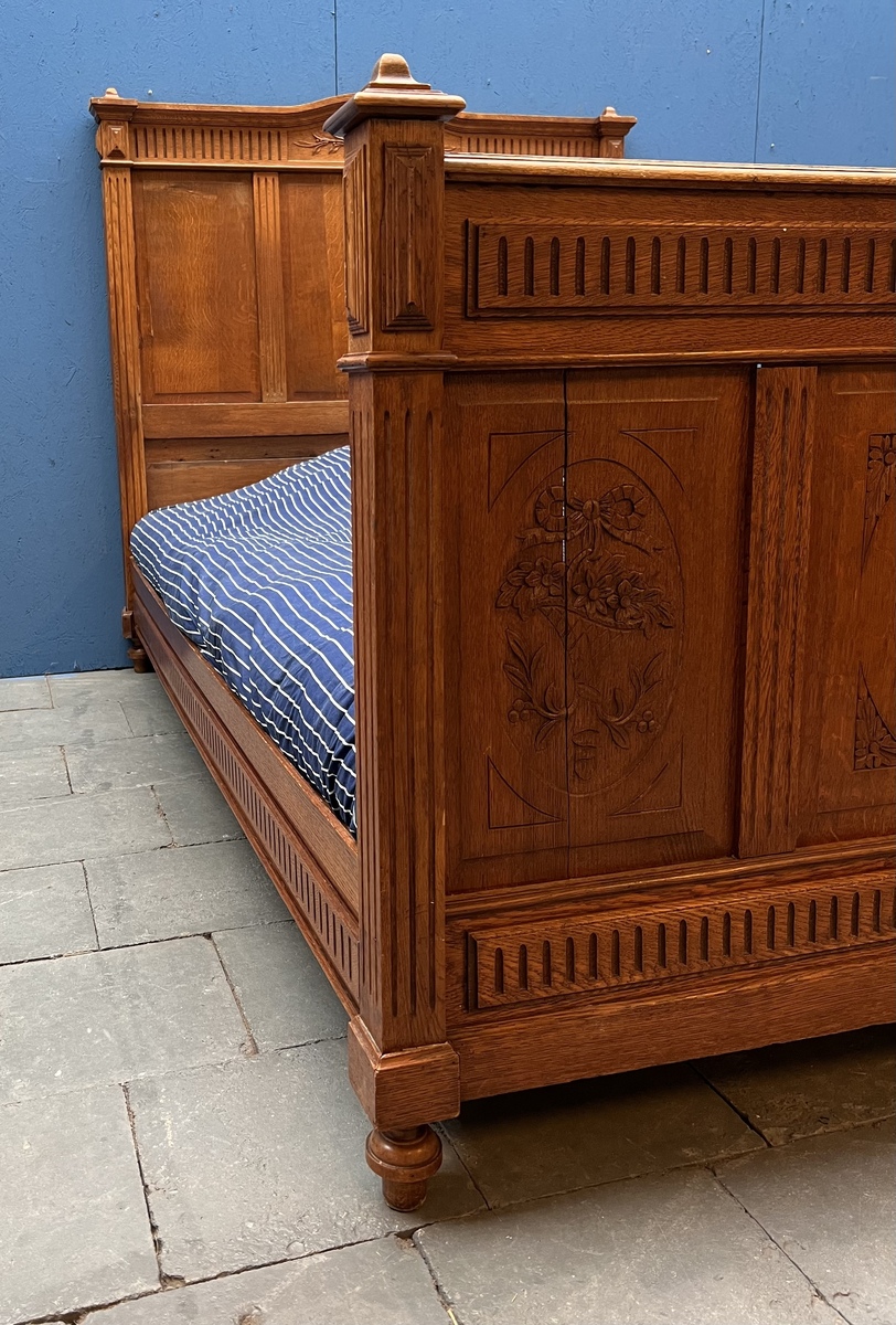 Eikenhouten twijfelaar met florale decoratie op voeteneinde, compleet met matrasbodem. Franse/Belgische herkomst, omstreeks 1900. |