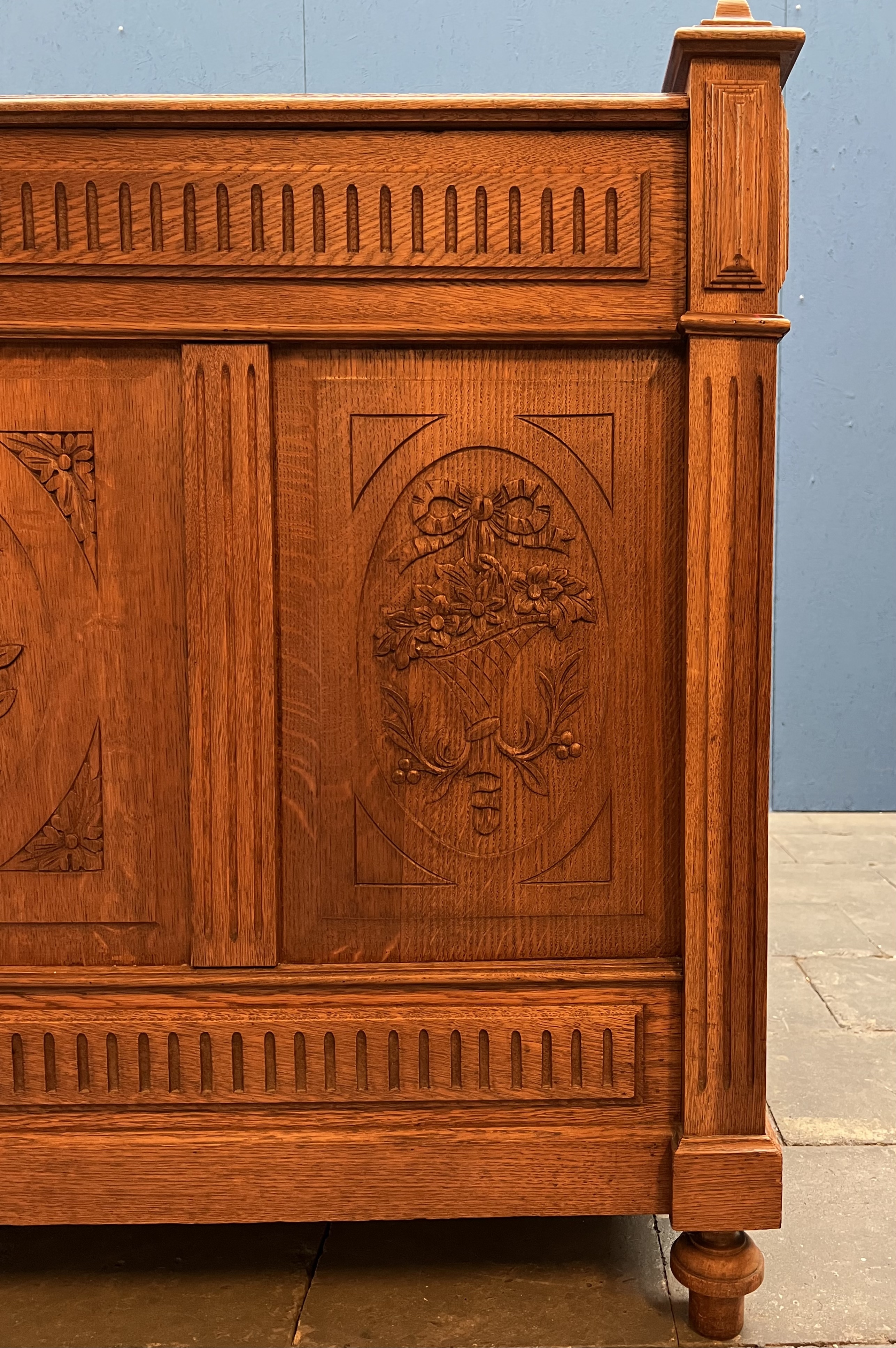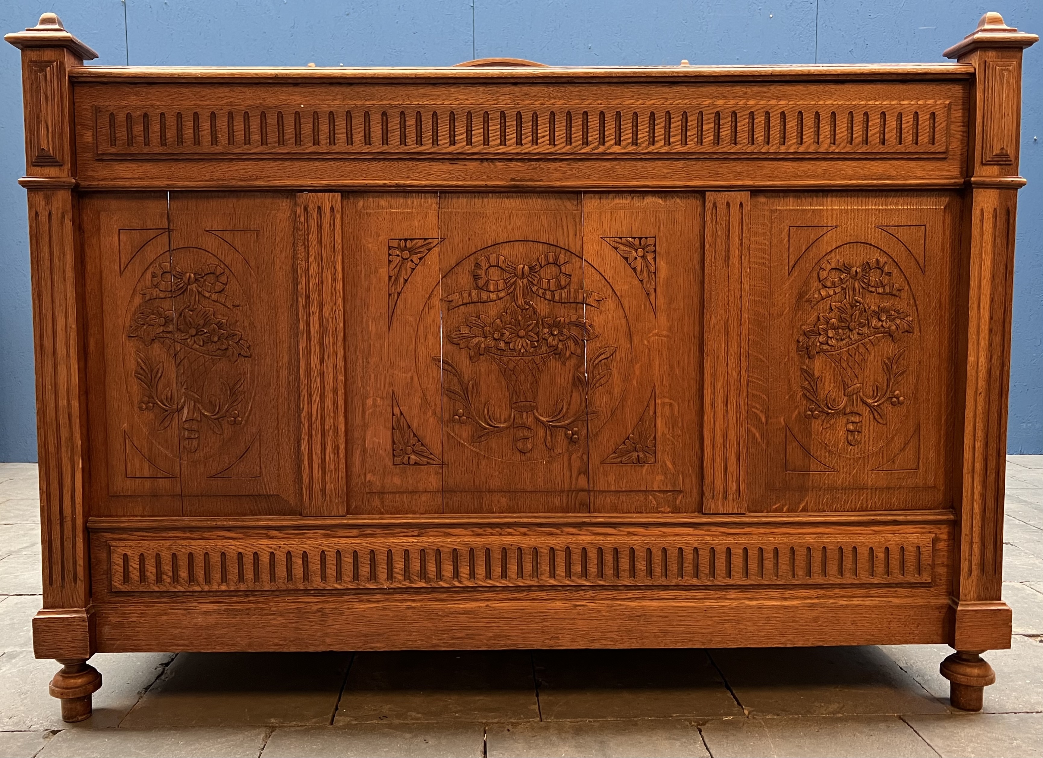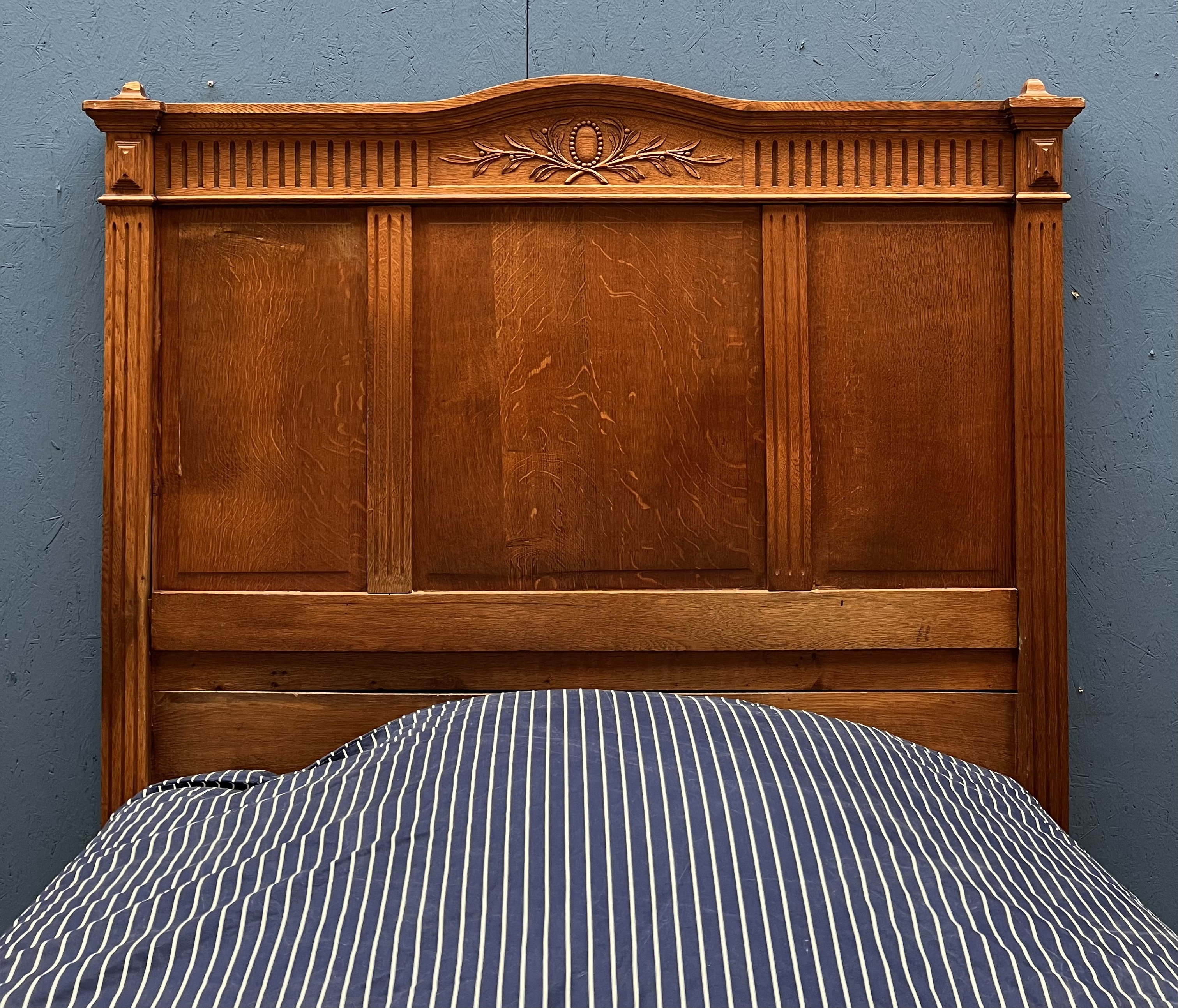 Eikenhouten twijfelaar met florale decoratie op voeteneinde, compleet met matrasbodem. Franse/Belgische herkomst, omstreeks 1900. |