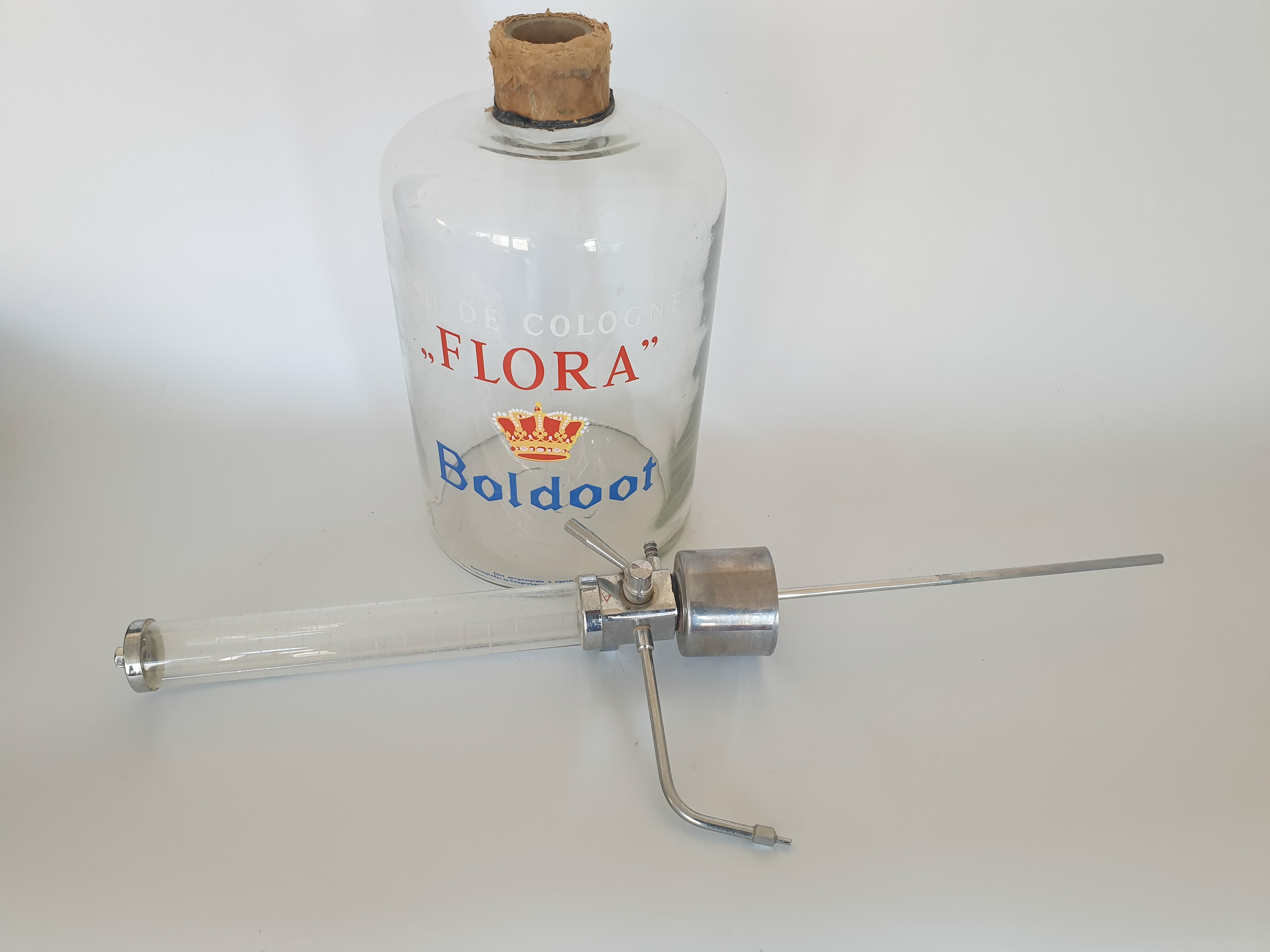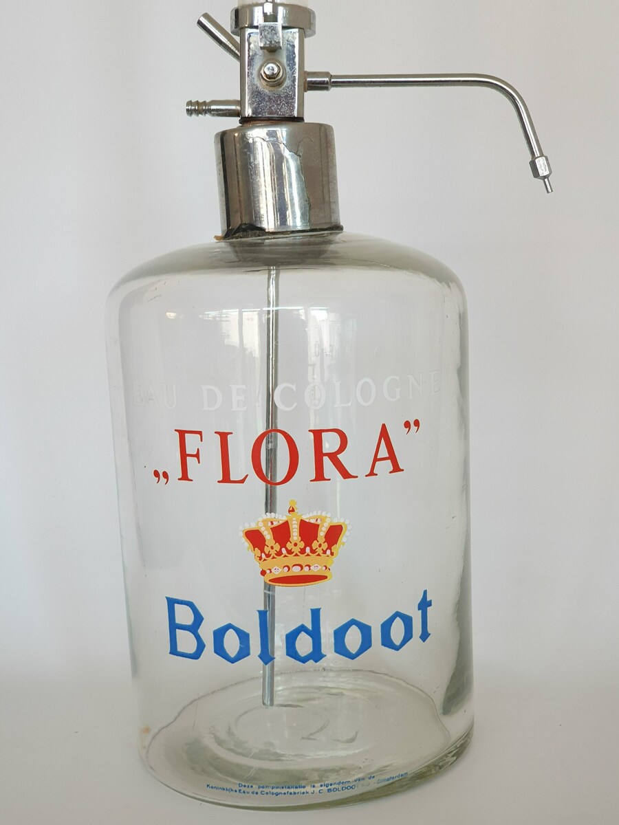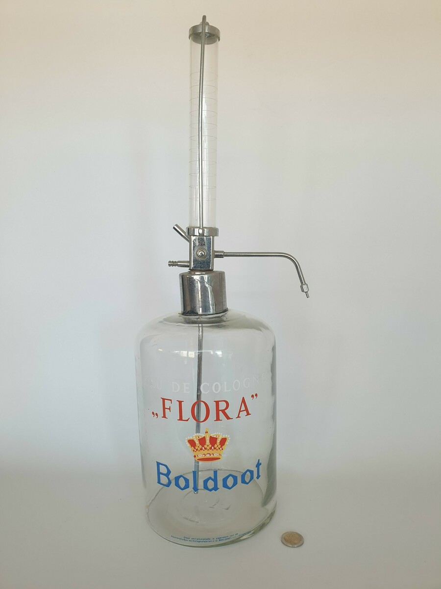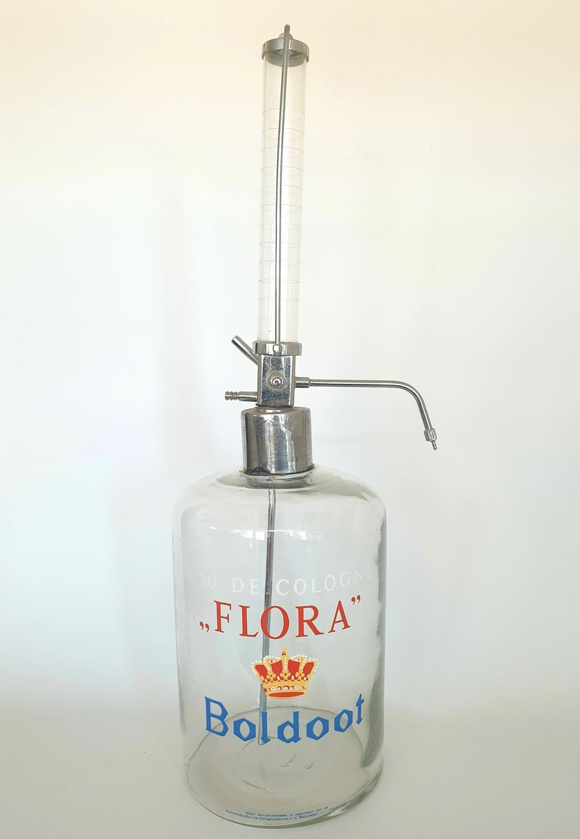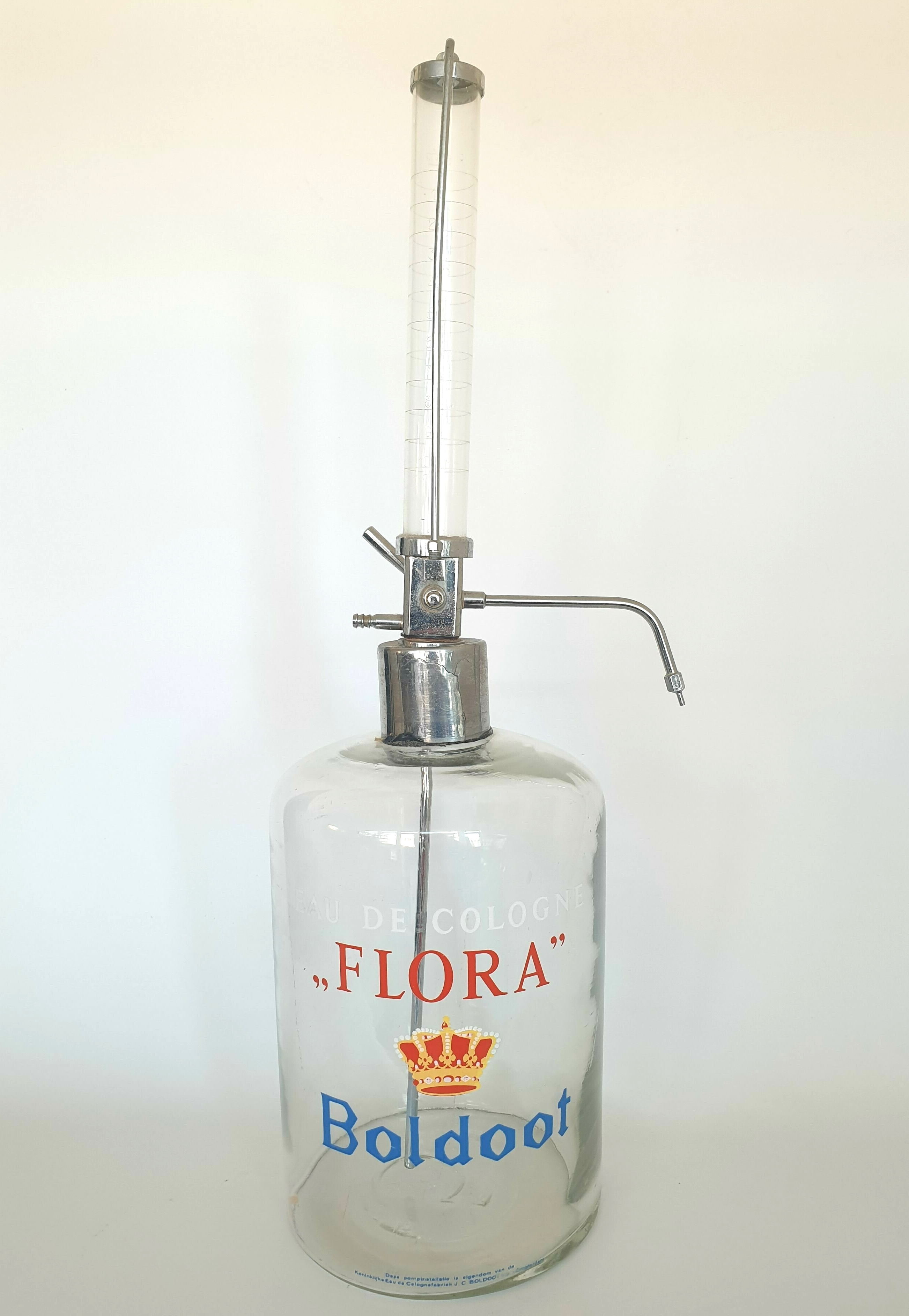 Eau de cologne "Flora" winkelvoorraad fles, Boldoot Amsterdam. Met originele toebehoren, jaren 50/60. |