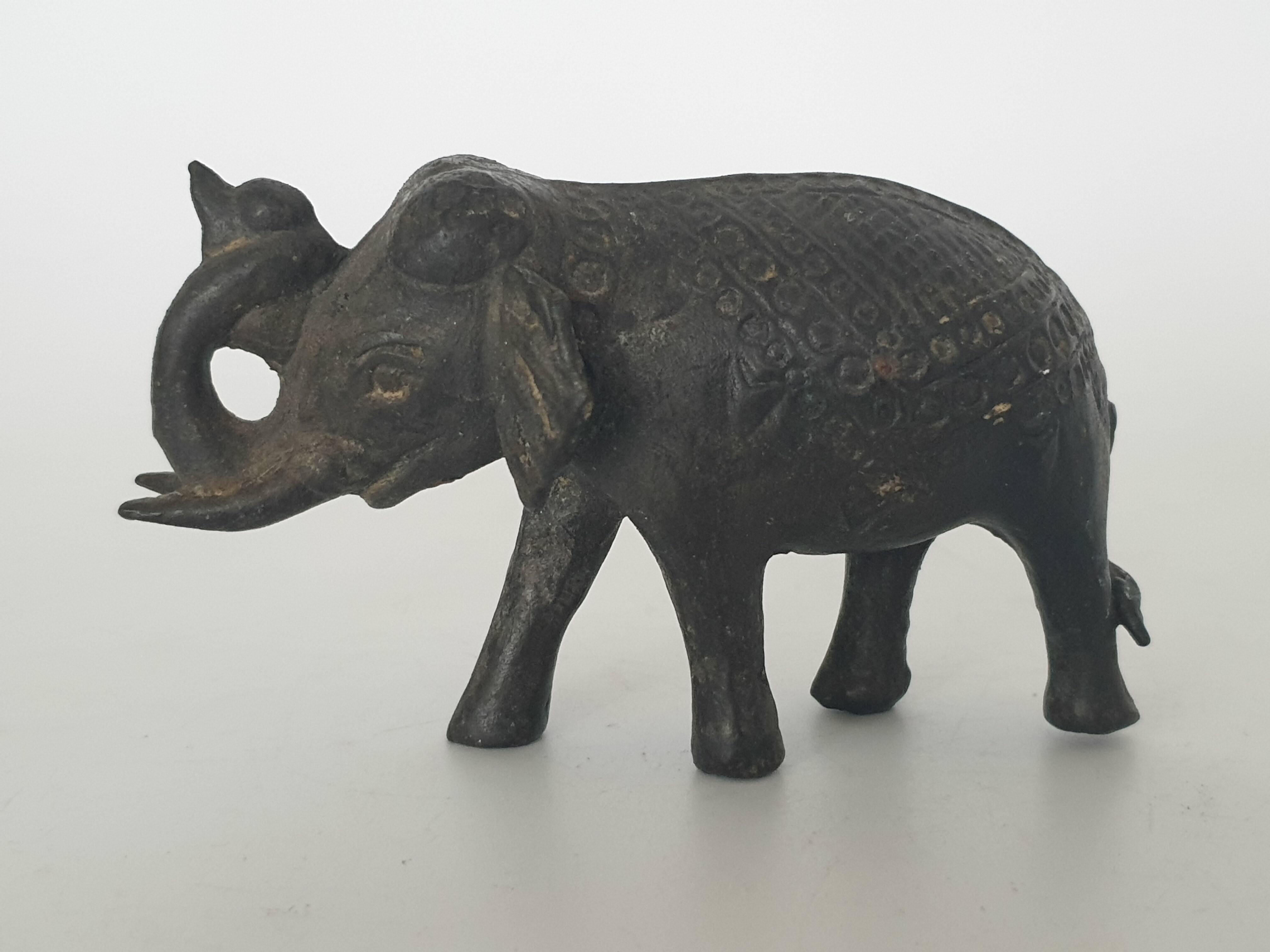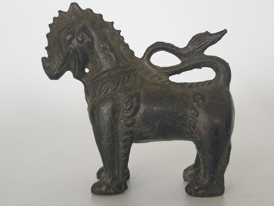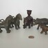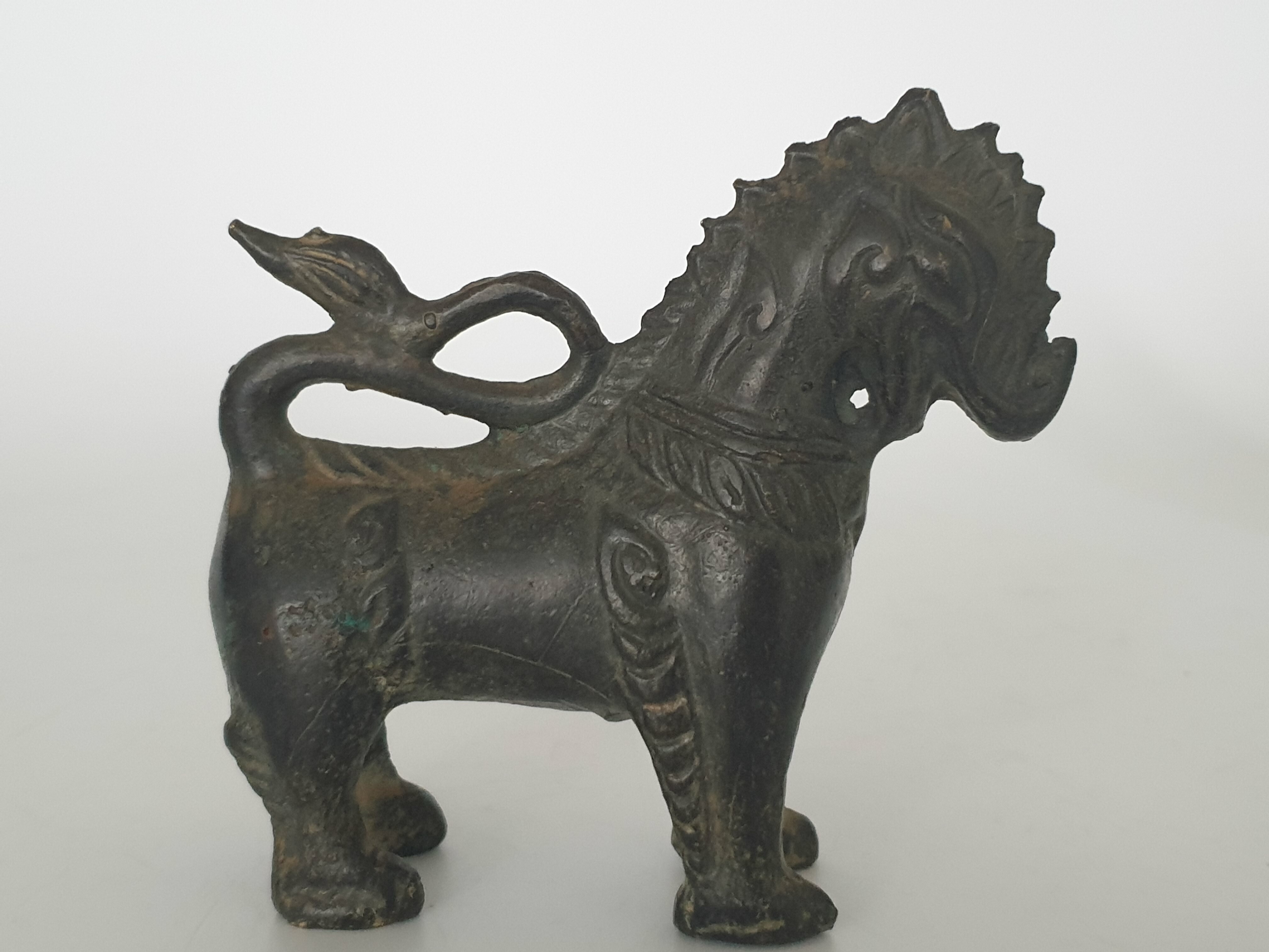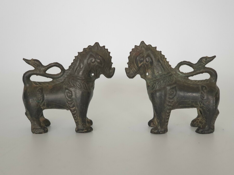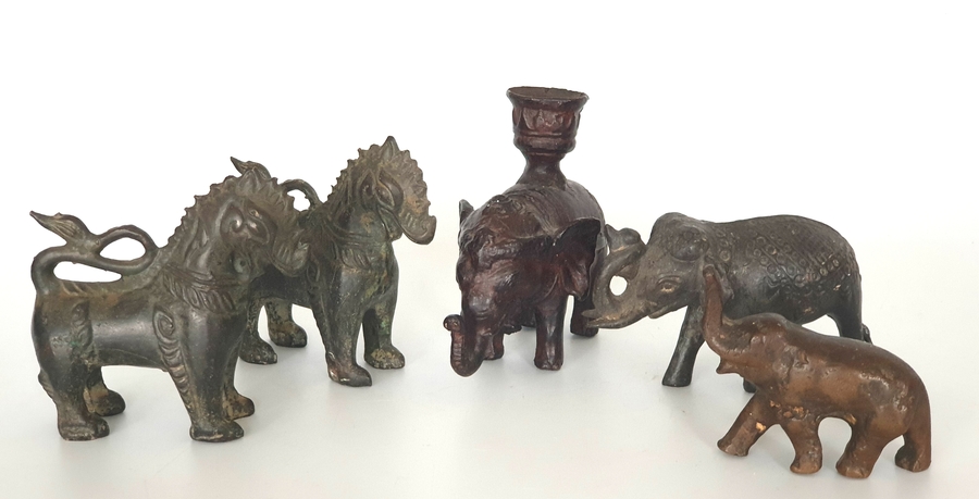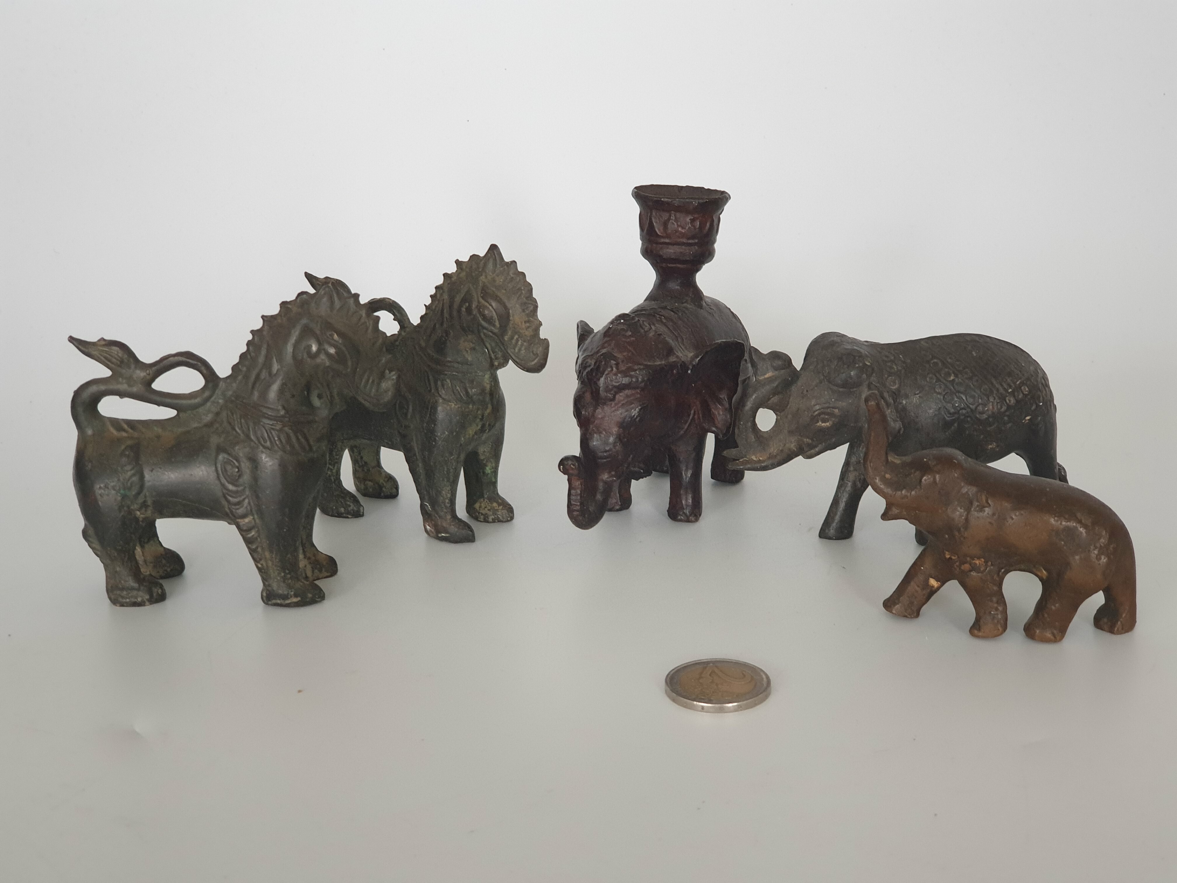 Drie beelden van olifanten uit India waarvan een als kandelaar, twee Foo Dogs uit China. Brons legeringen, 20e eeuw. |