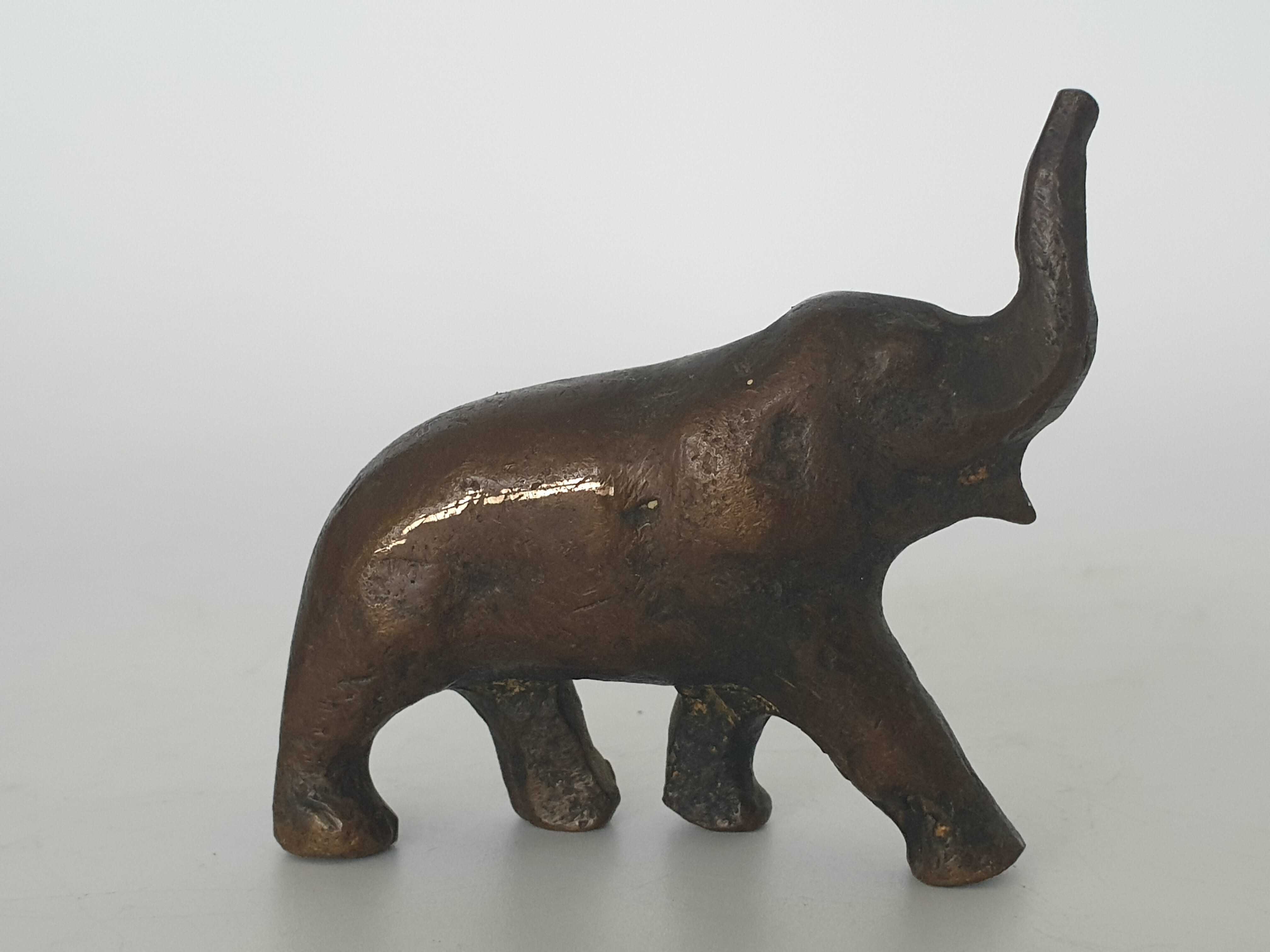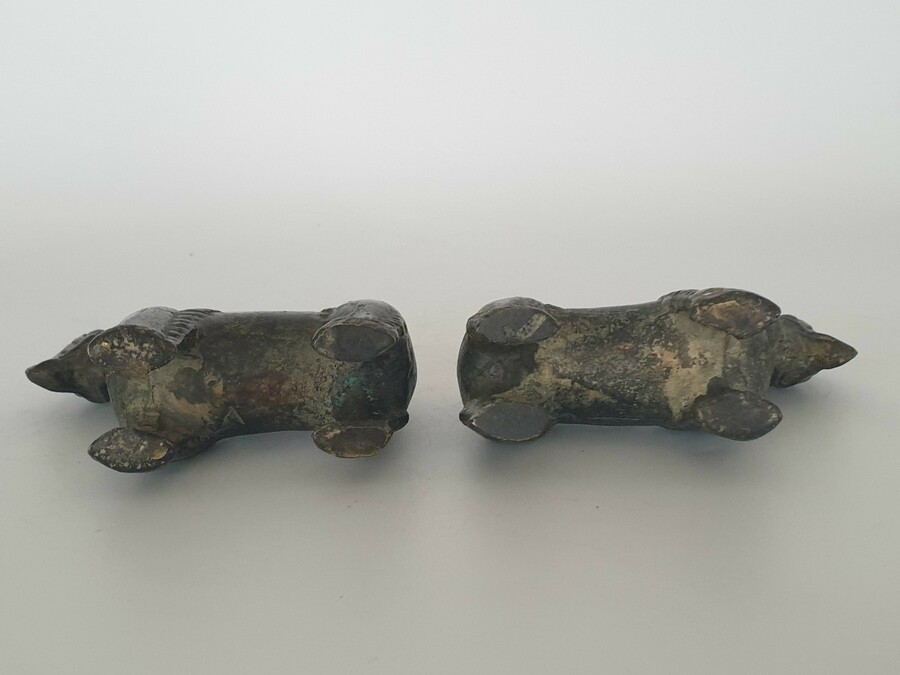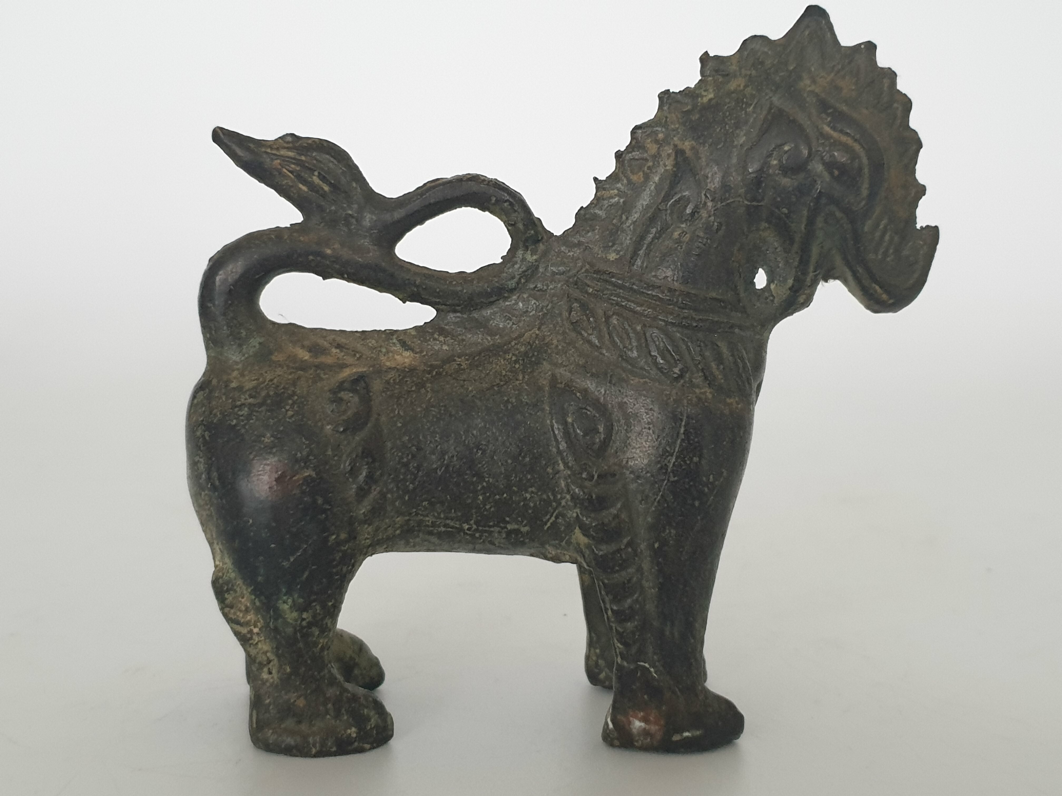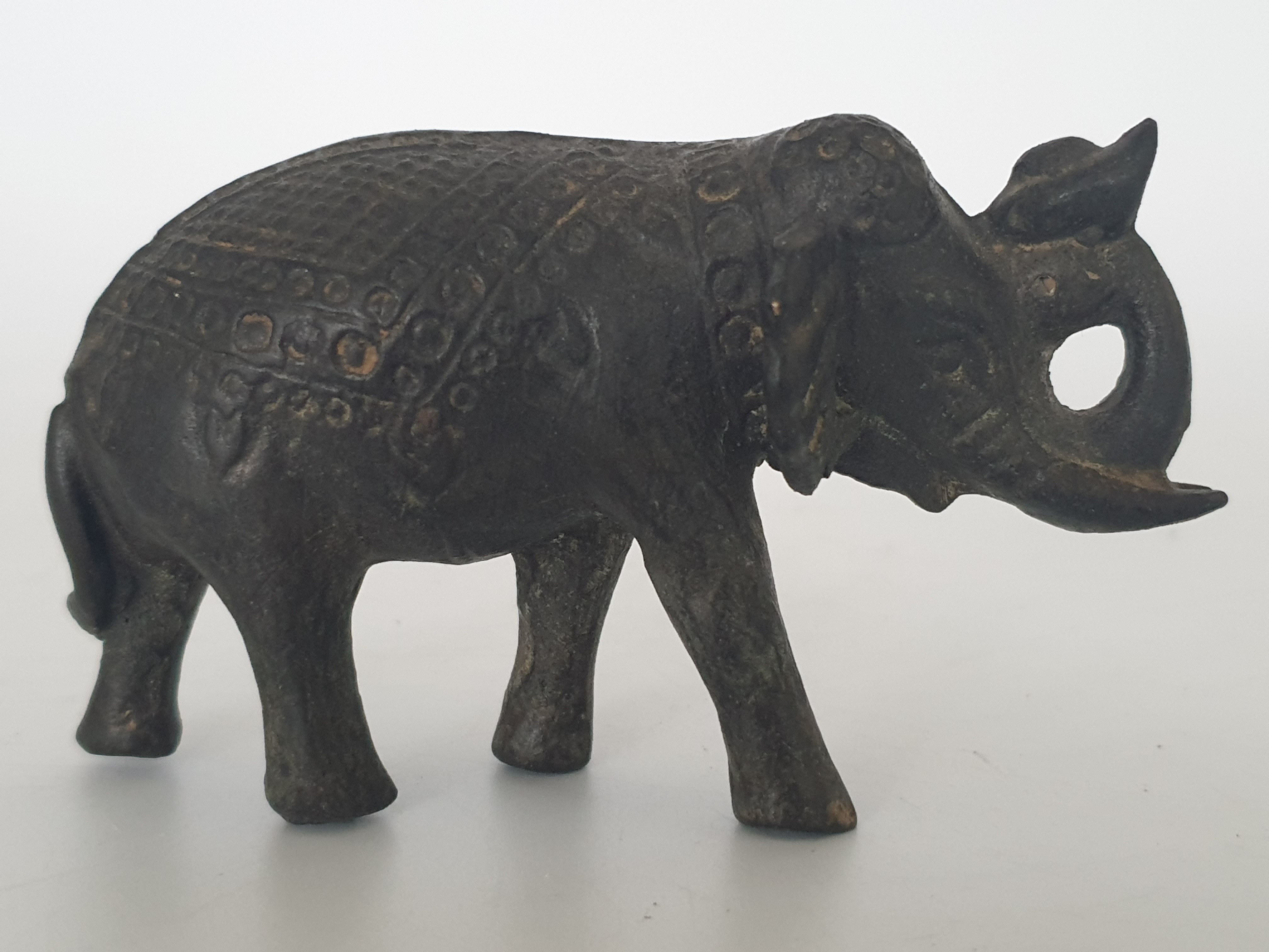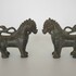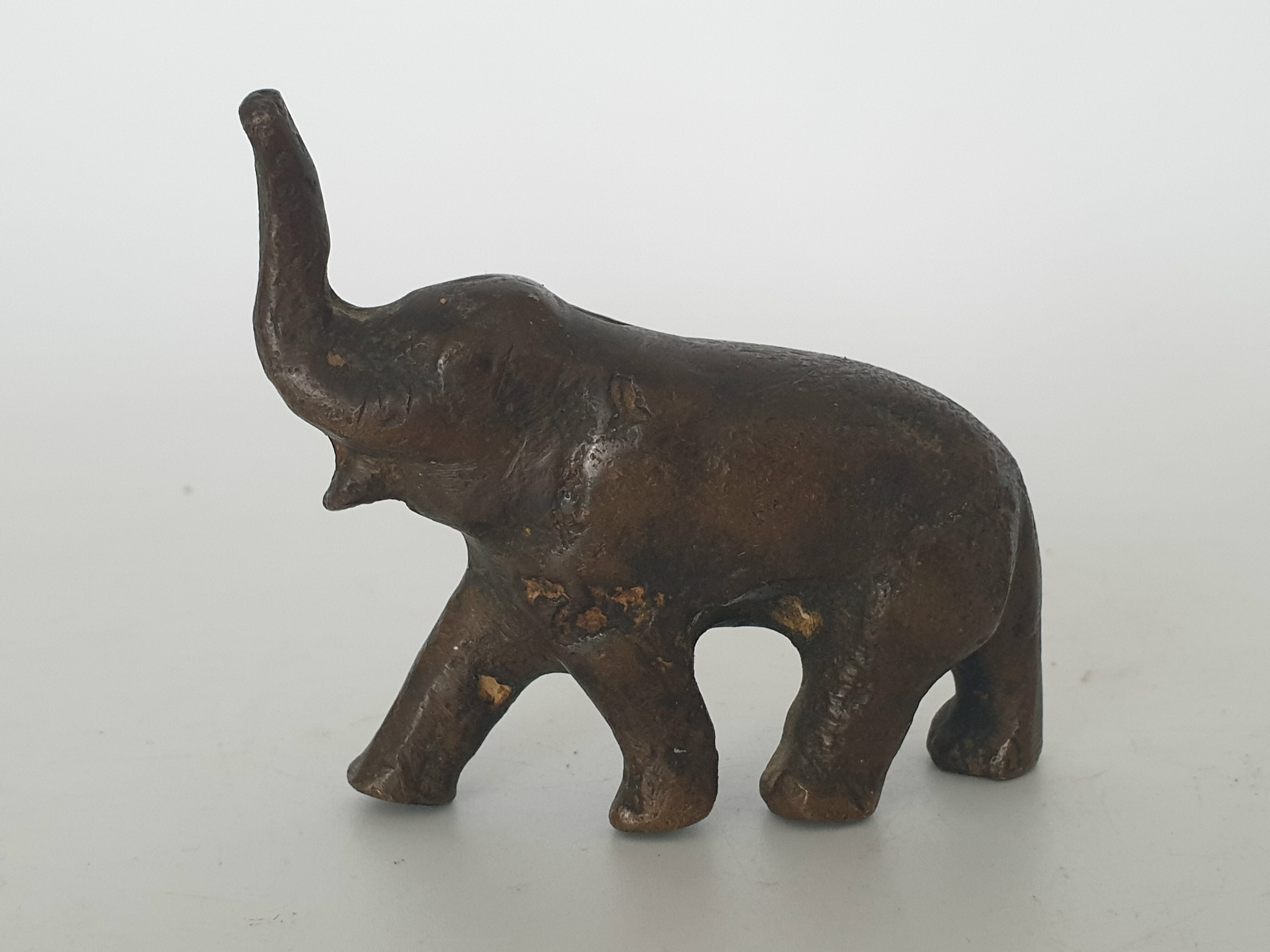 Drie beelden van olifanten uit India waarvan een als kandelaar, twee Foo Dogs uit China. Brons legeringen, 20e eeuw. |