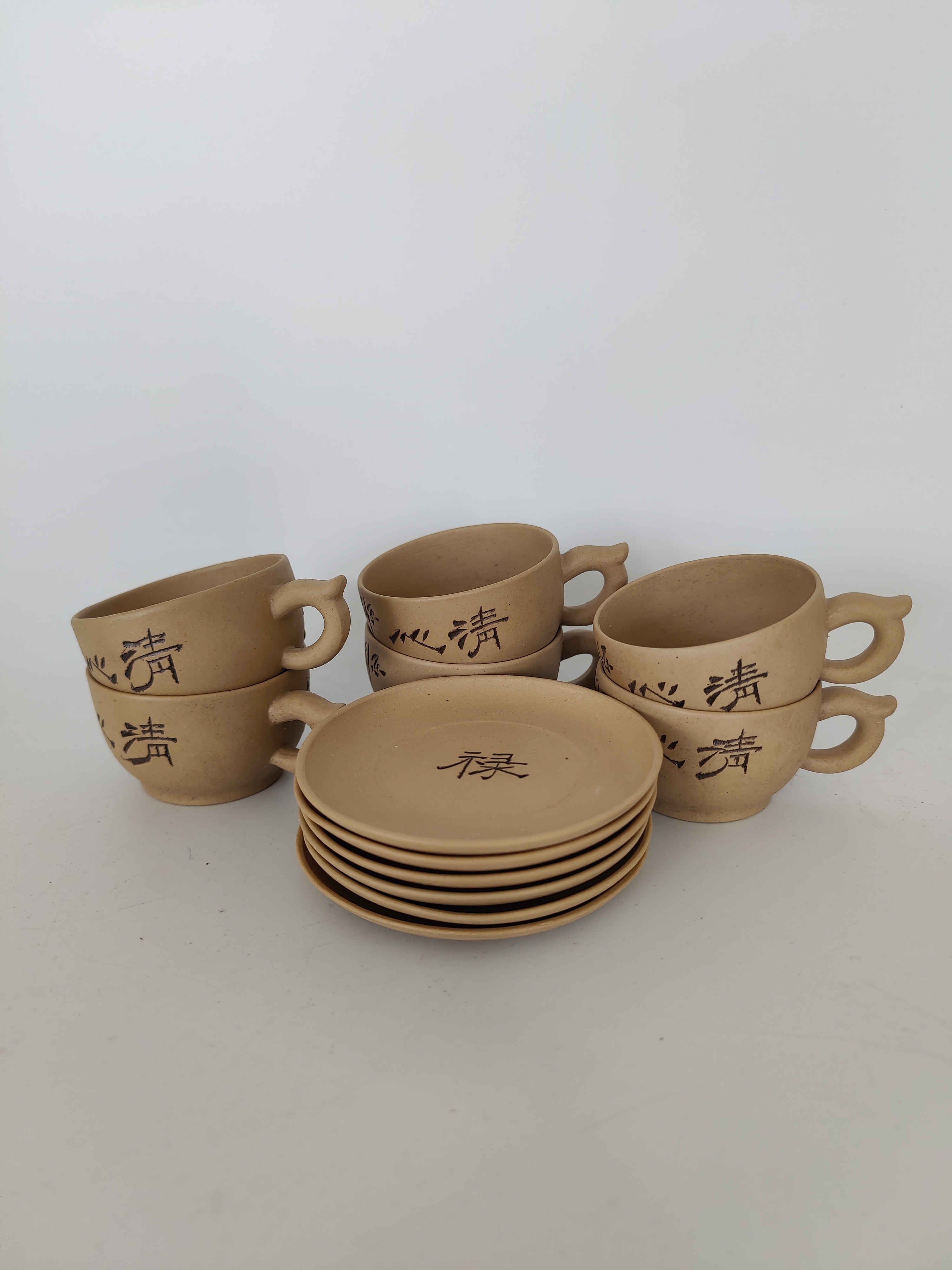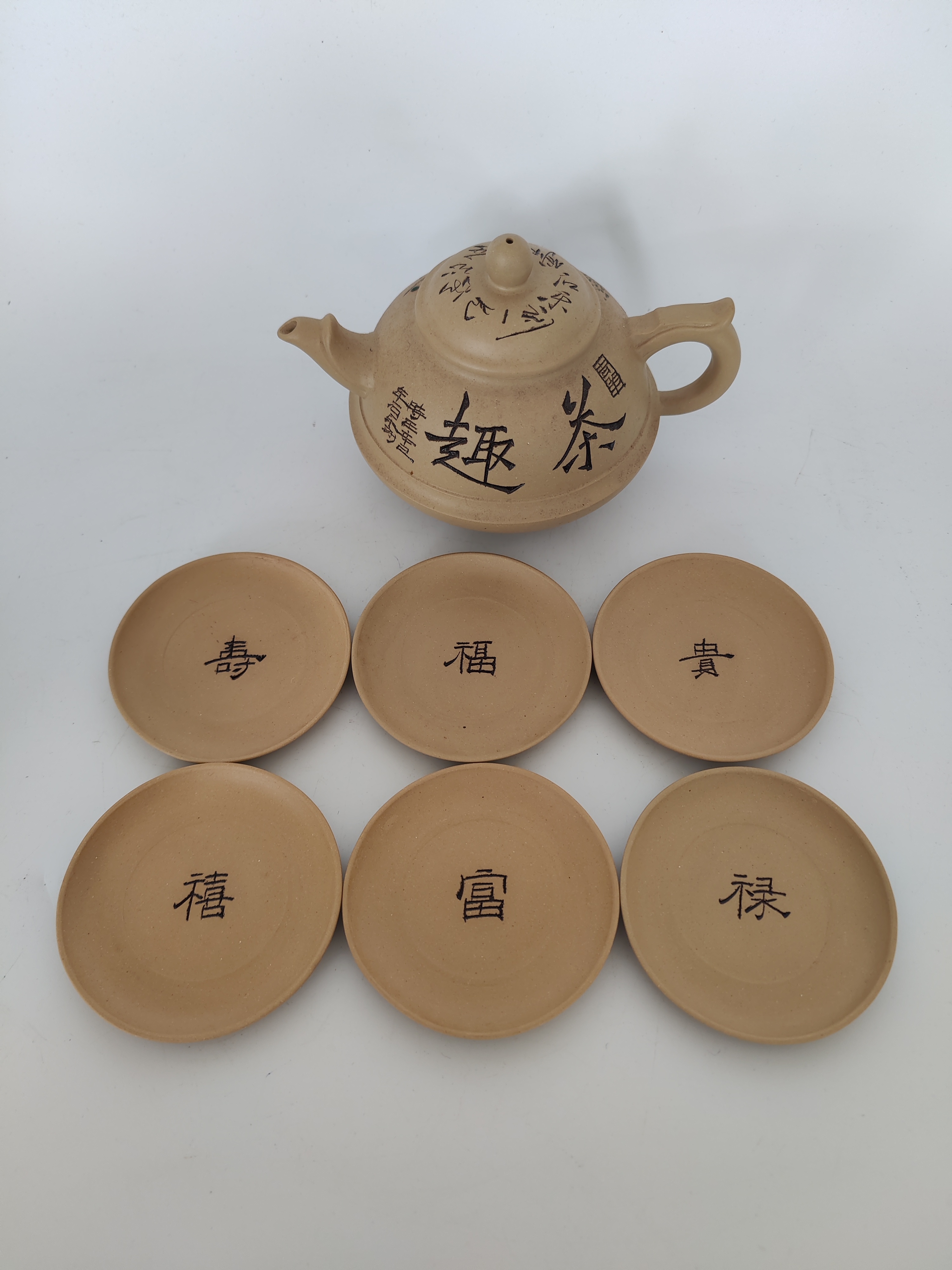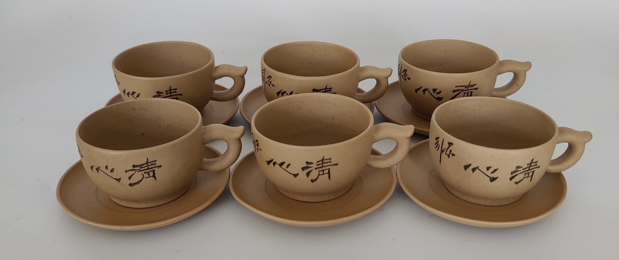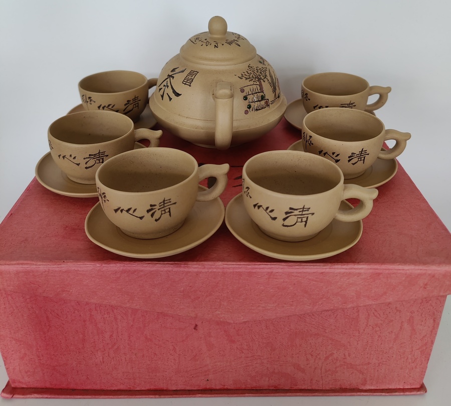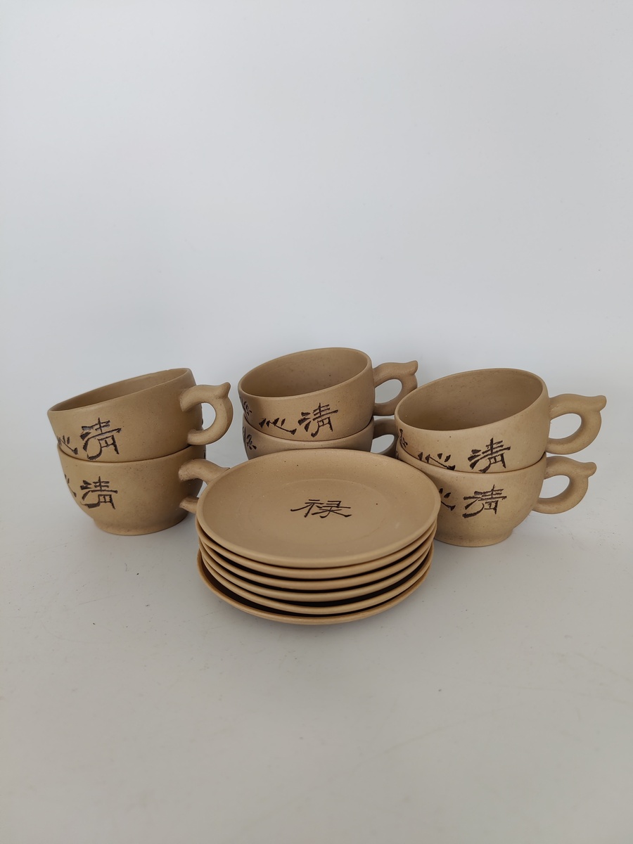 Complete set met zes kop-en-schotels en een theepot, handgemaakt en voorzien van Chinese karakters. |