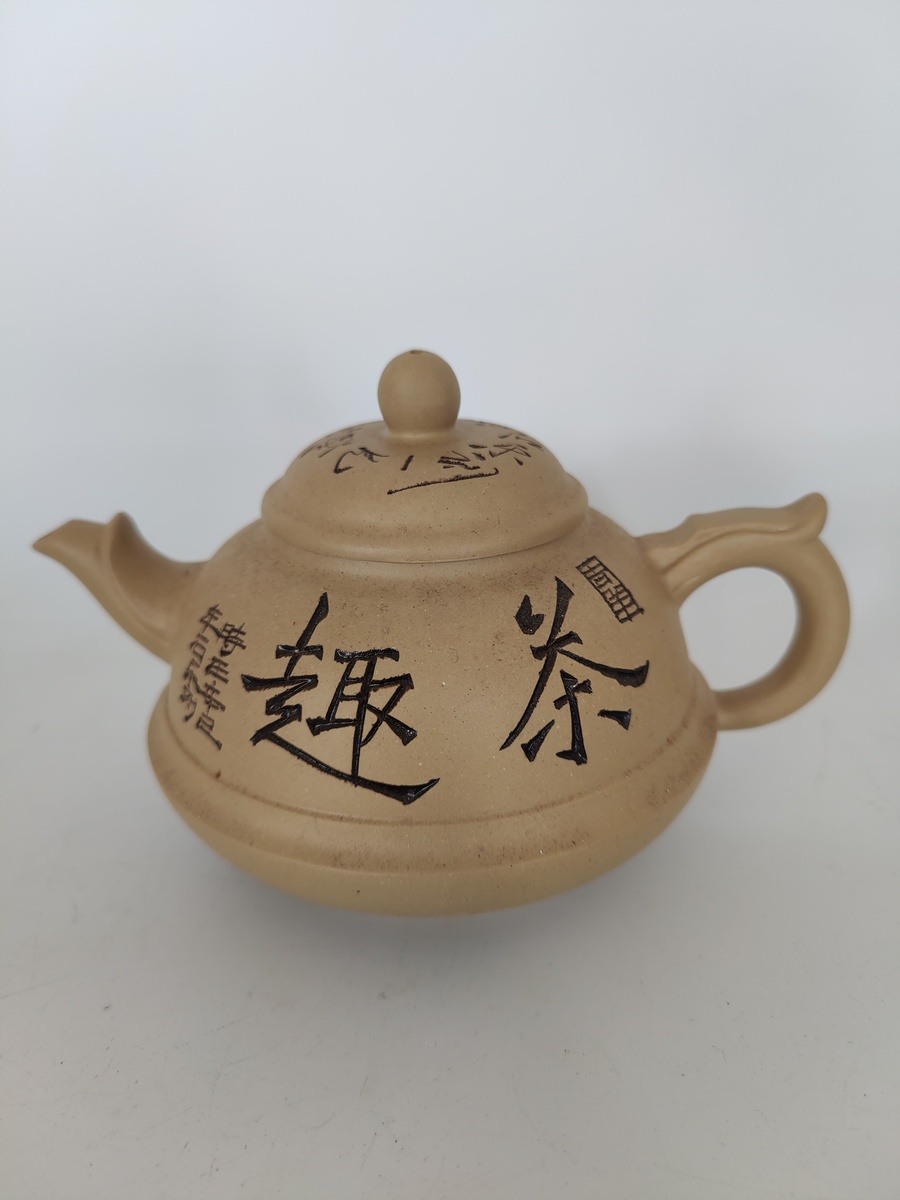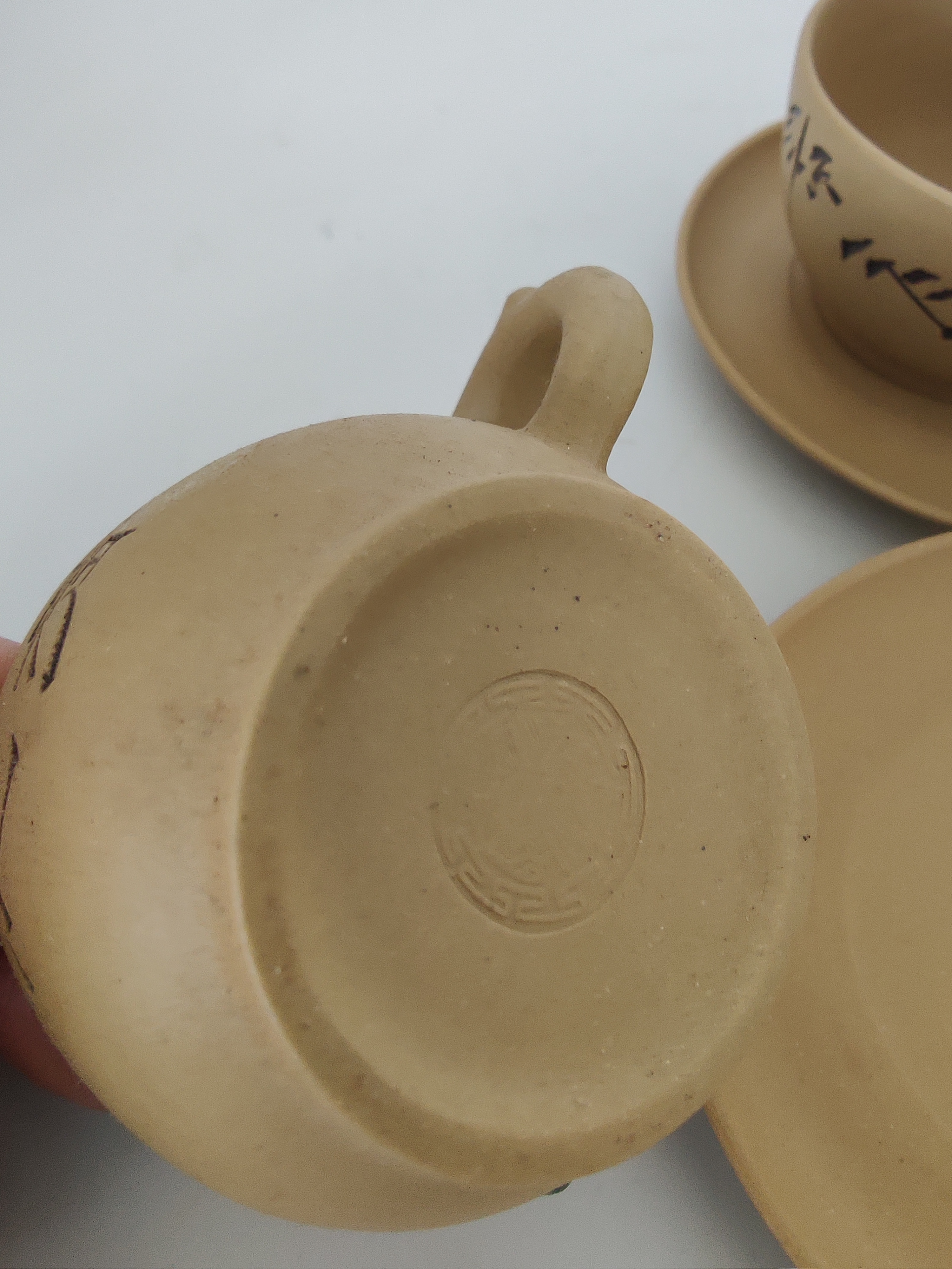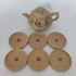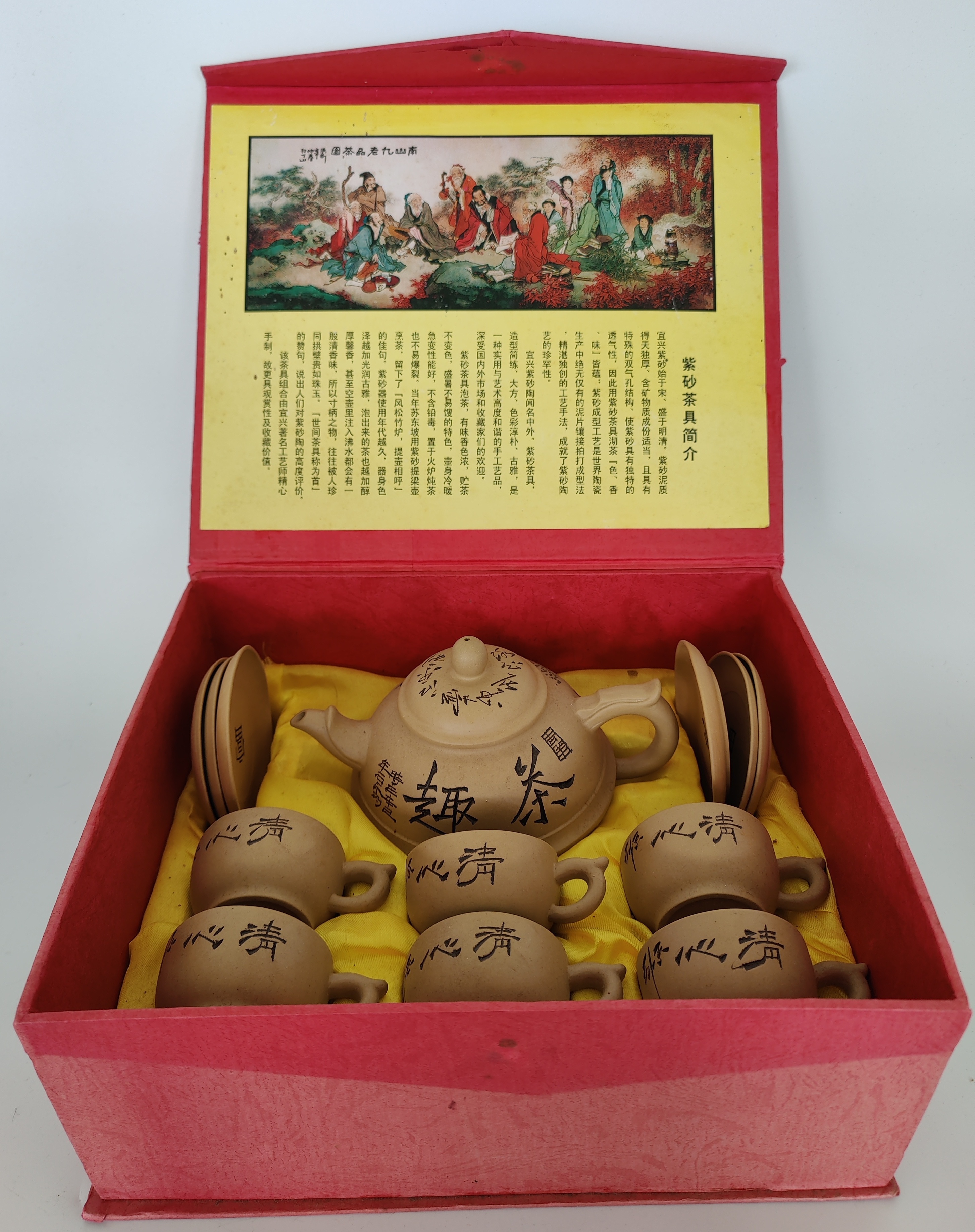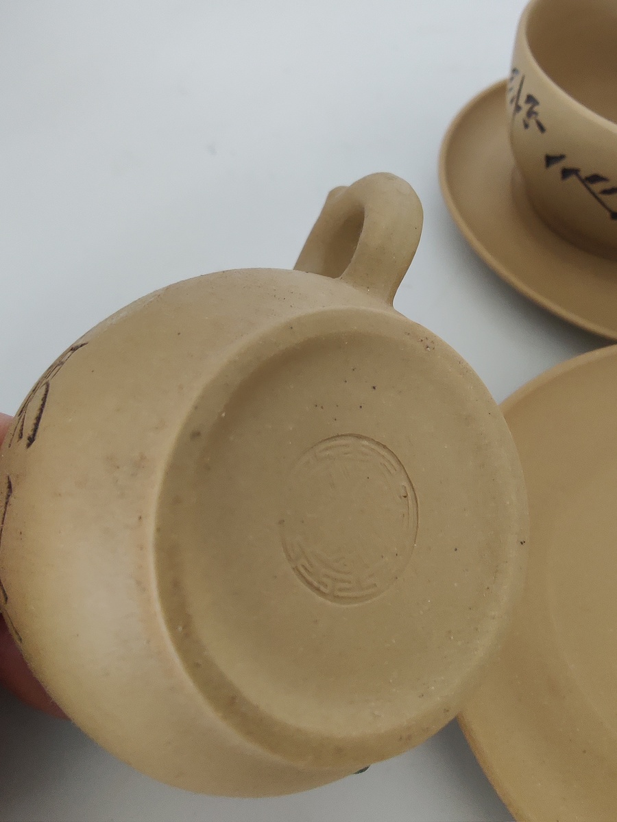 Complete set met zes kop-en-schotels en een theepot, handgemaakt en voorzien van Chinese karakters. |