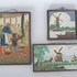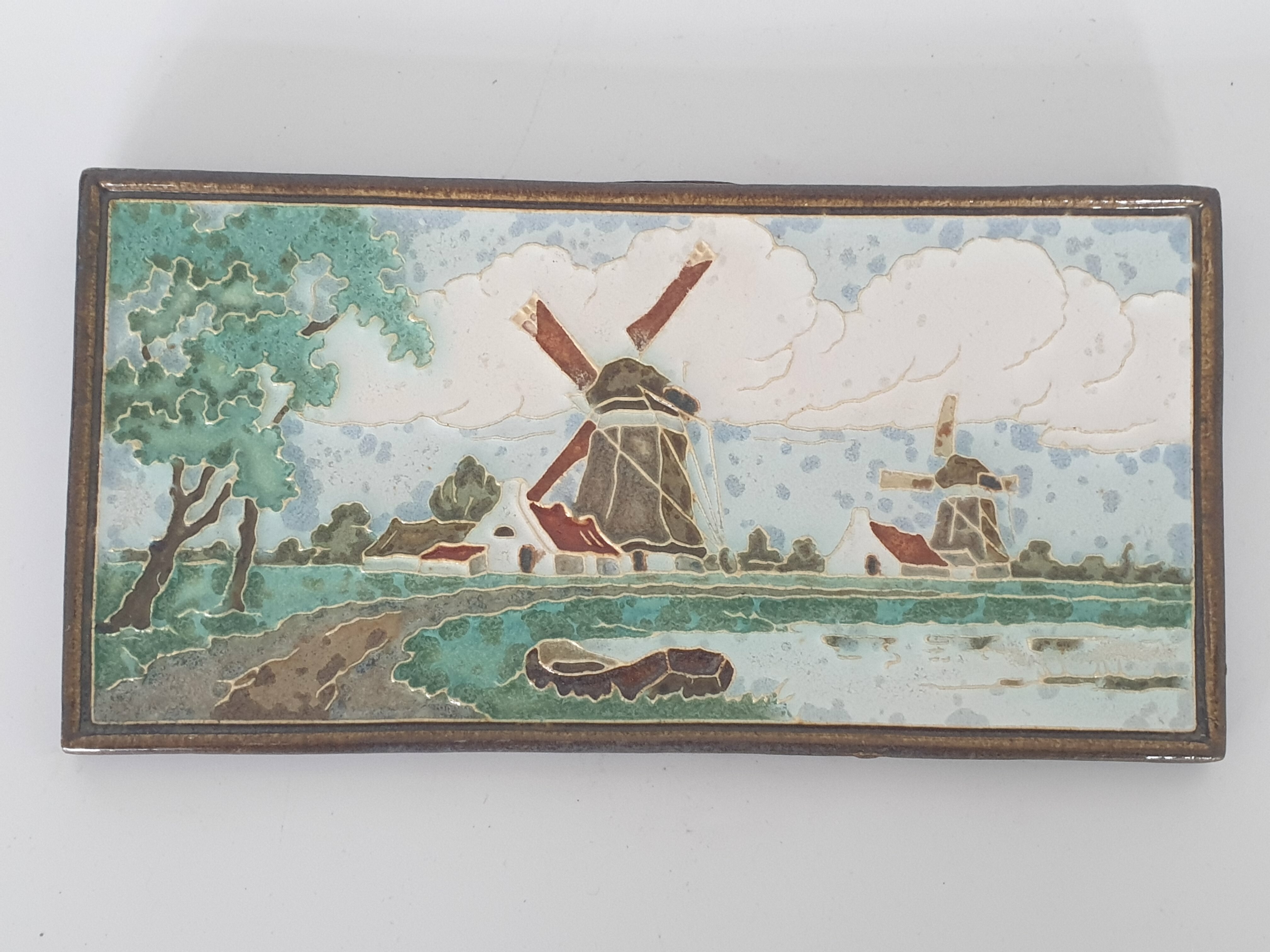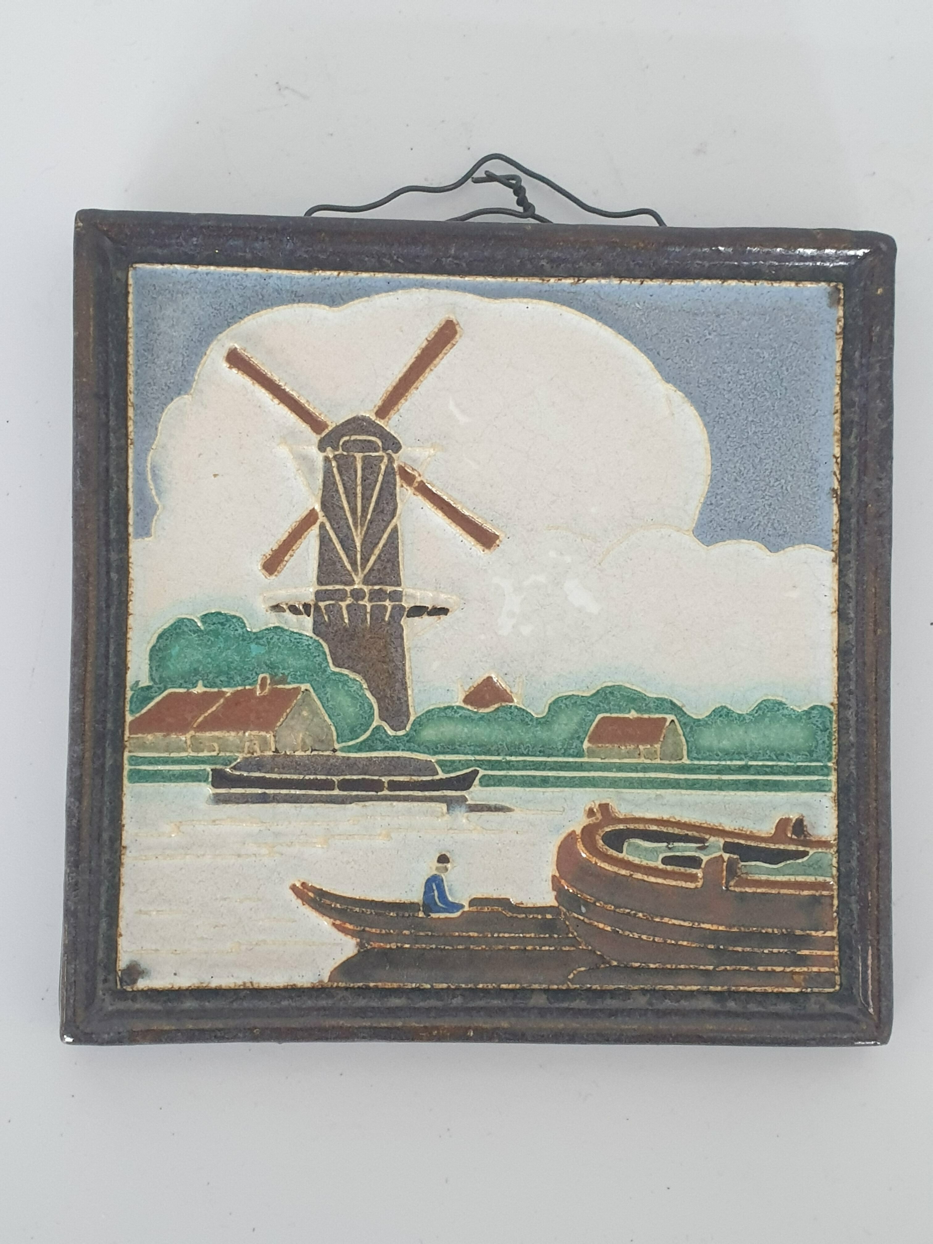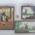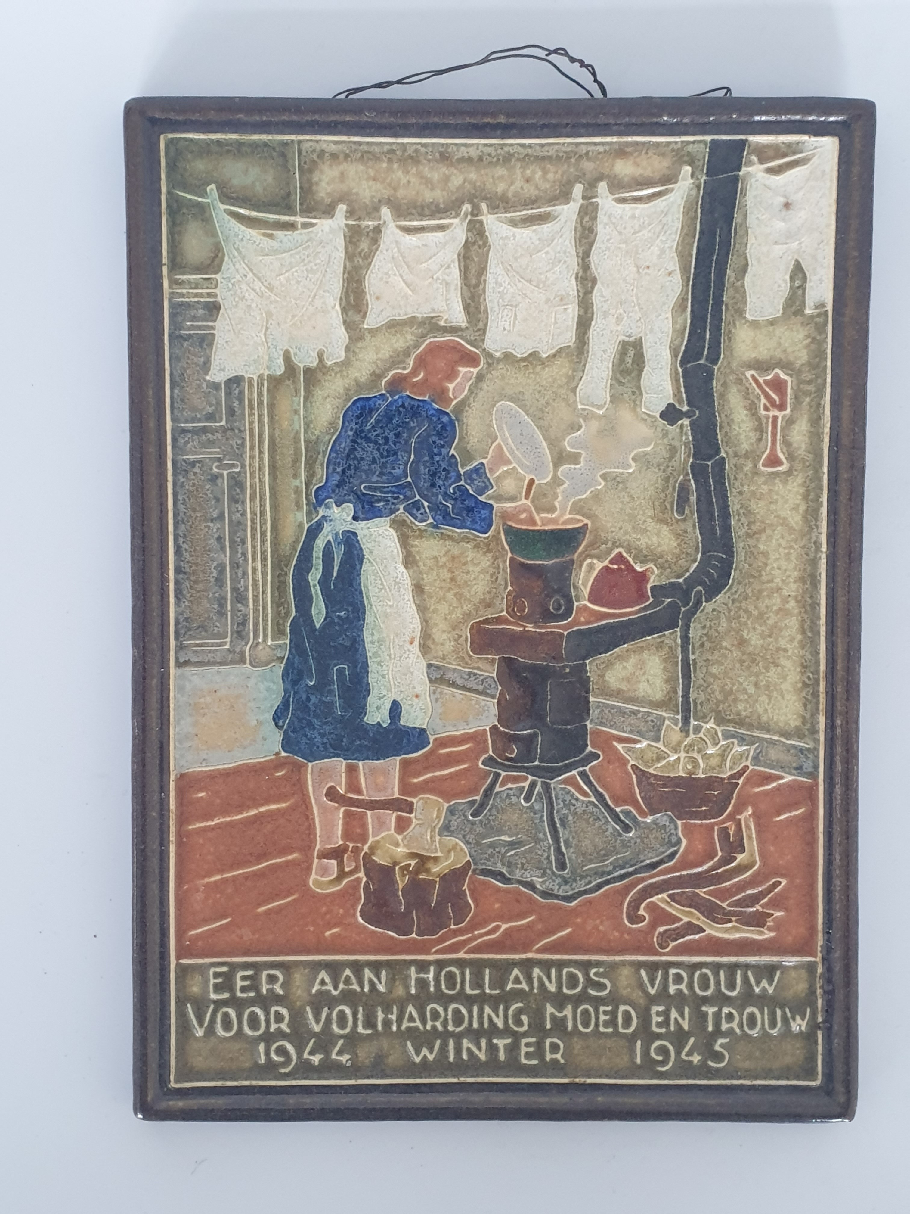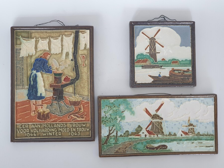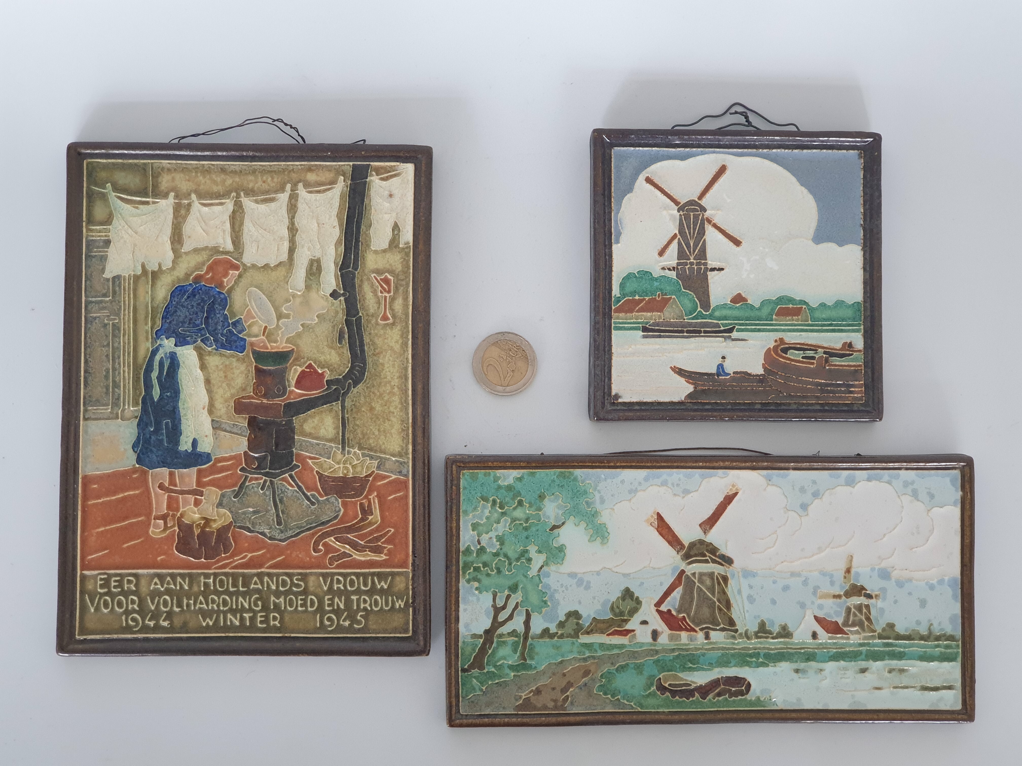 Drie Delftse cloisonné tegels met oud Hollandse voorstellingen. Twee landschappelijke voorstelling en een tegel betreffende de hongerwinter. Verso gemerkt Porceleyne Fles, tweede kwart 20e eeuw. |