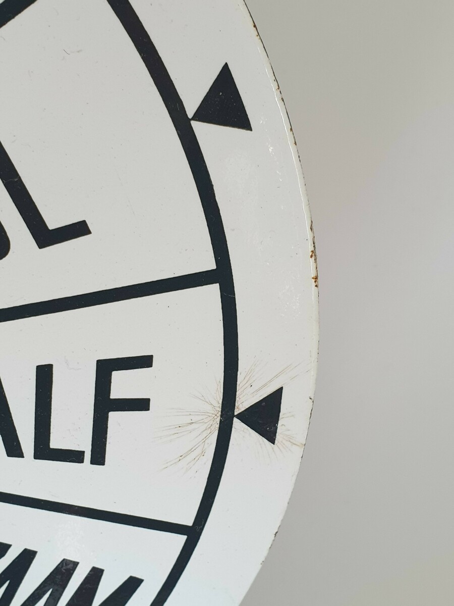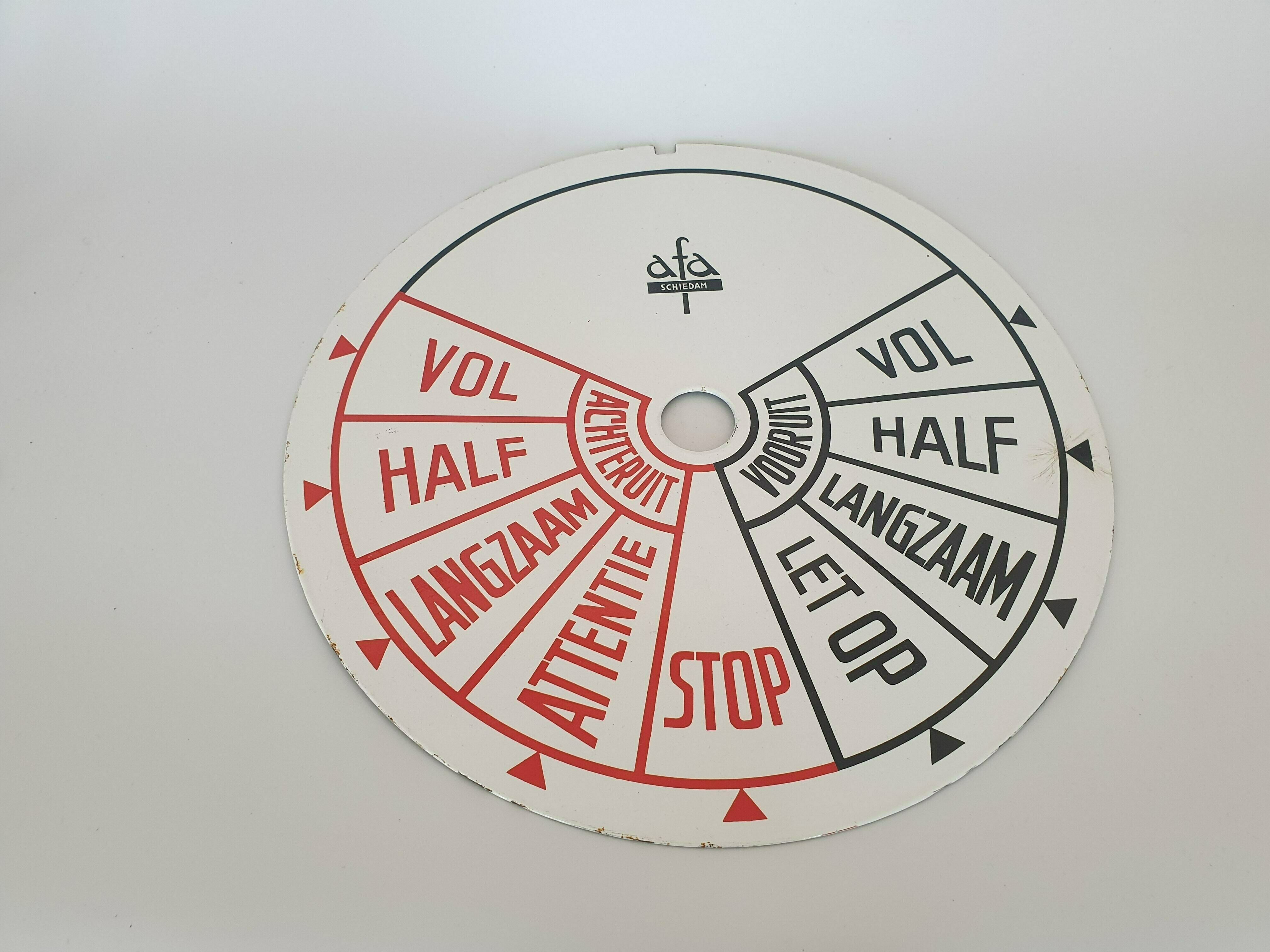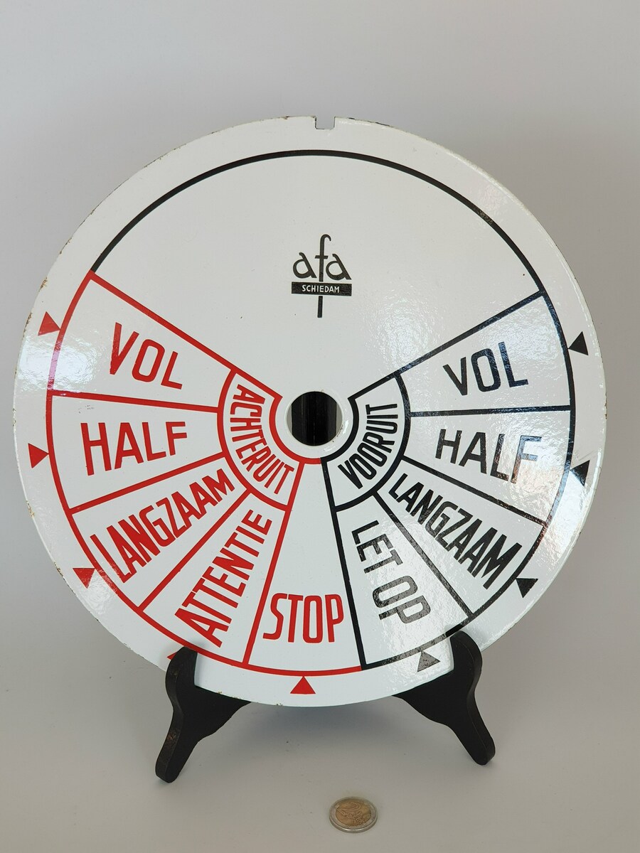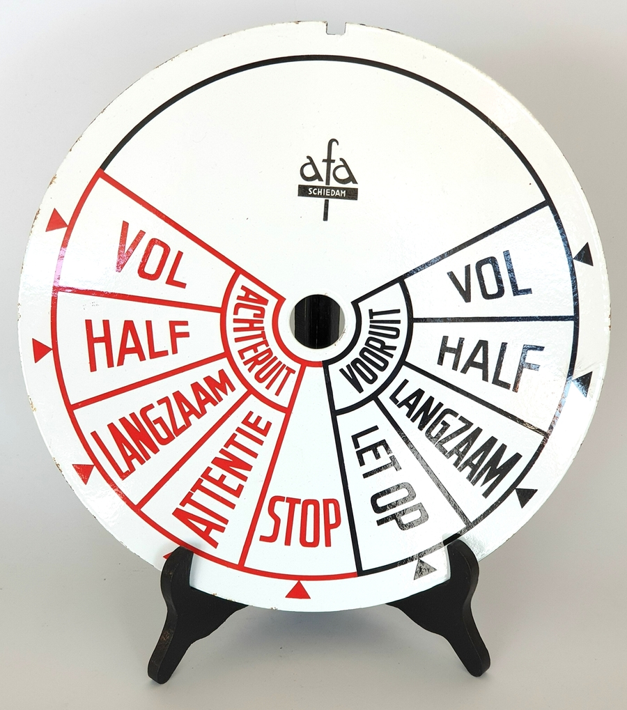 Originele geëmailleerde plaat voor de motorbediening van een Nederlands schip. Gemerkt afa, Schiedam. Gefabriceerd omstreeks 1950. |