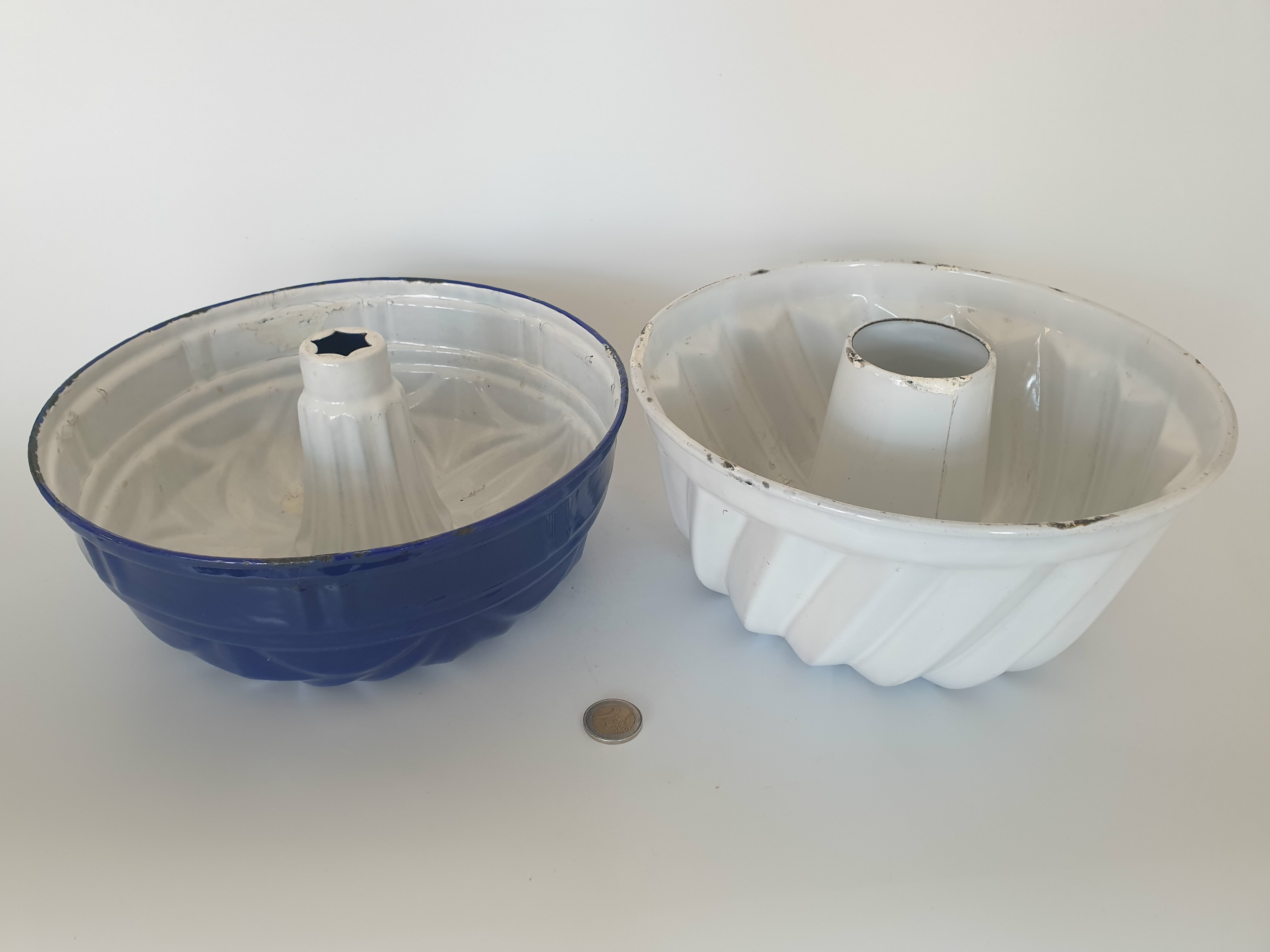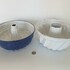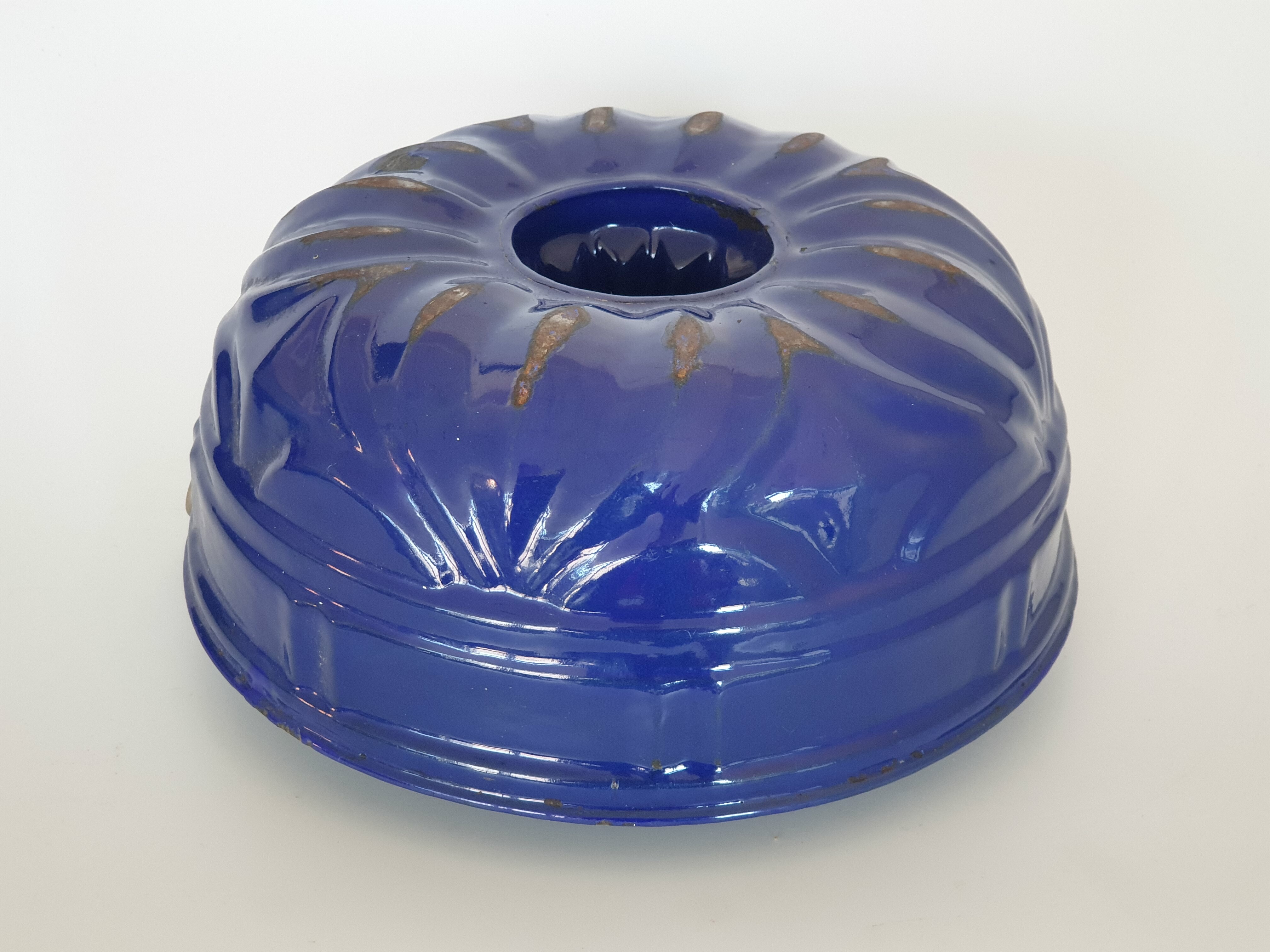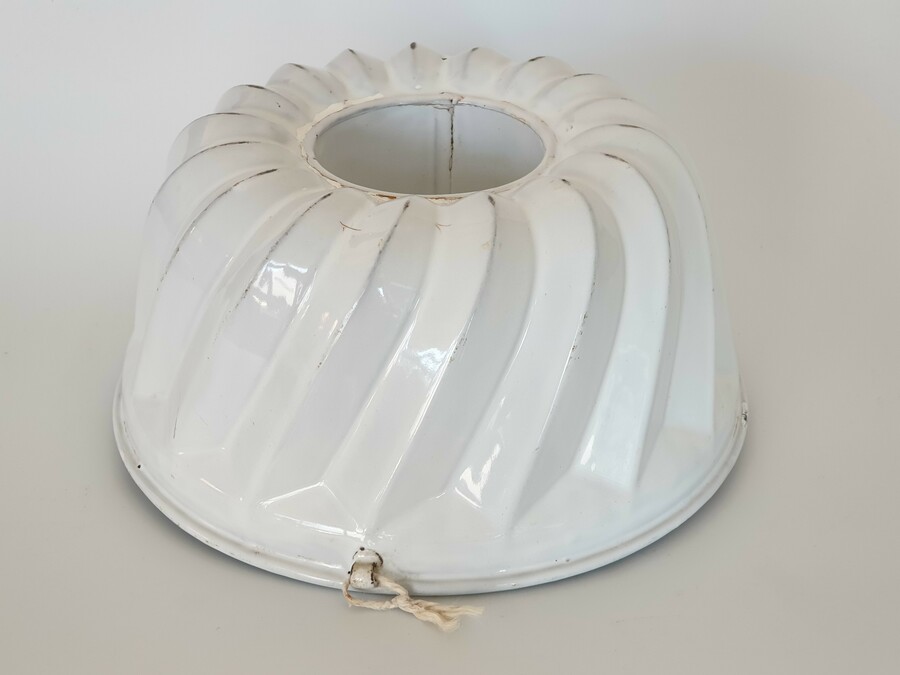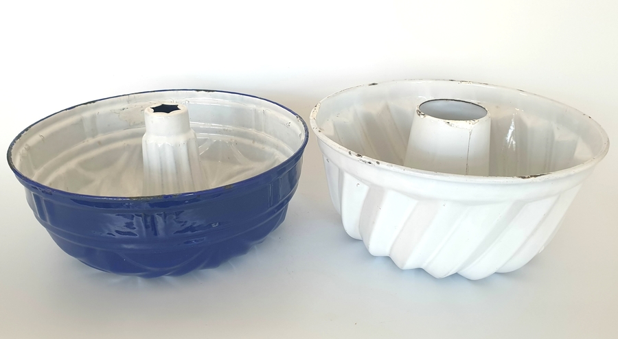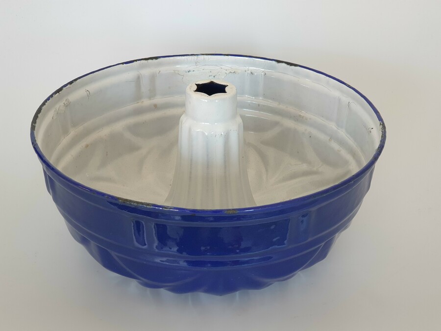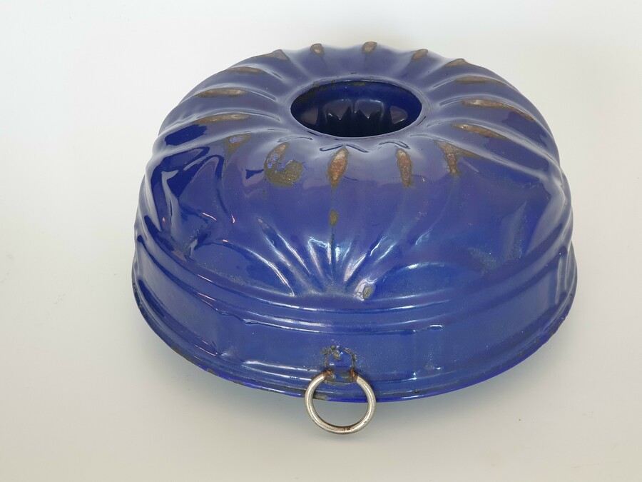 Blauw en wit emaille tulband bakvormen met ophanghaken, omstreeks 1930. |
