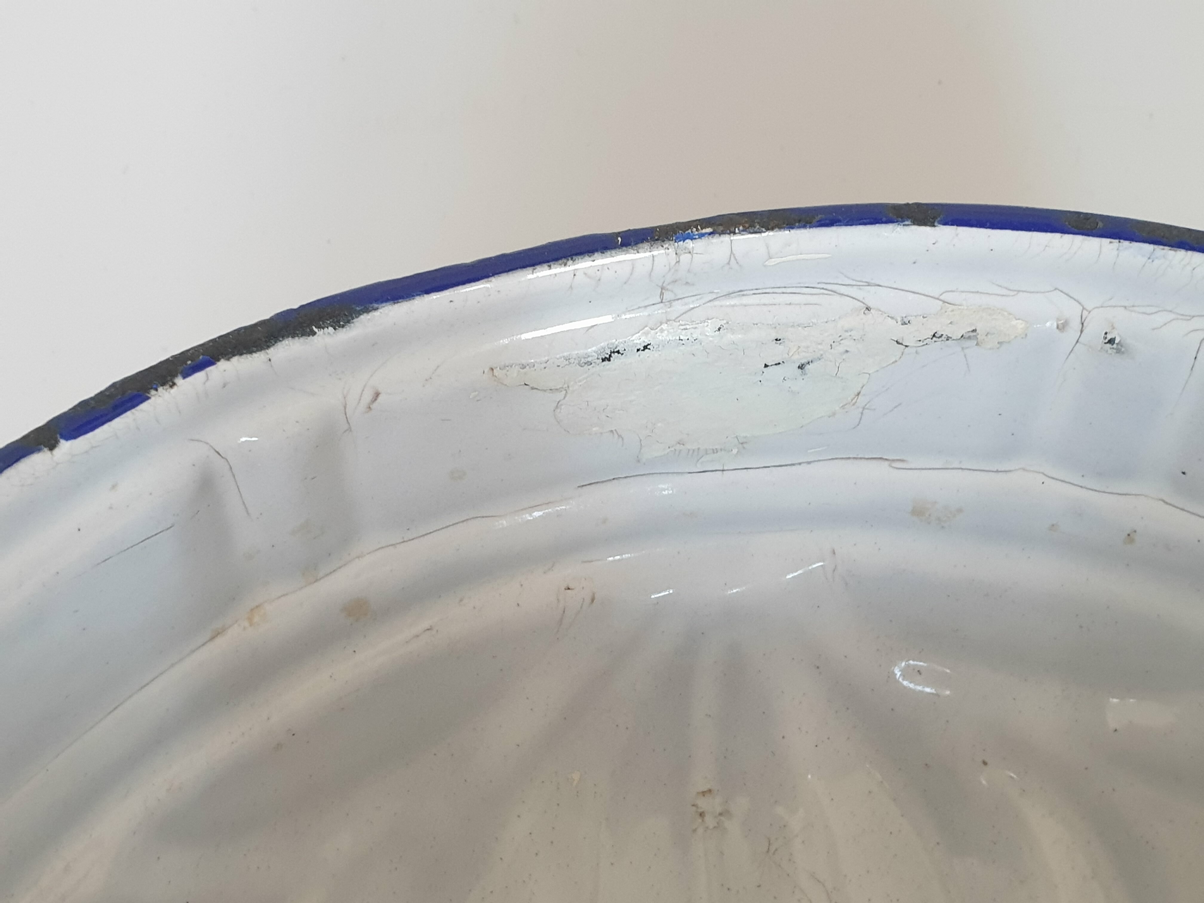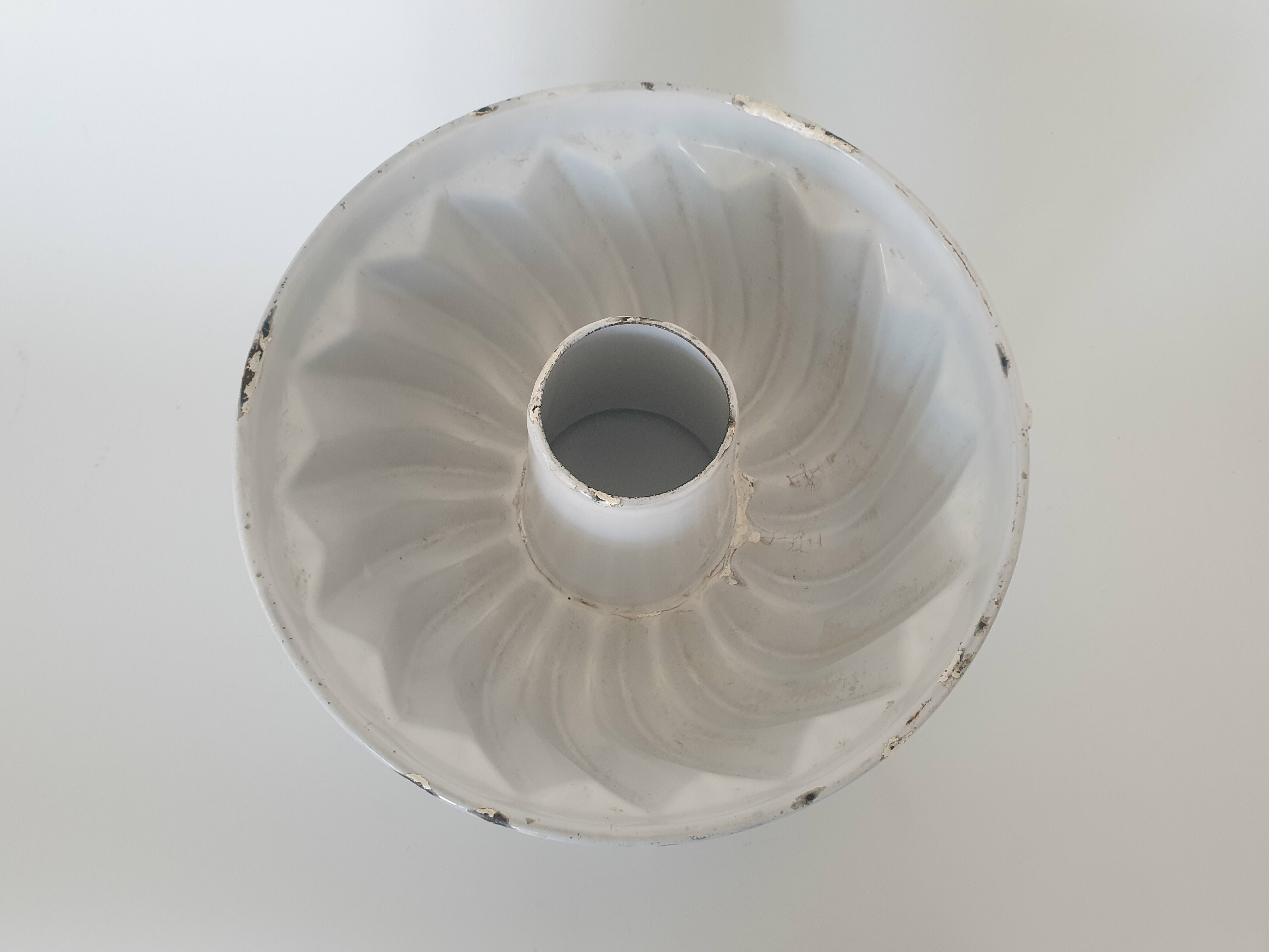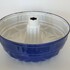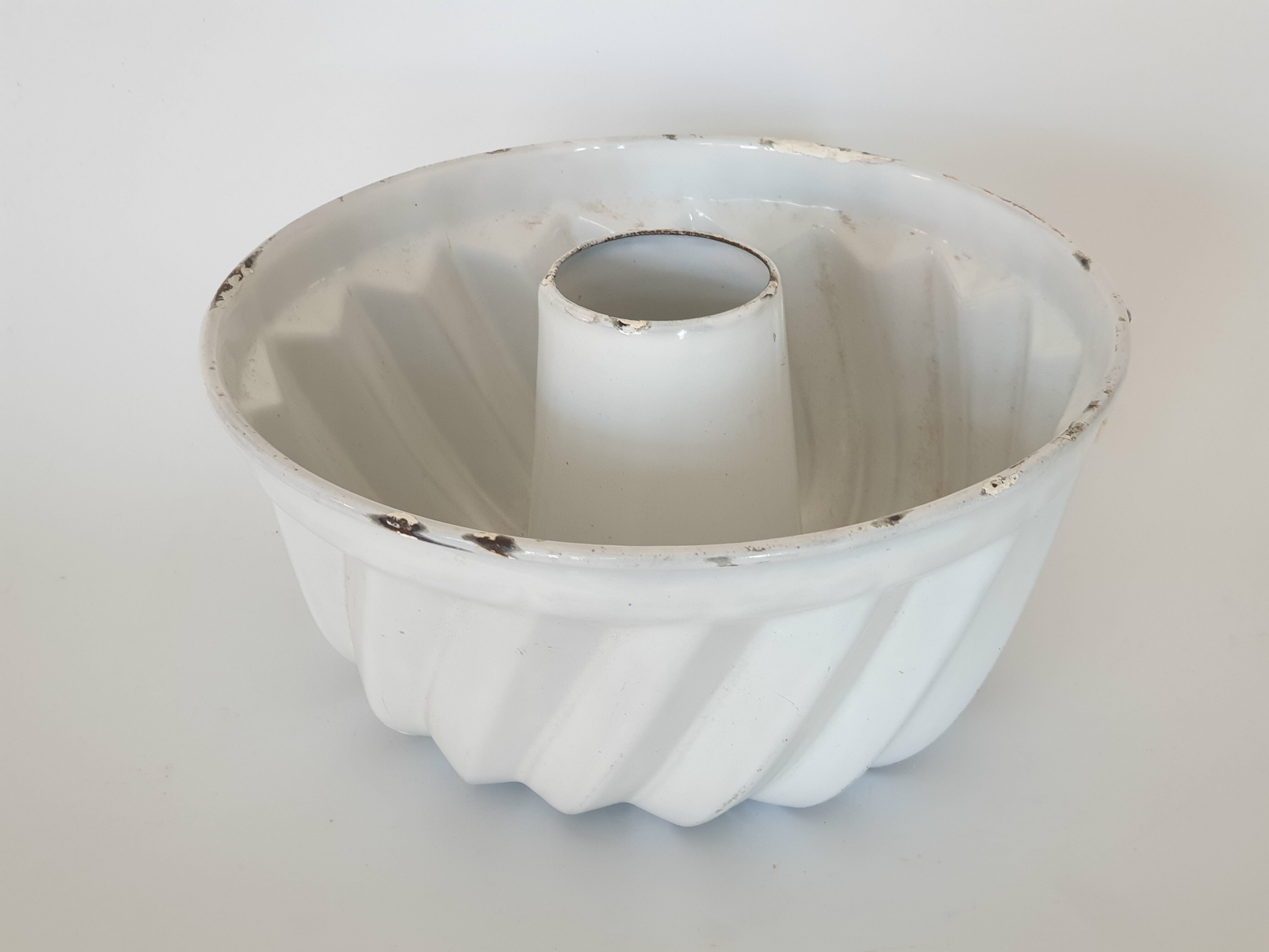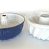 Blauw en wit emaille tulband bakvormen met ophanghaken, omstreeks 1930. |