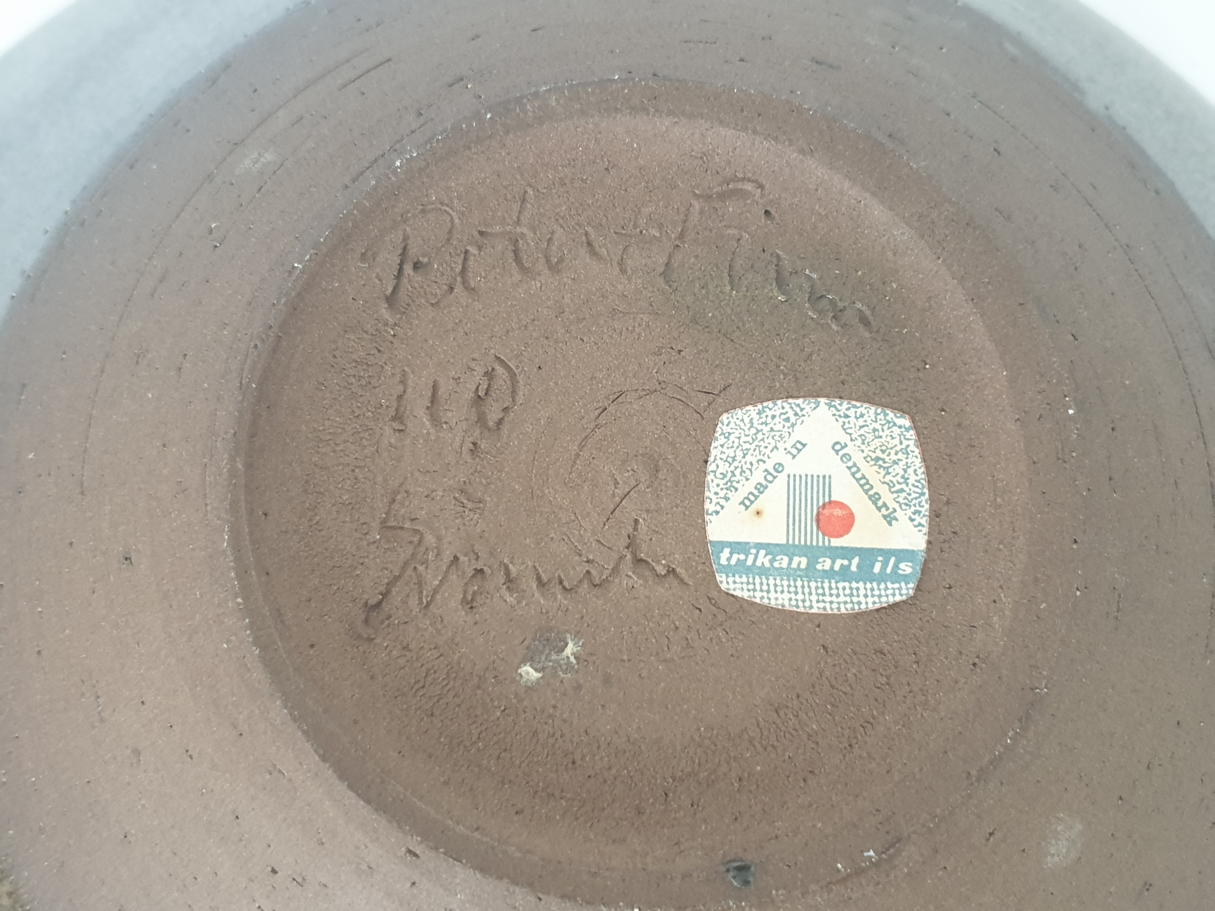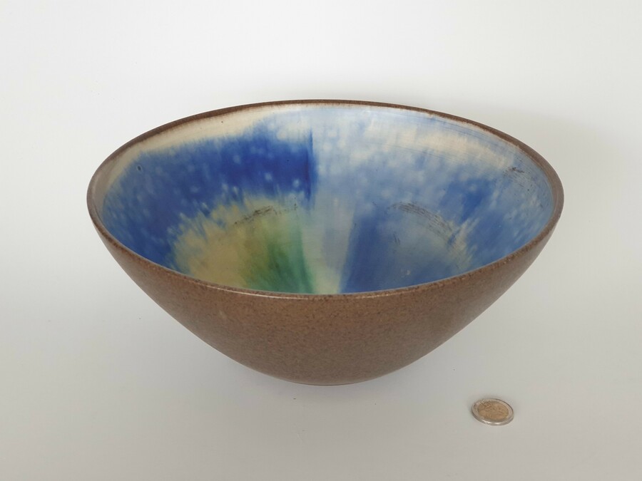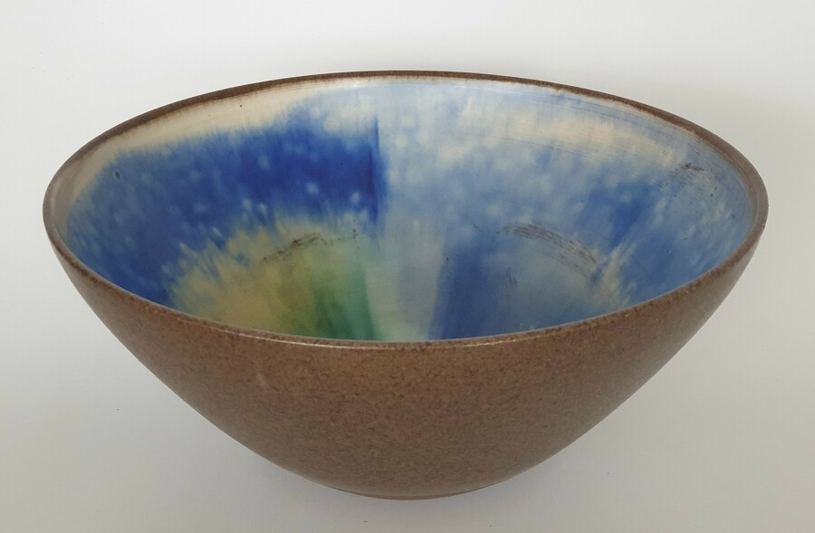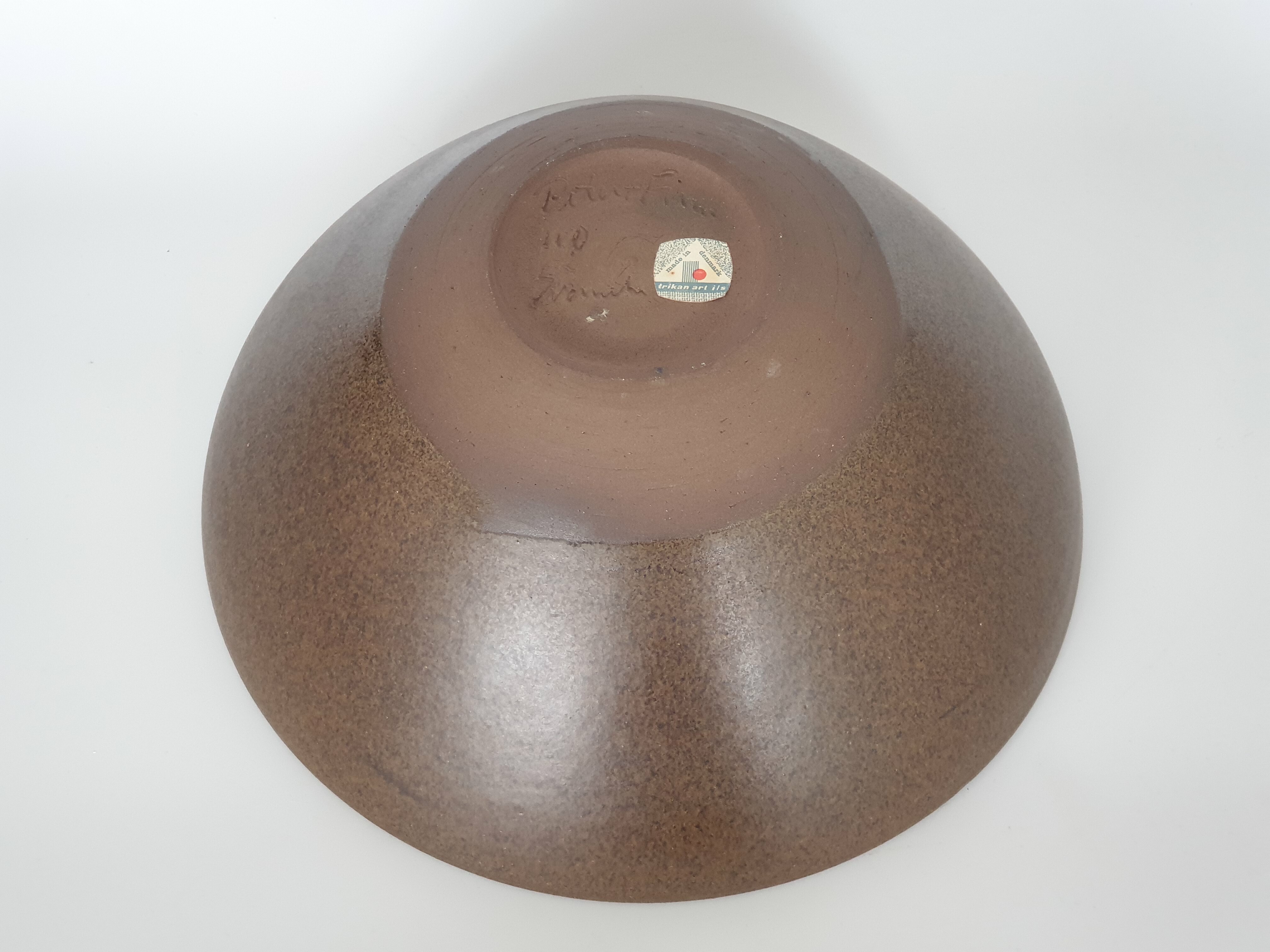 Aardewerken Deense kom met geglazuurde binnenzijde in groen, blauw en geel. Aan de onderzijde gemerkt, sticker vermeld Trikan Art, made in Denmark. Omstreeks 1960. |