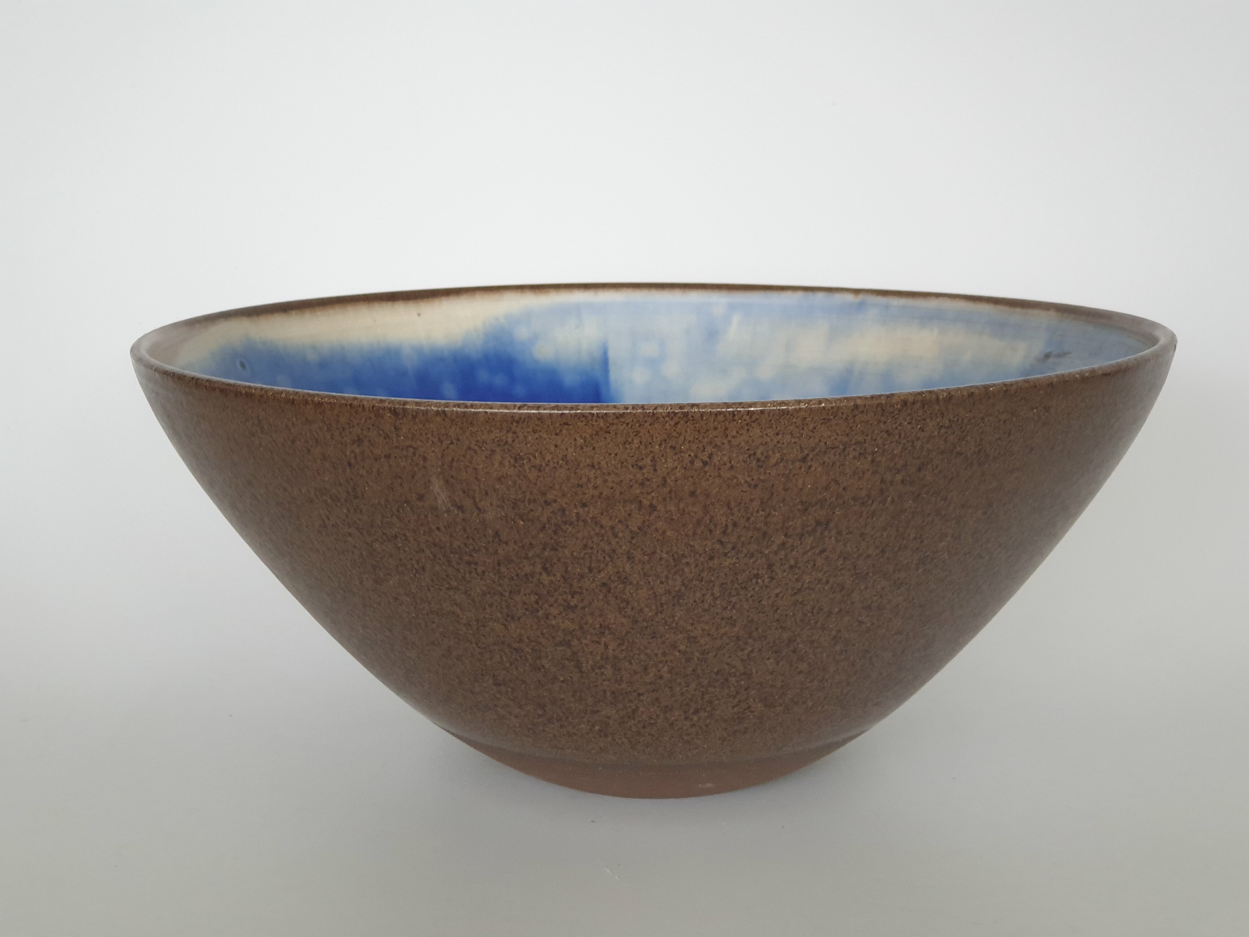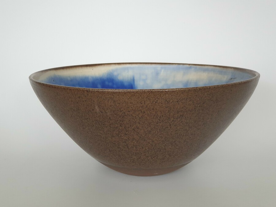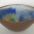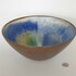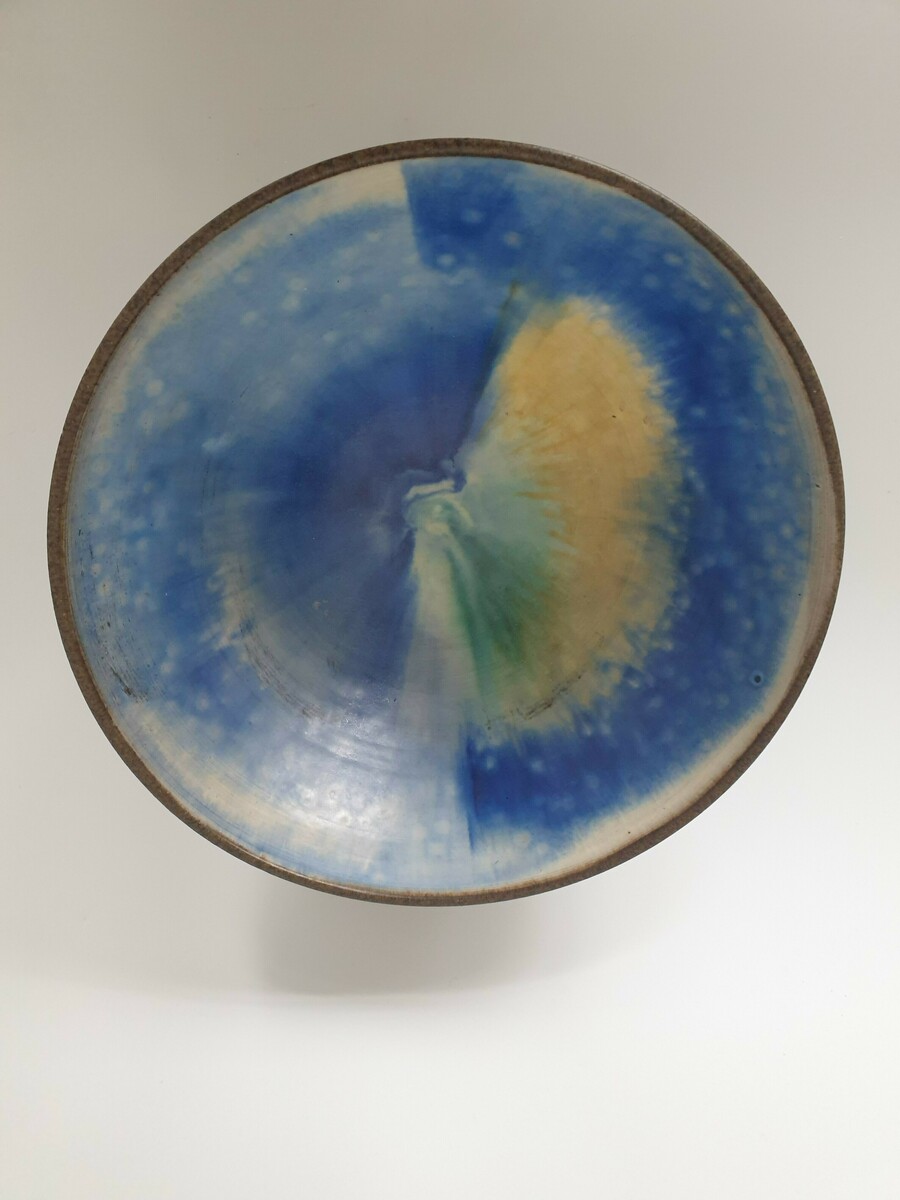 Aardewerken Deense kom met geglazuurde binnenzijde in groen, blauw en geel. Aan de onderzijde gemerkt, sticker vermeld Trikan Art, made in Denmark. Omstreeks 1960. |