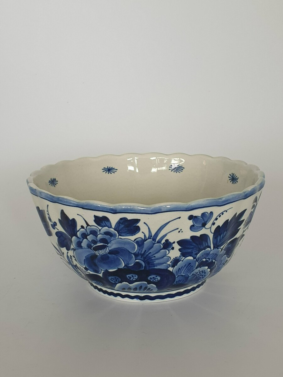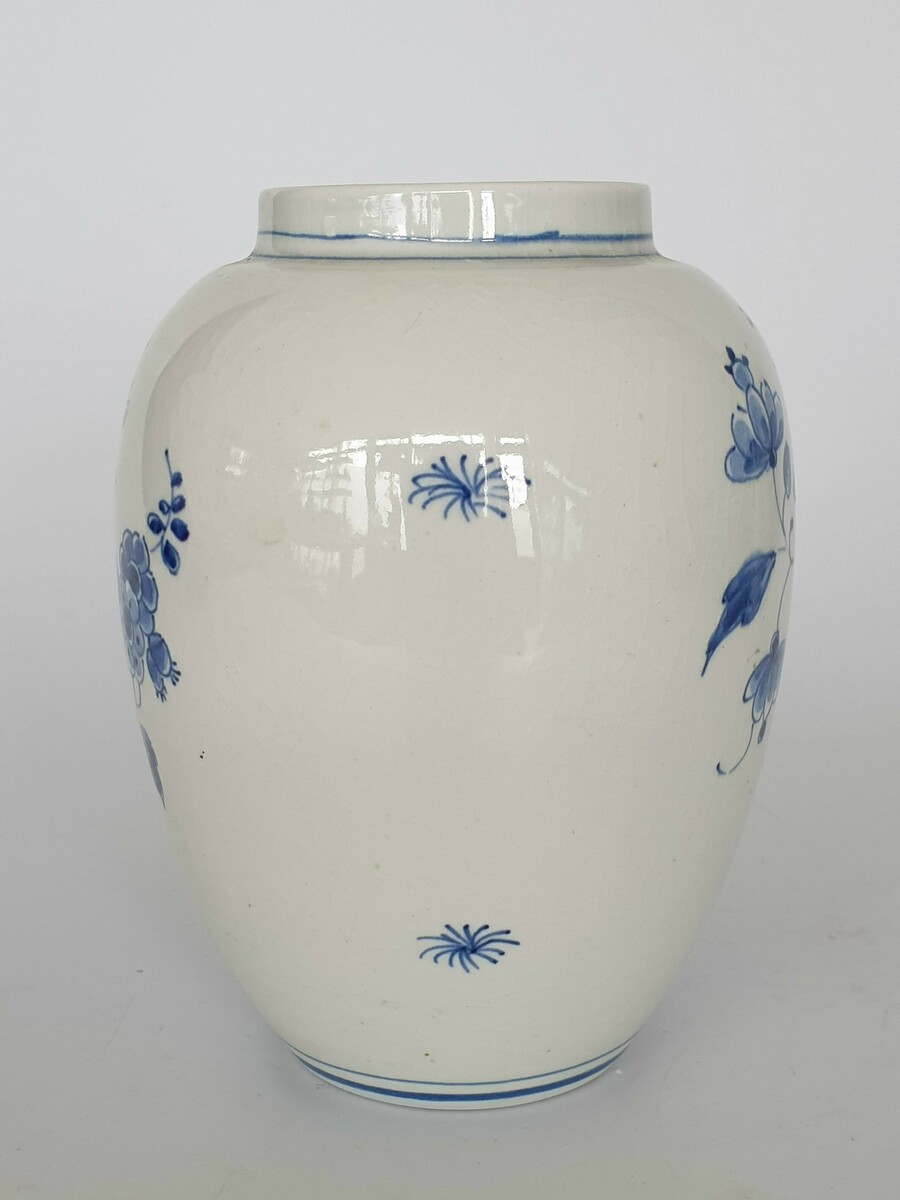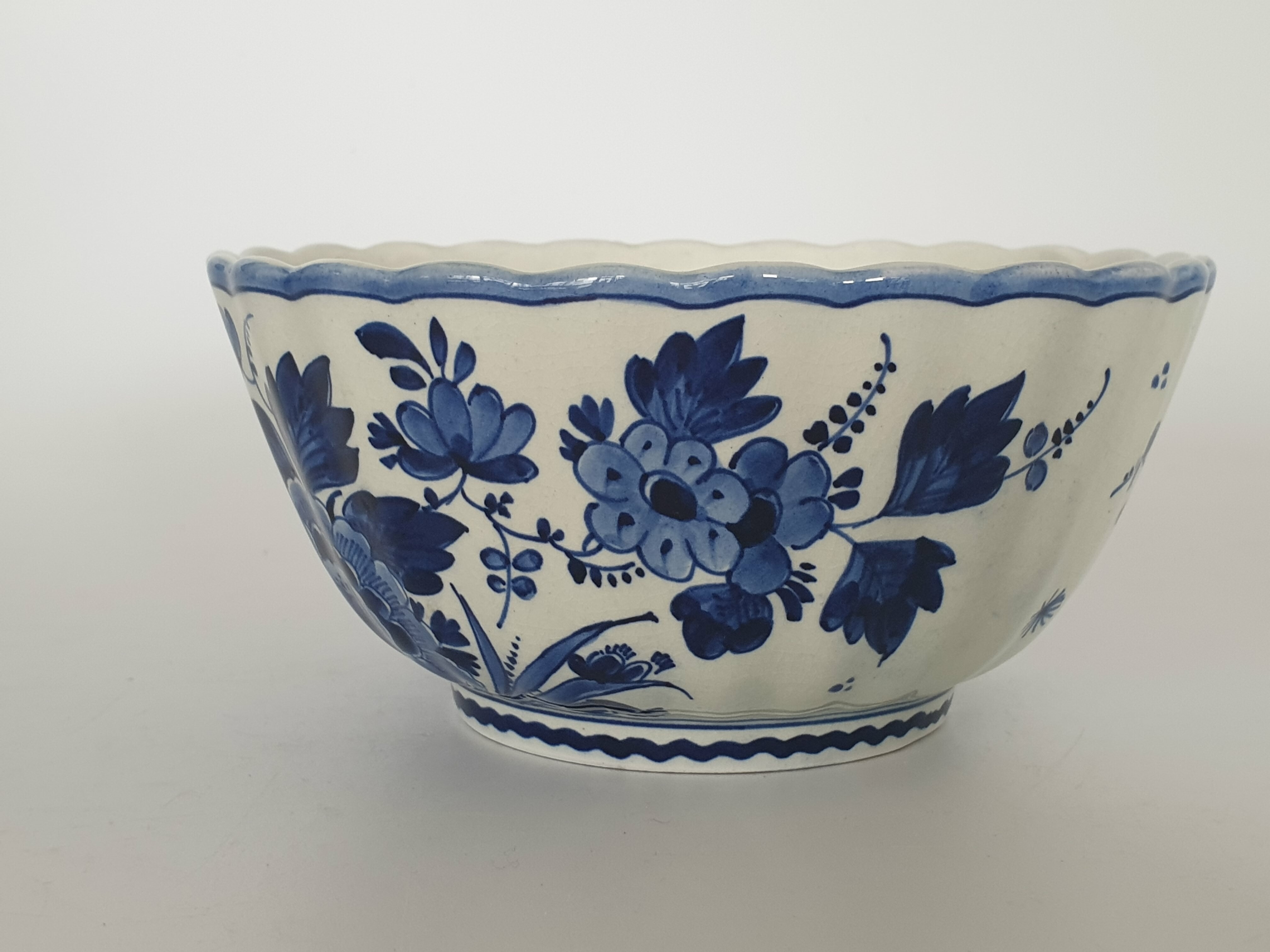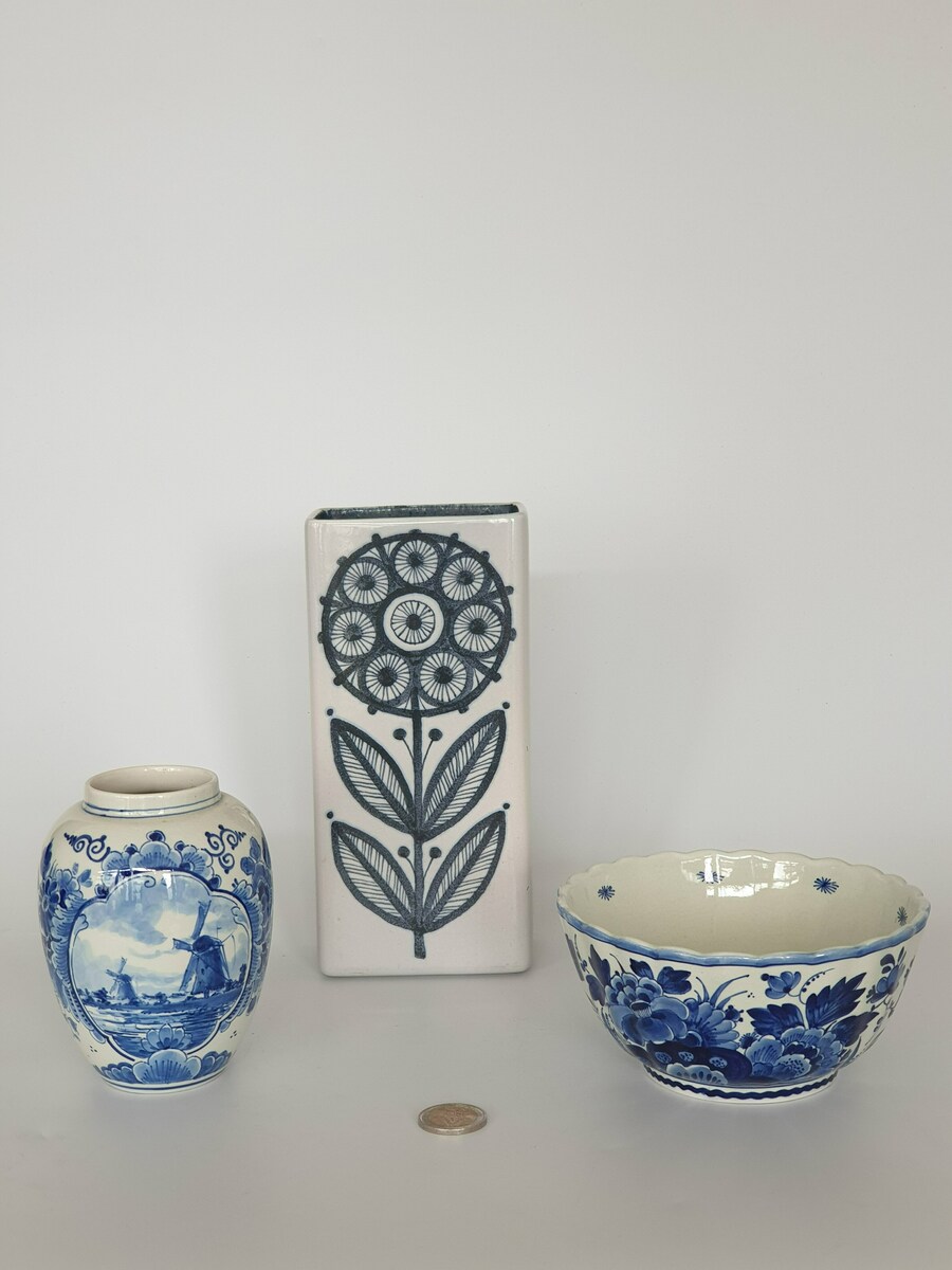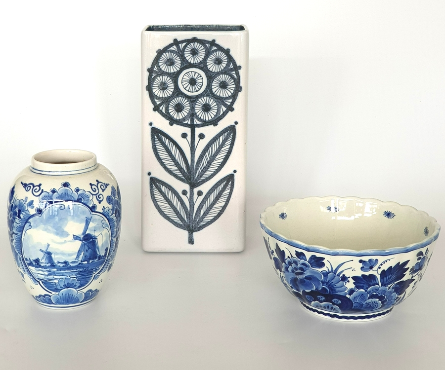 Twee blauw-witte porseleinen vazen en een kom van de Porceleyne Fles, Delft. Alle drie objecten zijn gemerkt aan de onderzijde, schilders monogram en modelnummer, 20e eeuw. |