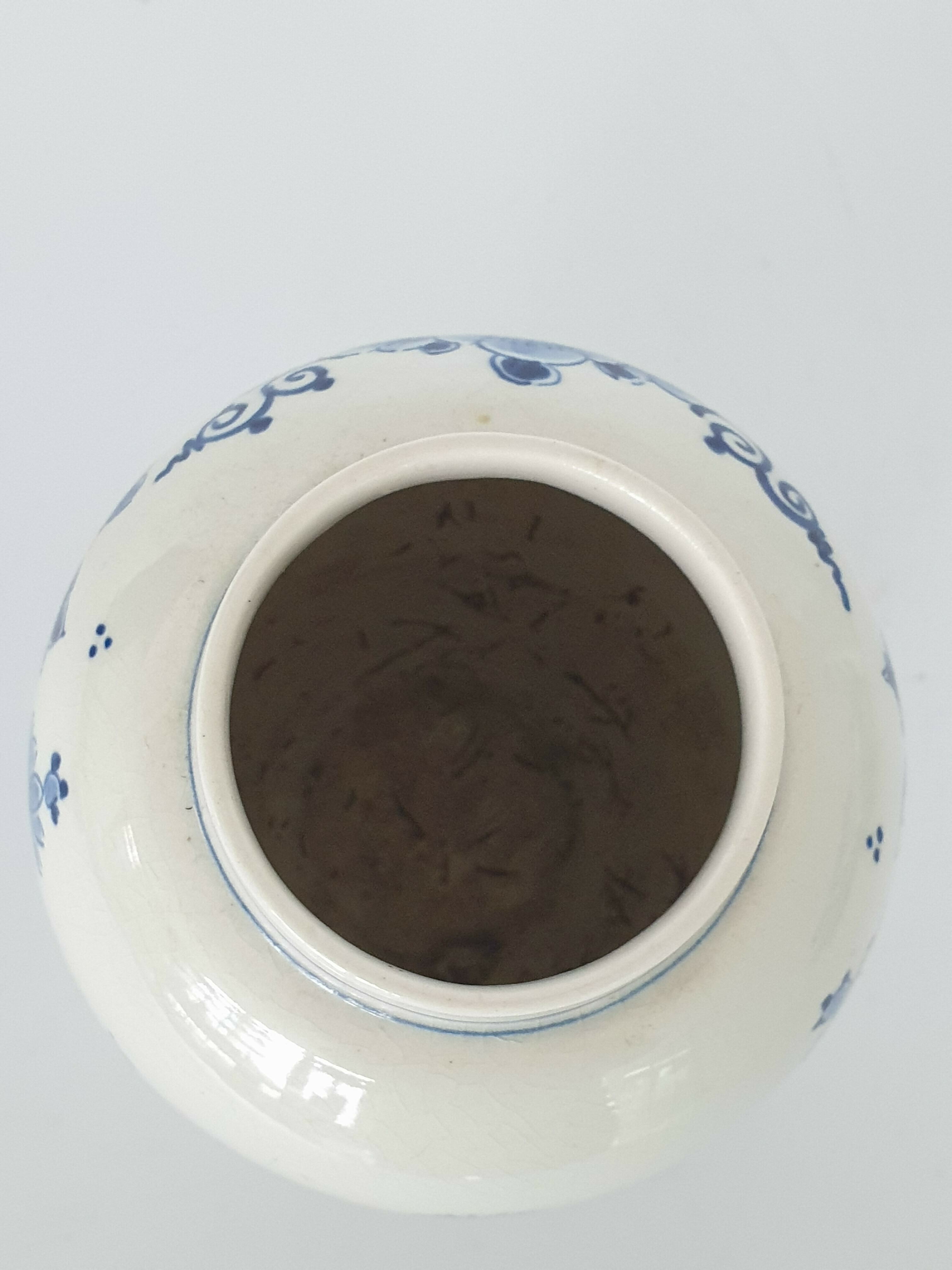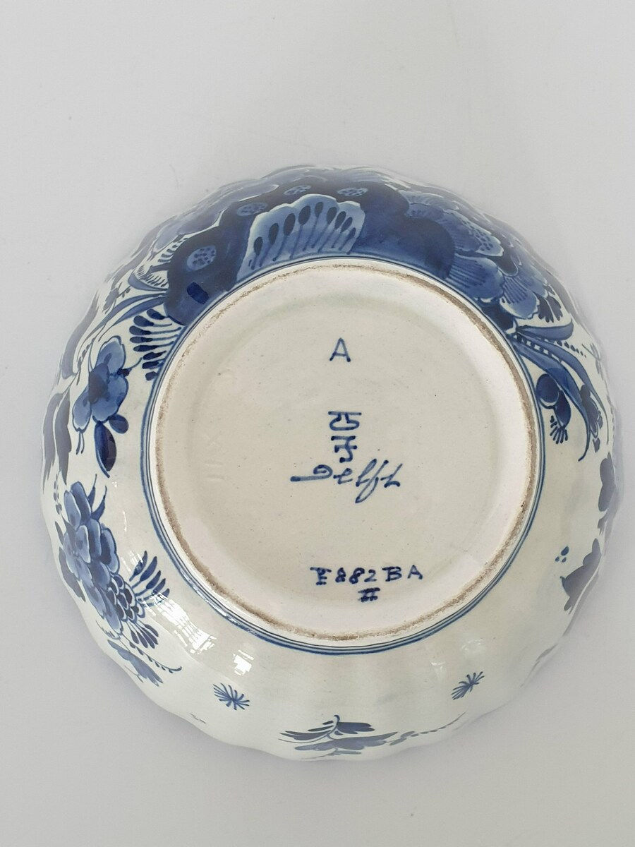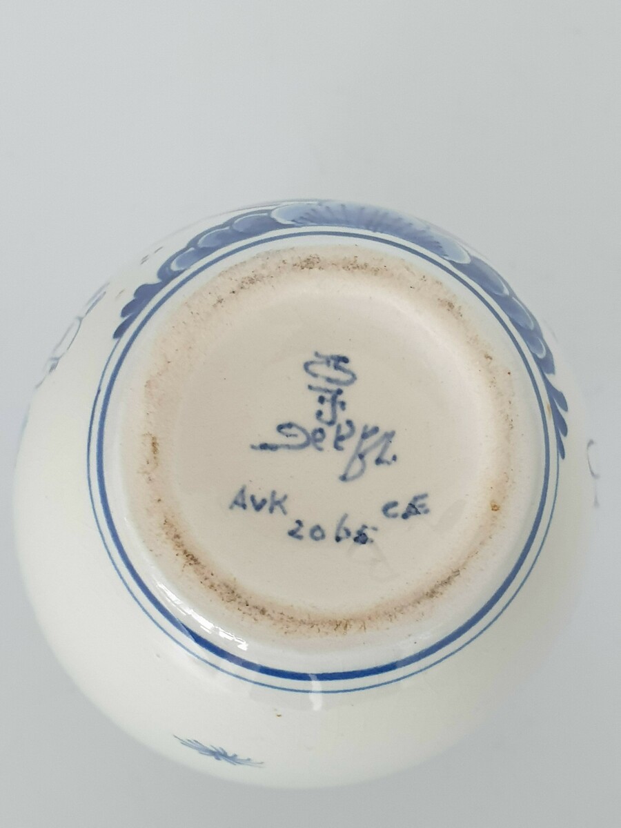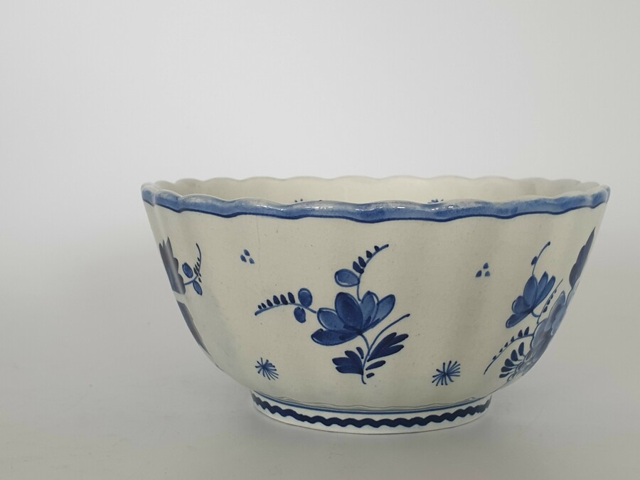 Twee blauw-witte porseleinen vazen en een kom van de Porceleyne Fles, Delft. Alle drie objecten zijn gemerkt aan de onderzijde, schilders monogram en modelnummer, 20e eeuw. |