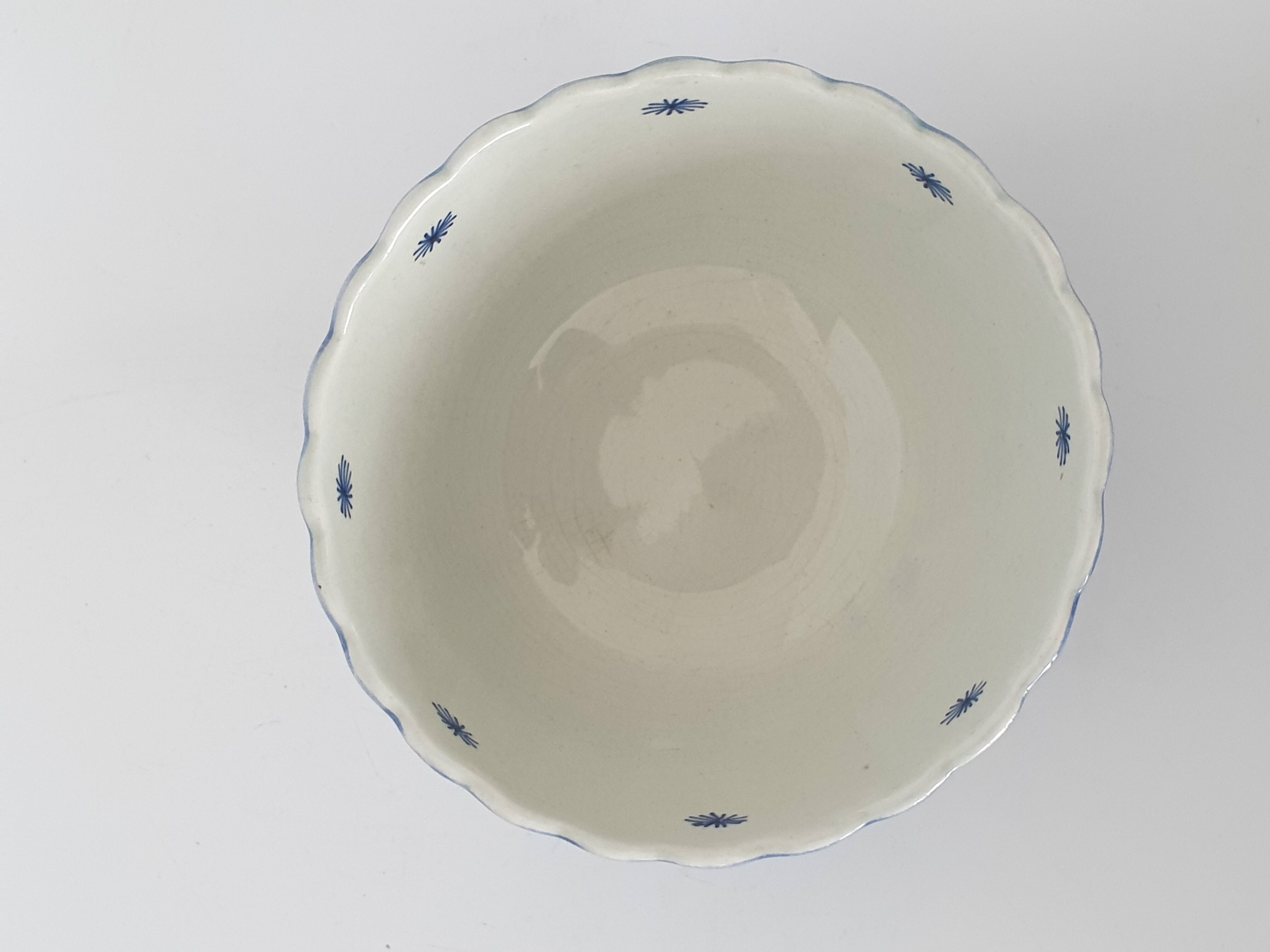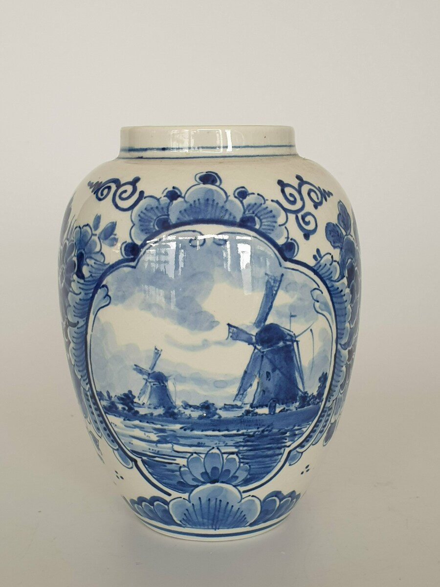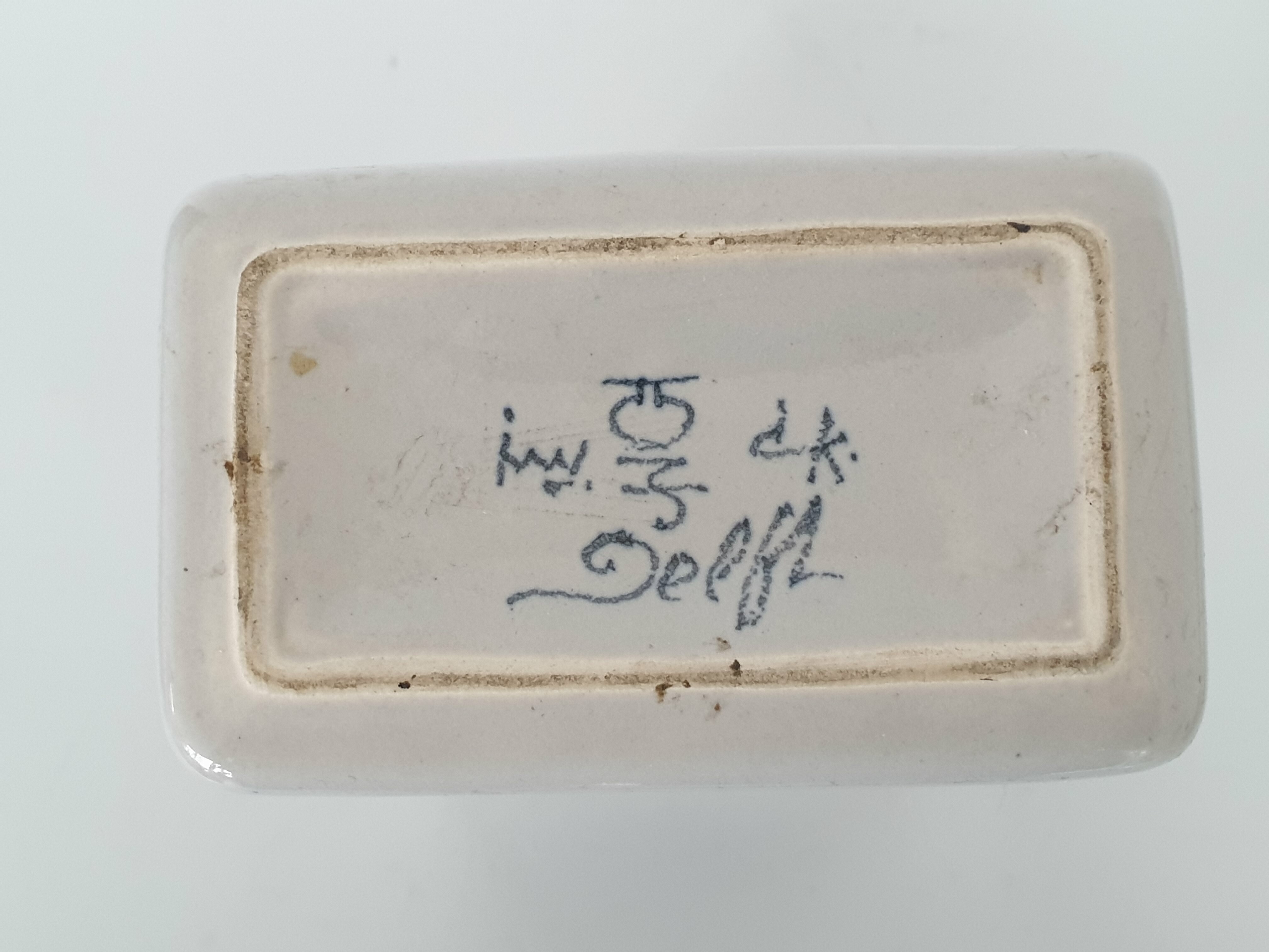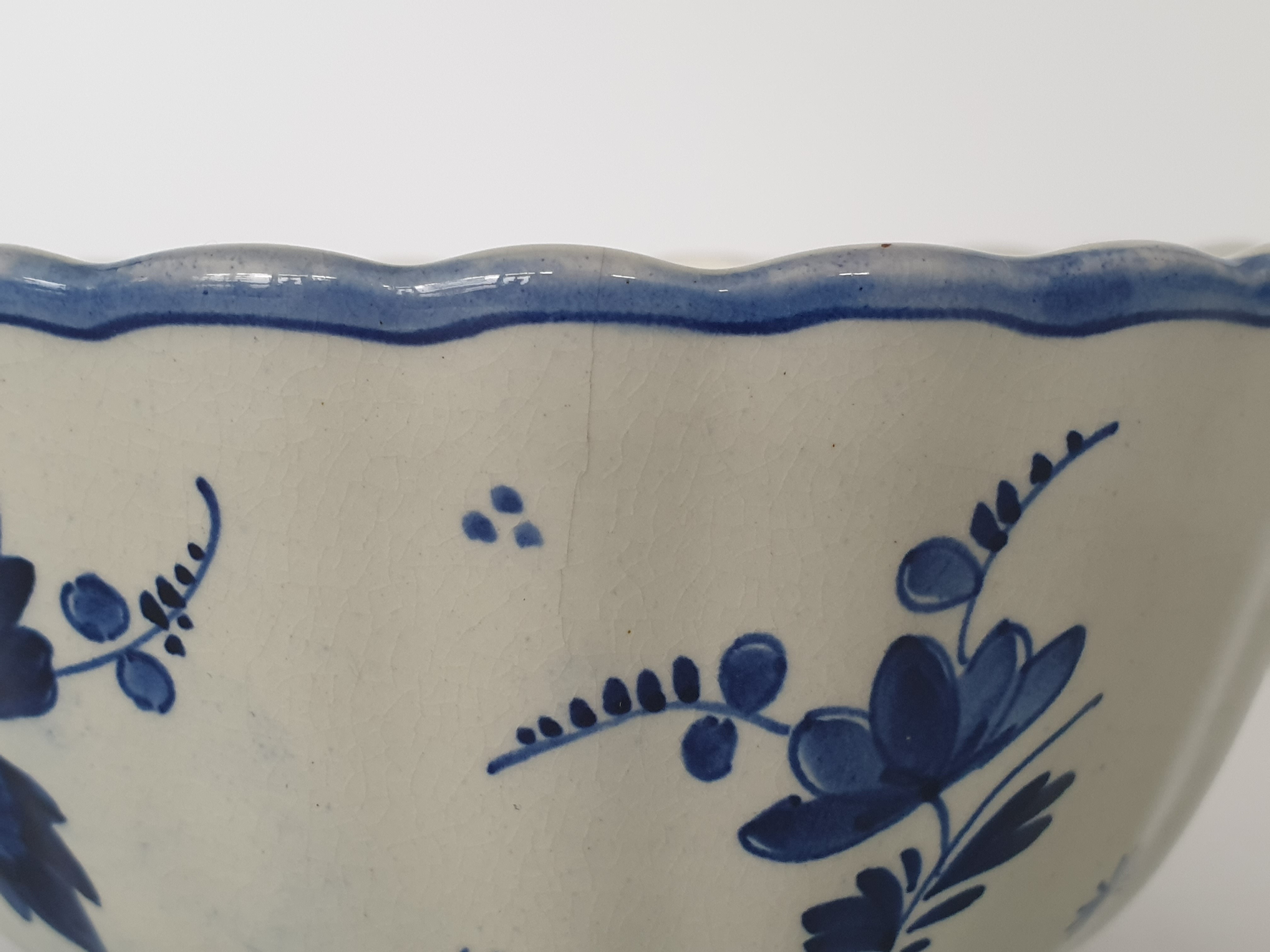 Twee blauw-witte porseleinen vazen en een kom van de Porceleyne Fles, Delft. Alle drie objecten zijn gemerkt aan de onderzijde, schilders monogram en modelnummer, 20e eeuw. |