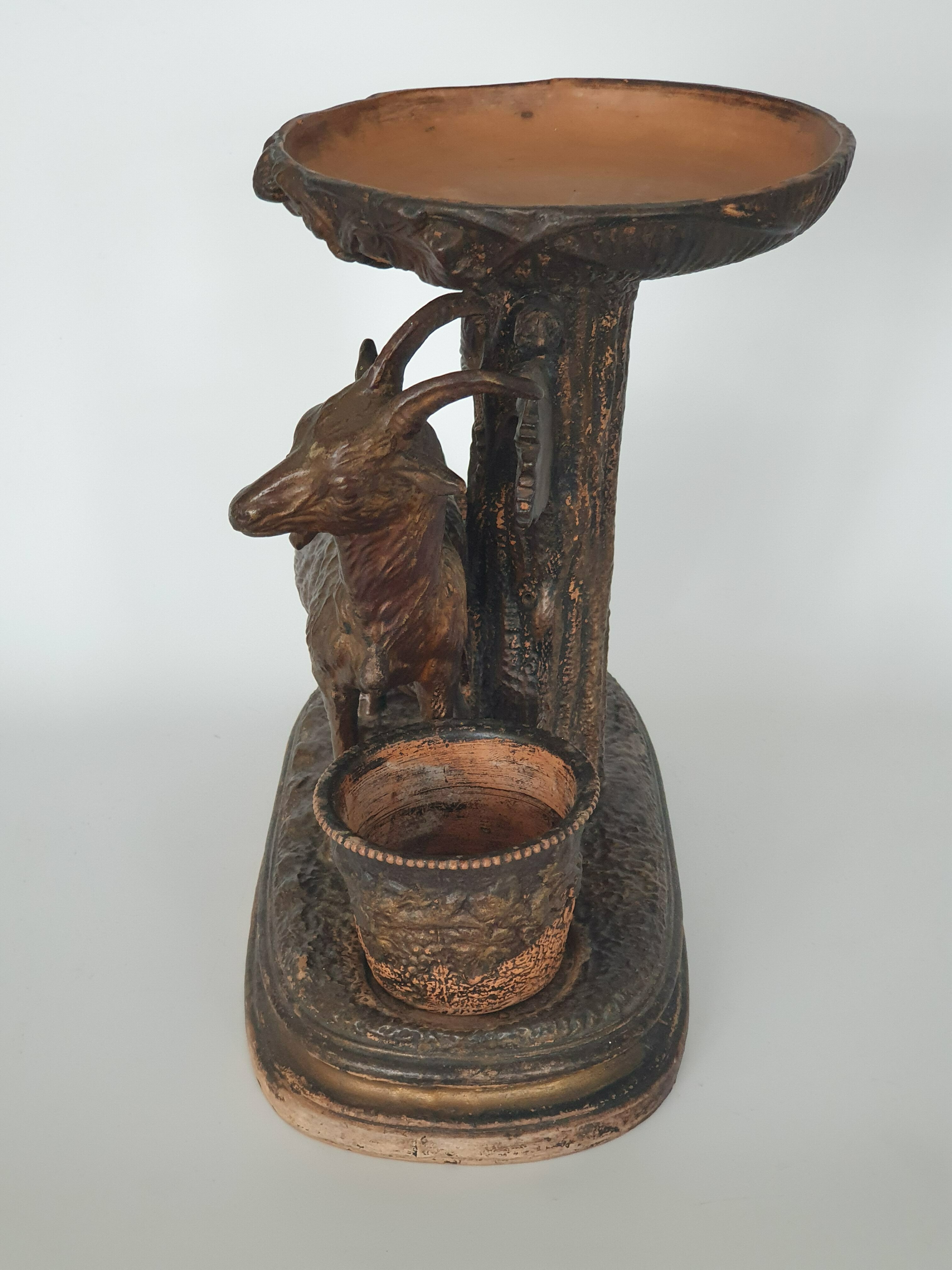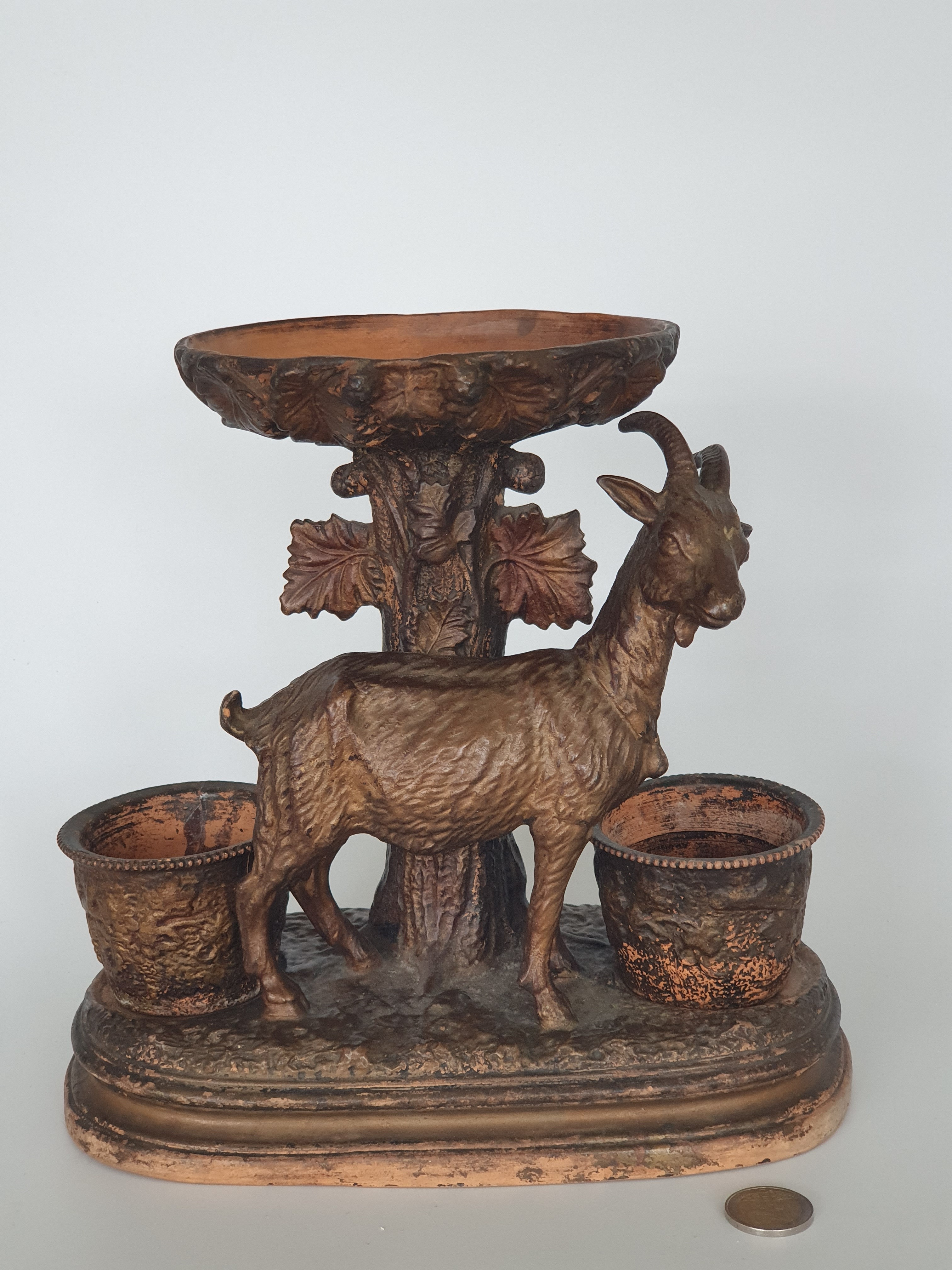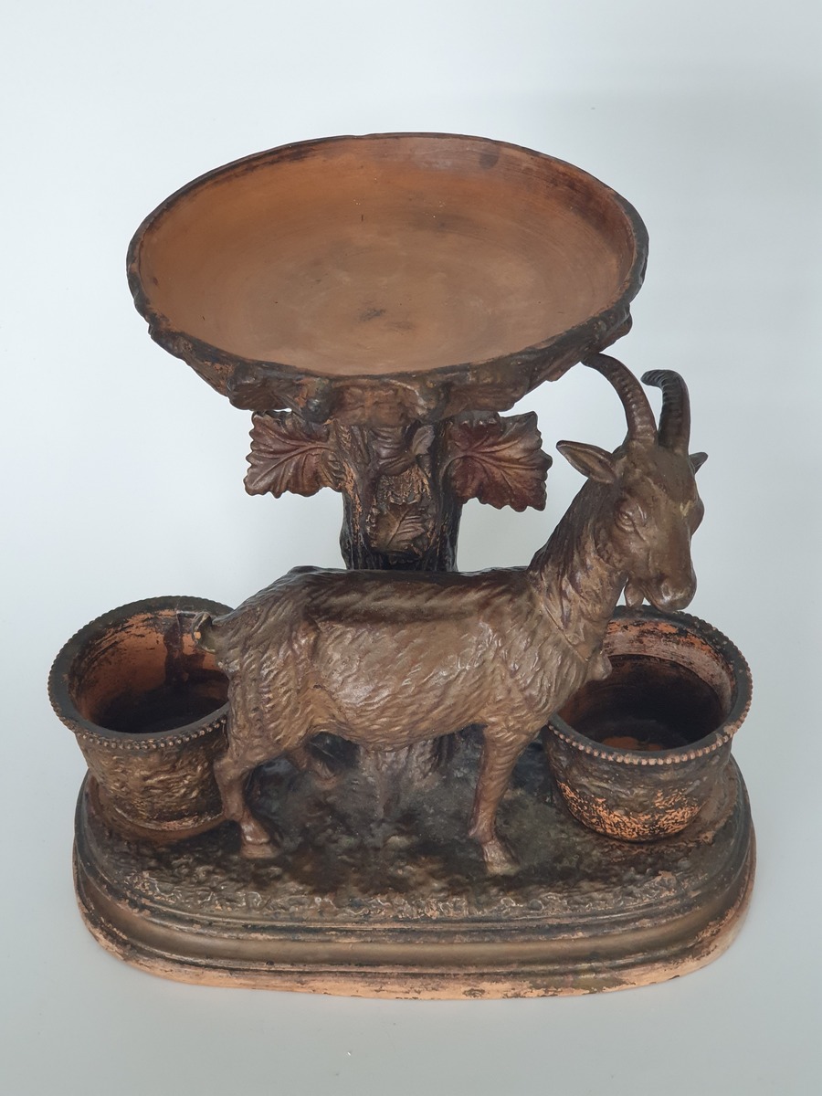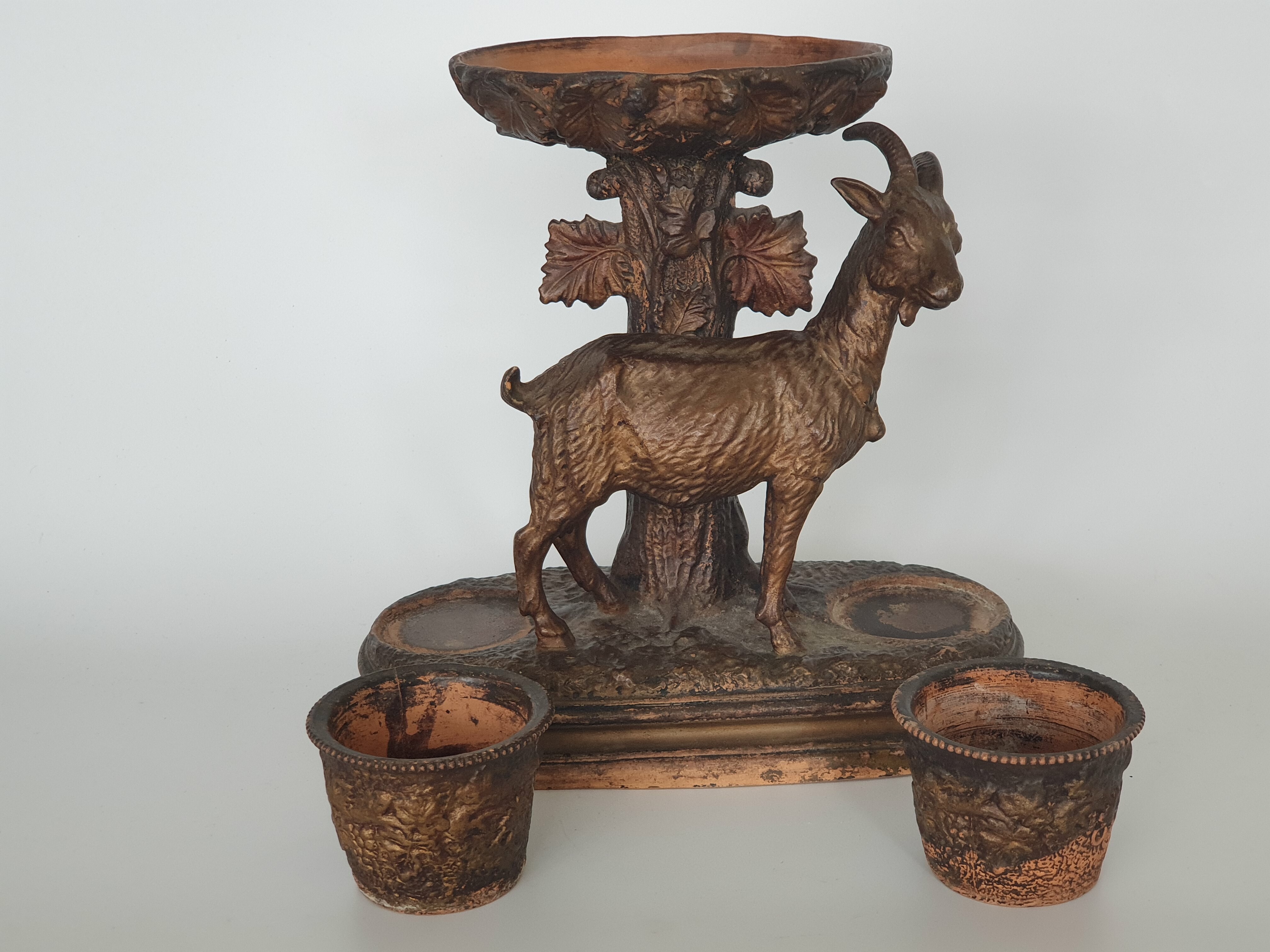 Terracotta tafelstuk met geit en twee losse terracotta potjes. Duitsland, omstreeks 1900. |