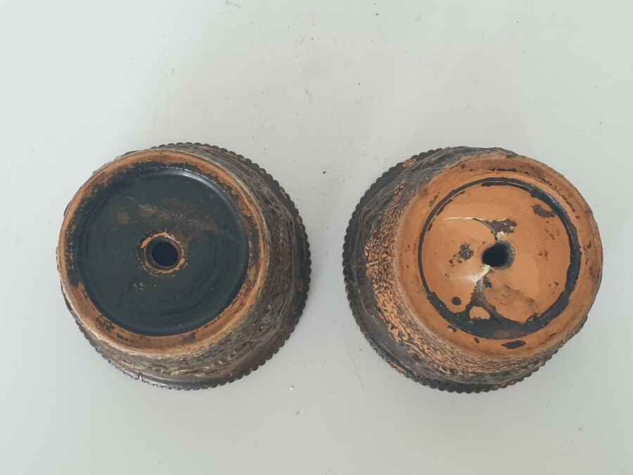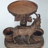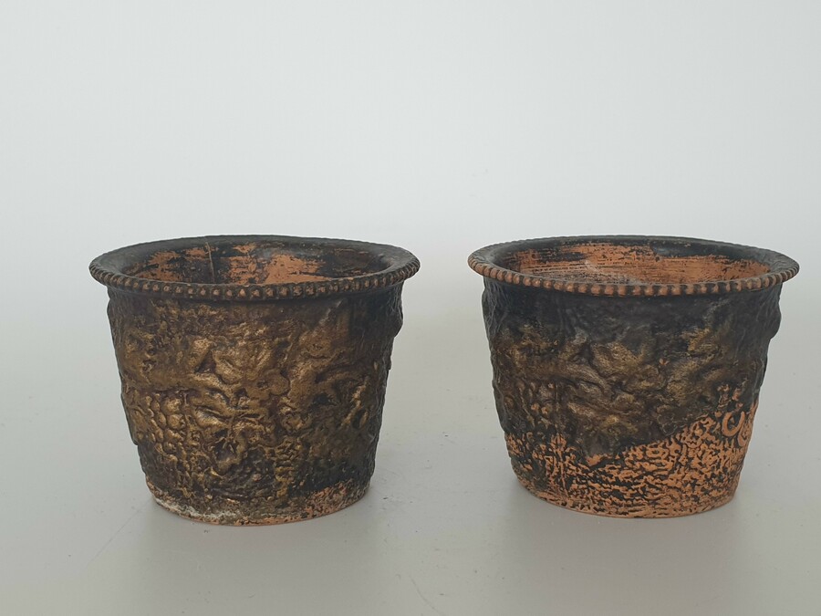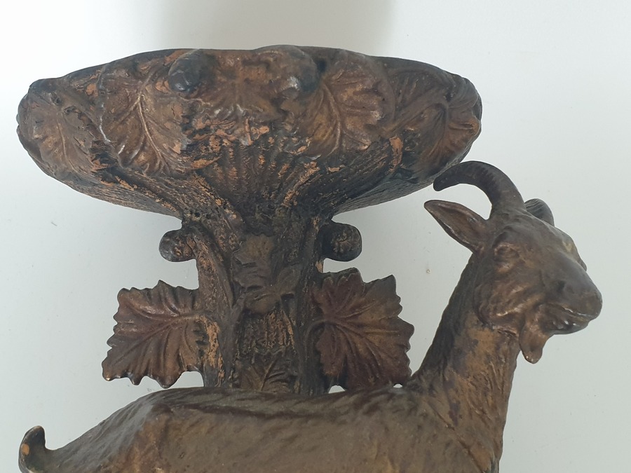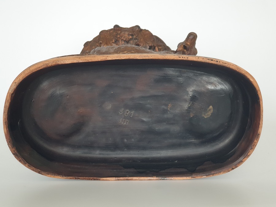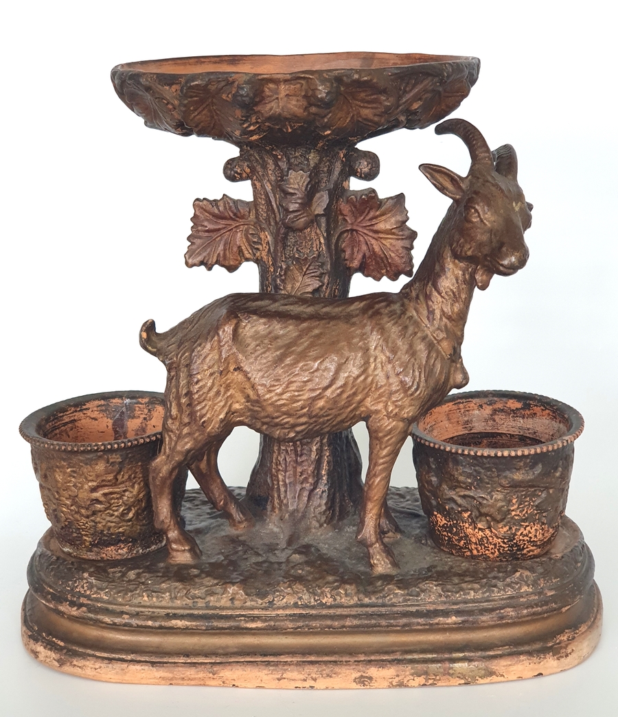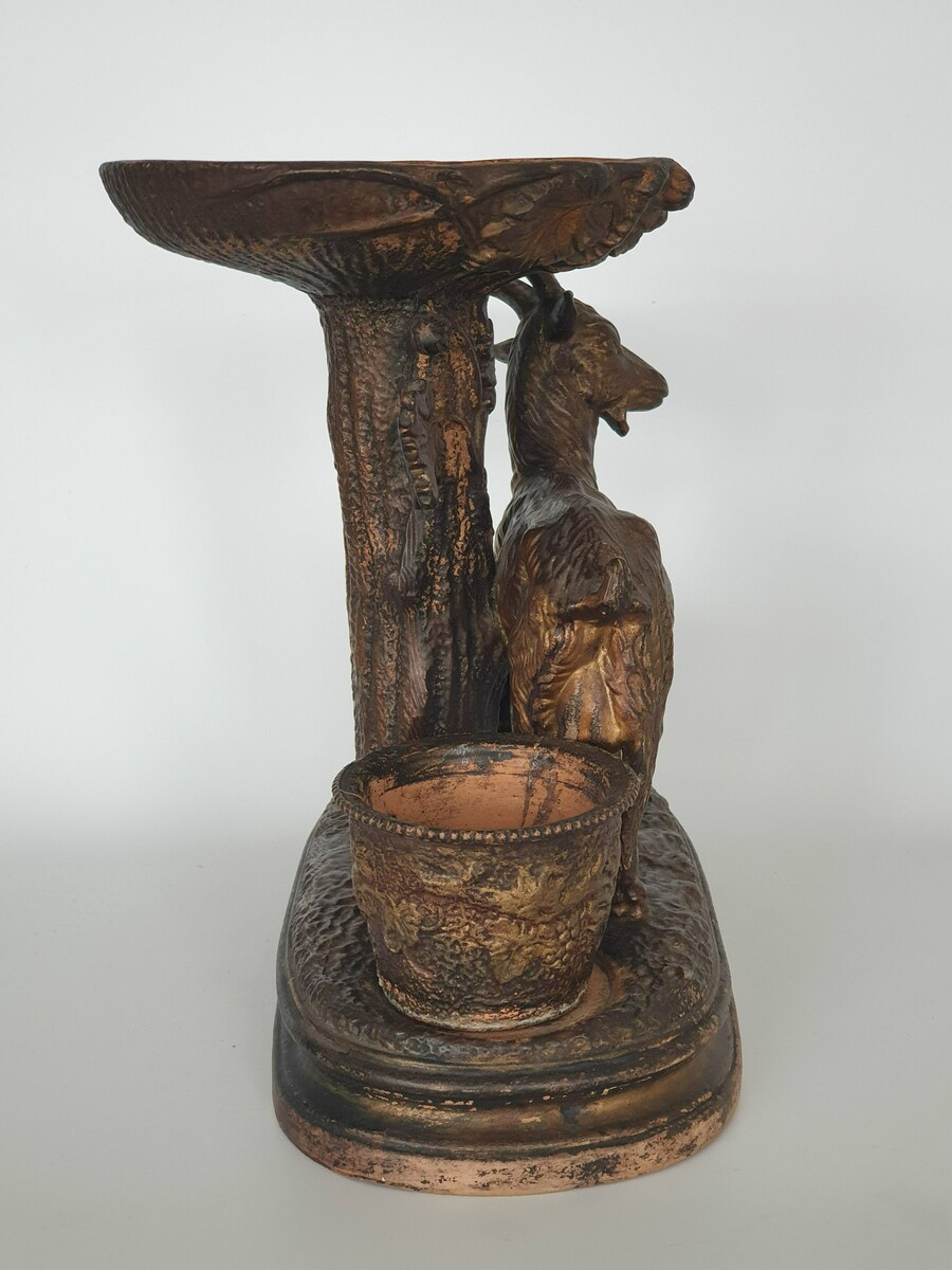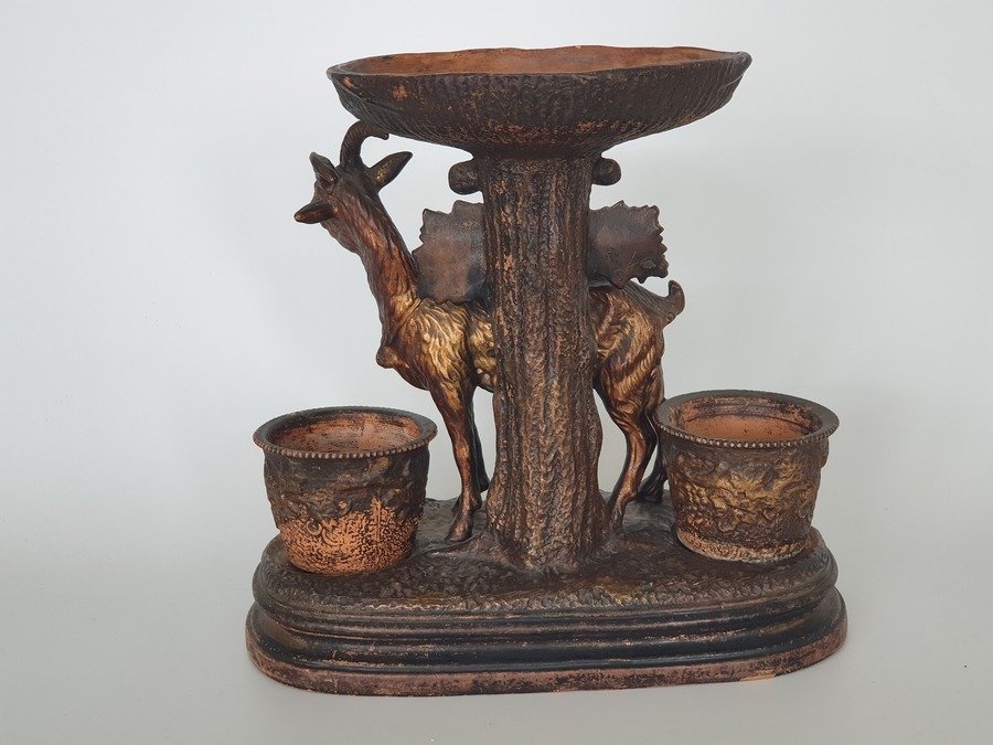 Terracotta tafelstuk met geit en twee losse terracotta potjes. Duitsland, omstreeks 1900. |