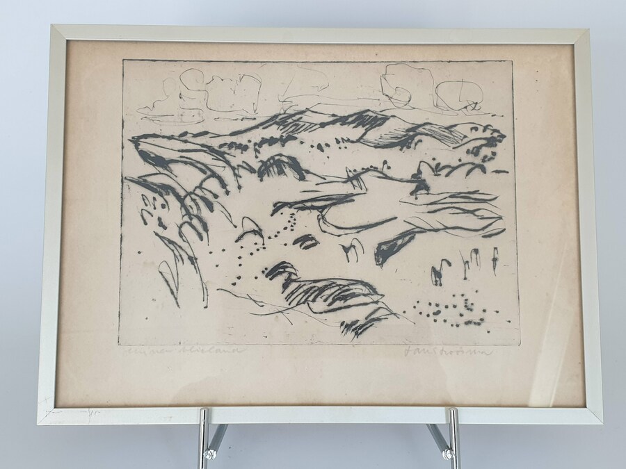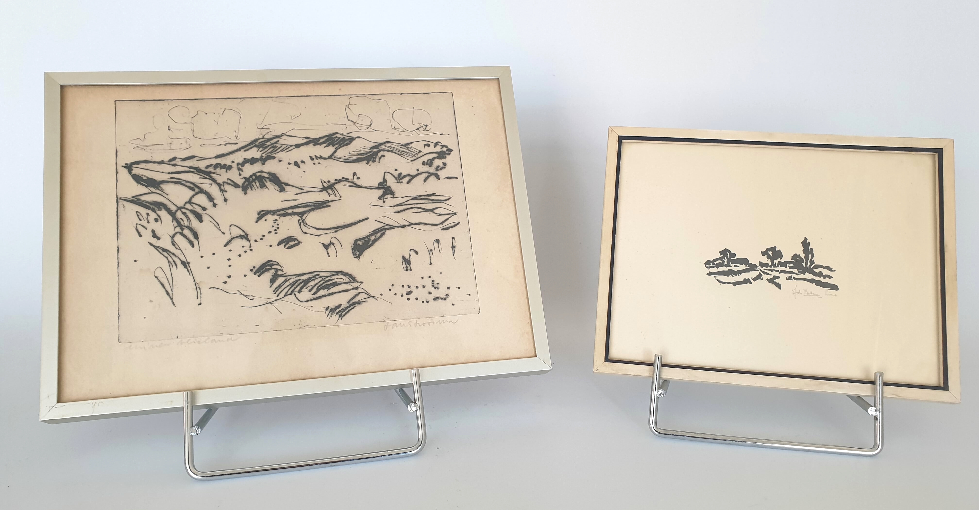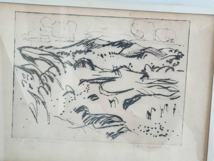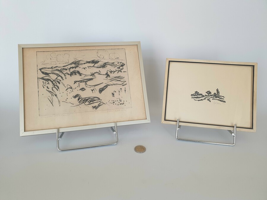 Een linosnede van Johan Faber (1902-1979), Groninger Ploeg en een ets van Jan Stroosma (Leeuwarden, 1928- 1983). Titel "Duinen van Vlieland". Beide kunstwerken met potlood gesigneerd, 20e eeuw. |